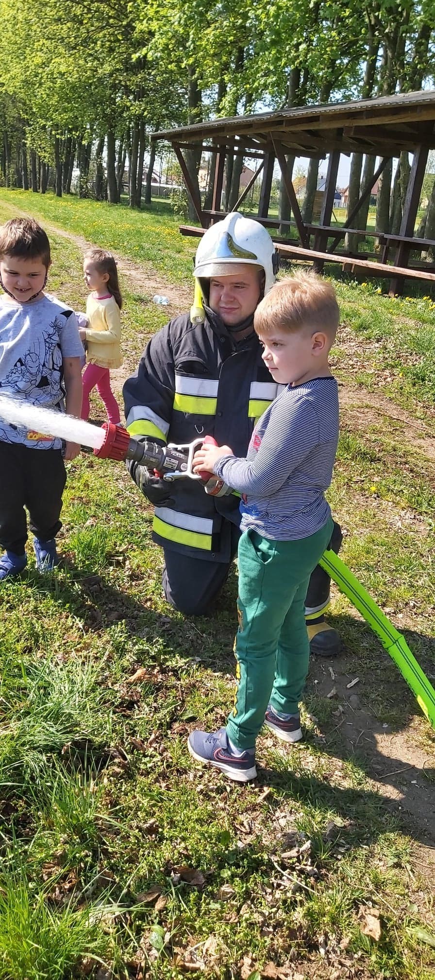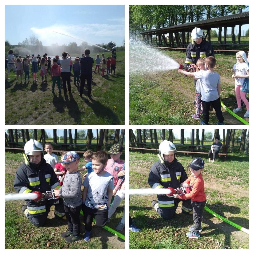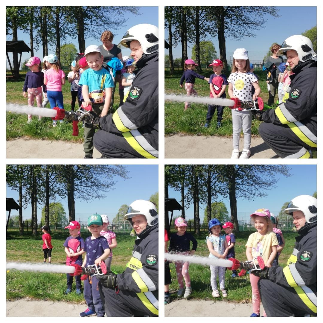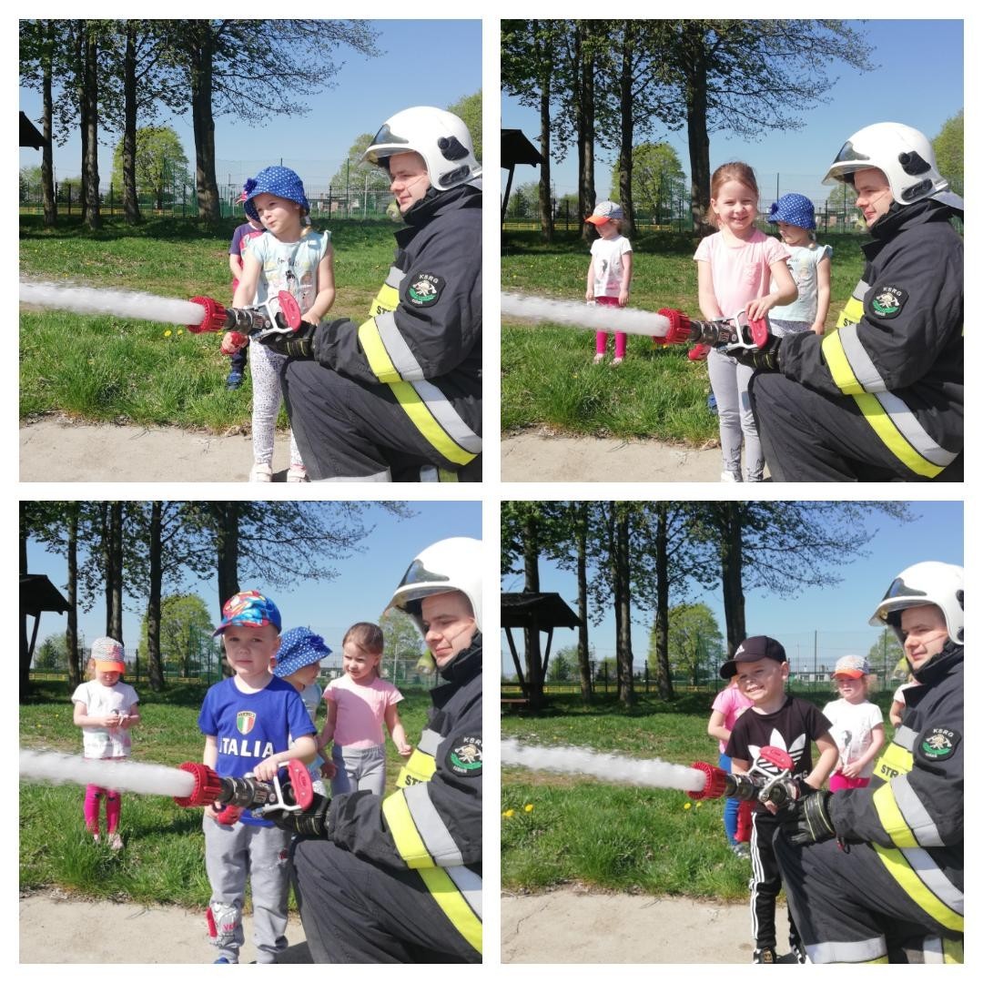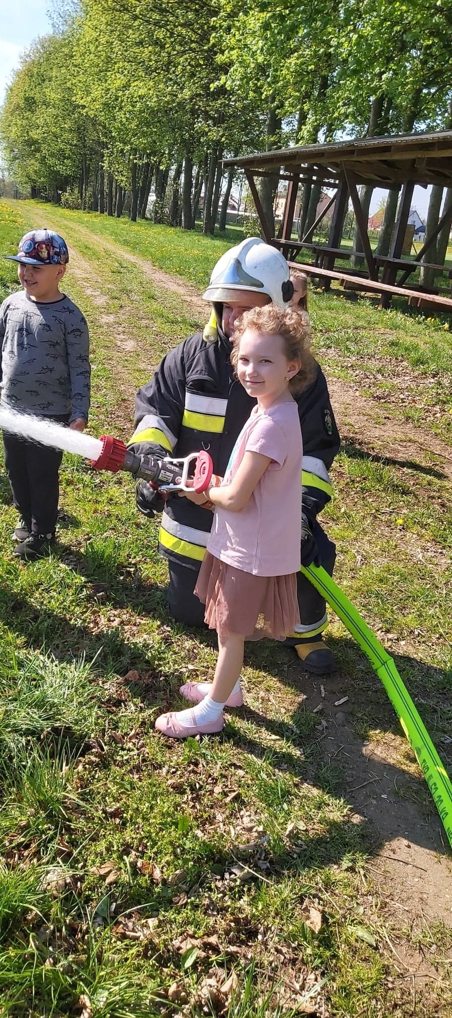 Dzieci miały możliwość z bliska poznać wyposażenie, jakim dysponują strażacy podczas swojej ciężkiej i odpowiedzialnej pracy. Każdy chętny przedszkolak, choć przez chwilę mógł poczuć się jak prawdziwy strażak, kiedy miał możliwość przymierzyć hełm, bądź podawać prąd wody.