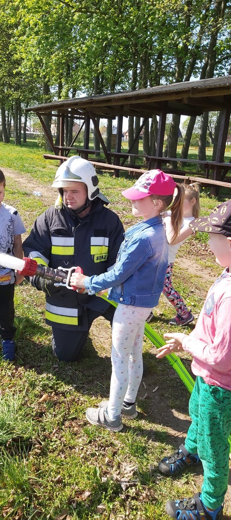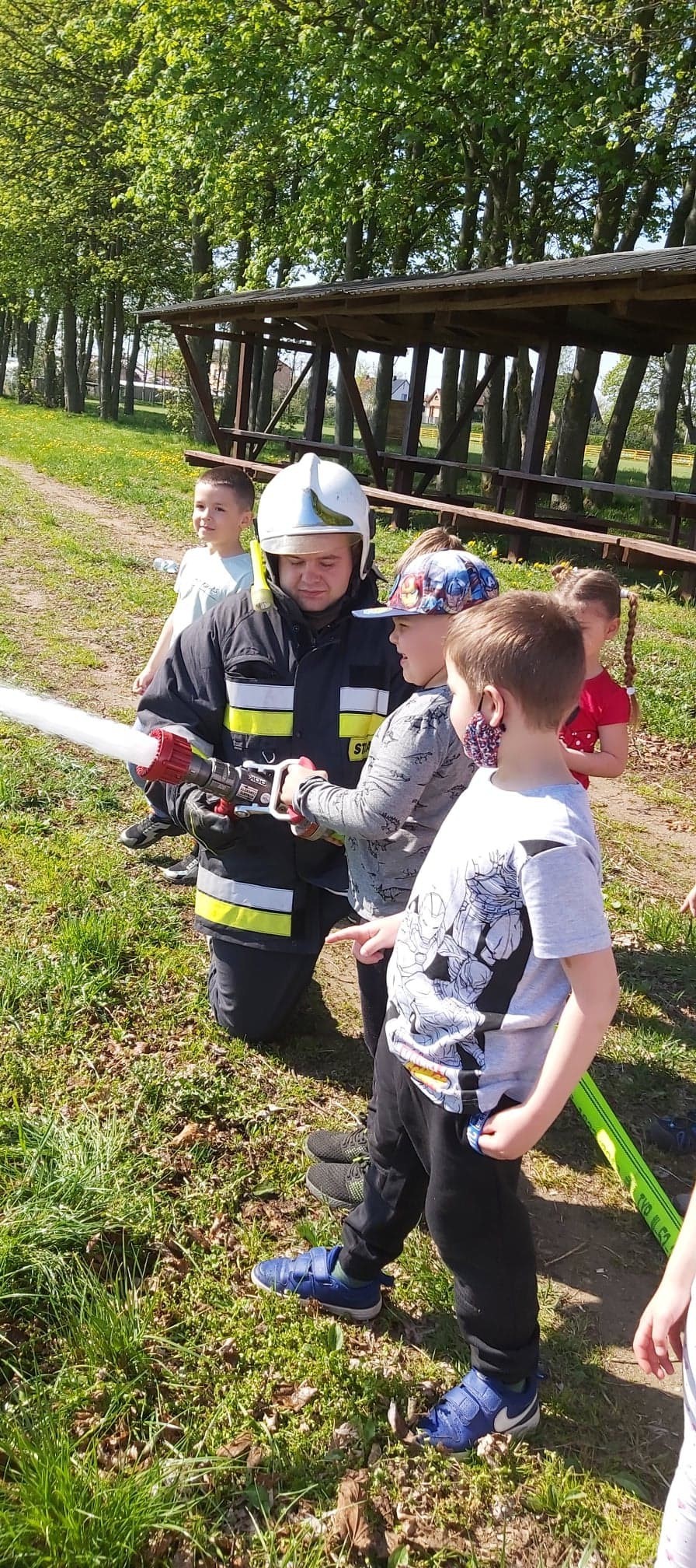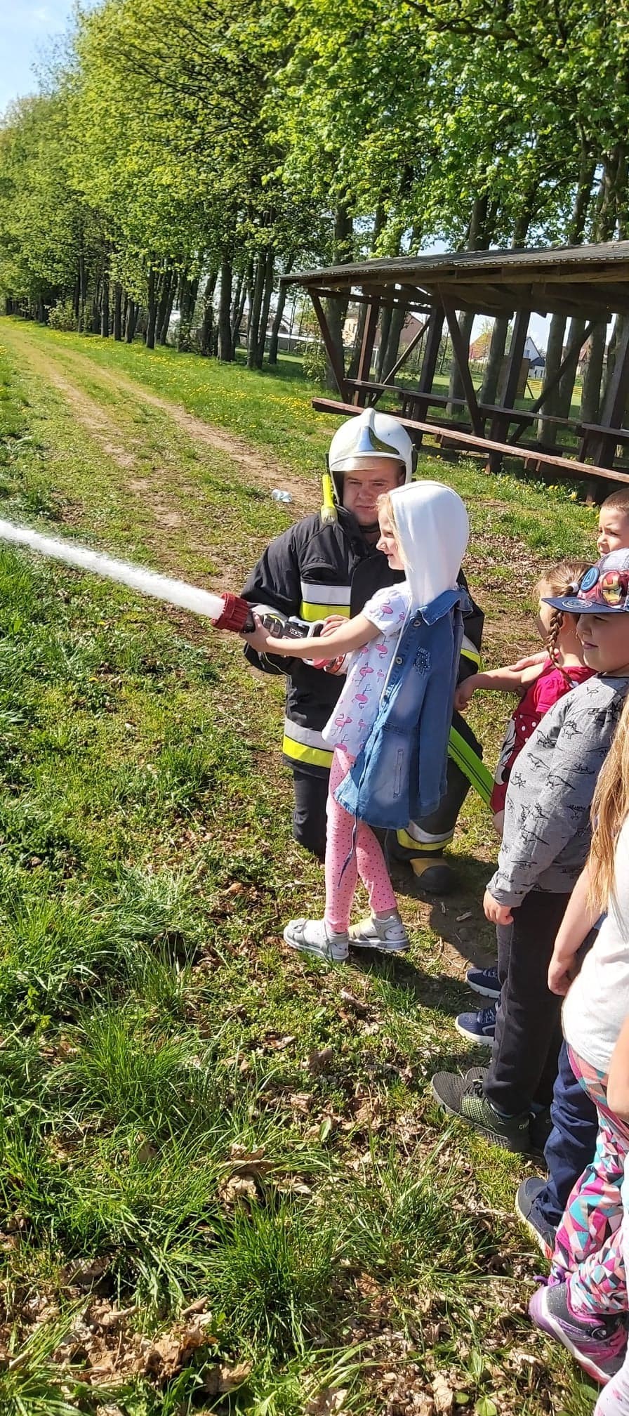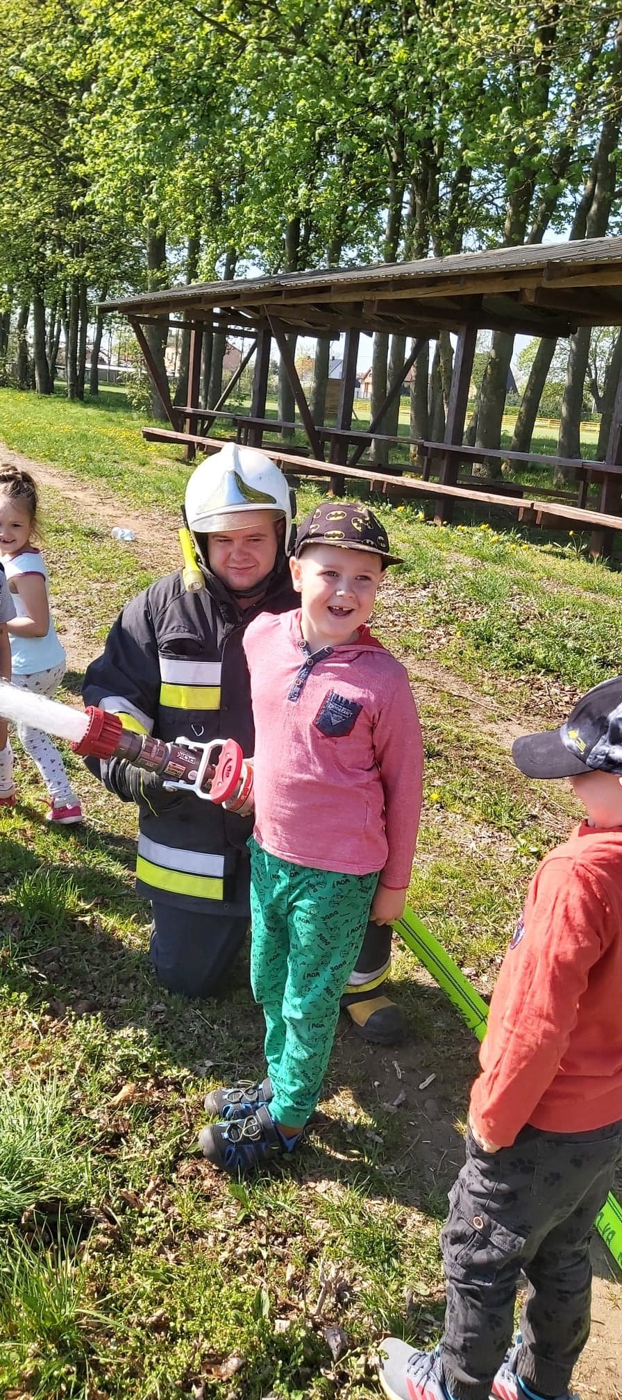 Dzieci miały możliwość z bliska poznać wyposażenie, jakim dysponują strażacy podczas swojej ciężkiej i odpowiedzialnej pracy. Każdy chętny przedszkolak, choć przez chwilę mógł poczuć się jak prawdziwy strażak, kiedy miał możliwość przymierzyć hełm, bądź podawać prąd wody.