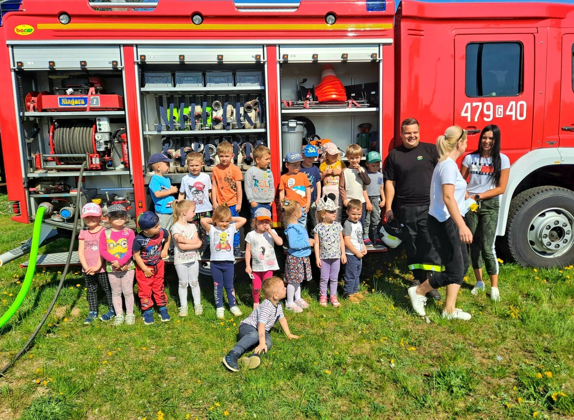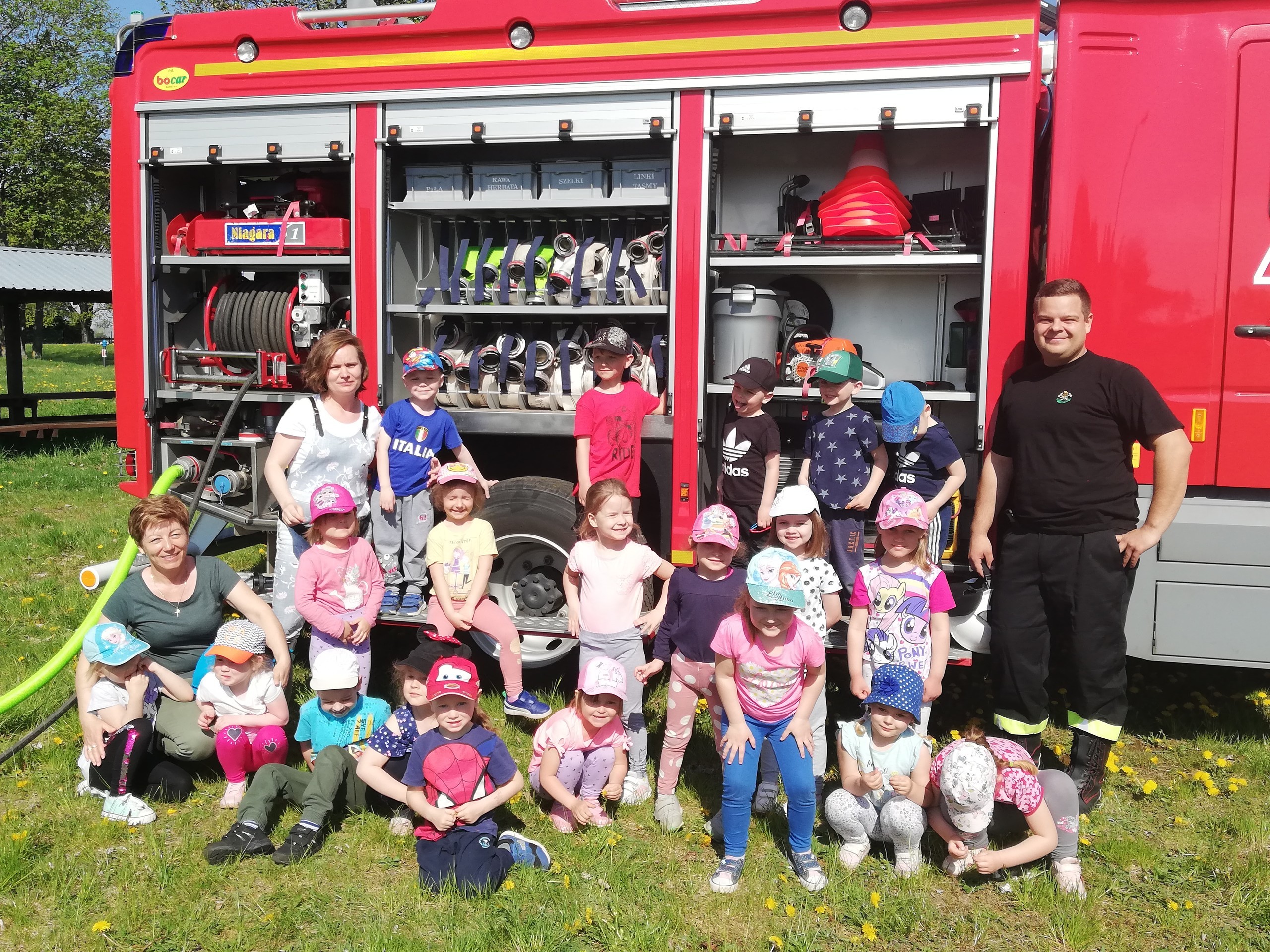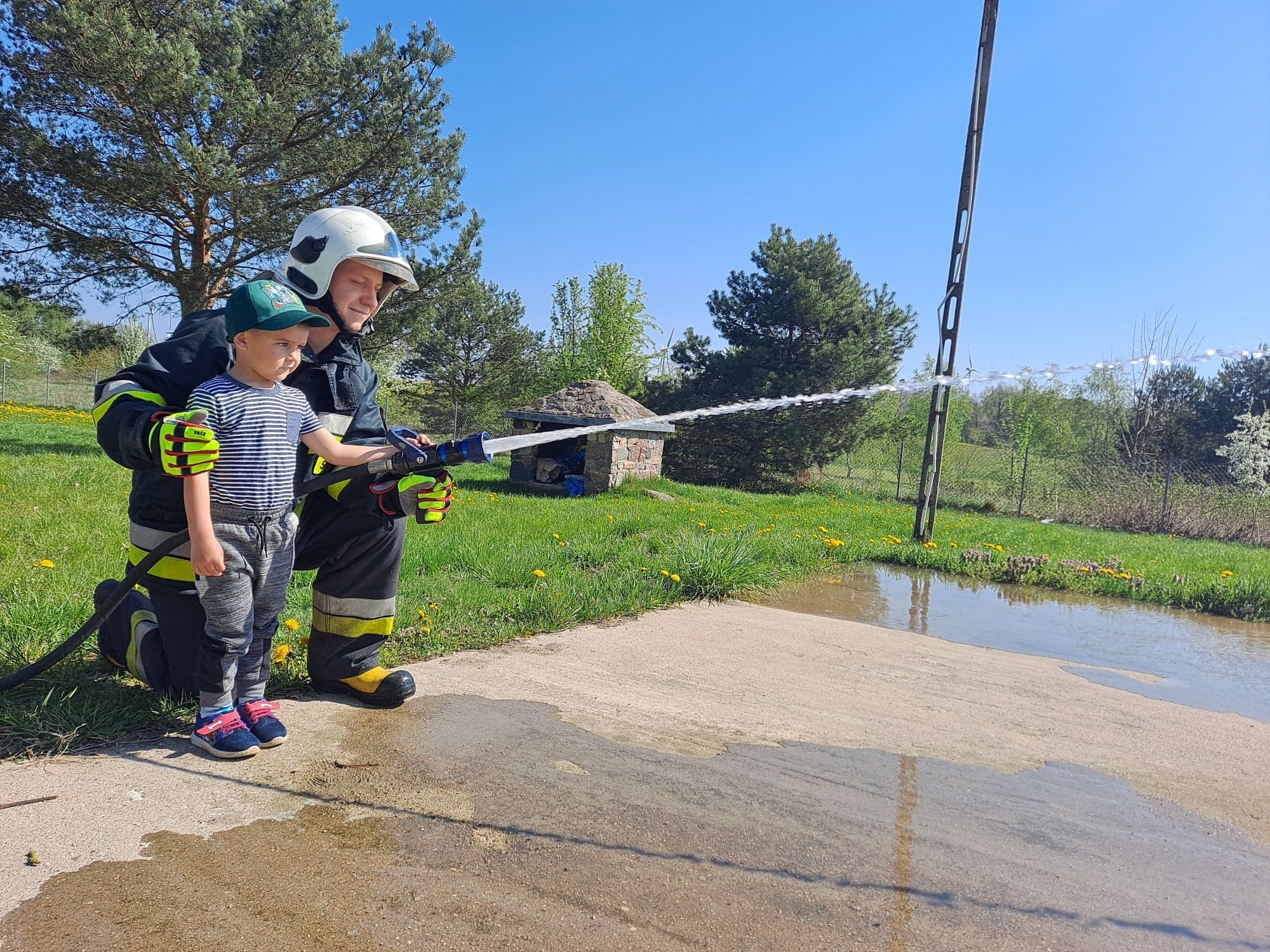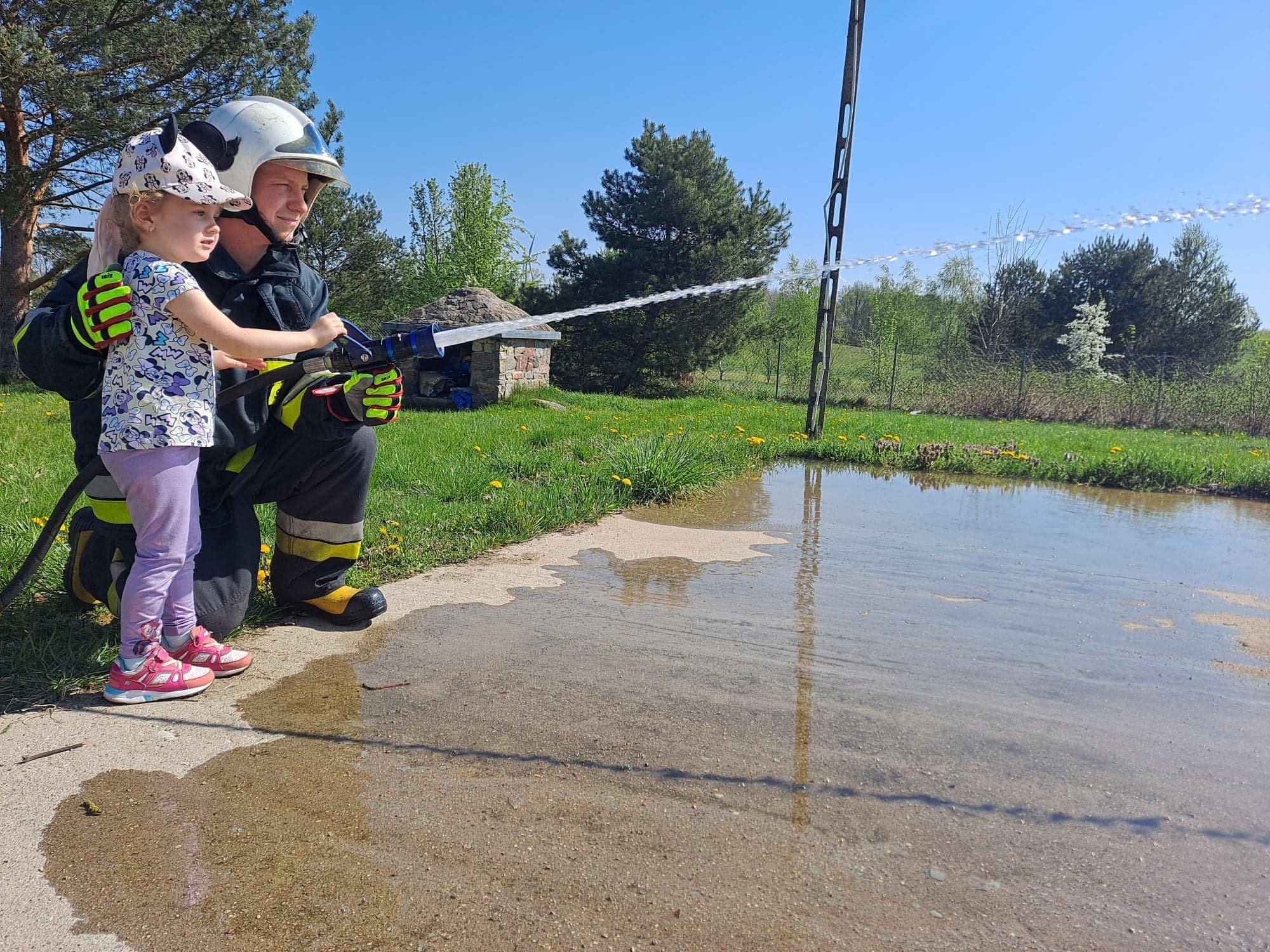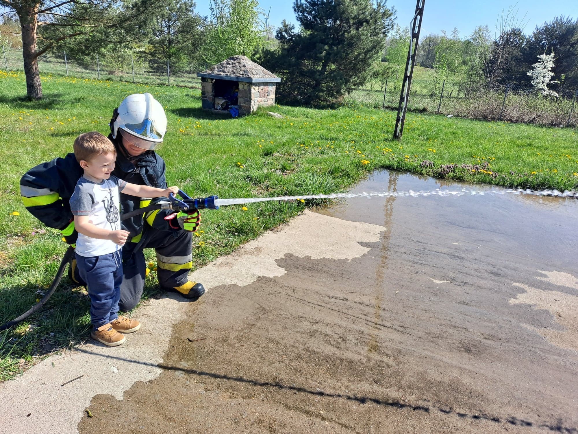 Dzieci miały możliwość z bliska poznać wyposażenie, jakim dysponują strażacy podczas swojej ciężkiej i odpowiedzialnej pracy. Każdy chętny przedszkolak, choć przez chwilę mógł poczuć się jak prawdziwy strażak, kiedy miał możliwość przymierzyć hełm, bądź podawać prąd wody.
