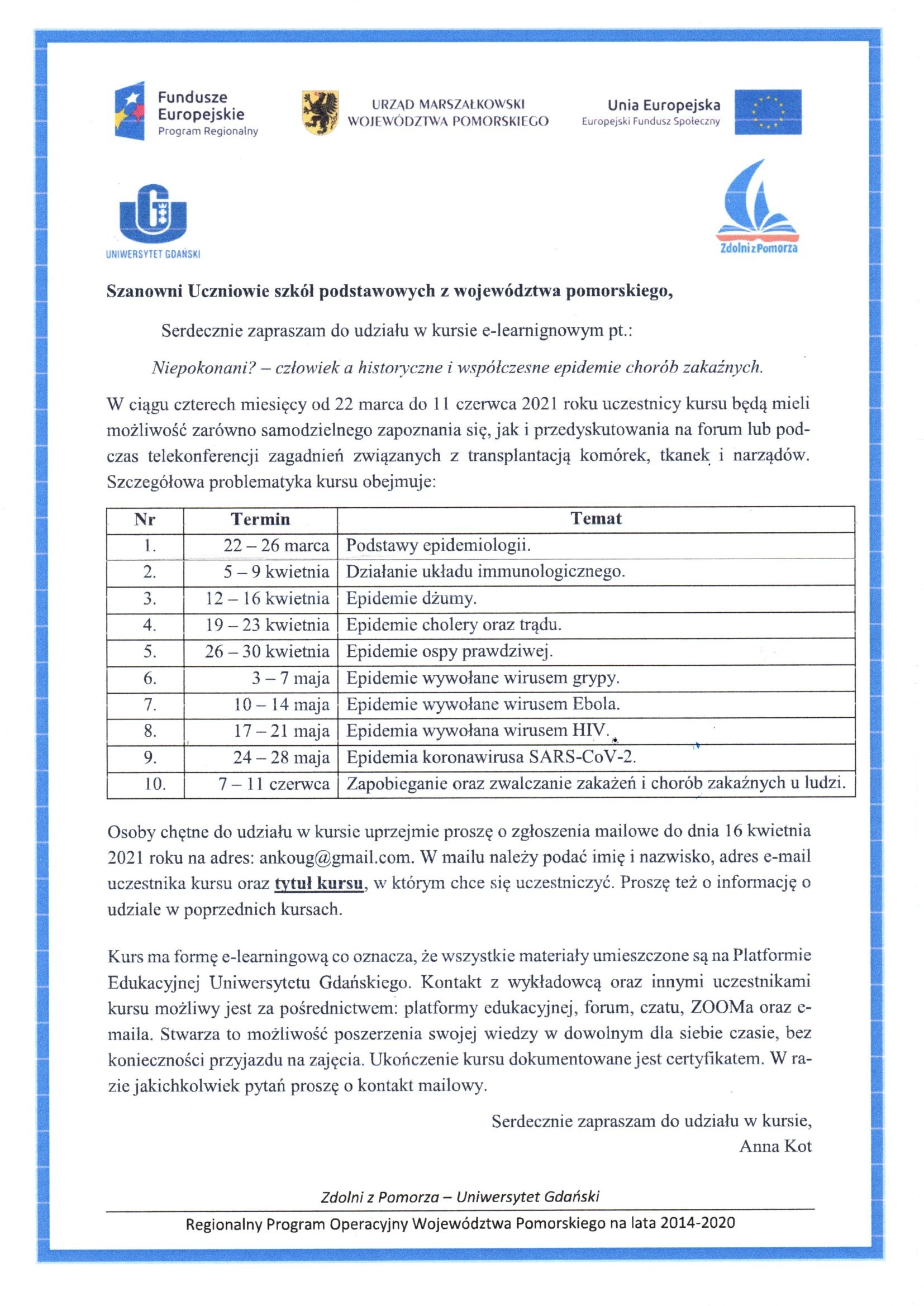 W ciągu czterech miesięcy od 22 marca do 11 czerwca 2021 roku uczestnicy kursu, między innymi uczniowie klas VII i VIII naszej szkoły, będą mieli możliwość zarówno samodzielnego zapoznania się, jak i przedyskutowania na forum lub podczas telekonferencji zagadnień związanych z epidemiologią i różnymi epidemiami, które nękały ludzkość na przestrzeni dziejów. Kurs ma formę e-learningową i zostaną zorganizowane przez Uniwersytet Gdański w ramach programu „Zdolni z Pomorza”.