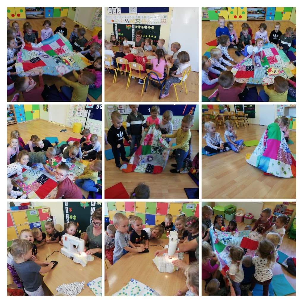 I.„Kocyk Mocy” przedszkolaki projektowali i współuczestniczyli w szyciu „Kocyka Mocy”, który stał się „Magicznym Kocem”, niezastąpionym w wielu wspólnych zabawach. Dzieci są dumne, że mogły wnieść fragment swojej tkaniny i cząstkę swojej pracy w powstanie koca. Chcemy podziękować Pani Mariolce za dopracowanie i sfinalizowanie zadania.