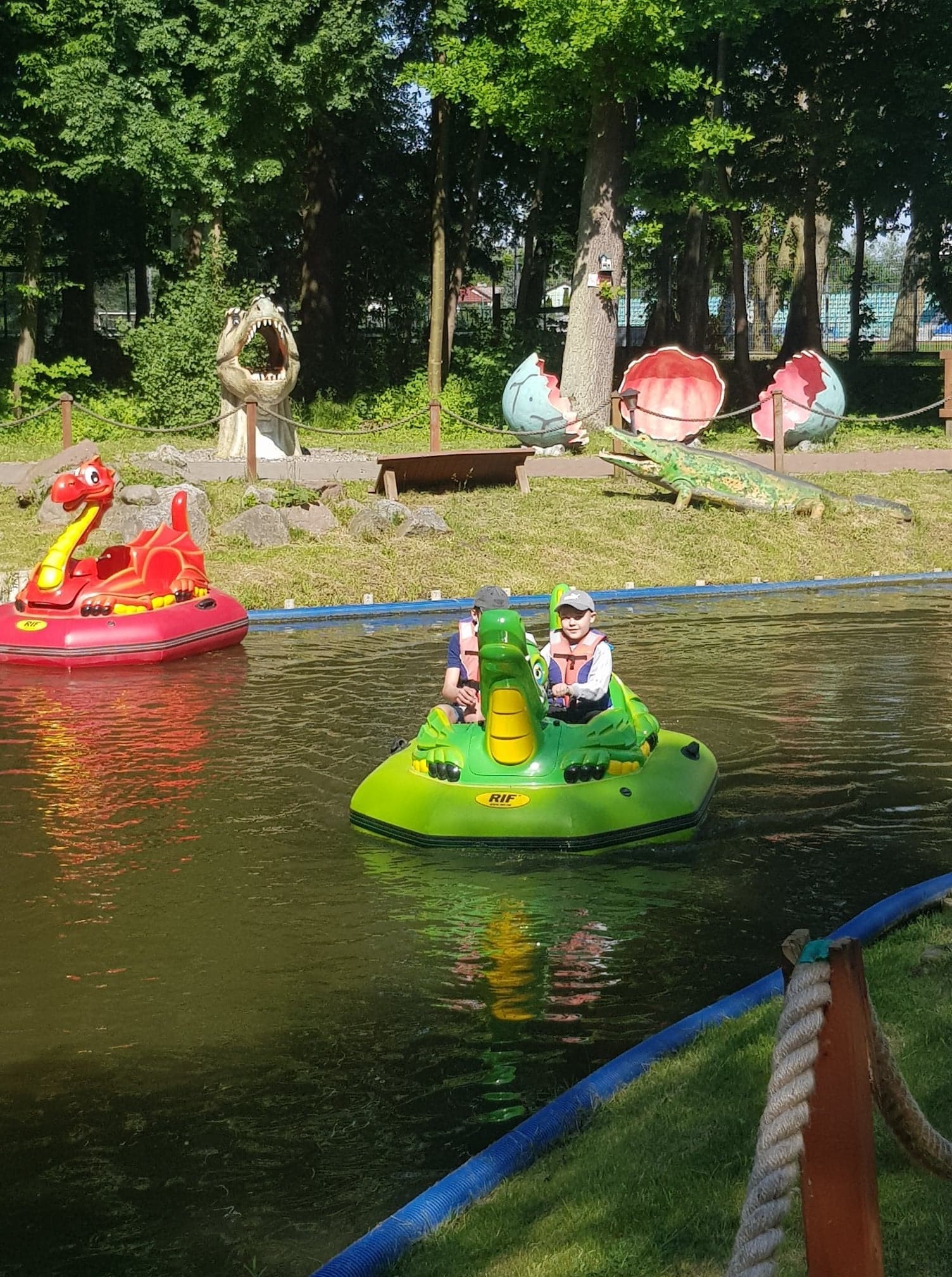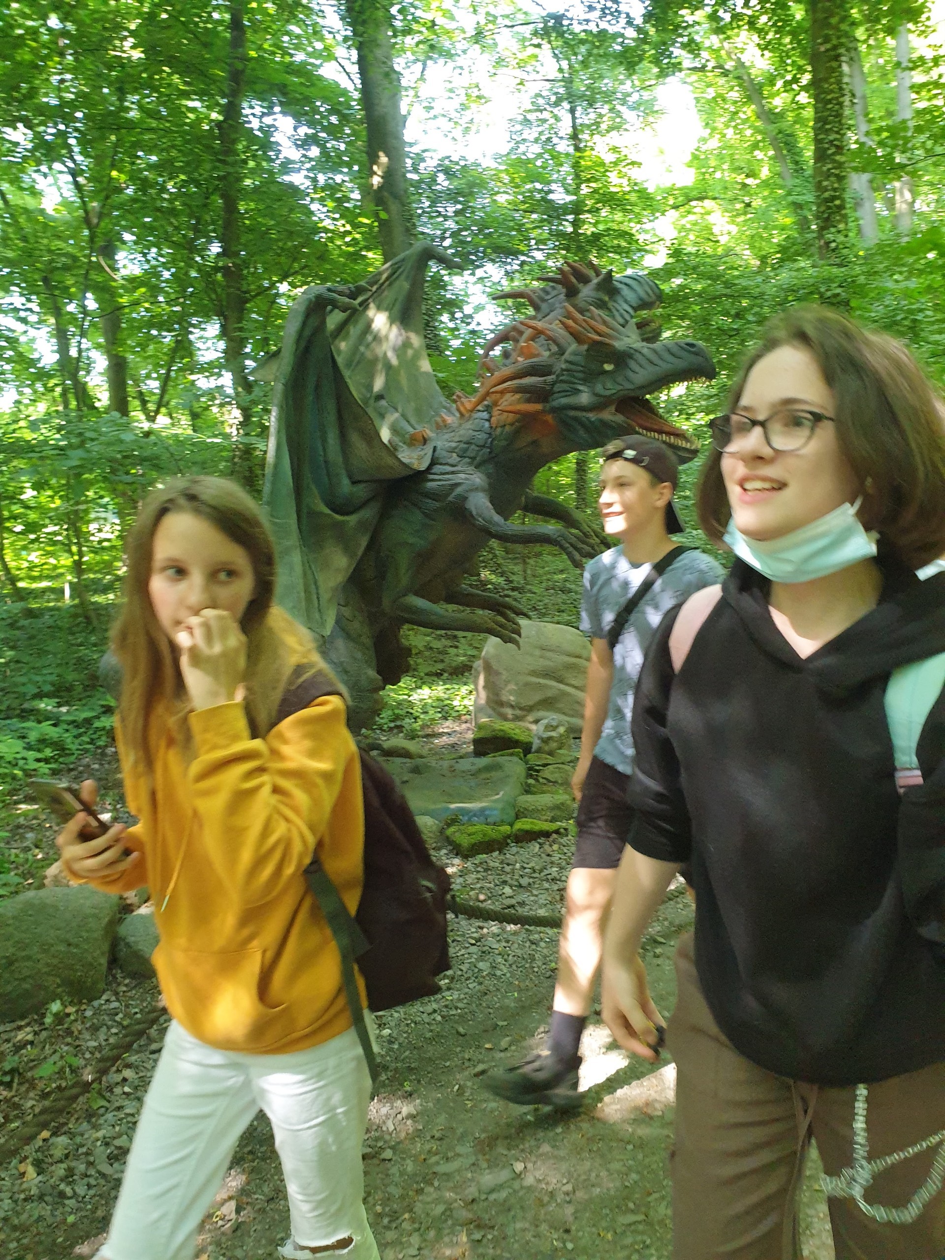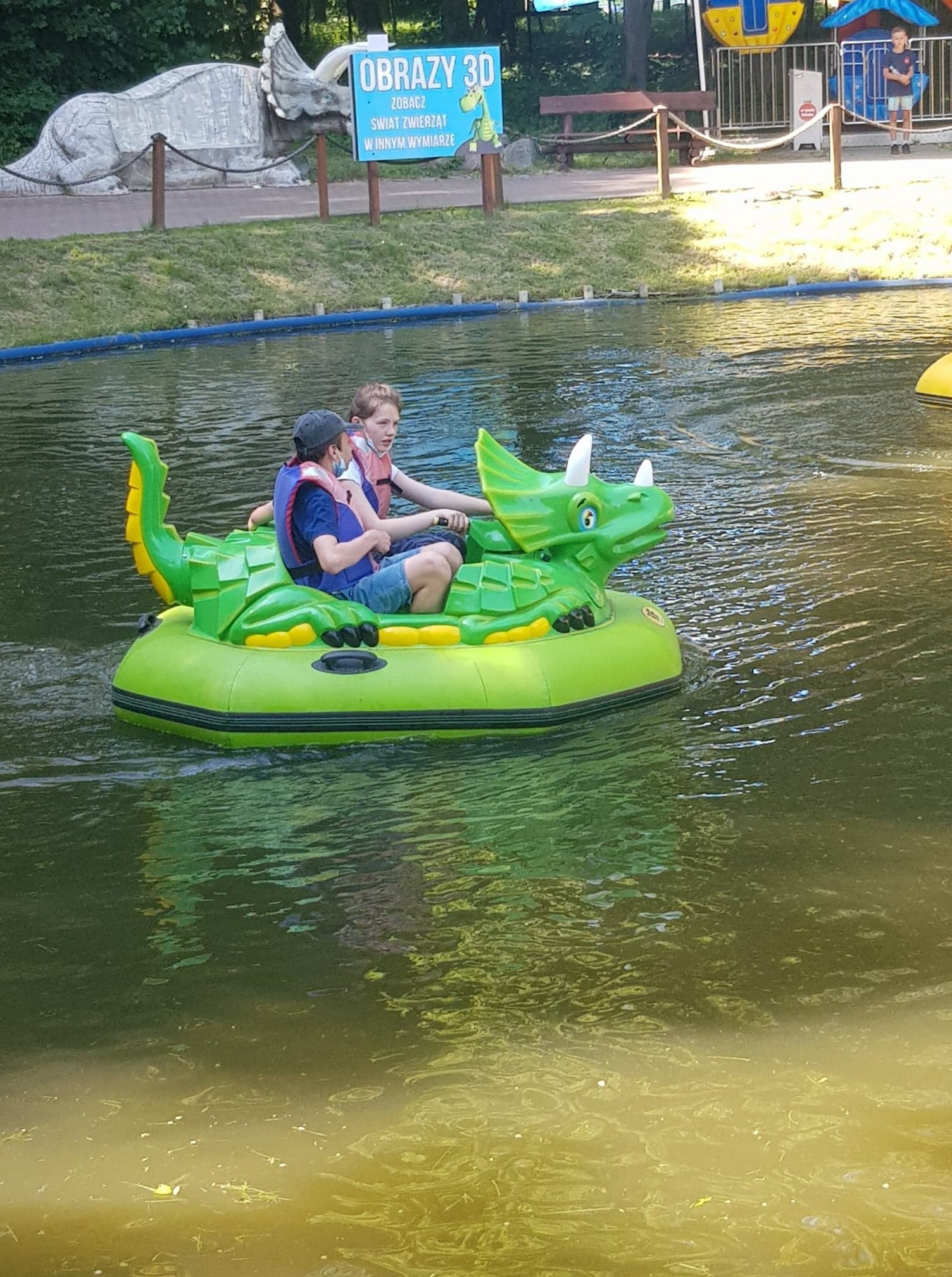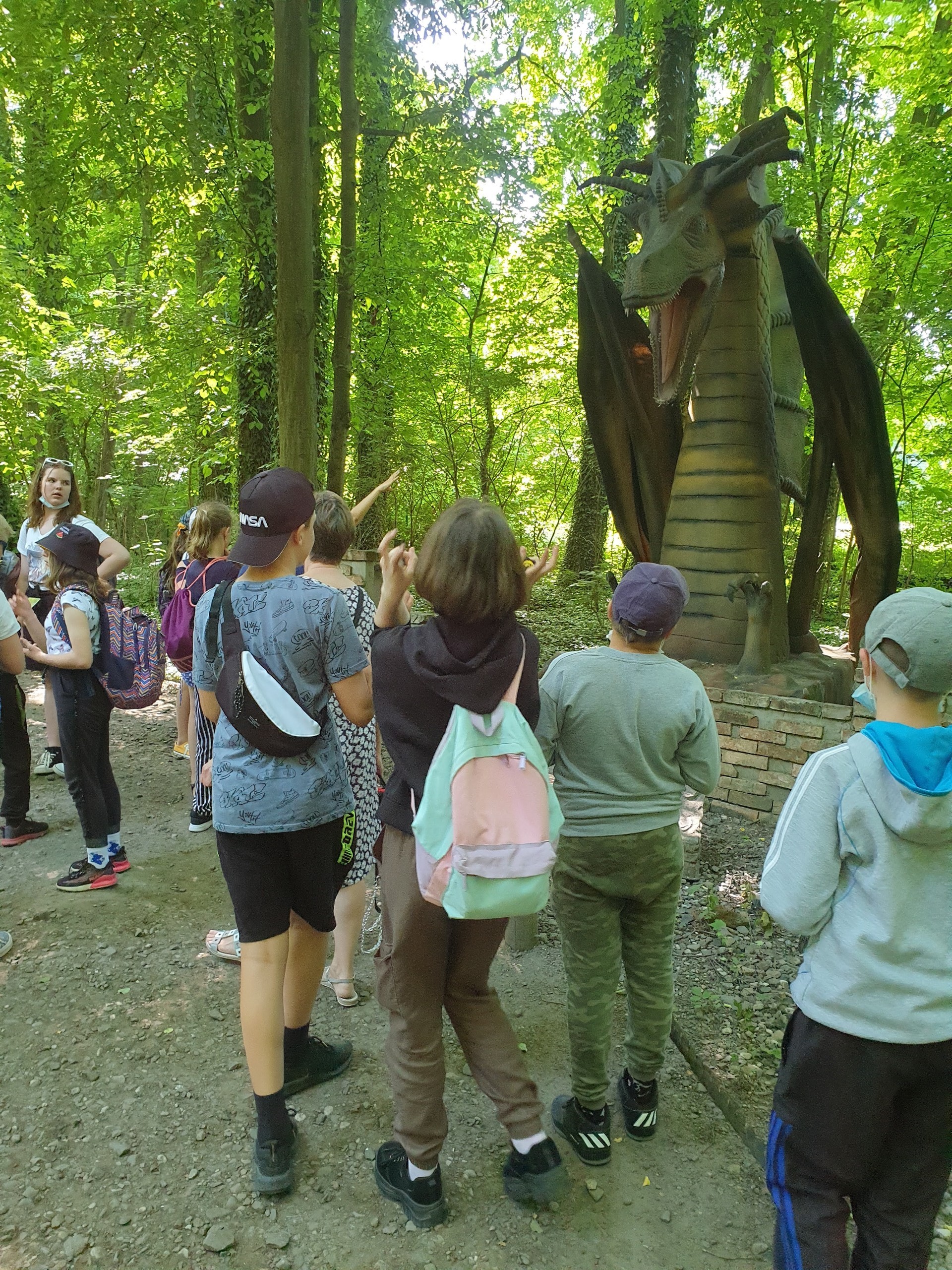 Po tej sporej dawce historii udaliśmy się na pyszny obiad. Najedzeni z niecierpliwością czekaliśmy na kolejny punkt programu, czyli wizytę w DINO PARKU. Głównymi atrakcjami parku była ścieżka edukacyjna, gdzie na swojej drodze mogliśmy spotkać kilkadziesiąt ruchomych dinozaurów, które w otoczeniu pięknej zieleni lasu, przeprowadziły nas przez poszczególne okresy w dziejach ziemi. Smoki w parku były odwzorowaniem ich prawdziwego wyglądu. Poza sztucznymi i stworzonymi przez człowieka figurami zwierząt w parku tym mogliśmy zobaczyć również żywe zwierzęta. Są to m. in. kangury, muflony czy alpaki i inne gatunki, które znajdują się w mini zoo. Oprócz poznawania i nauki była również zabawa na placu zabaw . To było prawdziwe szaleństwo. Zmęczeni, ale bardzo zadowoleni wieczorem wróciliśmy do domu.