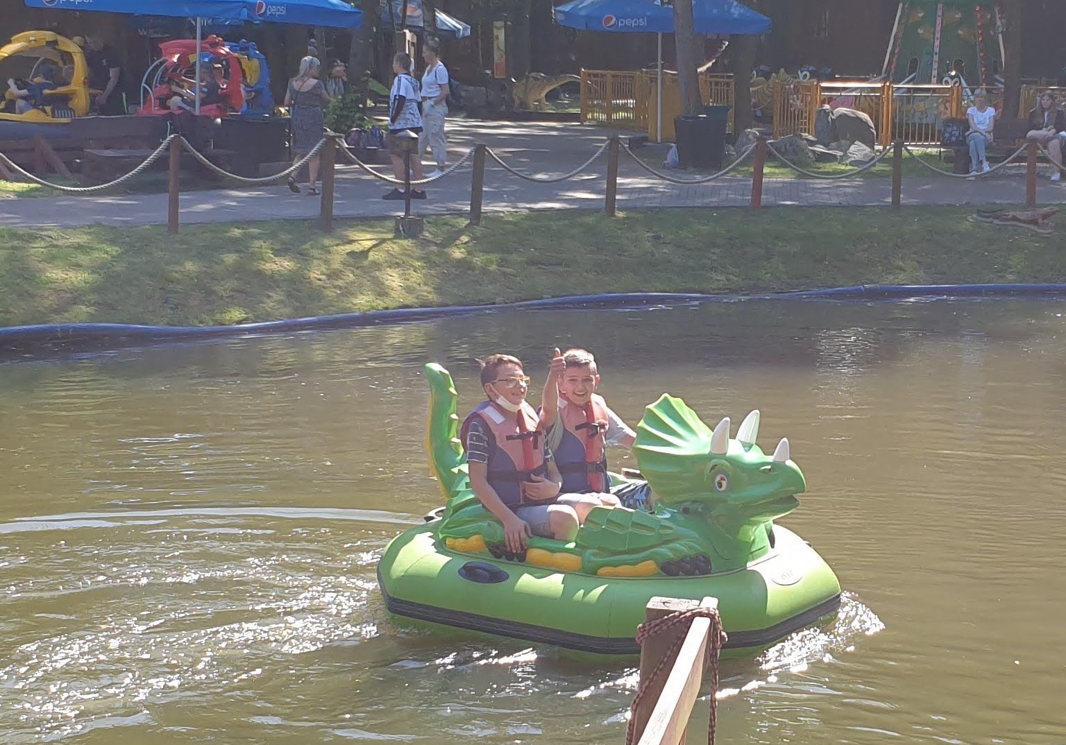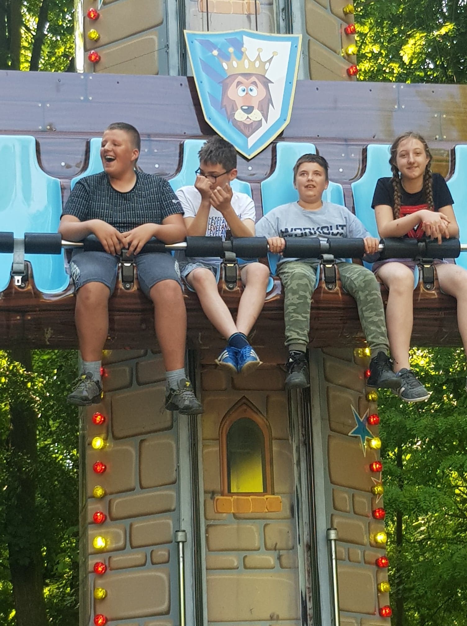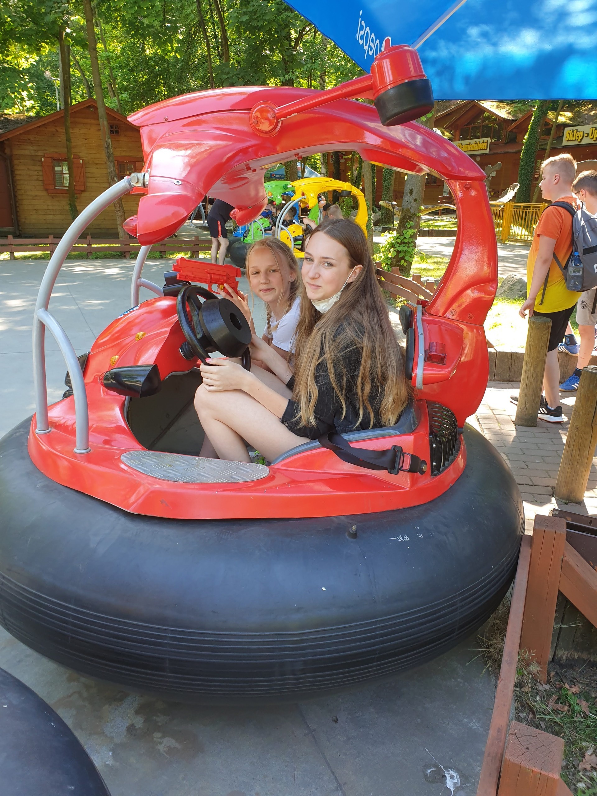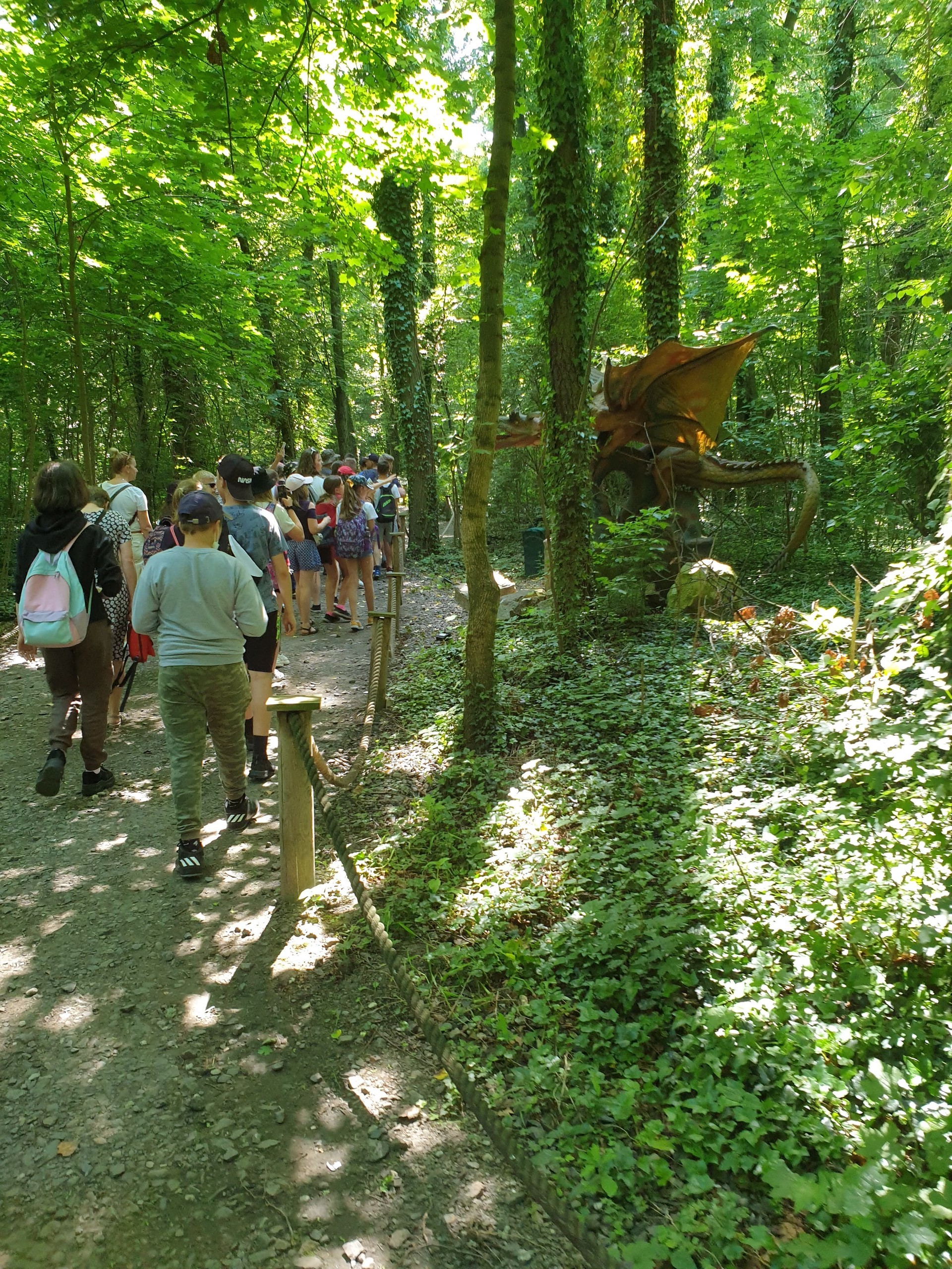 Po tej sporej dawce historii udaliśmy się na pyszny obiad. Najedzeni z niecierpliwością czekaliśmy na kolejny punkt programu, czyli wizytę w DINO PARKU. Głównymi atrakcjami parku była ścieżka edukacyjna, gdzie na swojej drodze mogliśmy spotkać kilkadziesiąt ruchomych dinozaurów, które w otoczeniu pięknej zieleni lasu, przeprowadziły nas przez poszczególne okresy w dziejach ziemi. Smoki w parku były odwzorowaniem ich prawdziwego wyglądu. Poza sztucznymi i stworzonymi przez człowieka figurami zwierząt w parku tym mogliśmy zobaczyć również żywe zwierzęta. Są to m. in. kangury, muflony czy alpaki i inne gatunki, które znajdują się w mini zoo. Oprócz poznawania i nauki była również zabawa na placu zabaw . To było prawdziwe szaleństwo. Zmęczeni, ale bardzo zadowoleni wieczorem wróciliśmy do domu.