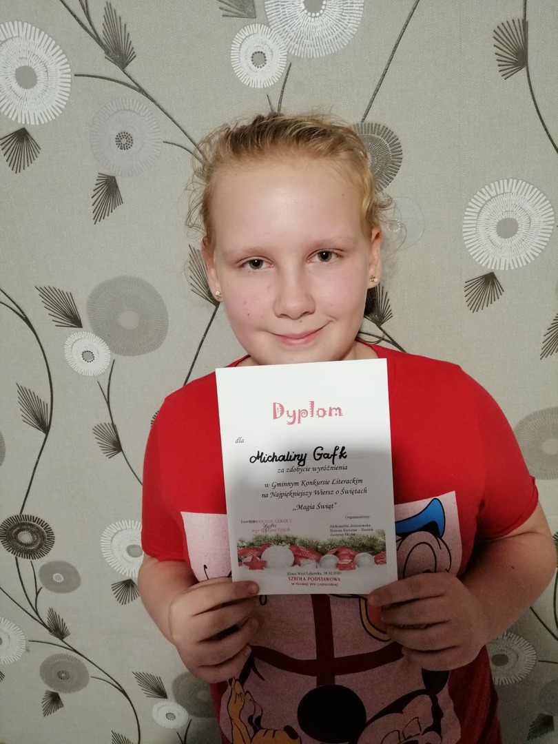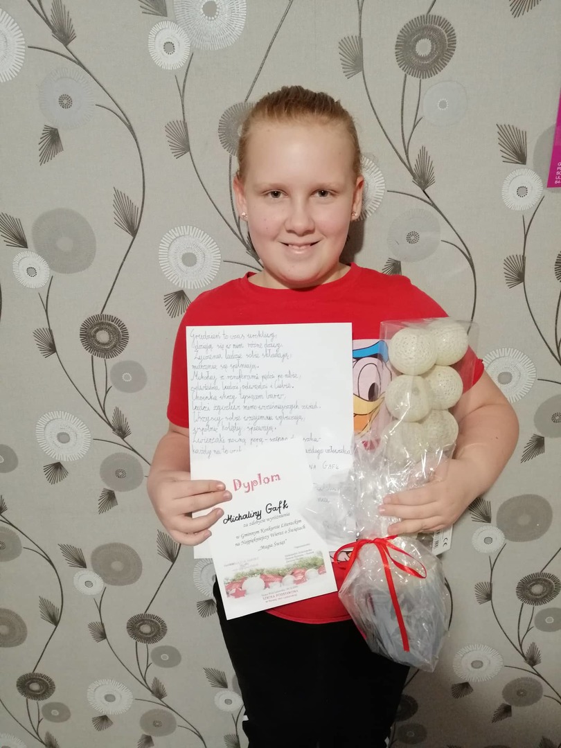 Z wielką radością informujemy, że w Gminnym Konkursie Literackim na Najpiękniejszy Wiersz o Świętach pt. "Magia Świąt", wyróżniona została uczennica klasy 4, Michalina Gafk. Gratulujemy talentu!