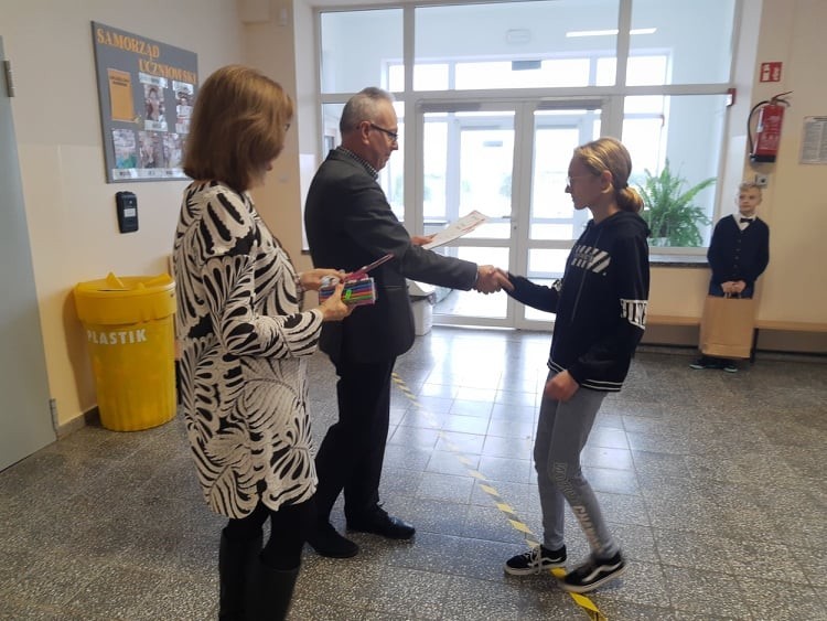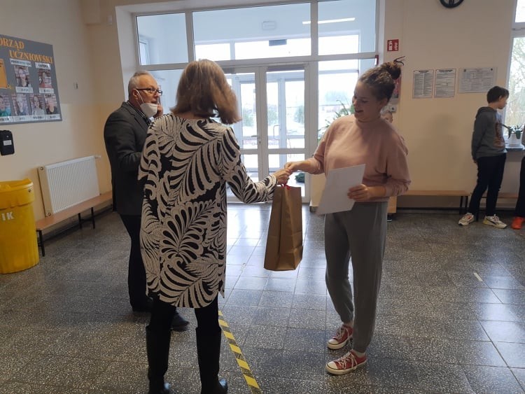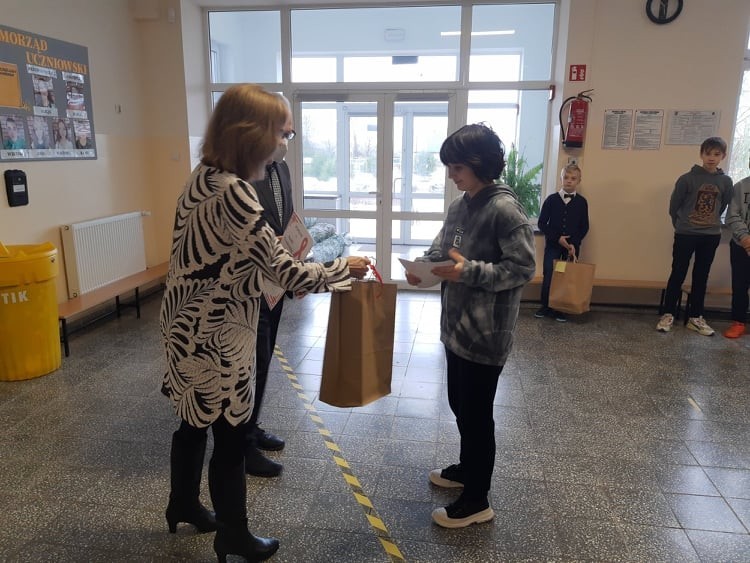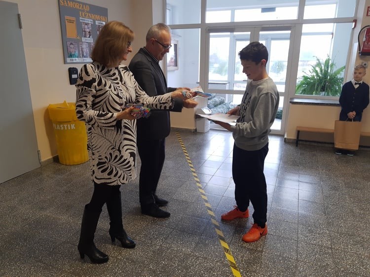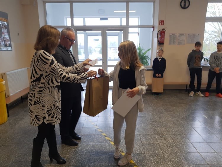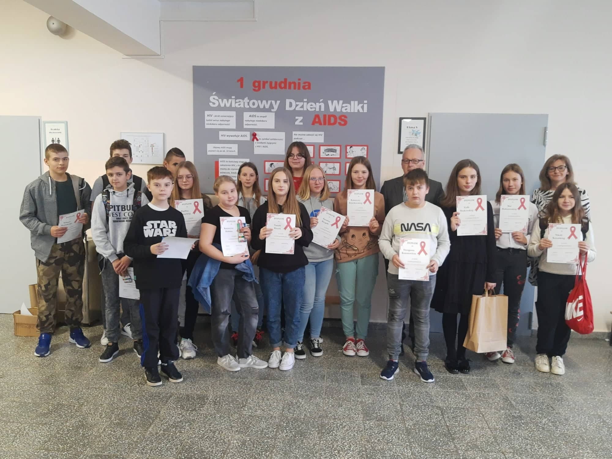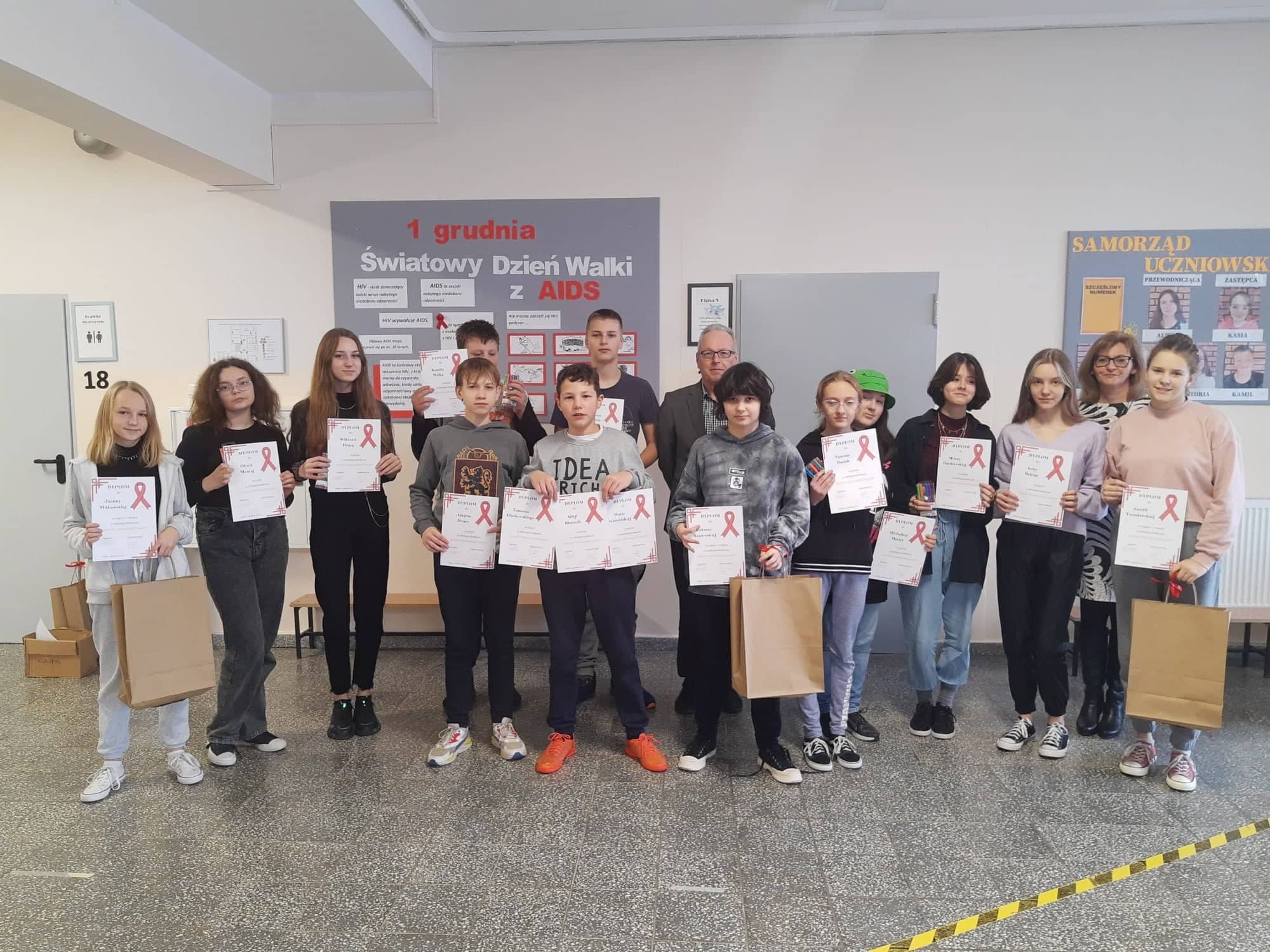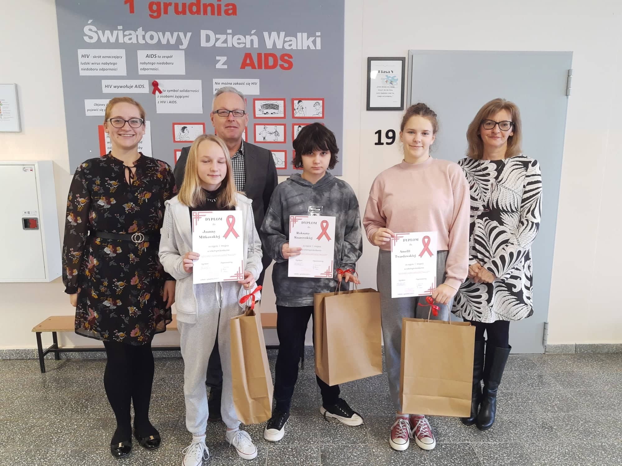 2 grudnia 2021r. w Zespole Szkół im. Jana Pawła II w Łebieniu odbyło się uroczyste wręczenie dyplomów i nagród dla zwycięzców w konkursie profilaktycznym „Co o HIV i AIDS wiedzieć należy?” zorganizowanym dla uczniów klasy VII i VIII.