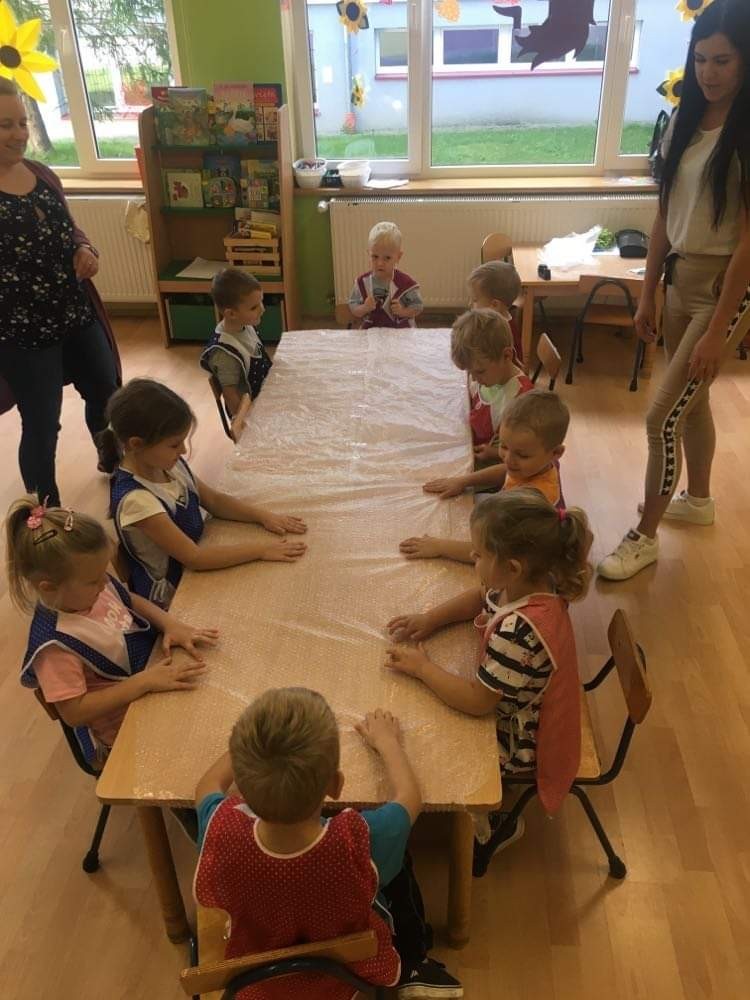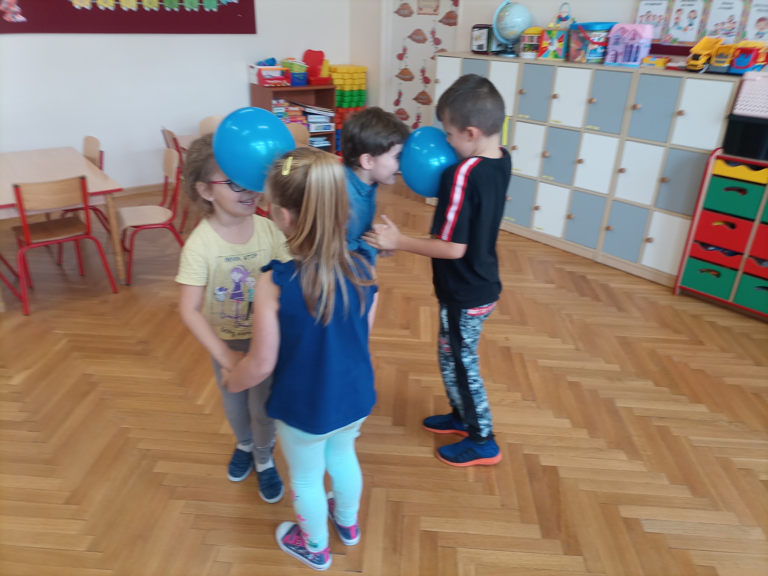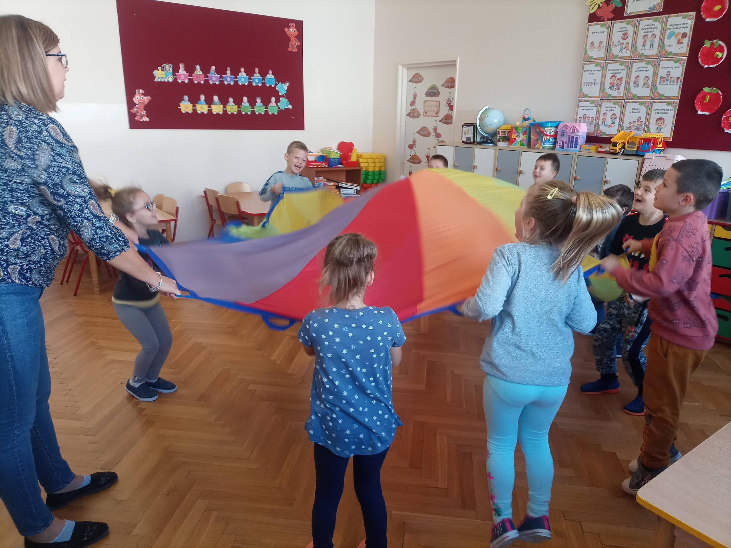 Dzieci ten dzień spędziły na fantastycznej zabawie, nie było czasu na nudę. Wszystkim towarzyszyły dobre humory. Oprócz zabaw z chustą animacyjną, dzieci miały możliwość wykonać wspólną fotobudkę, czy ubrudzić się trochę farbami. Każdy przedszkolak otrzymał drobny upominek.