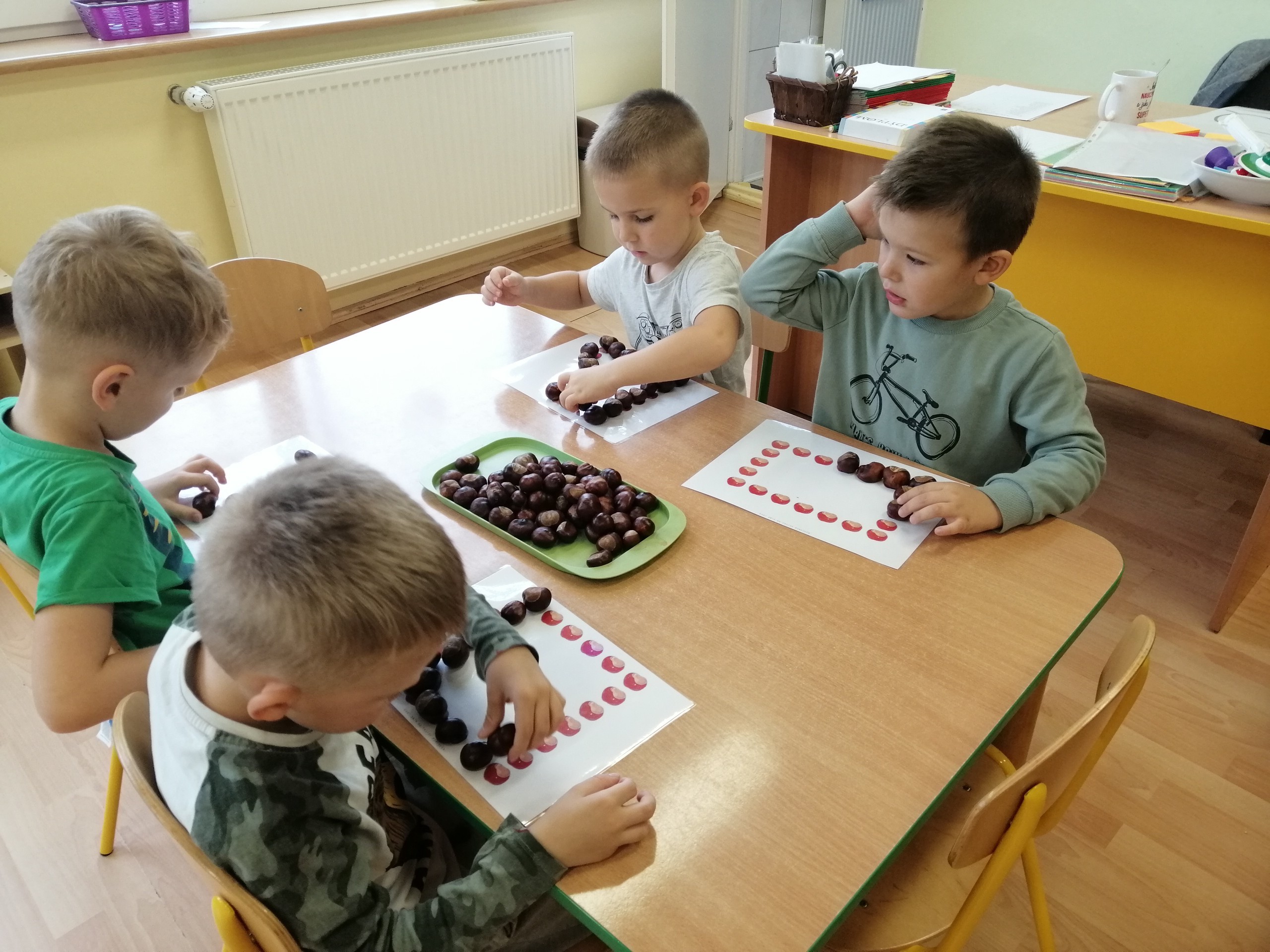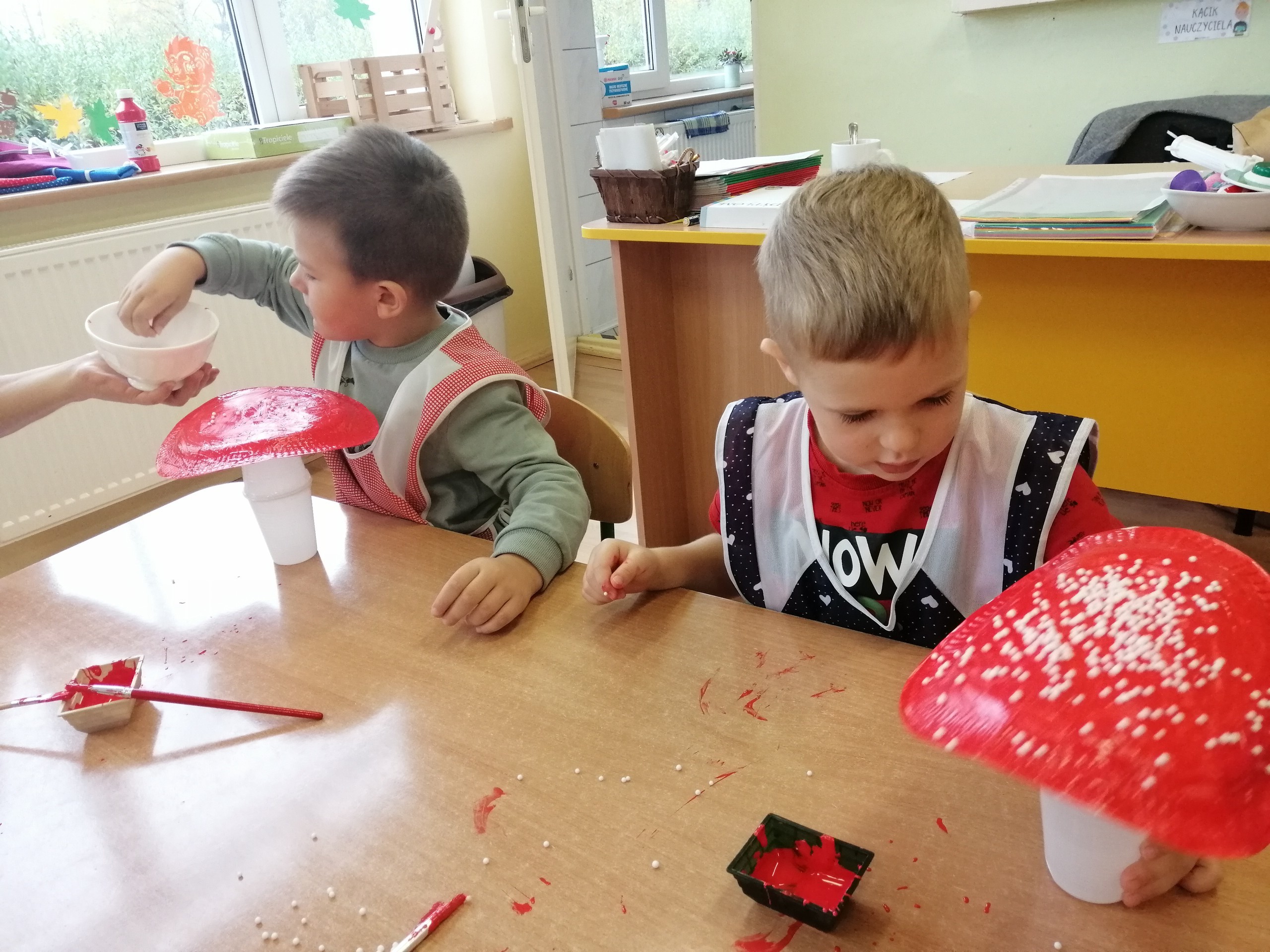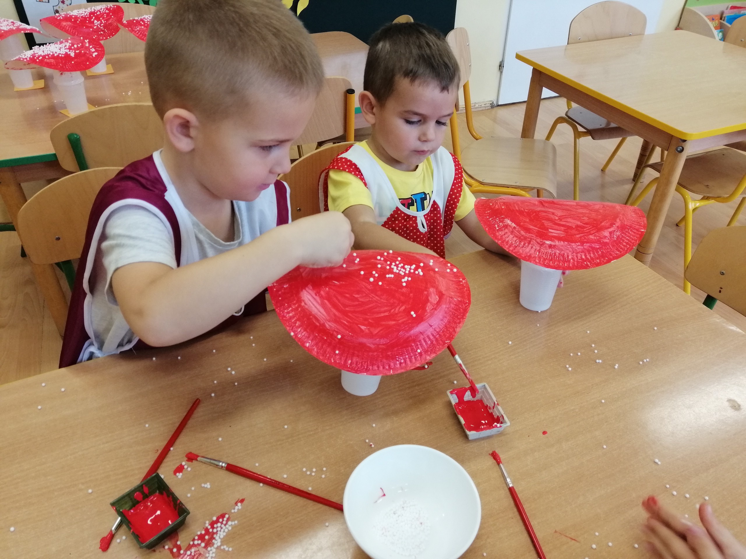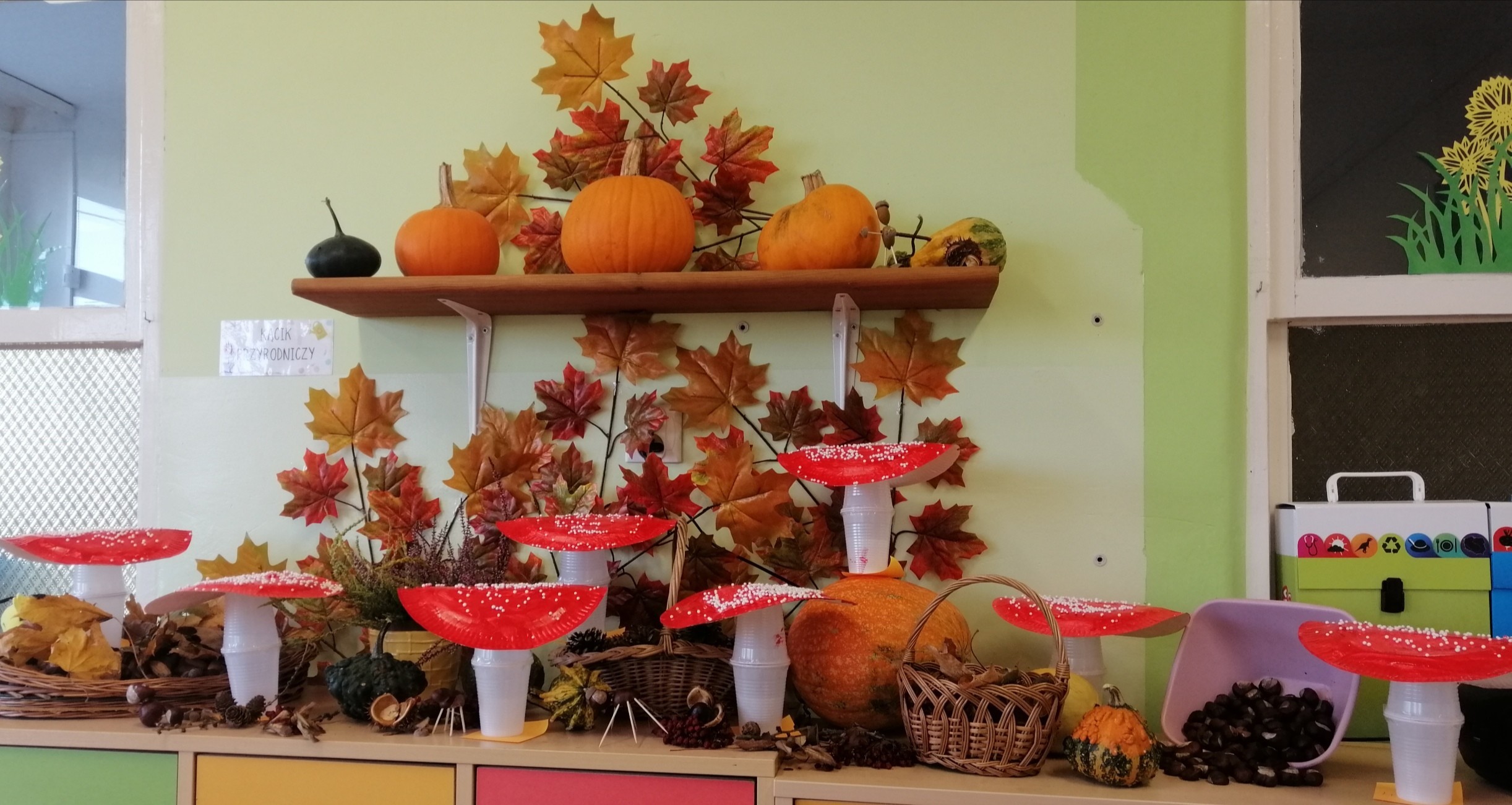 Jesień to magiczna i pełna kolorów pora roku. Natura zmienia się dynamicznie i inspiruje małych artystów do tworzenia barwnych i ciekawych prac plastycznych. Grupa Pszczółki tworząc kącik jesienny w swojej sali wzbogaciła go o piękne czerwone muchomory. Kasztany zamieniając się w figury geometryczne, różnego rodzaju wzory pobudziły u dzieci orientację przestrzenną.
