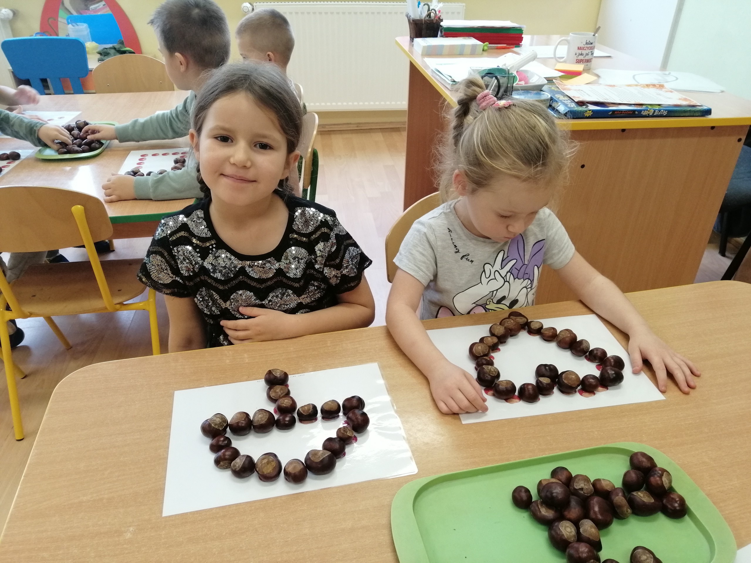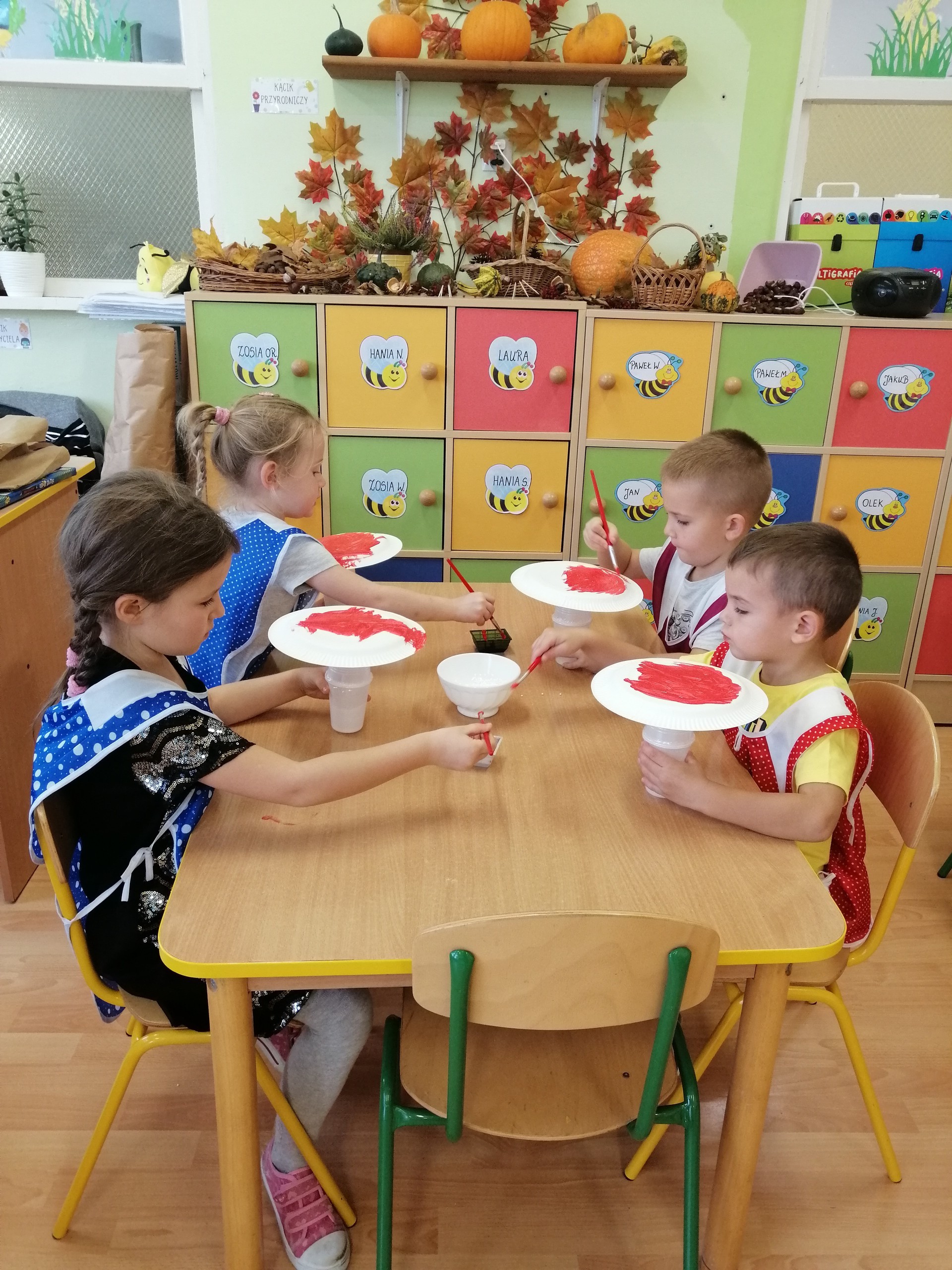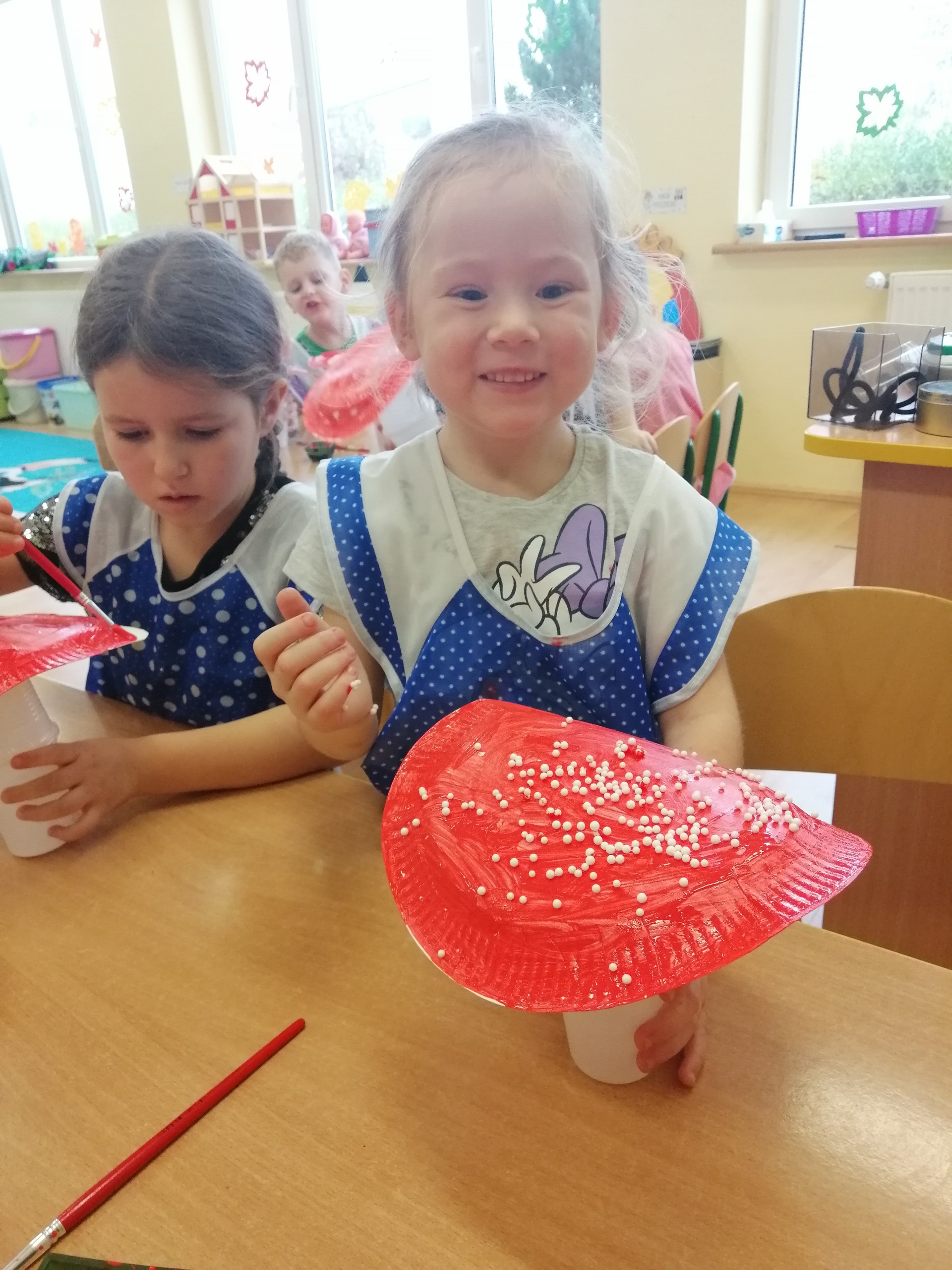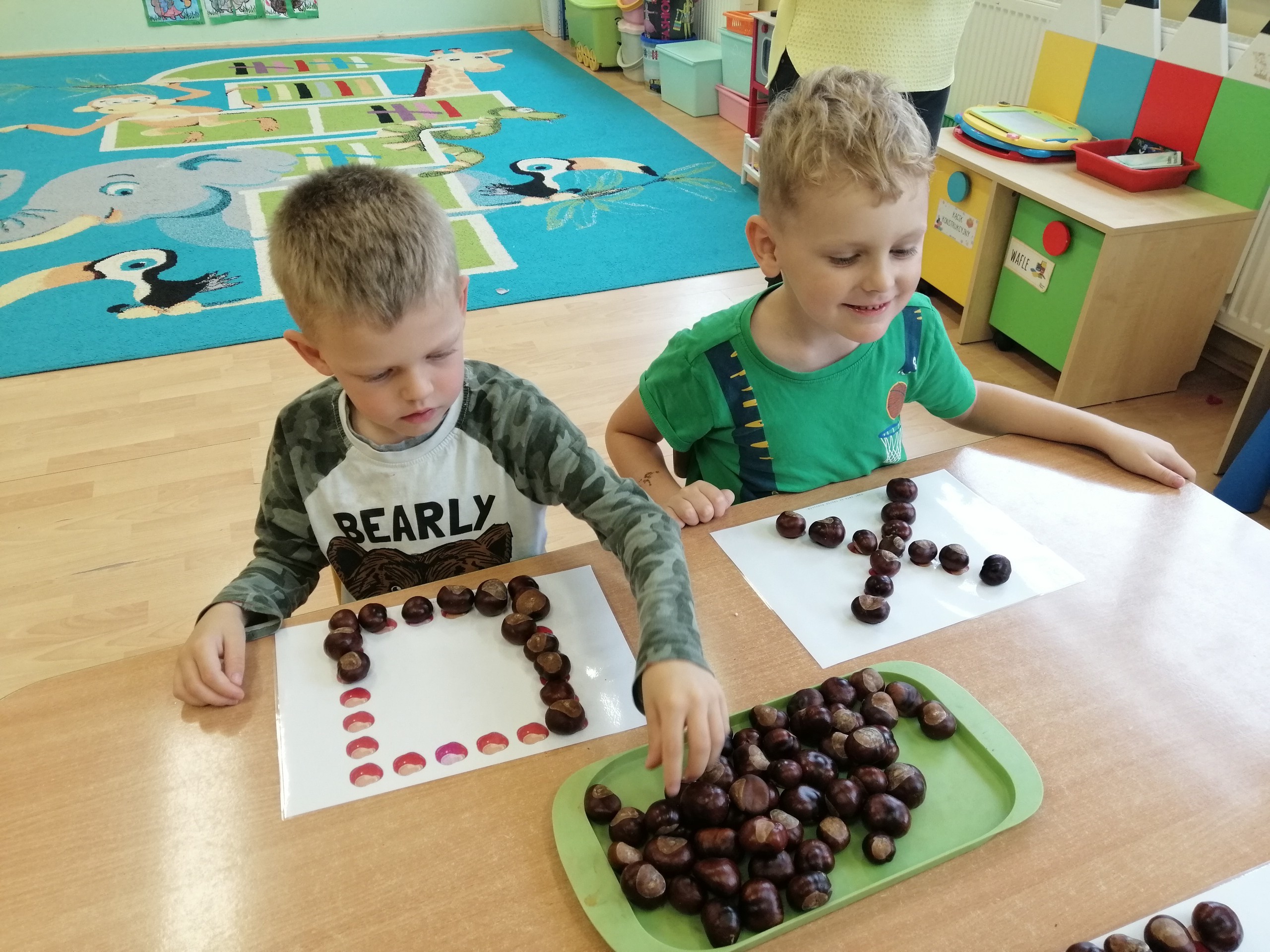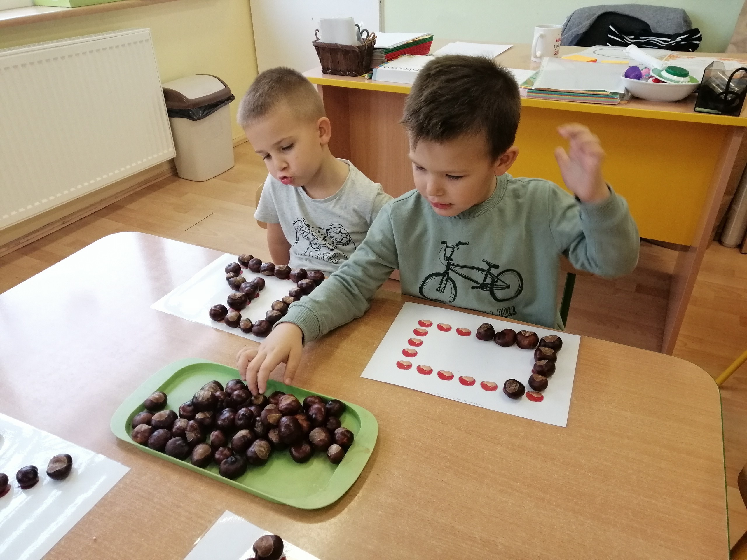 Jesień to magiczna i pełna kolorów pora roku. Natura zmienia się dynamicznie i inspiruje małych artystów do tworzenia barwnych i ciekawych prac plastycznych. Grupa Pszczółki tworząc kącik jesienny w swojej sali wzbogaciła go o piękne czerwone muchomory. Kasztany zamieniając się w figury geometryczne, różnego rodzaju wzory pobudziły u dzieci orientację przestrzenną.