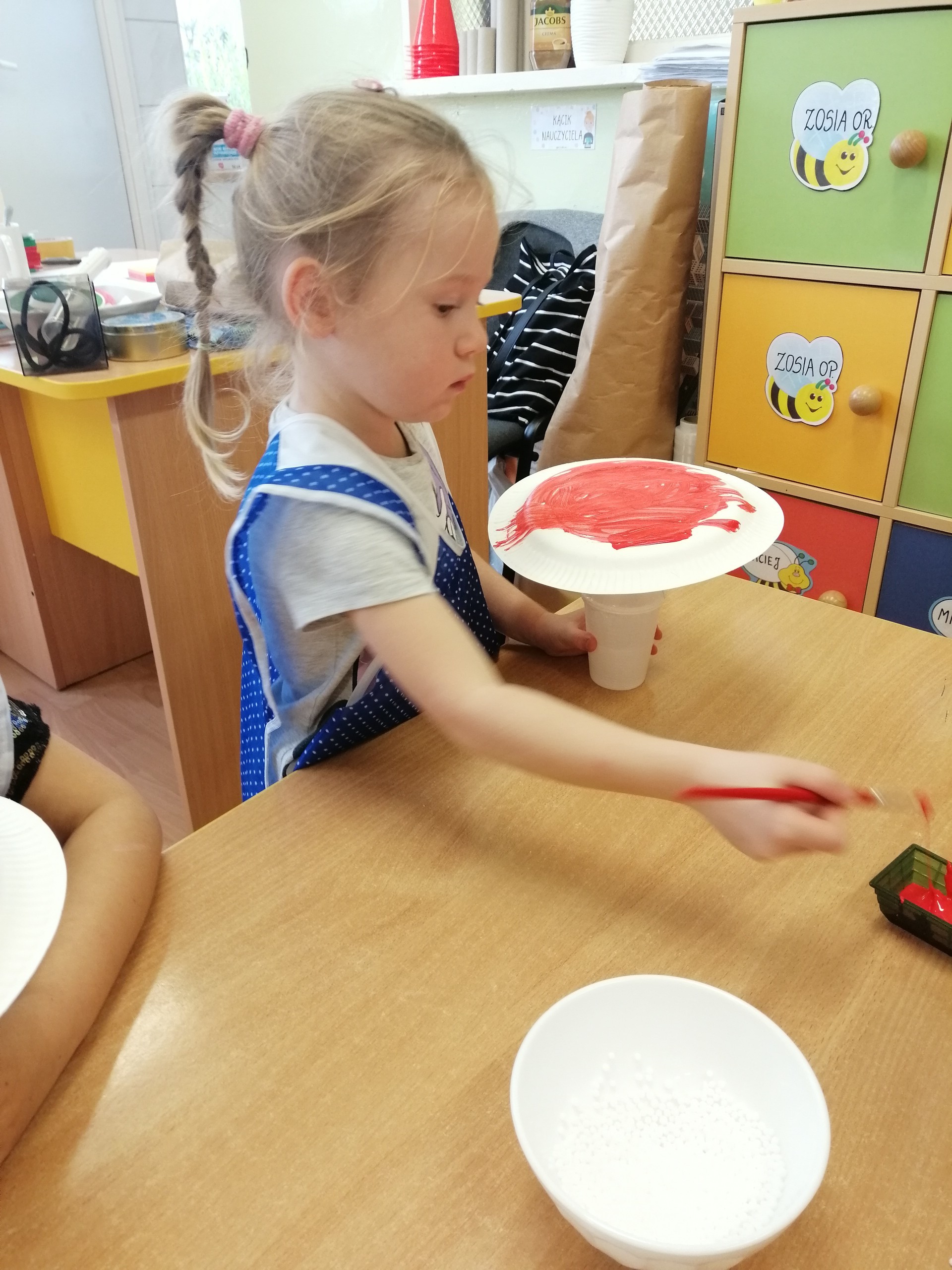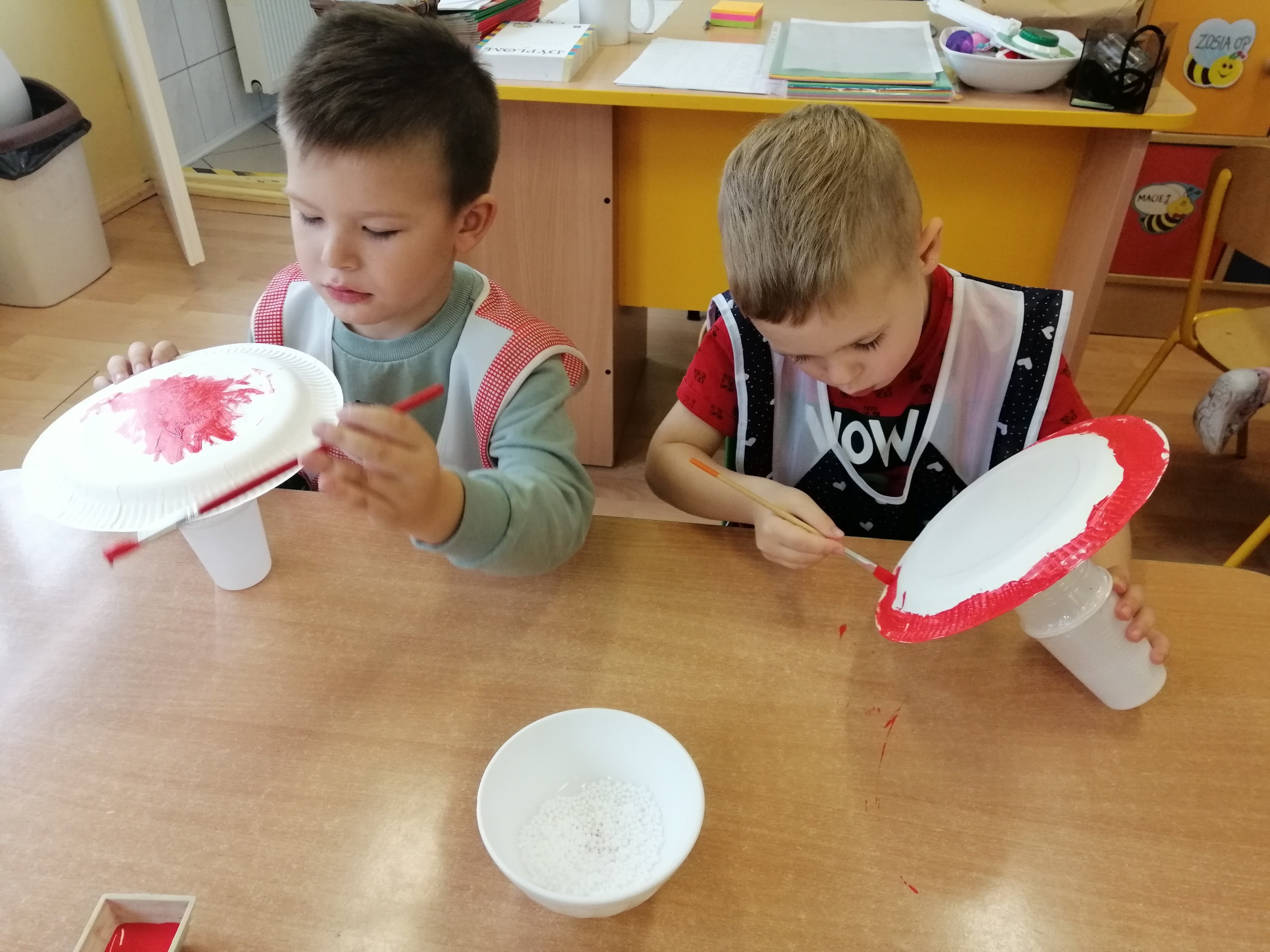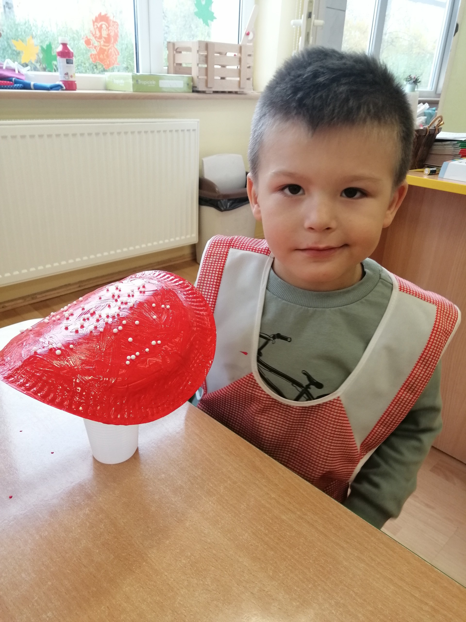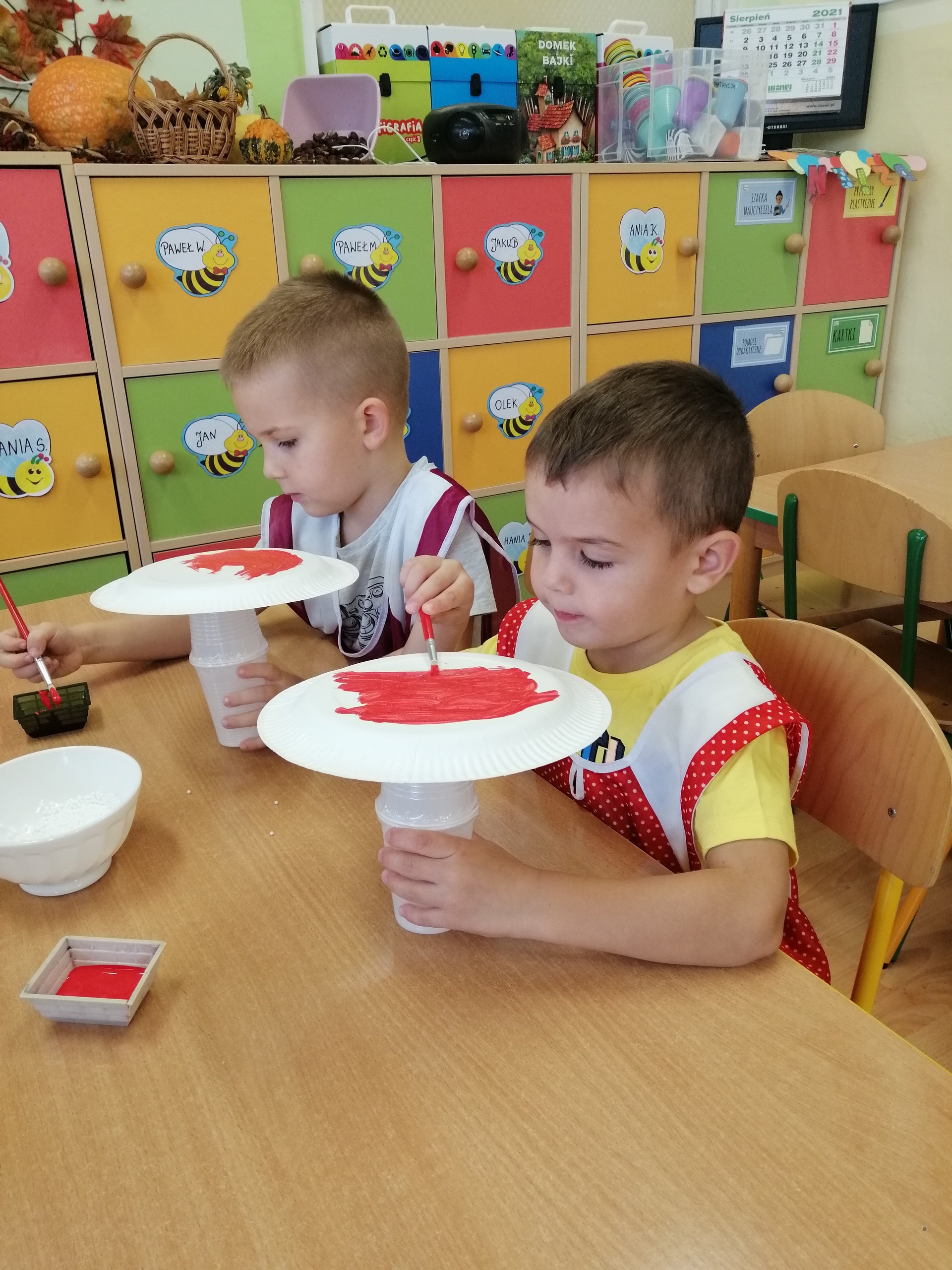 Jesień to magiczna i pełna kolorów pora roku. Natura zmienia się dynamicznie i inspiruje małych artystów do tworzenia barwnych i ciekawych prac plastycznych. Grupa Pszczółki tworząc kącik jesienny w swojej sali wzbogaciła go o piękne czerwone muchomory. Kasztany zamieniając się w figury geometryczne, różnego rodzaju wzory pobudziły u dzieci orientację przestrzenną.