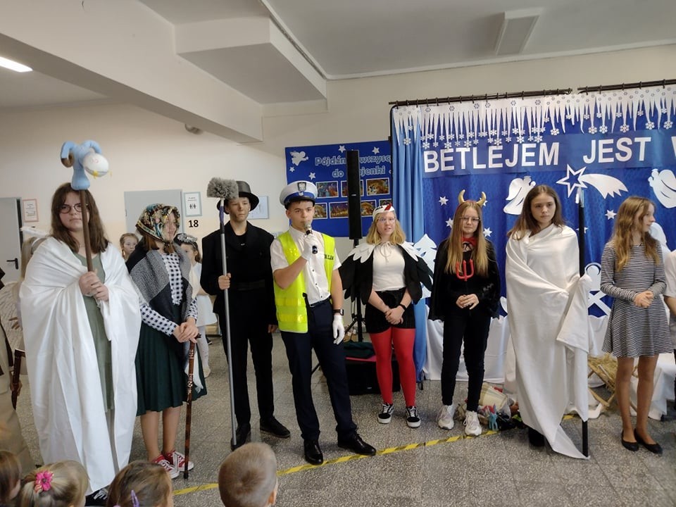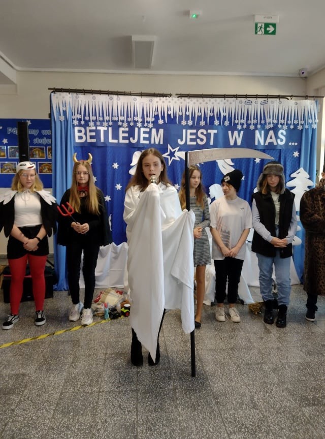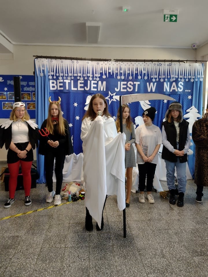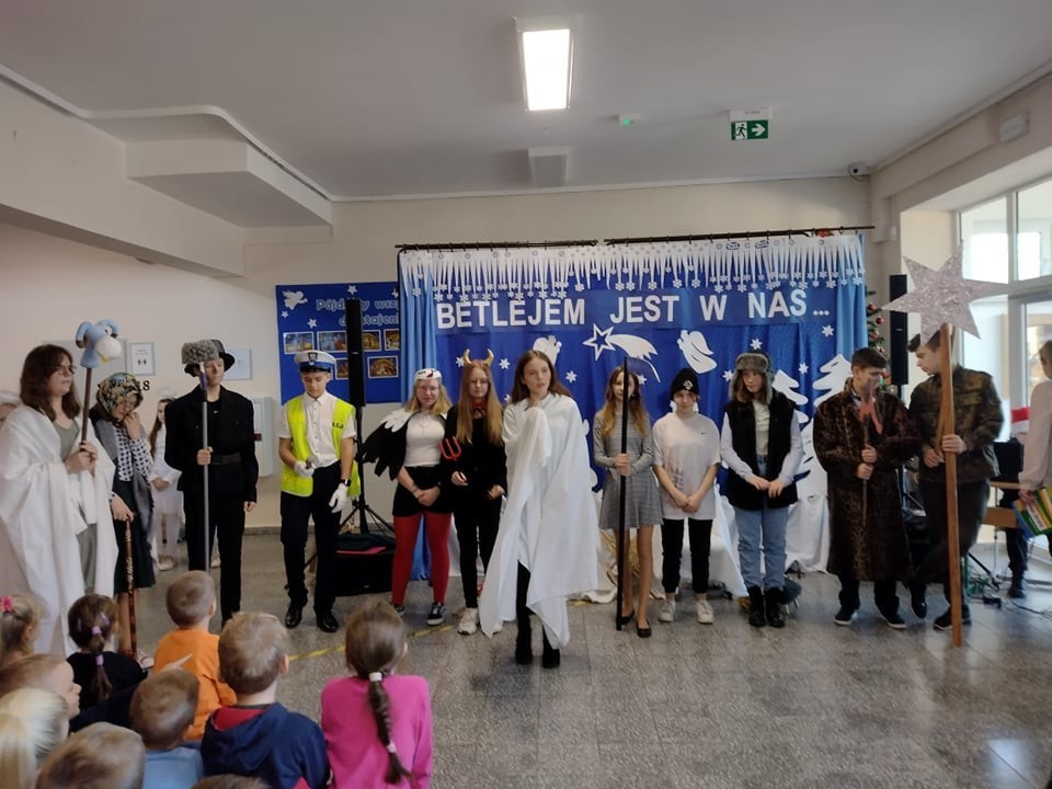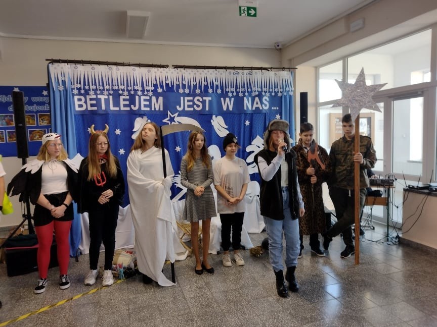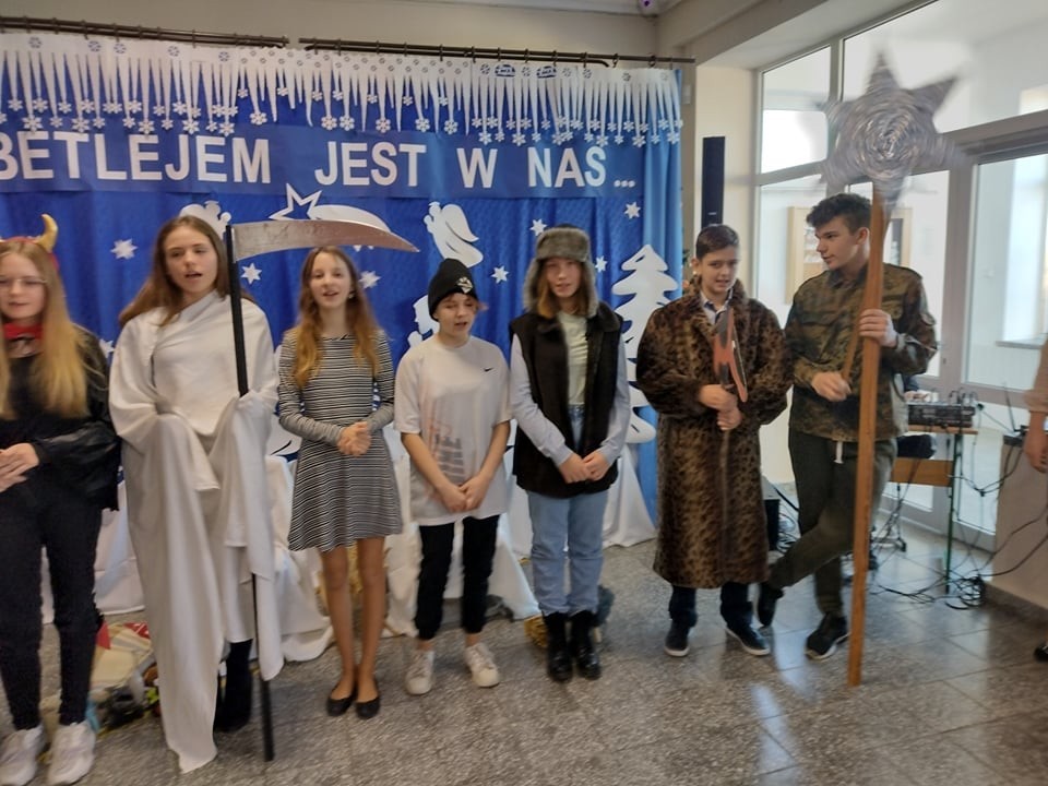 W role kolędników wcielili się uczniowie klasy VII - w ramach lekcji języka kaszubskiego. Przygotowali swoje stroje i rekwizyty. Przedstawienie było bardzo ciekawe.