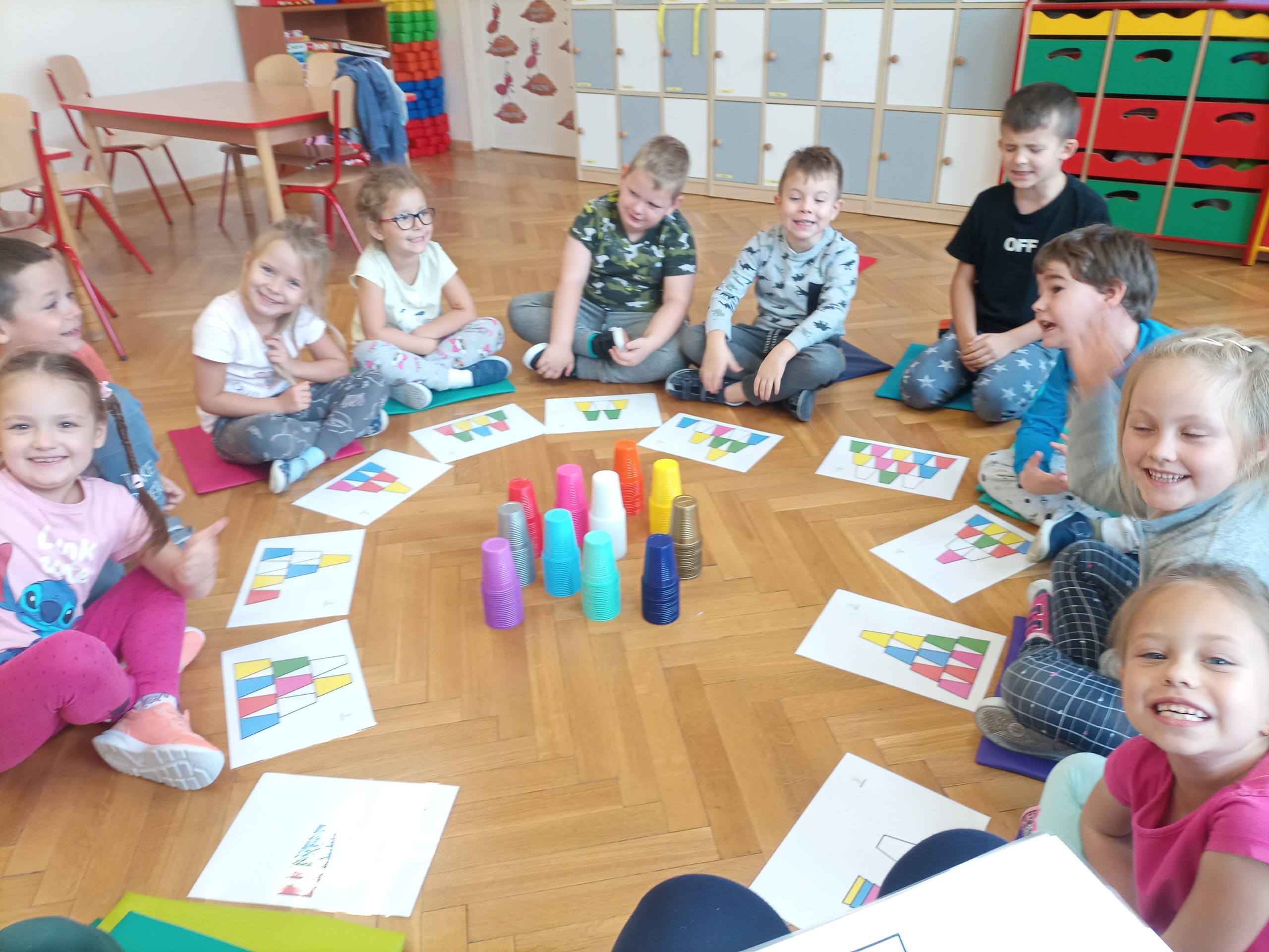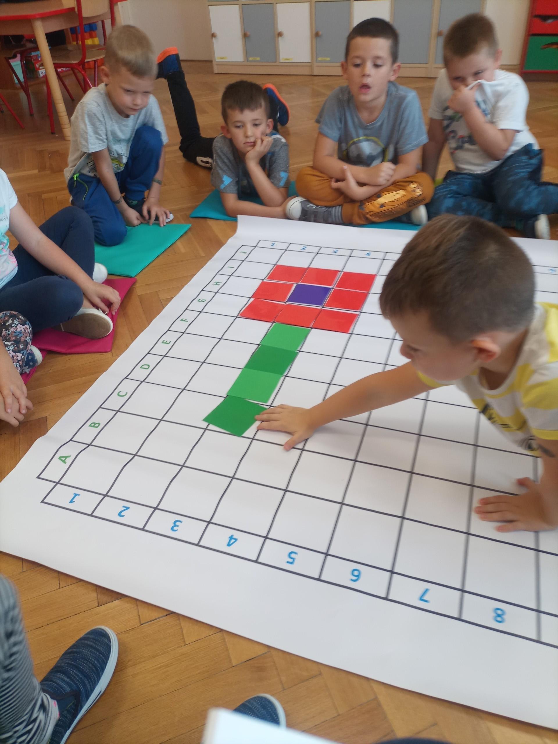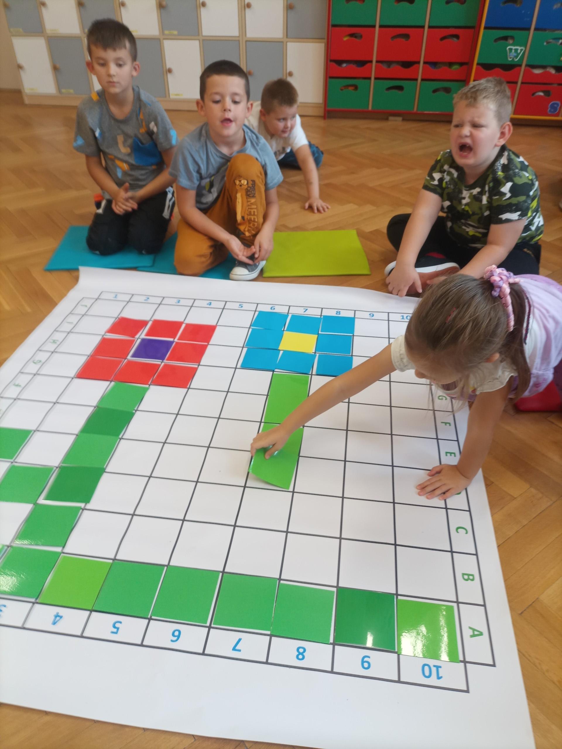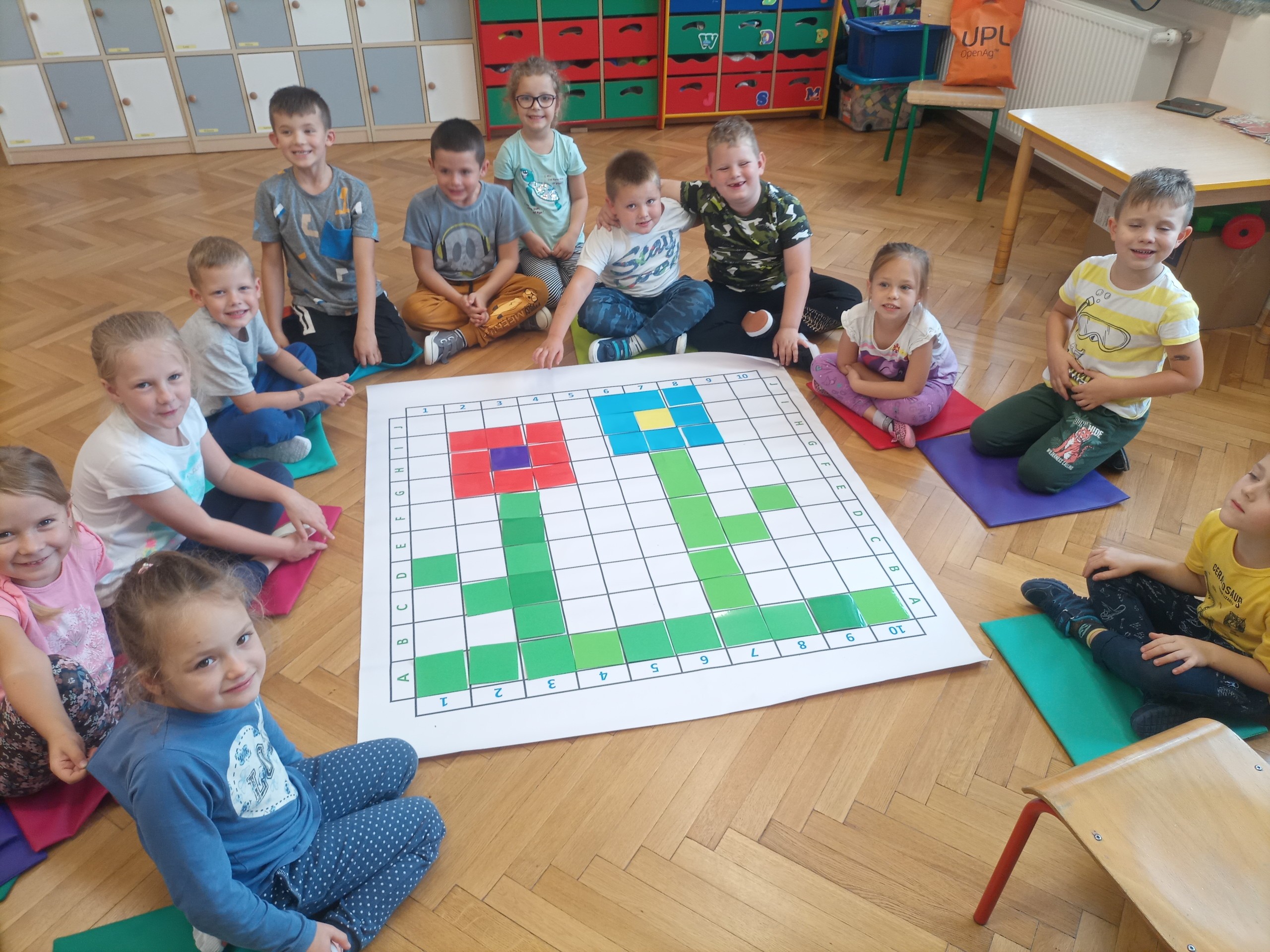 Zajęcia w naszym przedszkolu prowadzone są w formie zabawy. Dziecko dostaje wzór albo wskazówki według którego układa na planszy daną grafikę. Można porównać ją np. do gry w statki. Przed dzieckiem znajduje się mata, plansza z siatką z wyznaczonymi miejscami na grafikę układaną według podanego wzoru. Dorosły może tu wykazać się kreatywnością w wymyślaniu formy tych zabaw. Oprócz gry w statki, kodowanie może być również przestrzenne. Przykładem takiej zabawy jest ustawianie kolorowych kubków (jeden na drugim) według np. kolorów do góry. Zabawy nie muszą być prowadzone na płaskiej powierzchni. Do kodowania można wykorzystać praktycznie wszystko. Możemy ustalić wzór, w którym znajdują się cechy charakterystyczne dla dzieci. Ustalamy dany element dotyczący przedszkolaków (np. płeć, kolor koszulki, szarfy). Dzieci ustawiają się w rząd według podanej sekwencji. Zabawy polegają na tym, że nasze pociechy uczą się również ustalać podobieństwa między elementami, szukają cech wspólnych, przeliczają, segregują, porządkują, podążają według podanej wskazówki. Metoda jest uniwersalna, dzięki czemu możemy dostosować do tygodniowego tematu zajęć. Przynosi wiele korzyści.