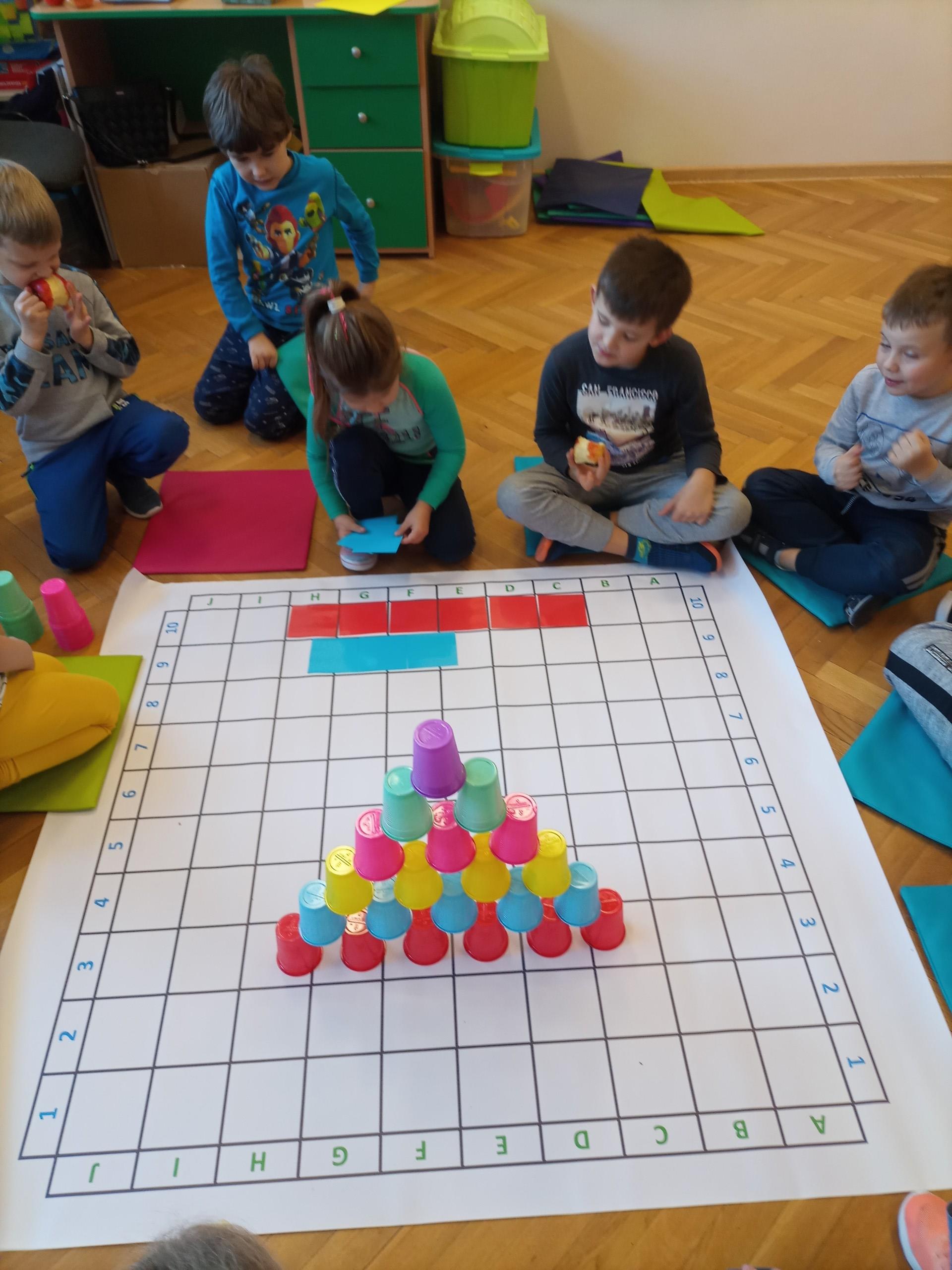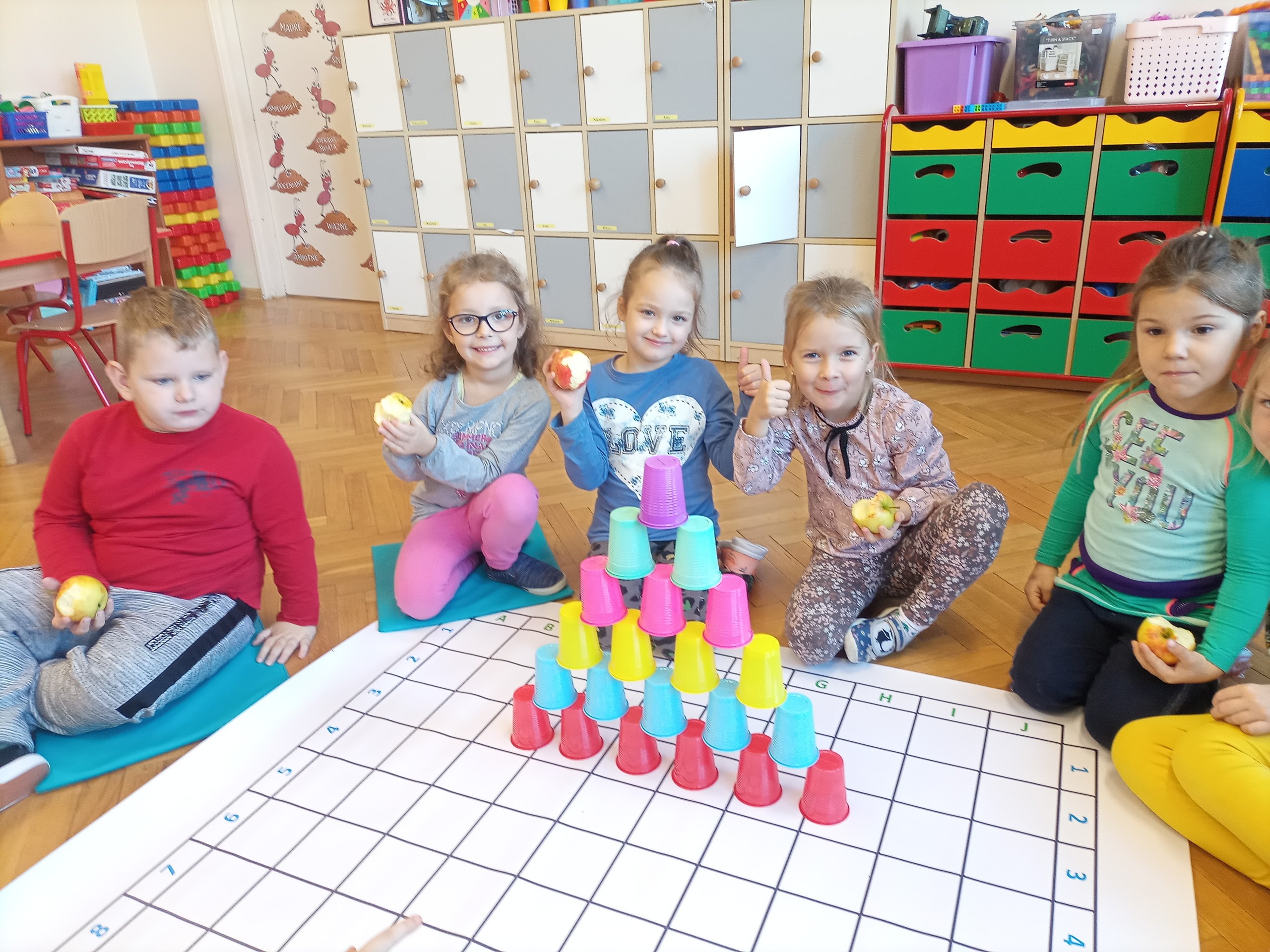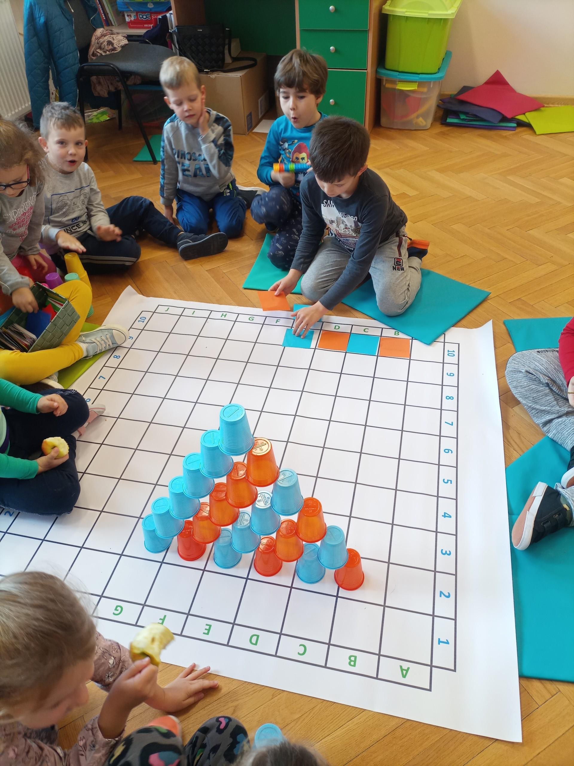 Zajęcia w naszym przedszkolu prowadzone są w formie zabawy. Dziecko dostaje wzór albo wskazówki według którego układa na planszy daną grafikę. Można porównać ją np. do gry w statki. Przed dzieckiem znajduje się mata, plansza z siatką z wyznaczonymi miejscami na grafikę układaną według podanego wzoru. Dorosły może tu wykazać się kreatywnością w wymyślaniu formy tych zabaw. Oprócz gry w statki, kodowanie może być również przestrzenne. Przykładem takiej zabawy jest ustawianie kolorowych kubków (jeden na drugim) według np. kolorów do góry. Zabawy nie muszą być prowadzone na płaskiej powierzchni. Do kodowania można wykorzystać praktycznie wszystko. Możemy ustalić wzór, w którym znajdują się cechy charakterystyczne dla dzieci. Ustalamy dany element dotyczący przedszkolaków (np. płeć, kolor koszulki, szarfy). Dzieci ustawiają się w rząd według podanej sekwencji. Zabawy polegają na tym, że nasze pociechy uczą się również ustalać podobieństwa między elementami, szukają cech wspólnych, przeliczają, segregują, porządkują, podążają według podanej wskazówki. Metoda jest uniwersalna, dzięki czemu możemy dostosować do tygodniowego tematu zajęć. Przynosi wiele korzyści.
