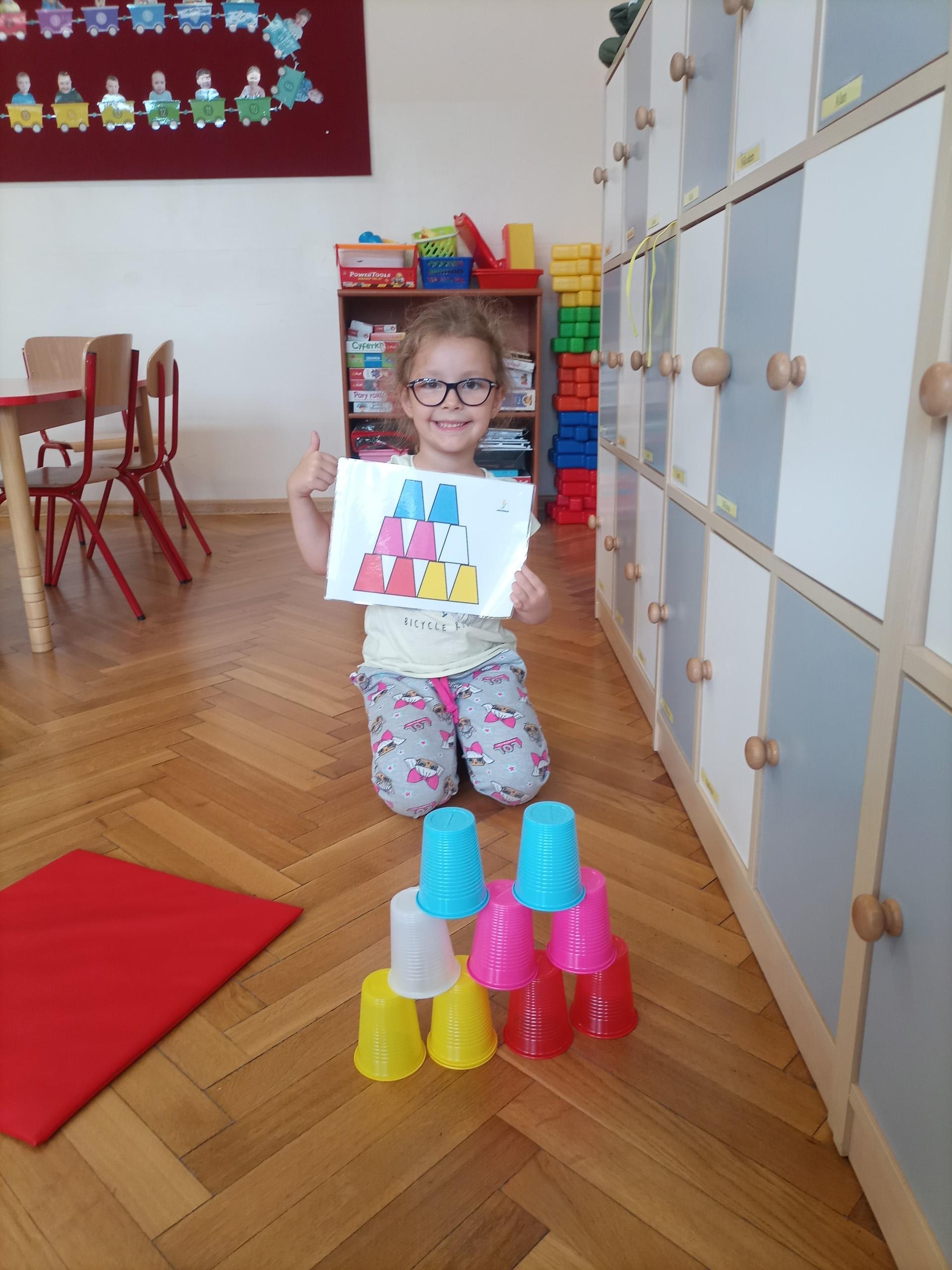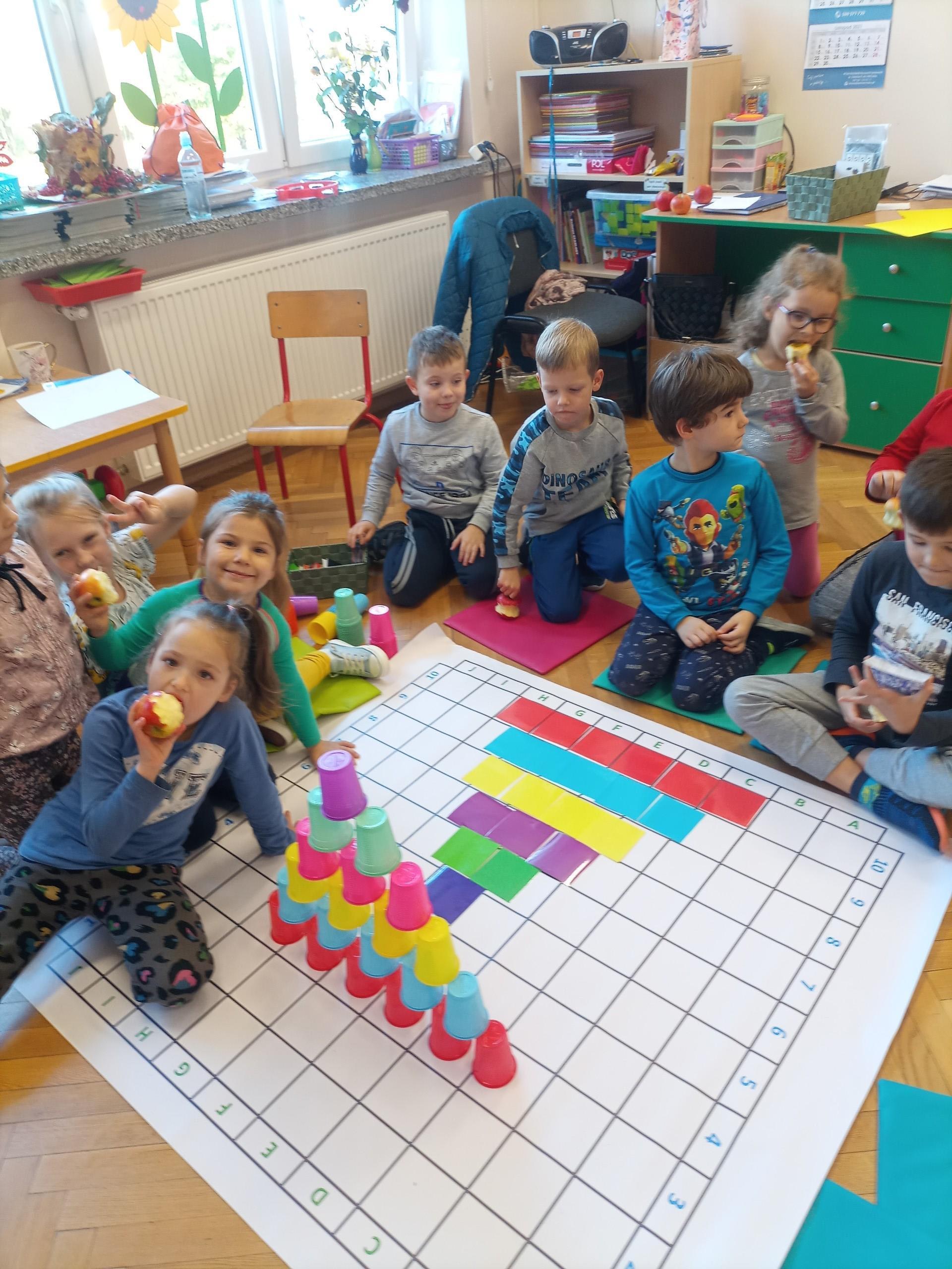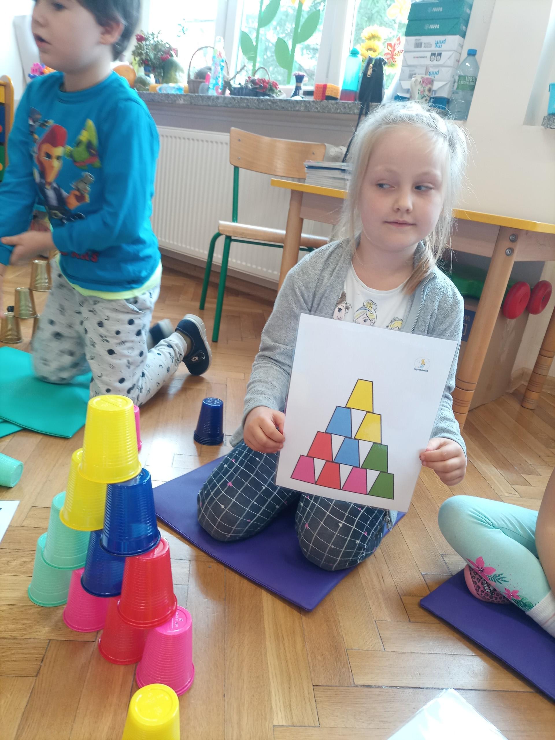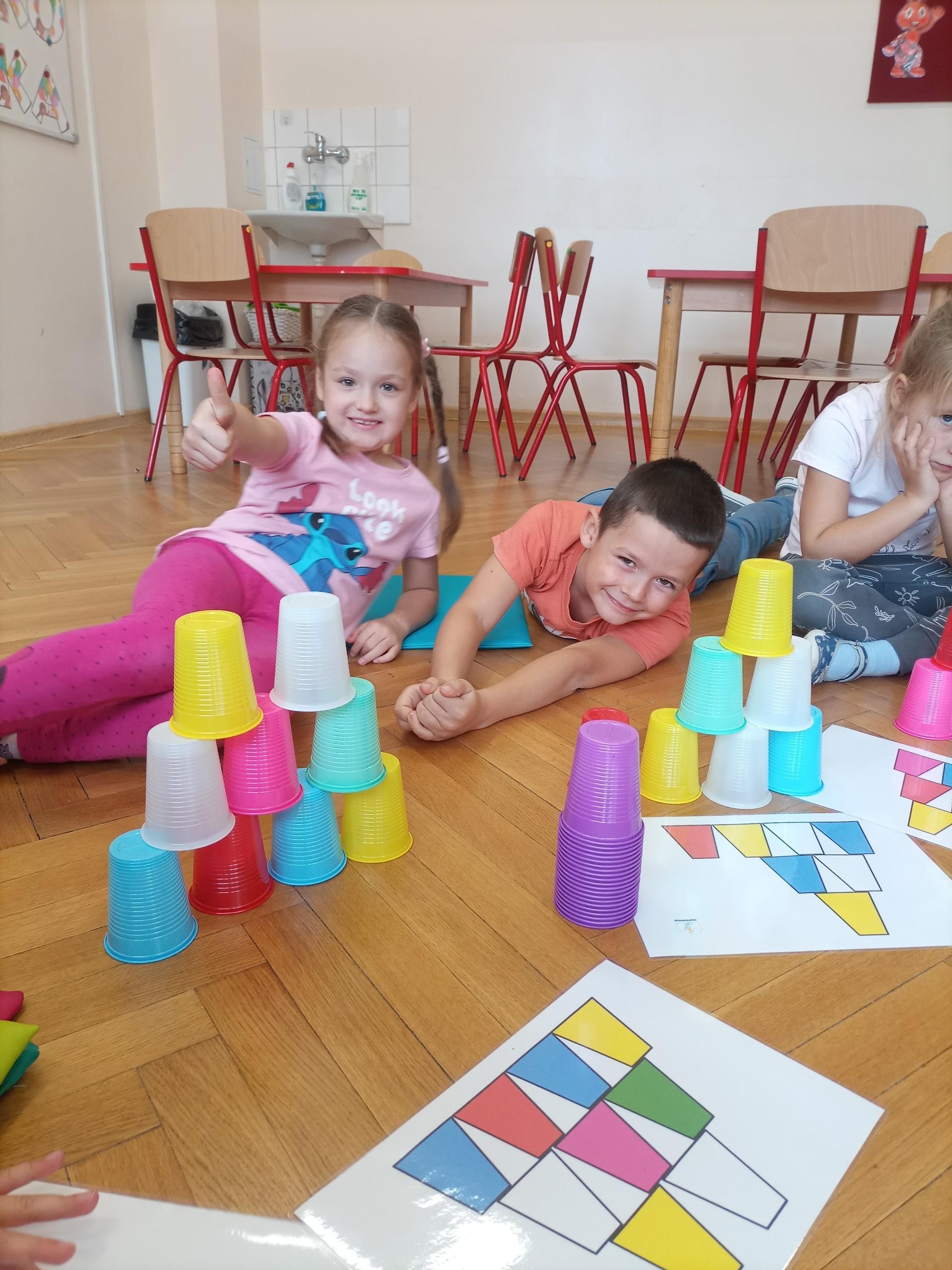 Zajęcia w naszym przedszkolu prowadzone są w formie zabawy. Dziecko dostaje wzór albo wskazówki według którego układa na planszy daną grafikę. Można porównać ją np. do gry w statki. Przed dzieckiem znajduje się mata, plansza z siatką z wyznaczonymi miejscami na grafikę układaną według podanego wzoru. Dorosły może tu wykazać się kreatywnością w wymyślaniu formy tych zabaw. Oprócz gry w statki, kodowanie może być również przestrzenne. Przykładem takiej zabawy jest ustawianie kolorowych kubków (jeden na drugim) według np. kolorów do góry. Zabawy nie muszą być prowadzone na płaskiej powierzchni. Do kodowania można wykorzystać praktycznie wszystko. Możemy ustalić wzór, w którym znajdują się cechy charakterystyczne dla dzieci. Ustalamy dany element dotyczący przedszkolaków (np. płeć, kolor koszulki, szarfy). Dzieci ustawiają się w rząd według podanej sekwencji. Zabawy polegają na tym, że nasze pociechy uczą się również ustalać podobieństwa między elementami, szukają cech wspólnych, przeliczają, segregują, porządkują, podążają według podanej wskazówki. Metoda jest uniwersalna, dzięki czemu możemy dostosować do tygodniowego tematu zajęć. Przynosi wiele korzyści.