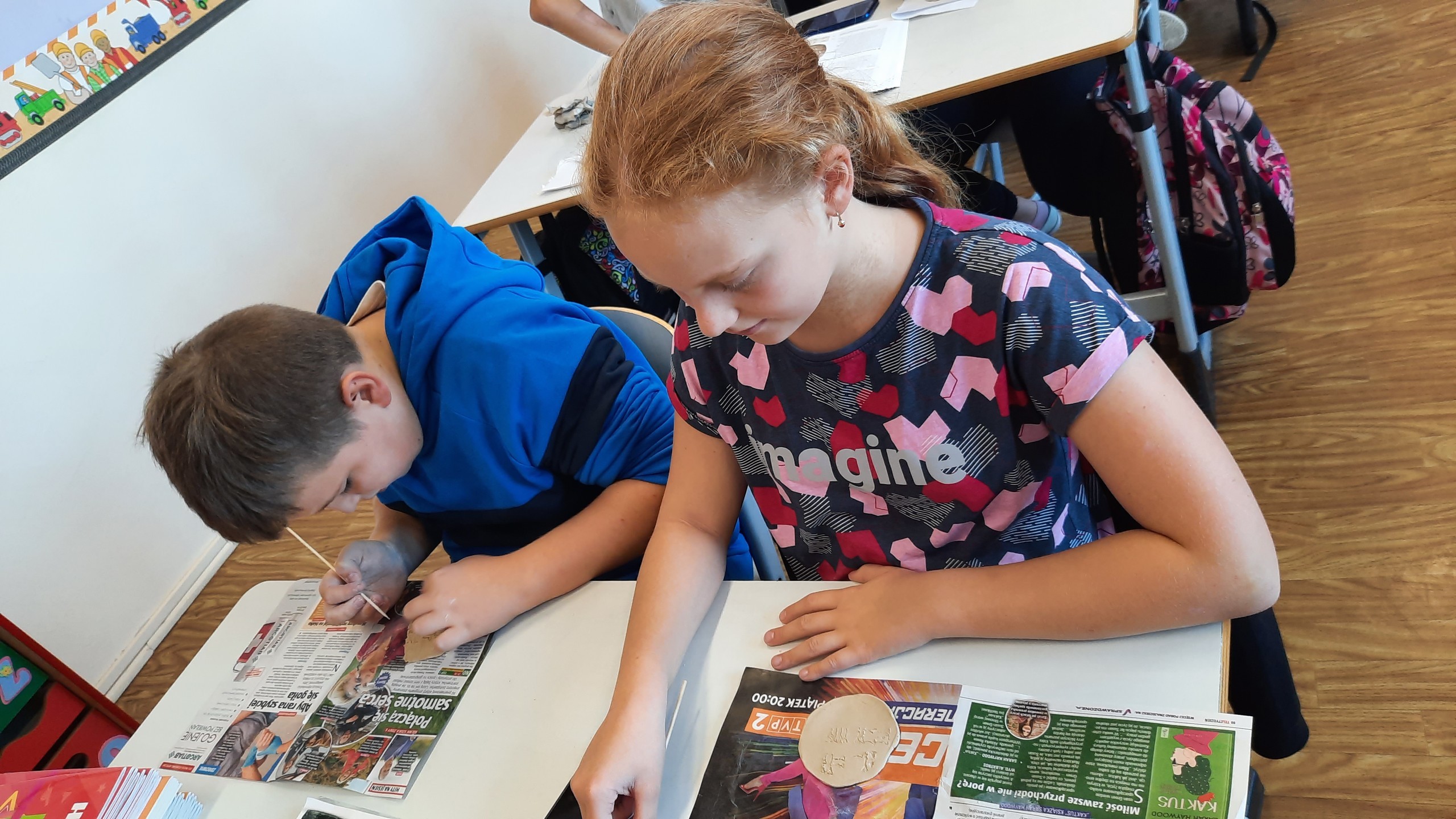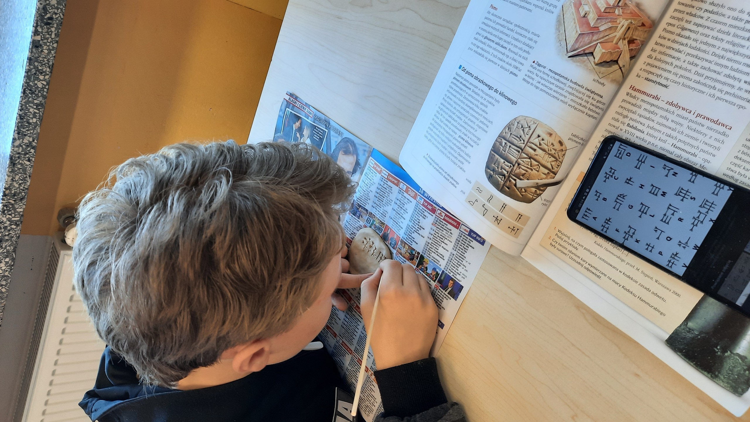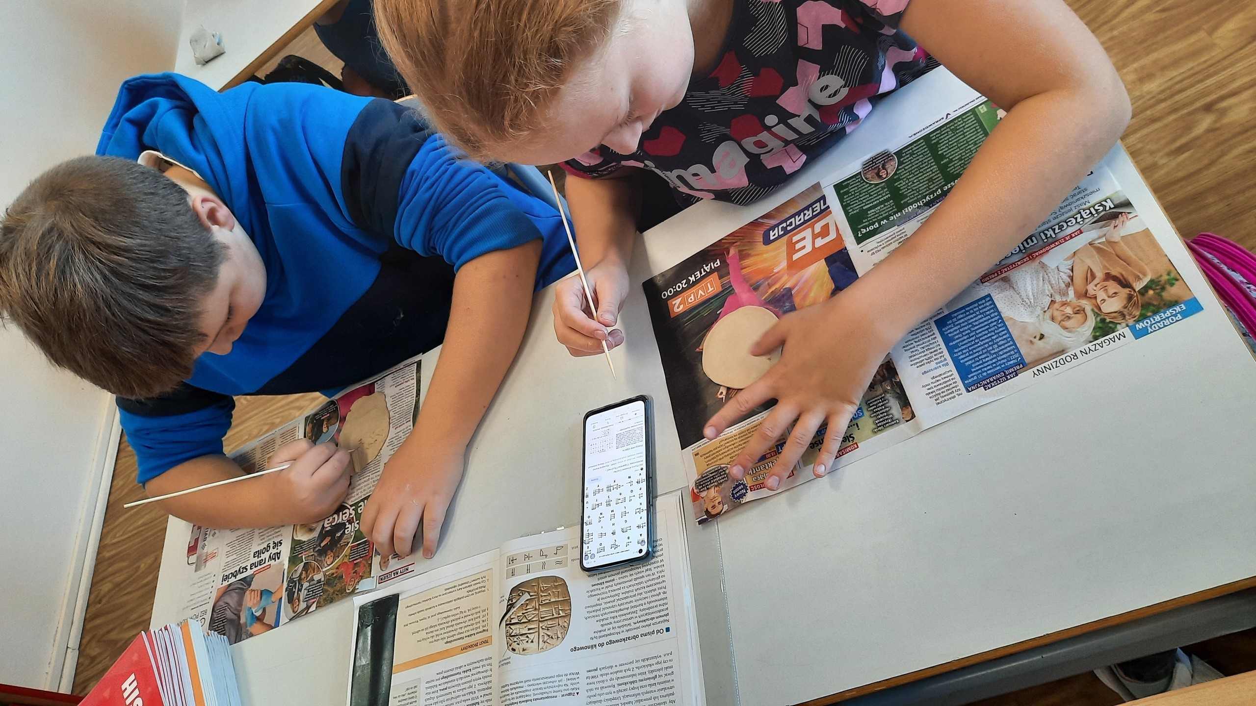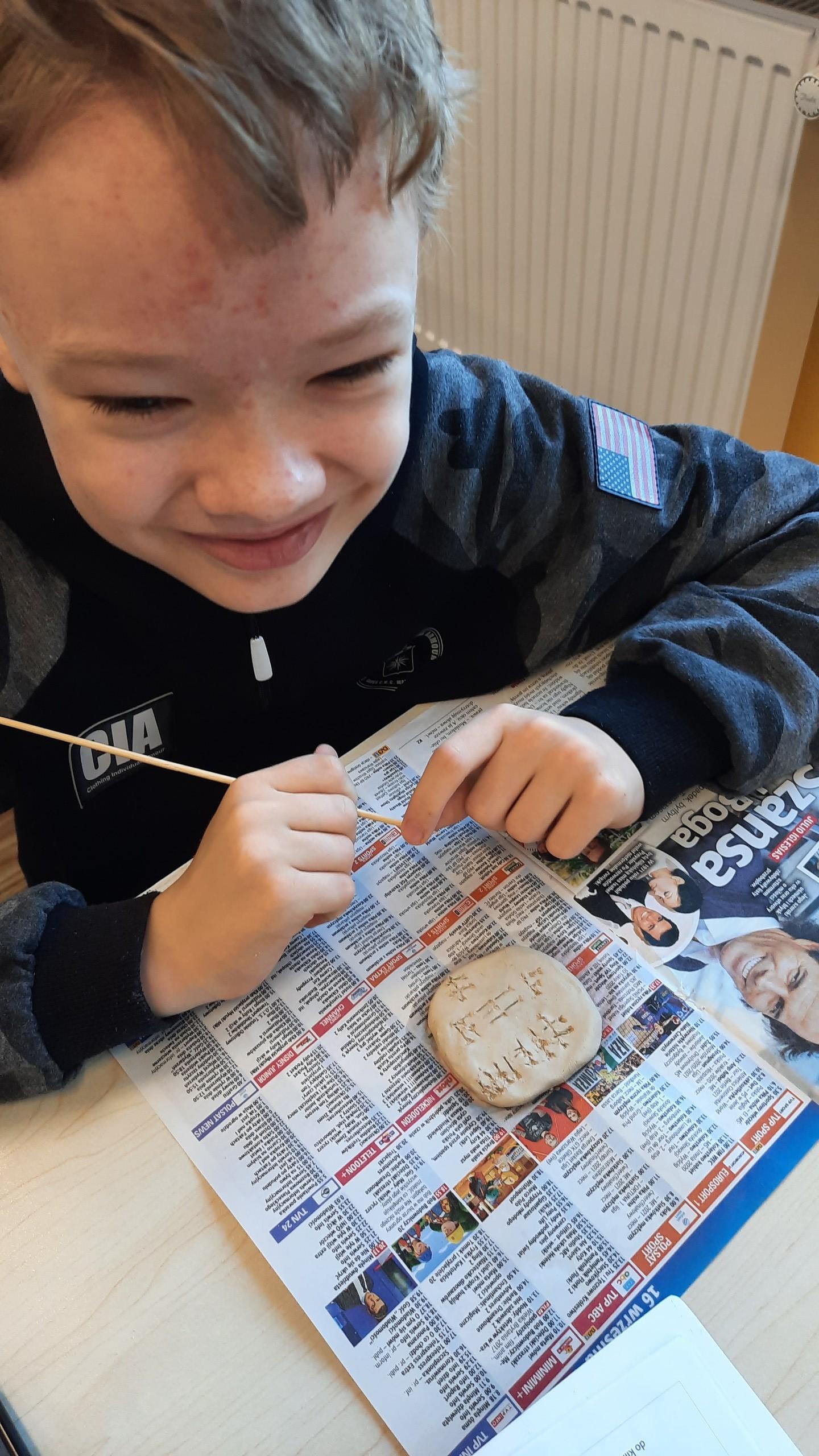 Uczniowie klasy V na lekcji historii przenieśli się w czasy starożytne i trenowali trudną sztukę pisma klinowego. Tysiące lat temu starożytni Sumerowie wynaleźli najstarsze pismo świata. Nasi piątoklasiści bardzo dobrze poradzili sobie z próbą odwzorowania tej trudnej sztuki. Wyciskanie znaków w glinie rzeźbiarskiej okazało się nie lada wyzwaniem, jednak efekty były bardzo pozytywne. Gratulujemy młodym historykom.