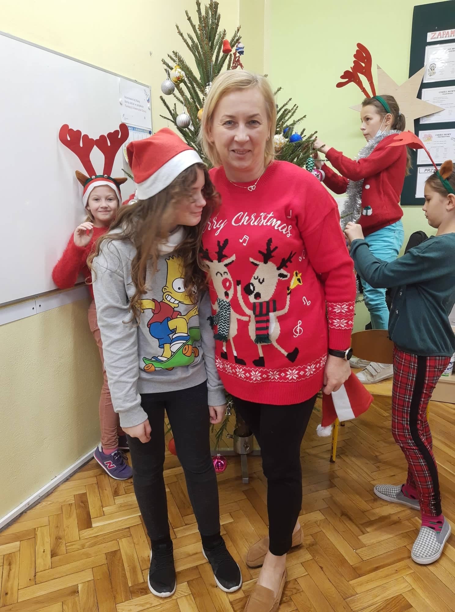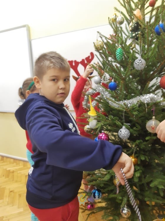 Czas przedświąteczny to okres oczekiwania na miłe chwile w rodzinnej atmosferze. Uczniowie klasy III nastrój przedświąteczny tworzyli w klasie. Ubrali czapki mikołajowe i świąteczne sweterki. Przystroili choinkę w kolorowe światełka, bombki choinkowe i piękne świecące łańcuchy. Po zakończonej pracy nastąpił najprzyjemniejszy moment – uczniowie otrzymali słodkie upominki od Mikołaja. Ten grudniowy dzień spędzili przyjemnie i radośnie.