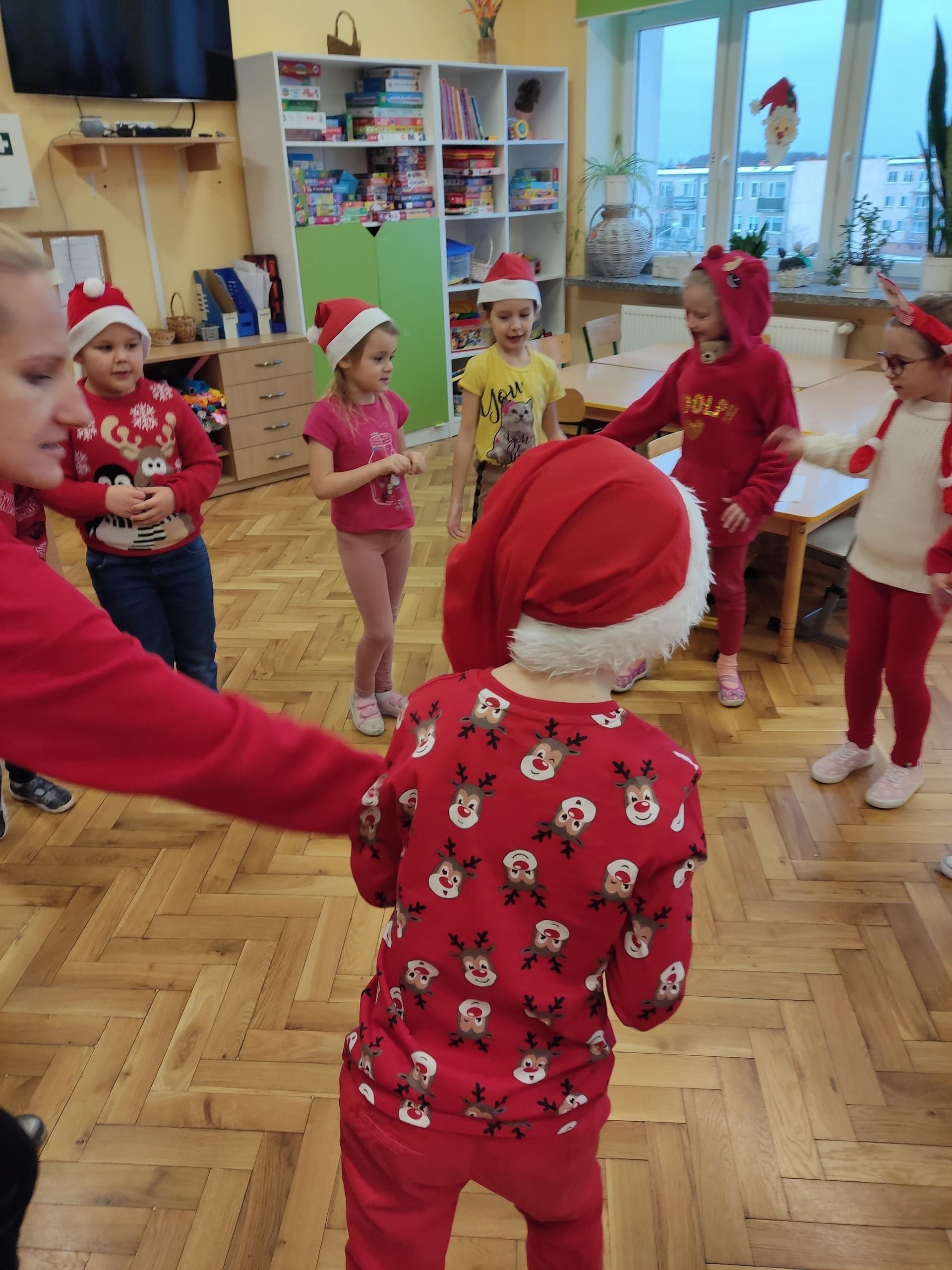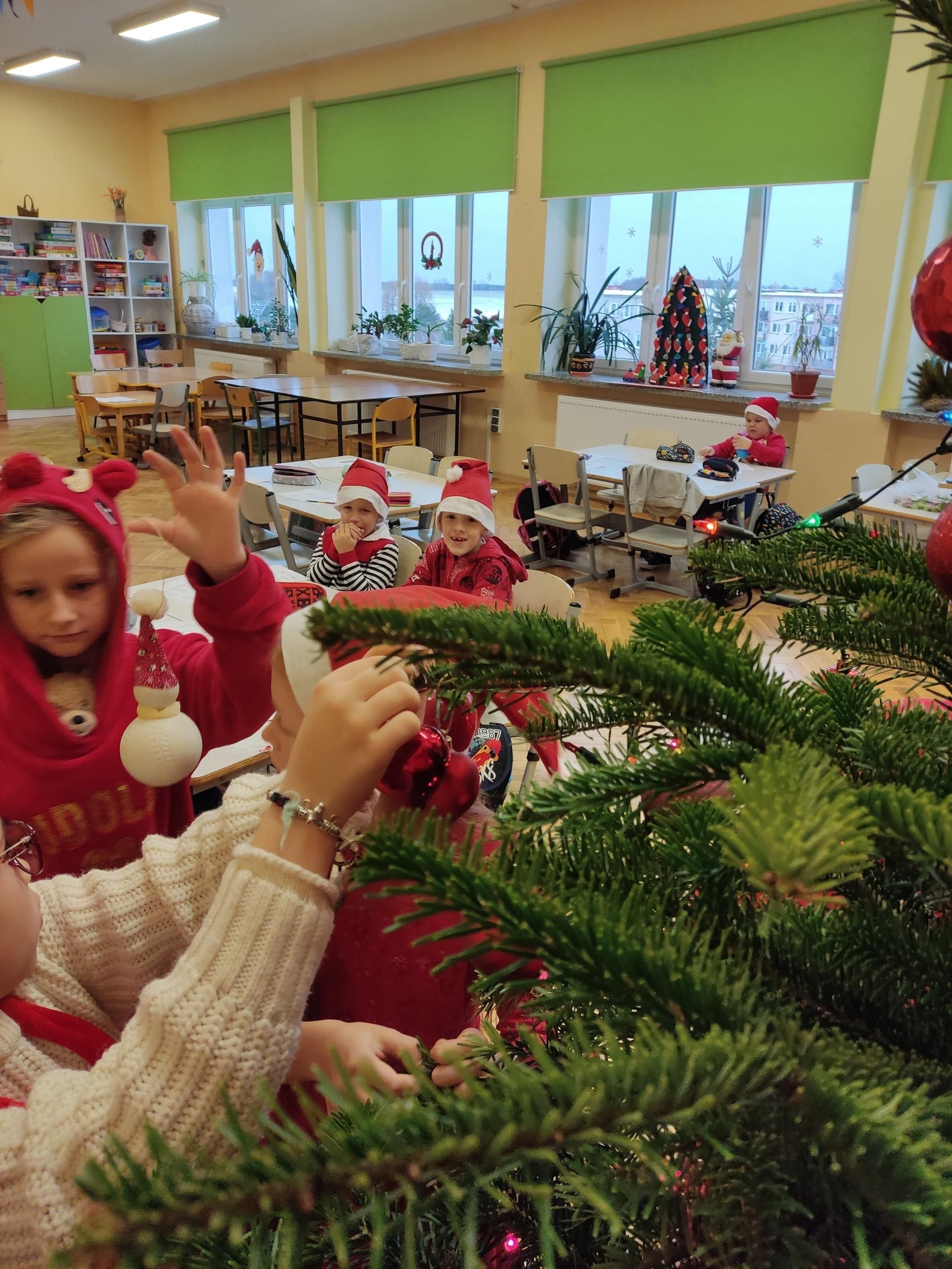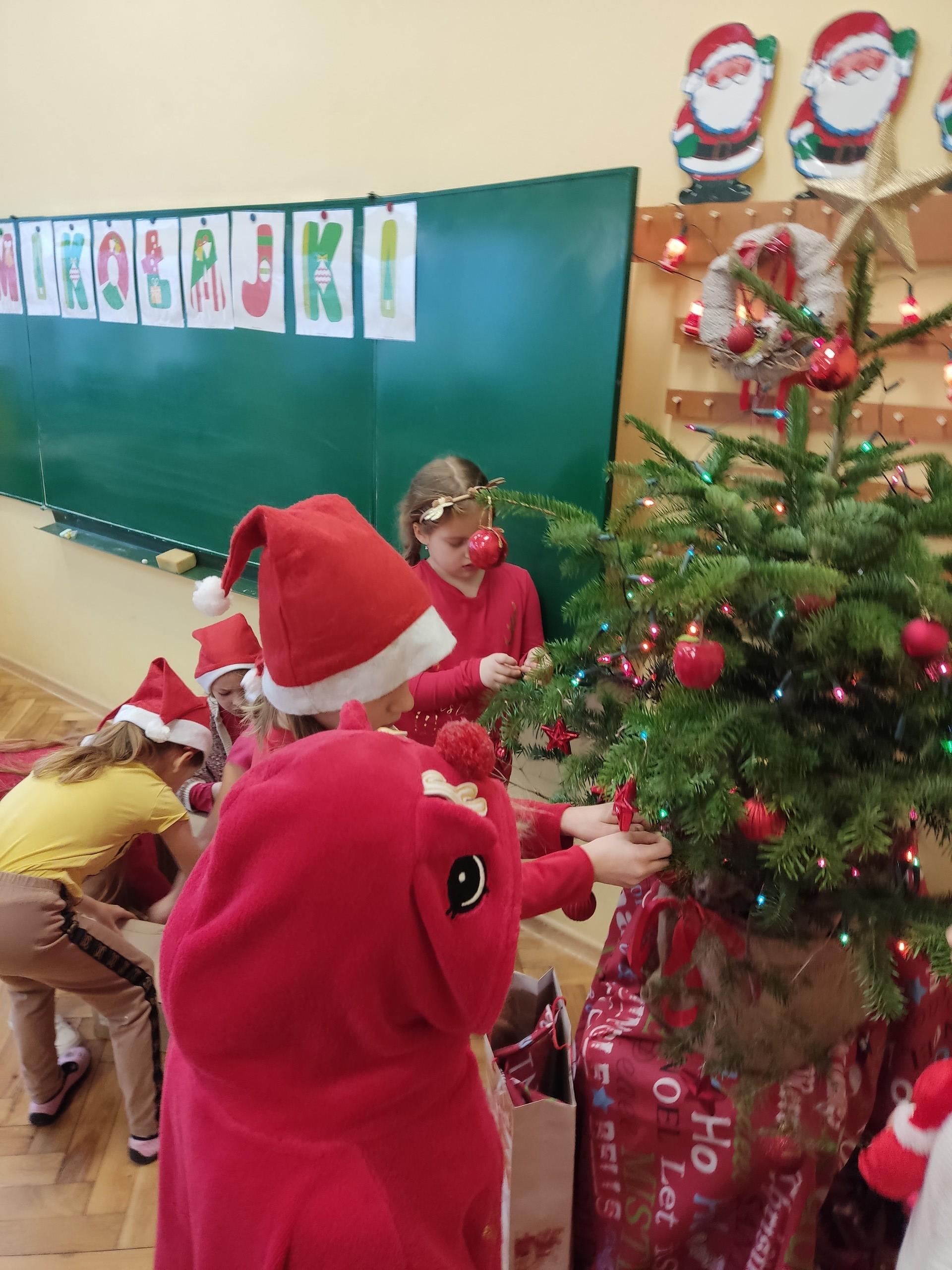 Mikołajki to dzień wyjątkowy, więc i nasze świętowanie było wyjątkowe. Tego dnia każdy kto mógł, ubrał świąteczny sweterek i założył mikołajową czapkę. Uczniowie wykonywali różne zadania związane ze św. Mikołajem. Układali puzzle, śpiewali piosenki, rozwiązywali zagadki oraz … ubierali choinkę. Klasa 1 wzięła udział w lekcji: „Lekcja na żywo - Prawdziwy Święty Mikołaj z Laponii”. Podczas lekcji dzieci dowiedziały się, gdzie mieszka Mikołaj, co lubi jeść, jak wygląda jego wioska, o co proszą dzieci św. Mikołaja, dlaczego 24 grudnia renifery potrafią latać. Na koniec lekcji wirtualny Mikołaj przekazał dzieciom życzenia mikołajkowe. Uczniowie otrzymali słodką niespodziankę.