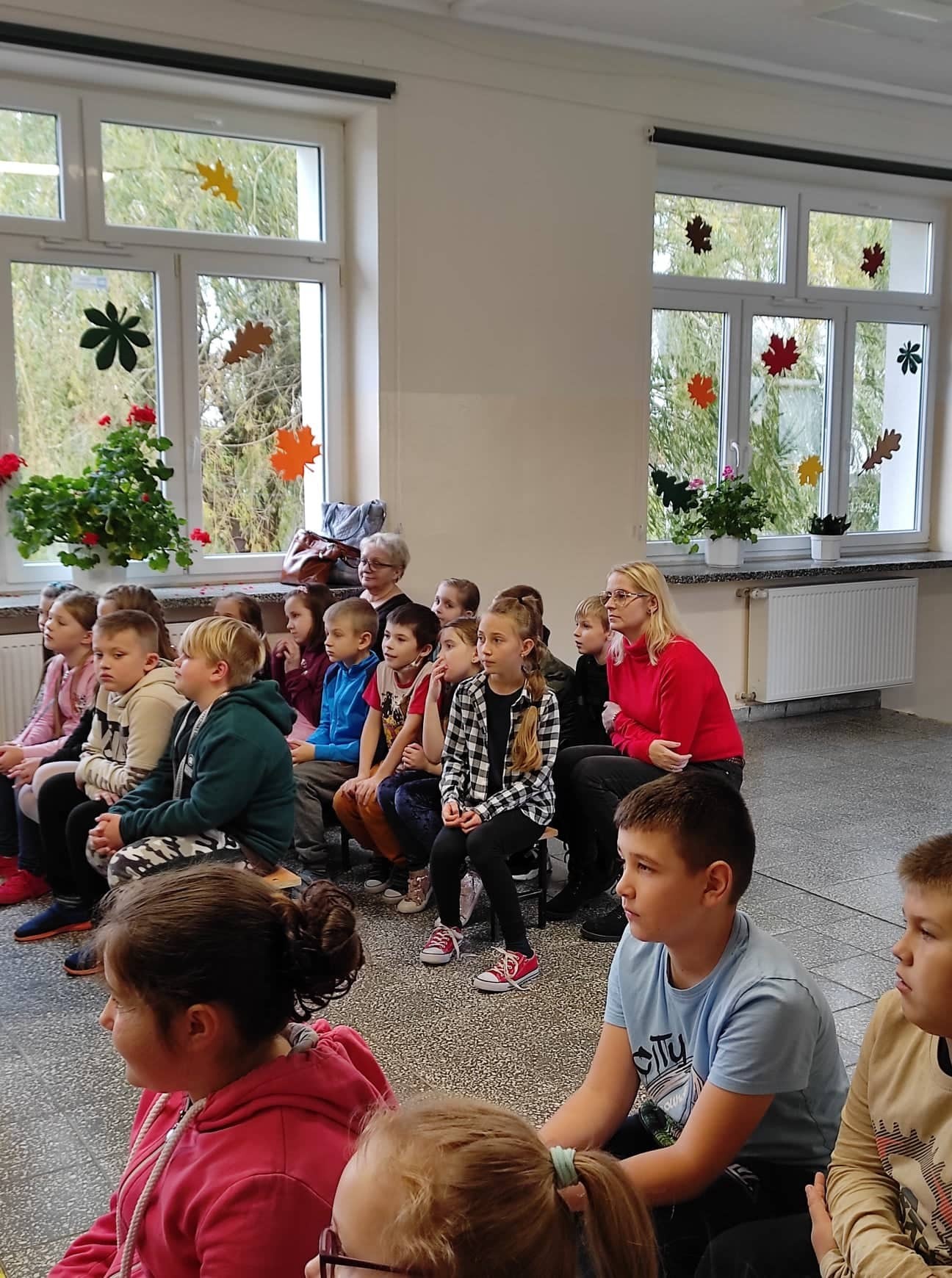 28.10.2021r. uczniowie klas I – III wzięli udział w spotkaniu z policjantami Komendy Powiatowej Policji w Lęborku na temat „Bezpieczeństwo dzieci na drogach”. Uważnie słuchali i udzielali prawidłowych odpowiedzi na pytania dotyczące bezpiecznego przechodzenia przez ulicę oraz sygnalizacji świetlnej. Panowie policjanci uczulili także uczniów, aby zawsze pamiętali o zapinaniu pasów podczas podróży samochodem. Ponadto podkreślili, jak ważną rolę pełnią elementy odblaskowe, które każdy uczeń powinien nosić zwłaszcza w okresie jesienno- zimowym. Dzieci wykazały się dużą wiedzą z zakresu bezpieczeństwa w ruchu drogowym.