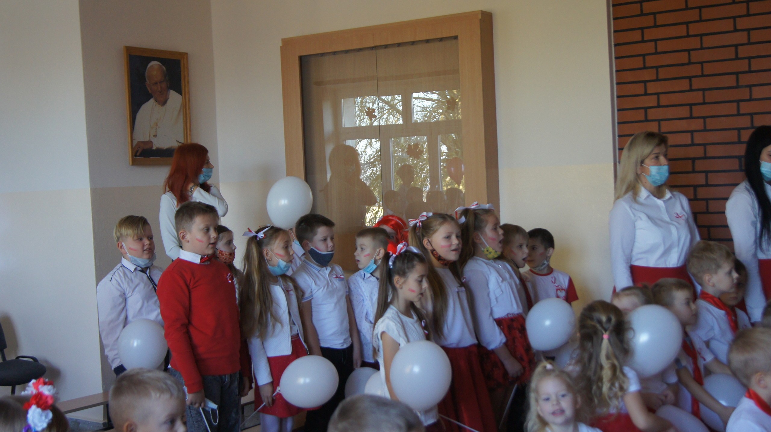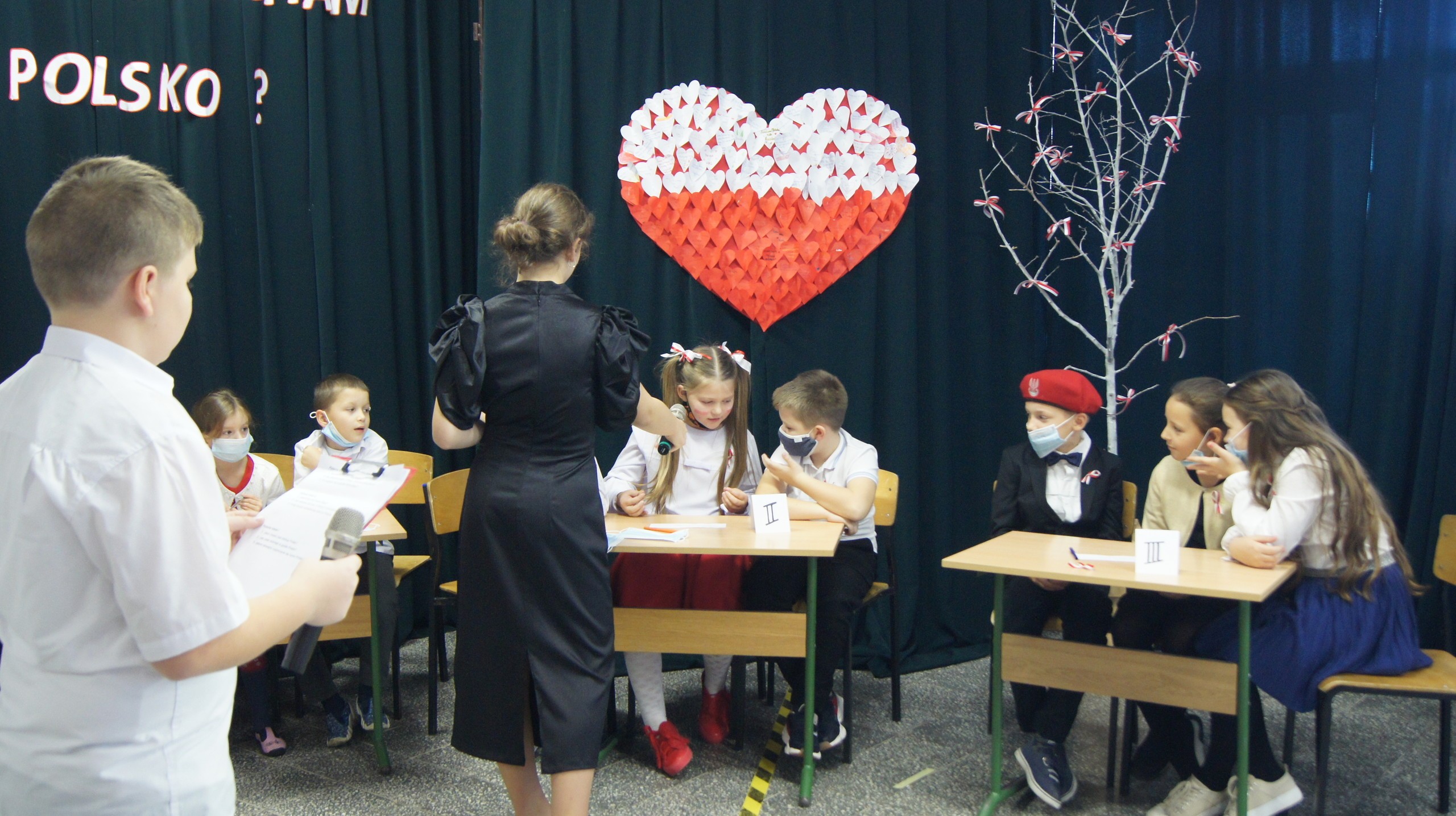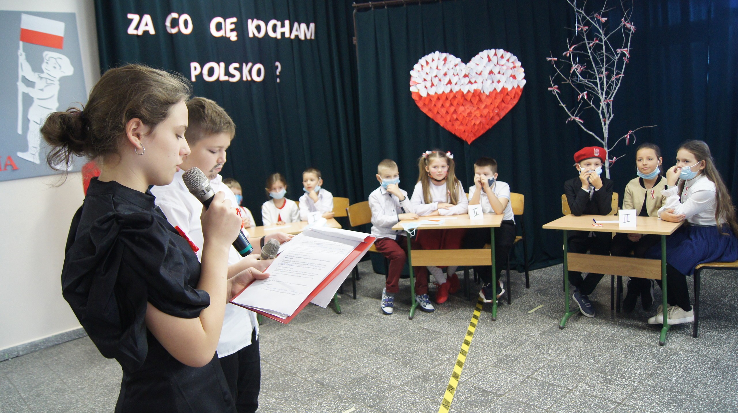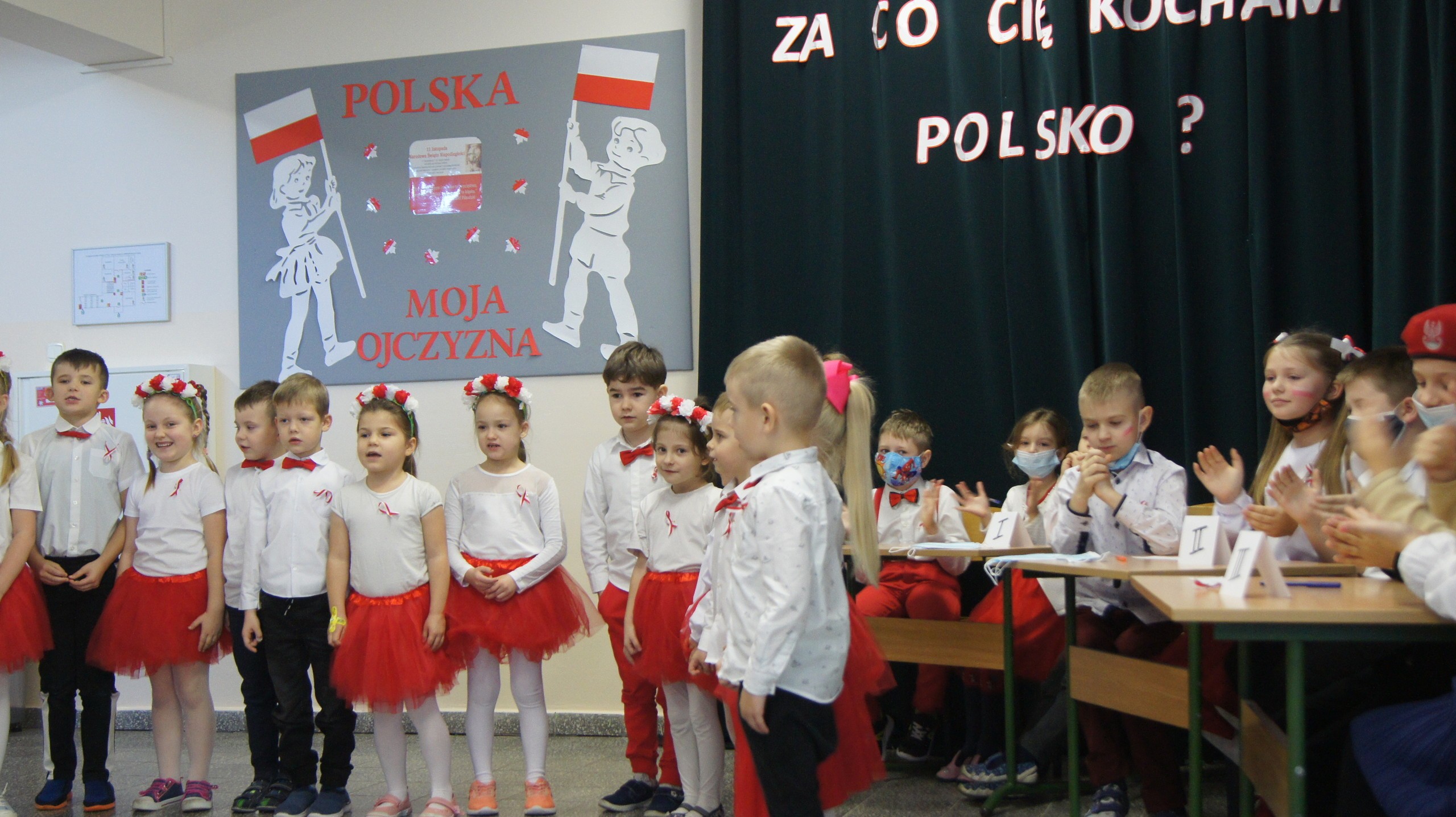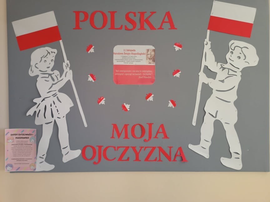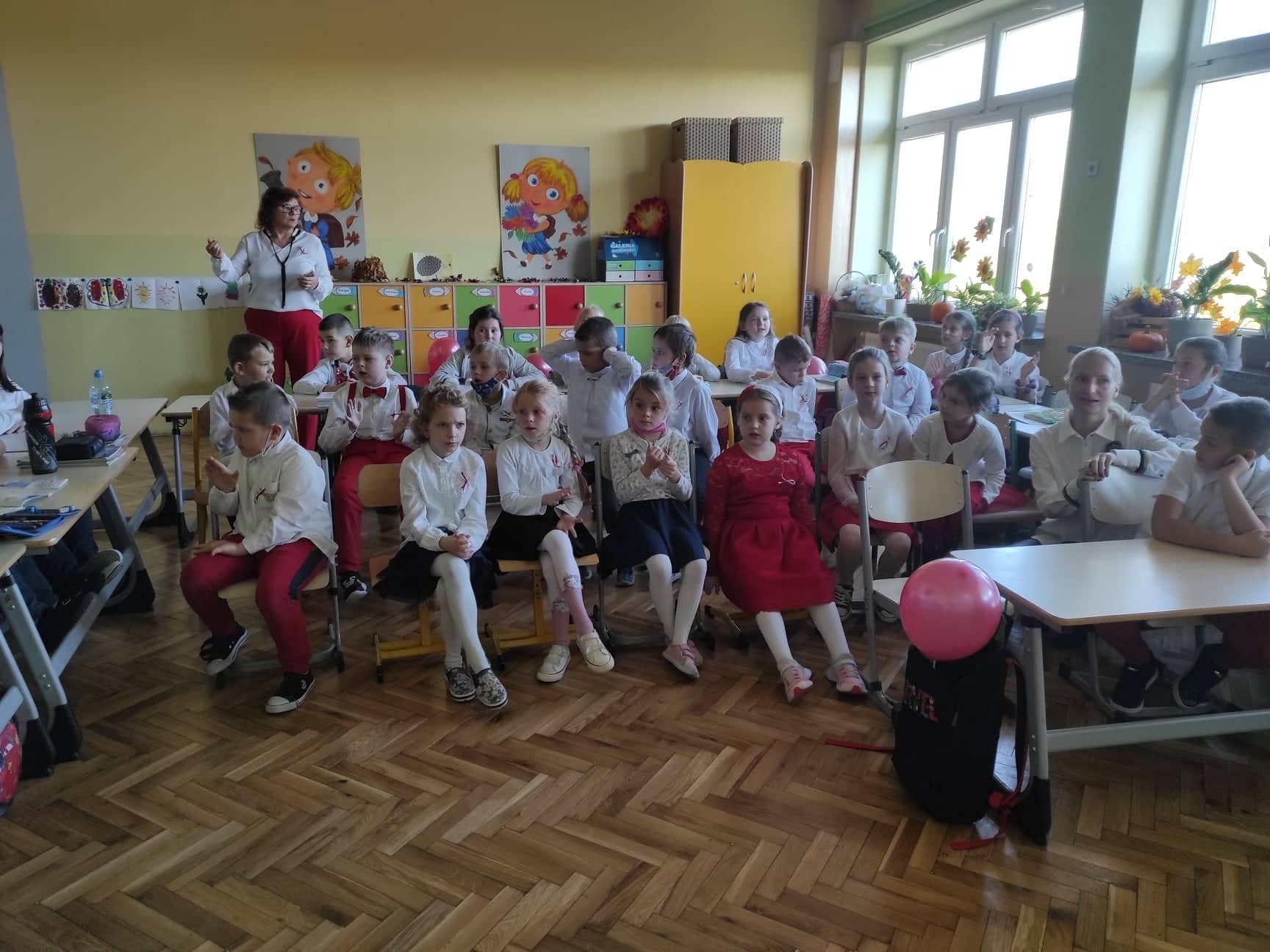 W dniu dzisiejszym społeczność Zespołu Szkół w Łebieniu obchodziła Święto Niepodległości- tym razem- w wesołej formie. Przedszkolaczki, uczniowie i nauczyciele tego dnia czcili święto ubrani w barwy narodowe. Okna naszej szkoły również stały się biało- czerwone. Uroczystość miała formę turnieju- "Za co kocham Cię Polsko?" Już kilka dni wcześniej nasi uczniowie na zajęciach zastanawiali się, za co kochają nasz kraj. Ich odpowiedzi stały się elementem dekoracji. Uroczystość odbyła się w dwóch częściach- oddzielnie dla maluszków i dla starszych uczniów. Zosia i Błażej w roli naszych polskich noblistów- Marii Skłodowskiej- Curie i Henryka Sienkiewicza poprowadzili rozgrywki turniejowe. Każda klasa przygotowała strój patriotyczny, który zaprezentowali wybrani przedstawiciele. Kolejnym zadaniem było udzielenie odpowiedzi na pytania związane z naszym krajem. Zaskoczeniem okazało się zadanie z mapą Polski. Nie zabrakło również pieśni patriotycznych w wykonaniu uczennic klasy VI. Uroku obchodom dodały piosenki i tańce przygotowane przez naszych najmłodszych- przedszkolaczków. Pan dyrektor podzielił się z uczniami wiadomością, którą otrzymał uczeń klasy III- Ksawery Kwidzyński-od uczestniczki Powstania Warszawskiego. Kartka dla Ksawerego jest odpowiedzią na akcję BohaterON, w której nasza szkoła bierze udział od kilku lat.