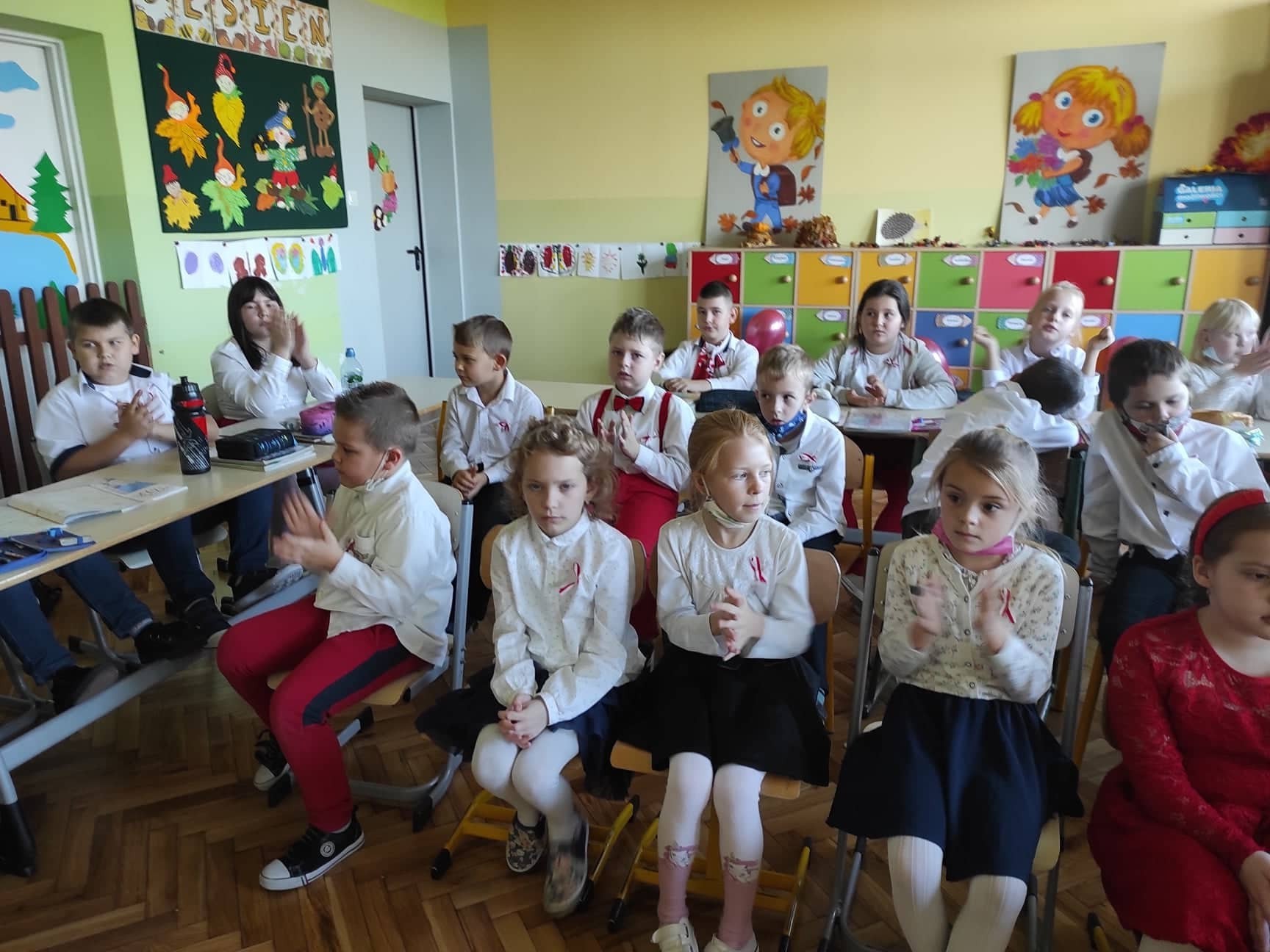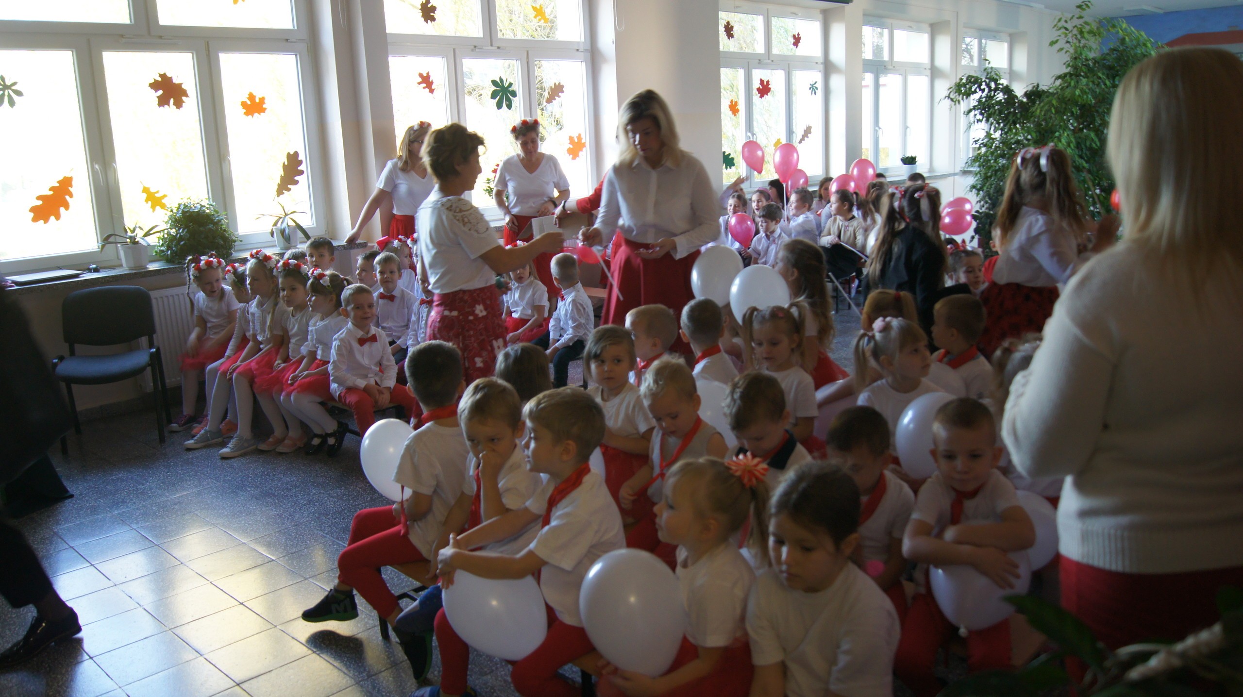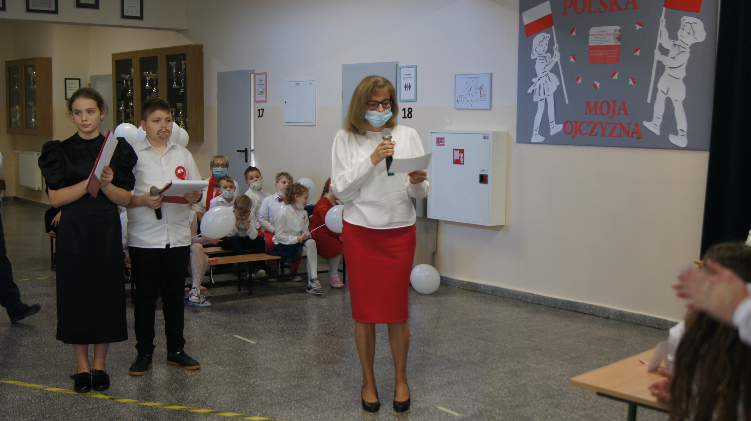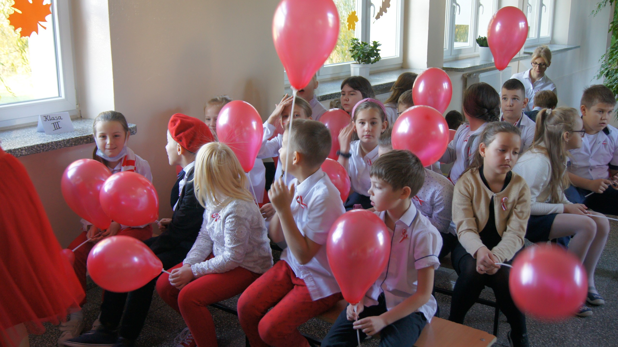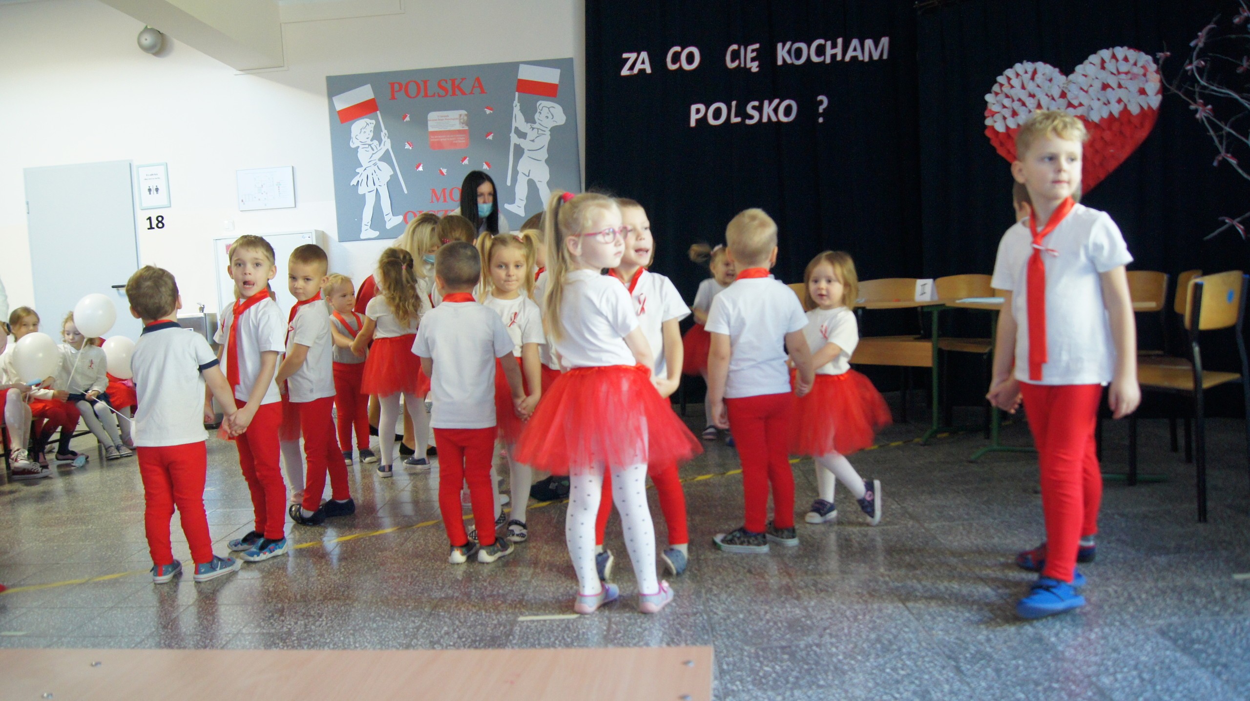 W dniu dzisiejszym społeczność Zespołu Szkół w Łebieniu obchodziła Święto Niepodległości- tym razem- w wesołej formie. Przedszkolaczki, uczniowie i nauczyciele tego dnia czcili święto ubrani w barwy narodowe. Okna naszej szkoły również stały się biało- czerwone. Uroczystość miała formę turnieju- "Za co kocham Cię Polsko?" Już kilka dni wcześniej nasi uczniowie na zajęciach zastanawiali się, za co kochają nasz kraj. Ich odpowiedzi stały się elementem dekoracji. Uroczystość odbyła się w dwóch częściach- oddzielnie dla maluszków i dla starszych uczniów. Zosia i Błażej w roli naszych polskich noblistów- Marii Skłodowskiej- Curie i Henryka Sienkiewicza poprowadzili rozgrywki turniejowe. Każda klasa przygotowała strój patriotyczny, który zaprezentowali wybrani przedstawiciele. Kolejnym zadaniem było udzielenie odpowiedzi na pytania związane z naszym krajem. Zaskoczeniem okazało się zadanie z mapą Polski. Nie zabrakło również pieśni patriotycznych w wykonaniu uczennic klasy VI. Uroku obchodom dodały piosenki i tańce przygotowane przez naszych najmłodszych- przedszkolaczków. Pan dyrektor podzielił się z uczniami wiadomością, którą otrzymał uczeń klasy III- Ksawery Kwidzyński-od uczestniczki Powstania Warszawskiego. Kartka dla Ksawerego jest odpowiedzią na akcję BohaterON, w której nasza szkoła bierze udział od kilku lat.