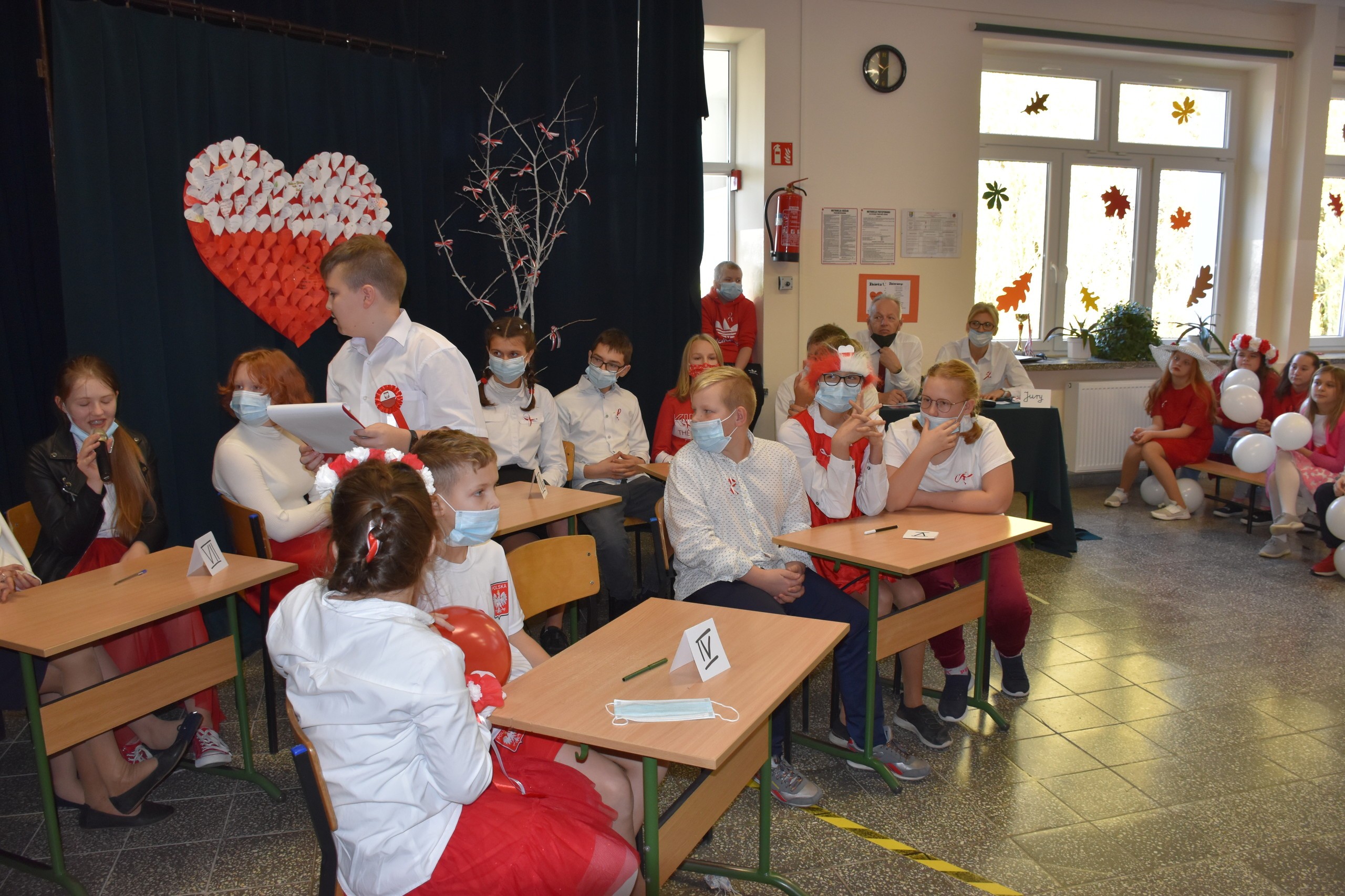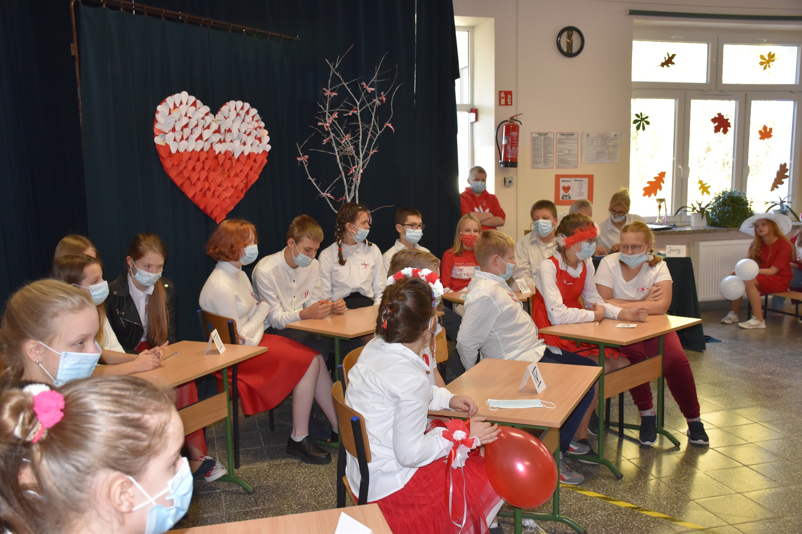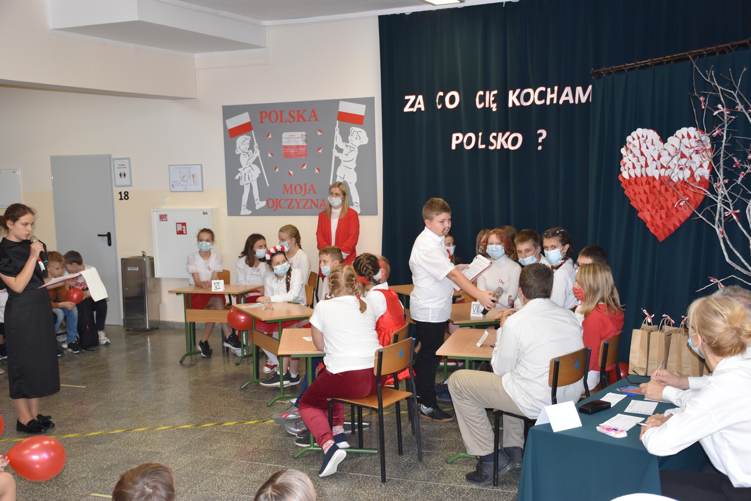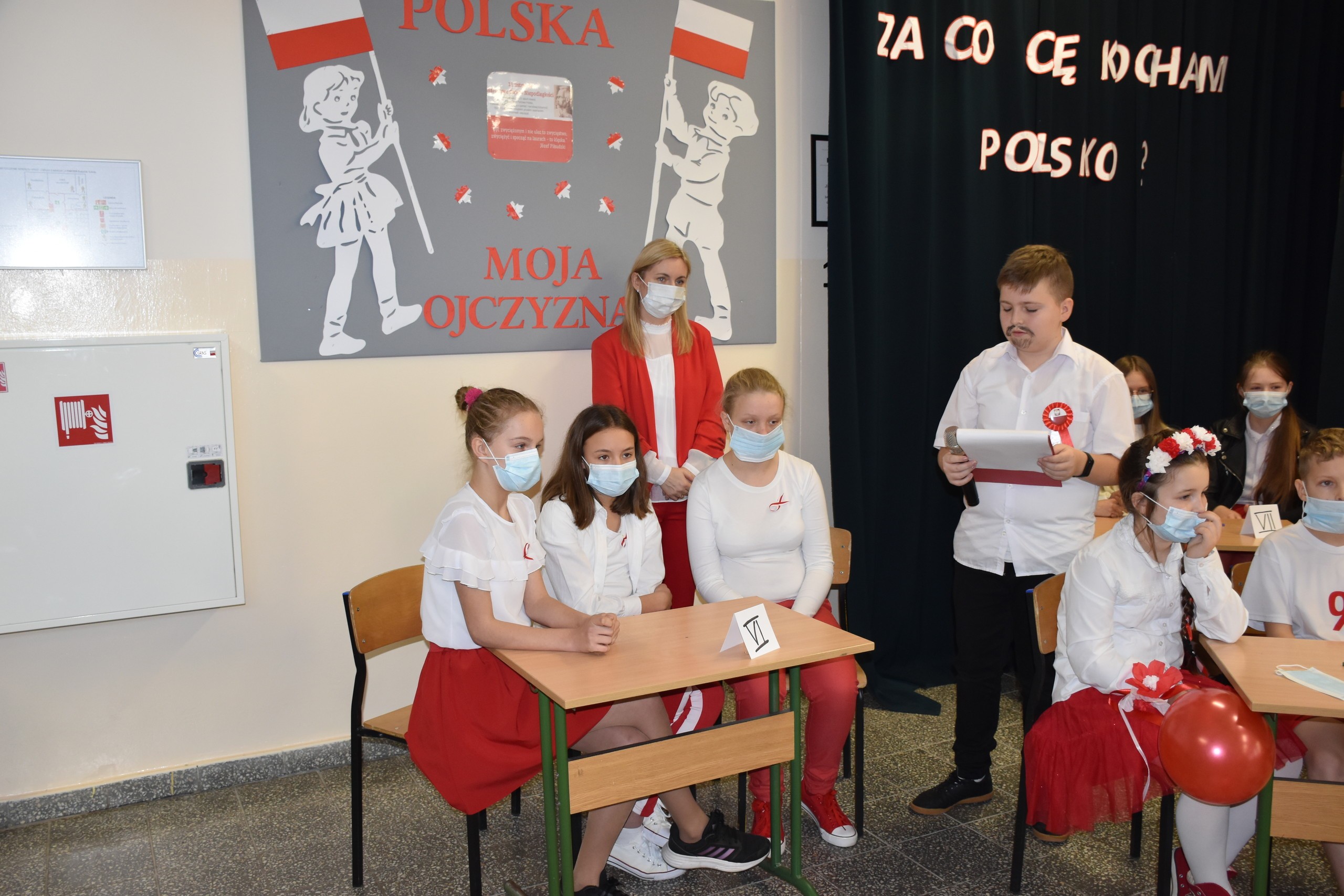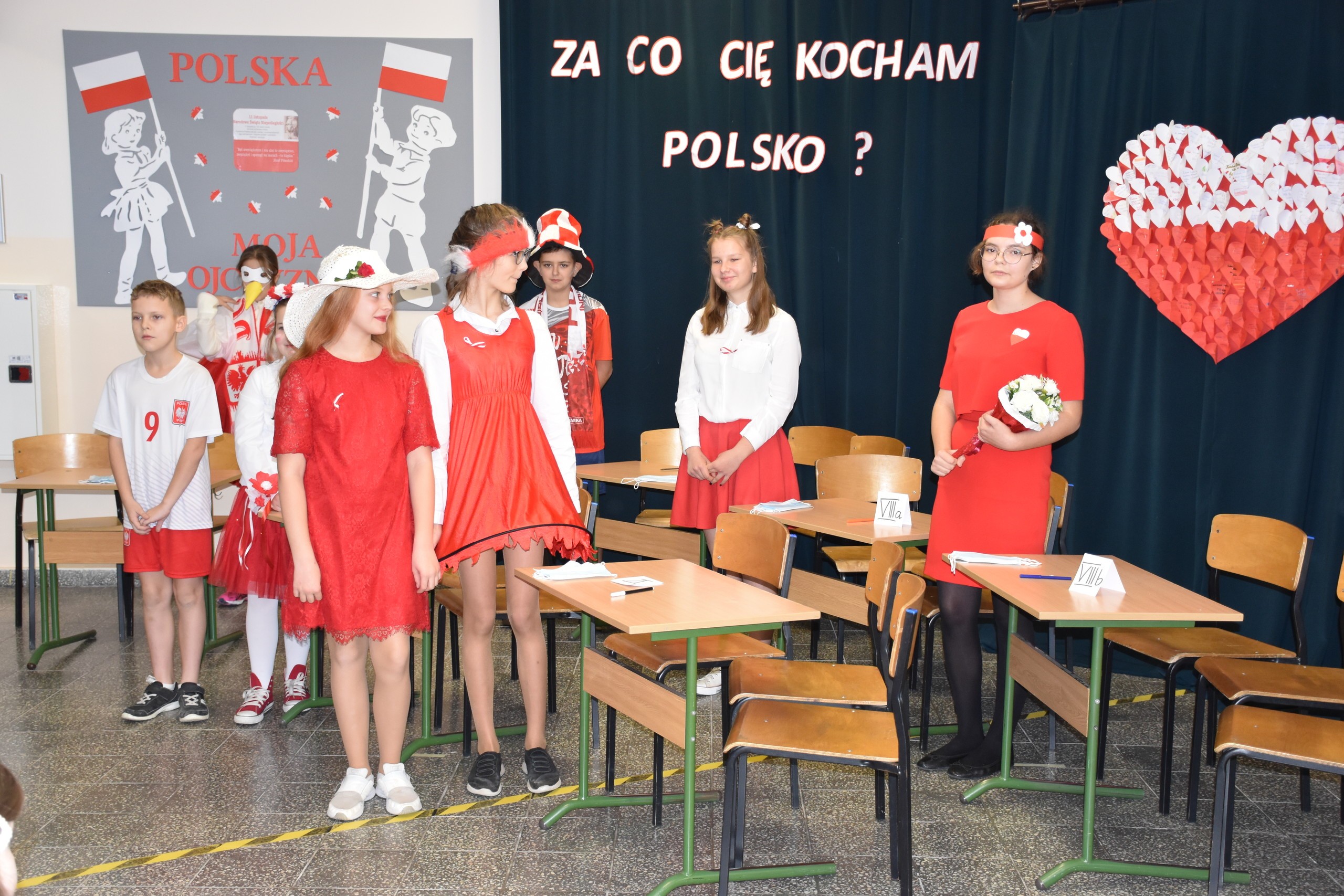 W dniu dzisiejszym społeczność Zespołu Szkół w Łebieniu obchodziła Święto Niepodległości- tym razem- w wesołej formie. Przedszkolaczki, uczniowie i nauczyciele tego dnia czcili święto ubrani w barwy narodowe. Okna naszej szkoły również stały się biało- czerwone. Uroczystość miała formę turnieju- "Za co kocham Cię Polsko?" Już kilka dni wcześniej nasi uczniowie na zajęciach zastanawiali się, za co kochają nasz kraj. Ich odpowiedzi stały się elementem dekoracji. Uroczystość odbyła się w dwóch częściach- oddzielnie dla maluszków i dla starszych uczniów. Zosia i Błażej w roli naszych polskich noblistów- Marii Skłodowskiej- Curie i Henryka Sienkiewicza poprowadzili rozgrywki turniejowe. Każda klasa przygotowała strój patriotyczny, który zaprezentowali wybrani przedstawiciele. Kolejnym zadaniem było udzielenie odpowiedzi na pytania związane z naszym krajem. Zaskoczeniem okazało się zadanie z mapą Polski. Nie zabrakło również pieśni patriotycznych w wykonaniu uczennic klasy VI. Uroku obchodom dodały piosenki i tańce przygotowane przez naszych najmłodszych- przedszkolaczków. Pan dyrektor podzielił się z uczniami wiadomością, którą otrzymał uczeń klasy III- Ksawery Kwidzyński-od uczestniczki Powstania Warszawskiego. Kartka dla Ksawerego jest odpowiedzią na akcję BohaterON, w której nasza szkoła bierze udział od kilku lat.
