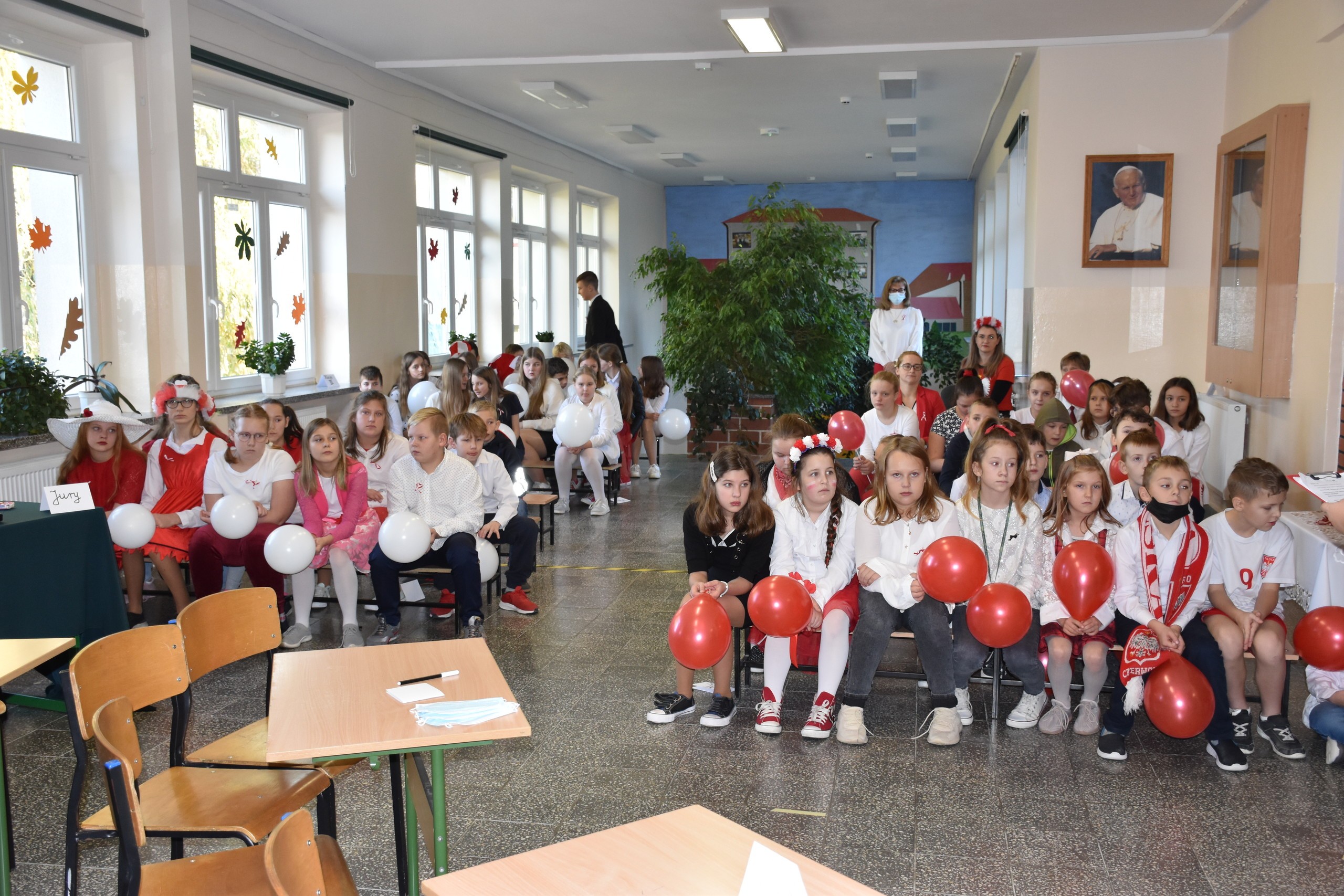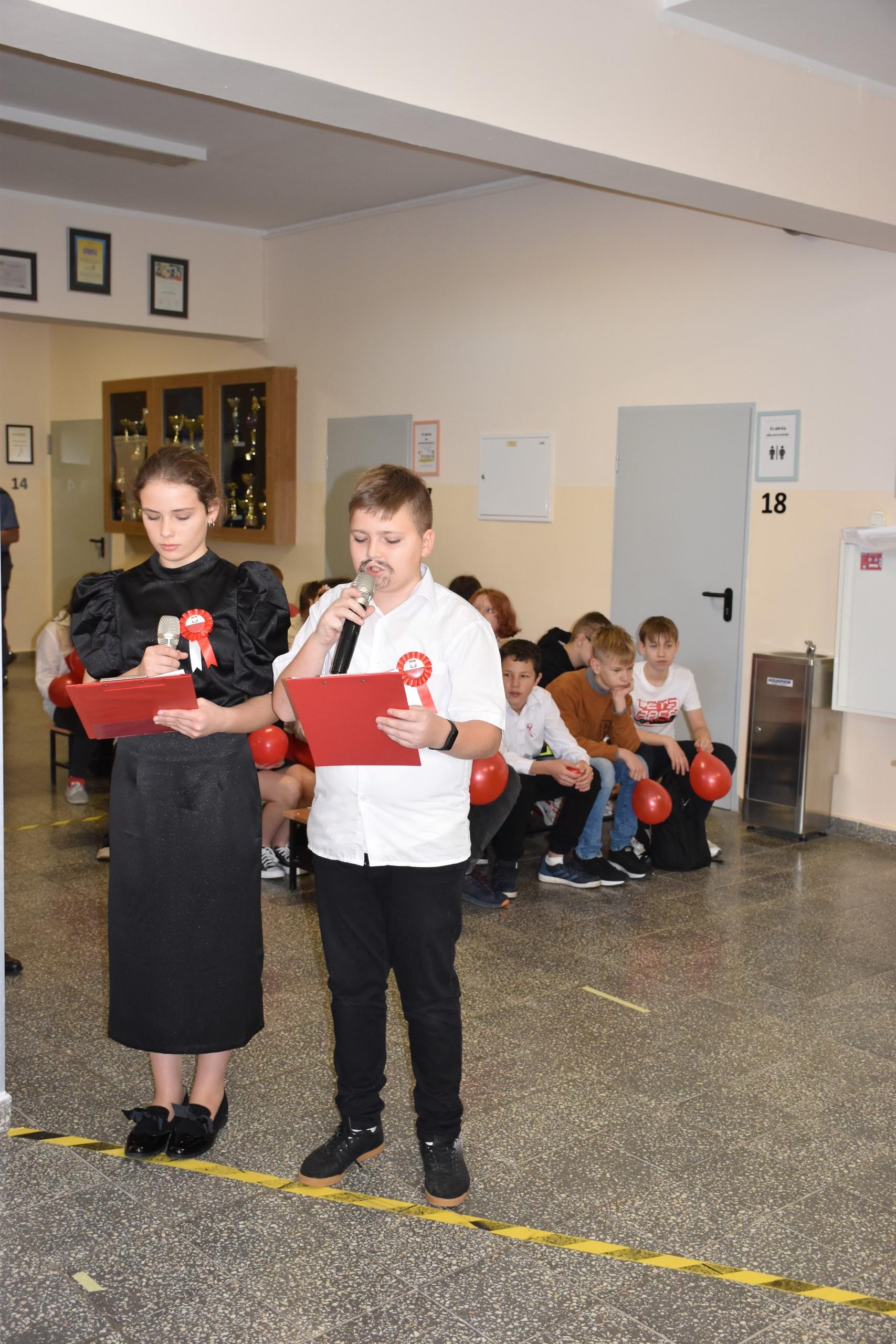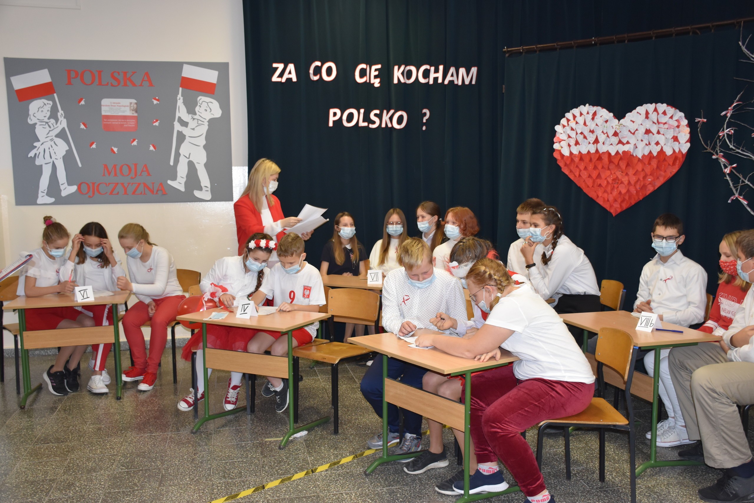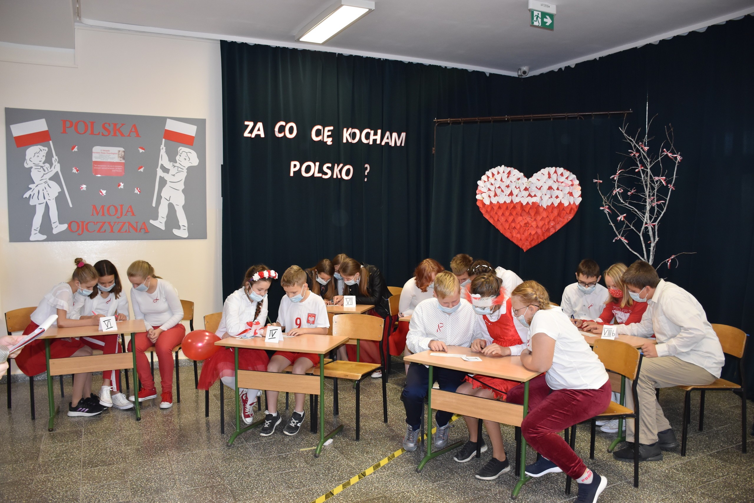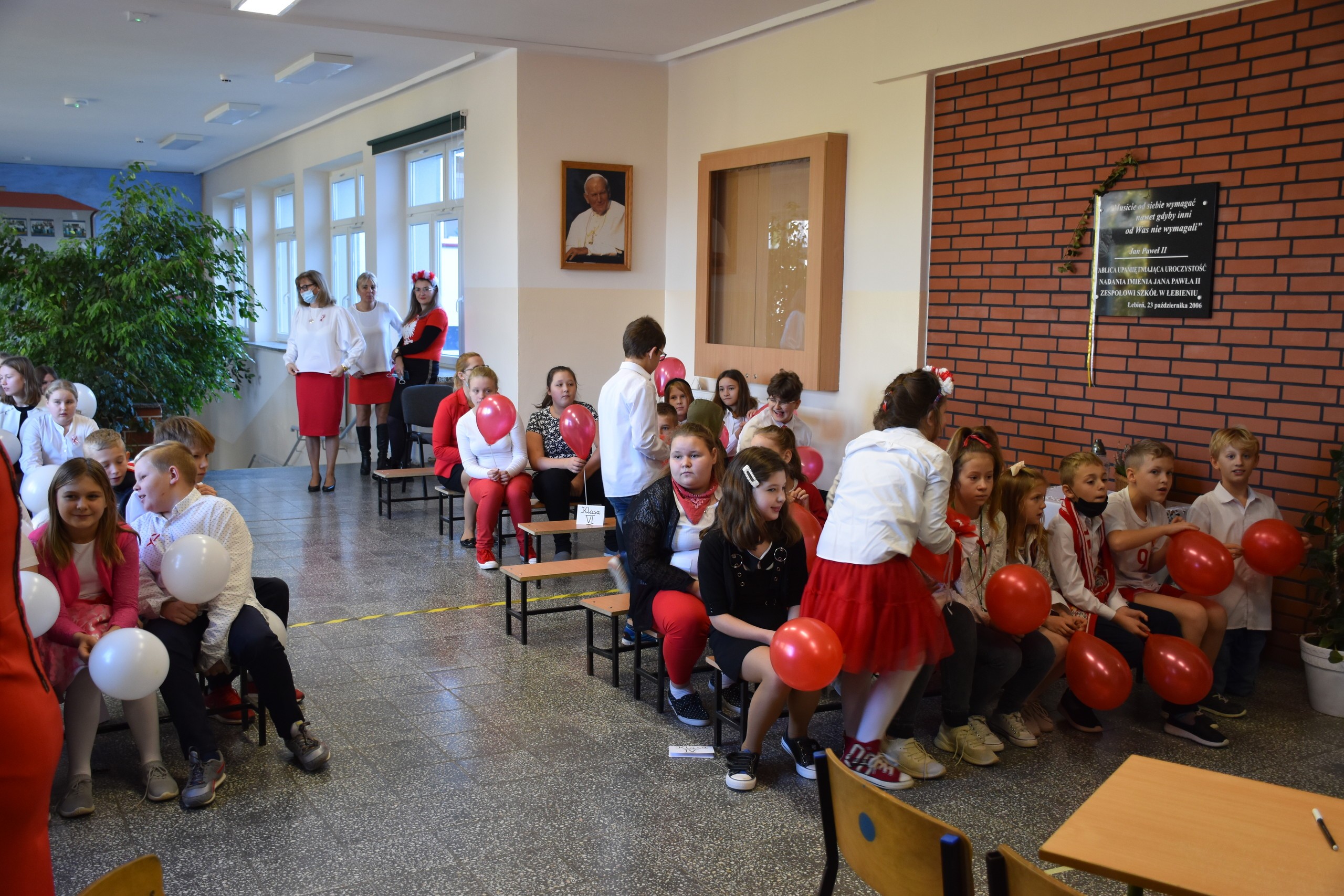 W dniu dzisiejszym społeczność Zespołu Szkół w Łebieniu obchodziła Święto Niepodległości- tym razem- w wesołej formie. Przedszkolaczki, uczniowie i nauczyciele tego dnia czcili święto ubrani w barwy narodowe. Okna naszej szkoły również stały się biało- czerwone. Uroczystość miała formę turnieju- "Za co kocham Cię Polsko?" Już kilka dni wcześniej nasi uczniowie na zajęciach zastanawiali się, za co kochają nasz kraj. Ich odpowiedzi stały się elementem dekoracji. Uroczystość odbyła się w dwóch częściach- oddzielnie dla maluszków i dla starszych uczniów. Zosia i Błażej w roli naszych polskich noblistów- Marii Skłodowskiej- Curie i Henryka Sienkiewicza poprowadzili rozgrywki turniejowe. Każda klasa przygotowała strój patriotyczny, który zaprezentowali wybrani przedstawiciele. Kolejnym zadaniem było udzielenie odpowiedzi na pytania związane z naszym krajem. Zaskoczeniem okazało się zadanie z mapą Polski. Nie zabrakło również pieśni patriotycznych w wykonaniu uczennic klasy VI. Uroku obchodom dodały piosenki i tańce przygotowane przez naszych najmłodszych- przedszkolaczków. Pan dyrektor podzielił się z uczniami wiadomością, którą otrzymał uczeń klasy III- Ksawery Kwidzyński-od uczestniczki Powstania Warszawskiego. Kartka dla Ksawerego jest odpowiedzią na akcję BohaterON, w której nasza szkoła bierze udział od kilku lat.
