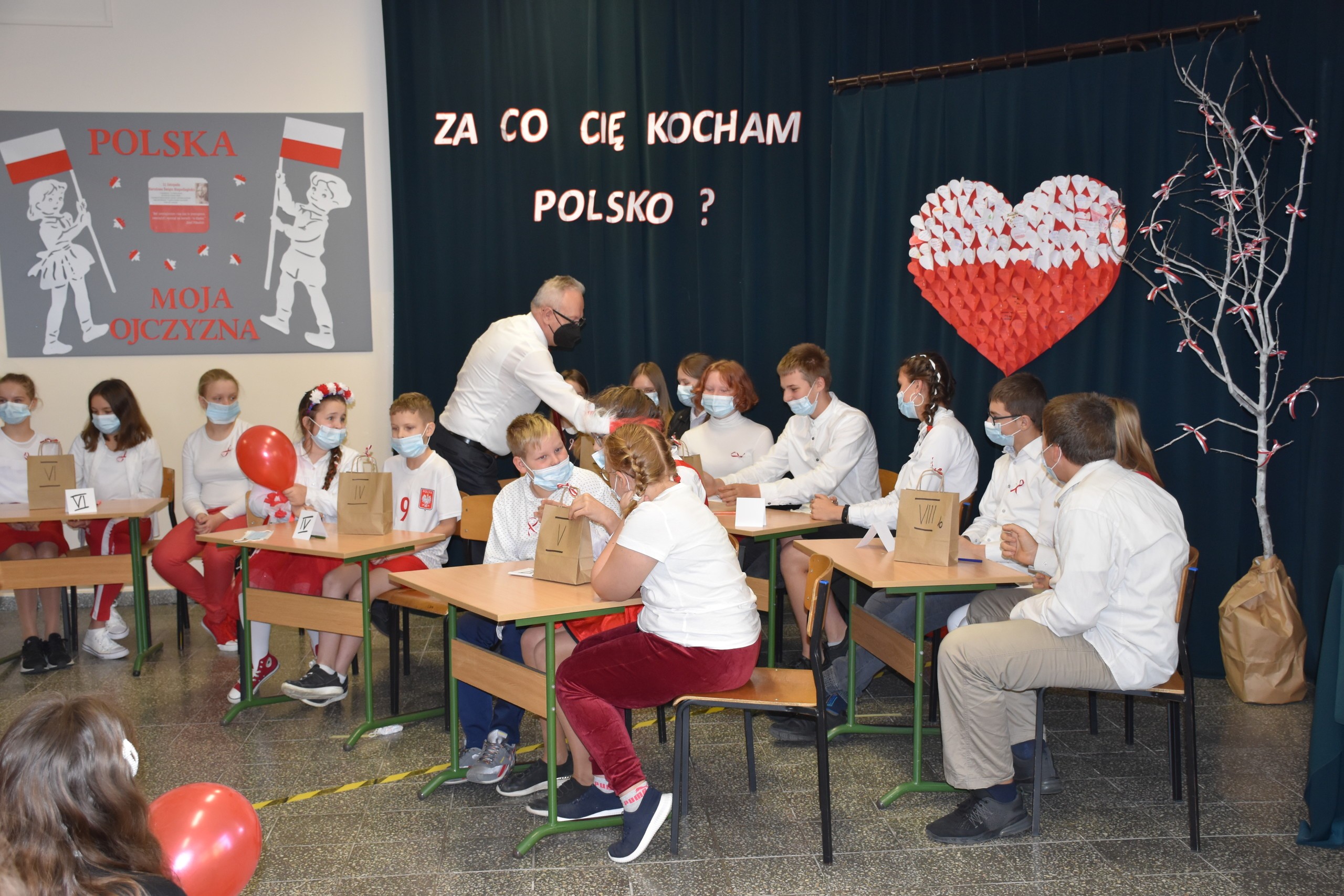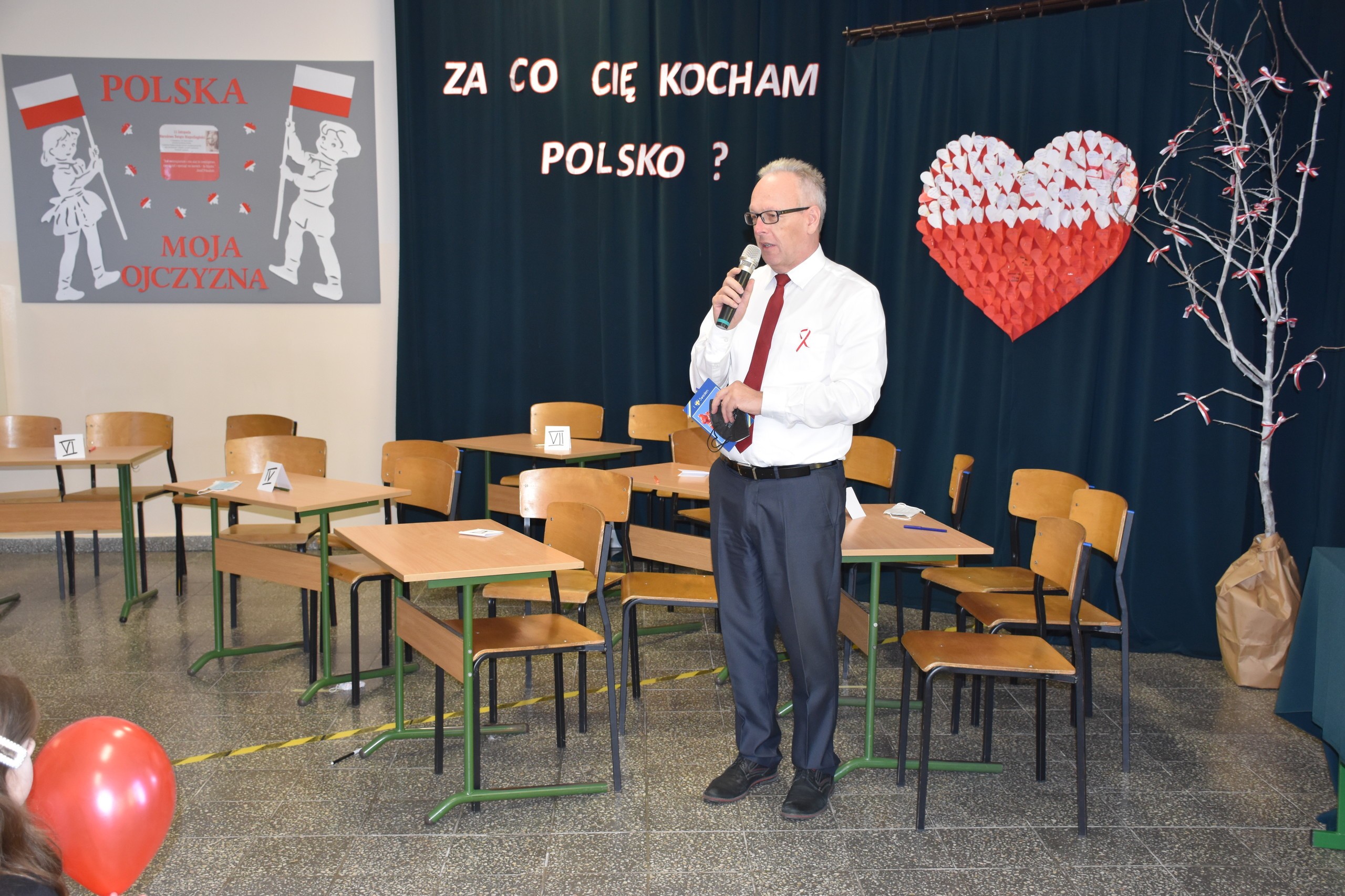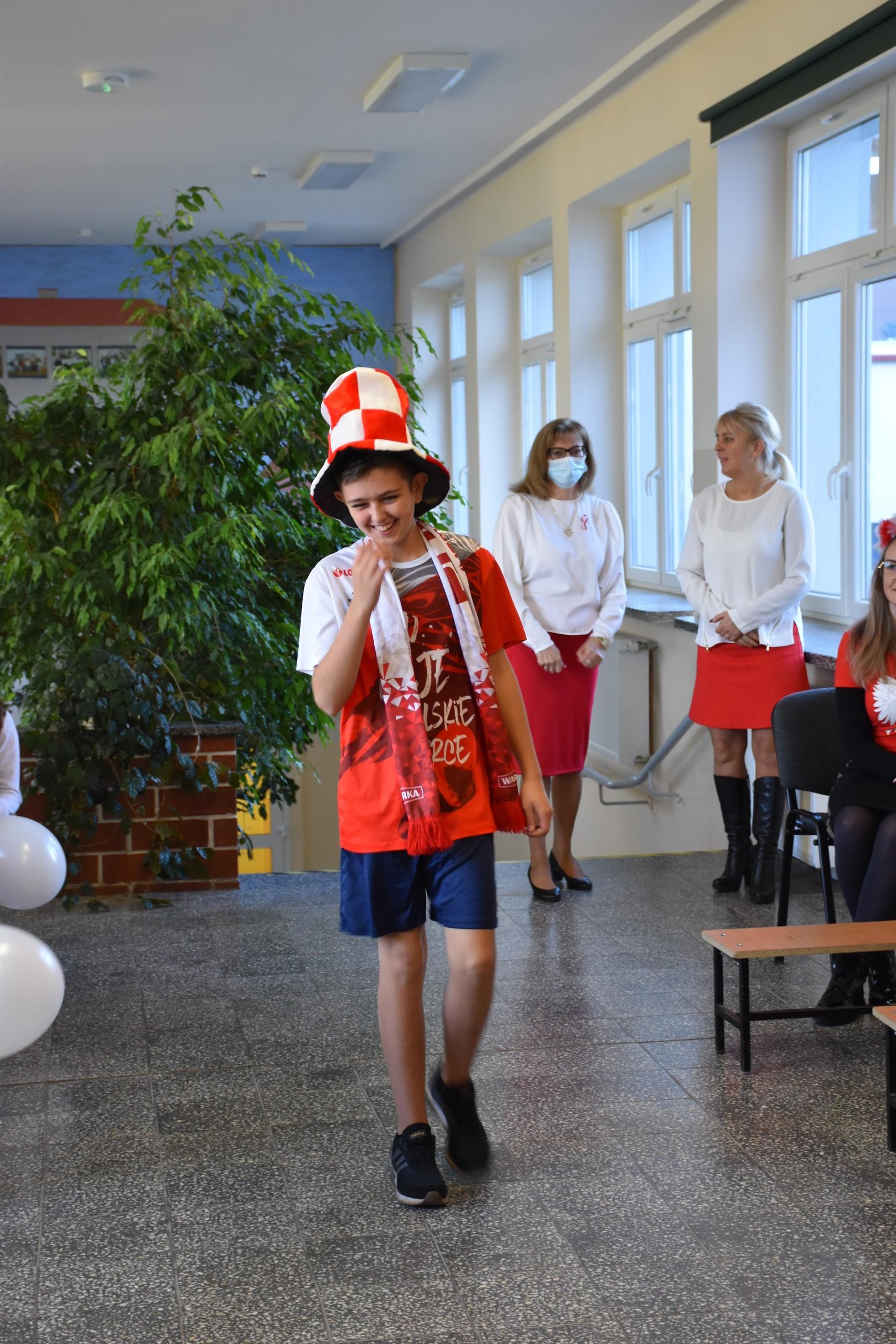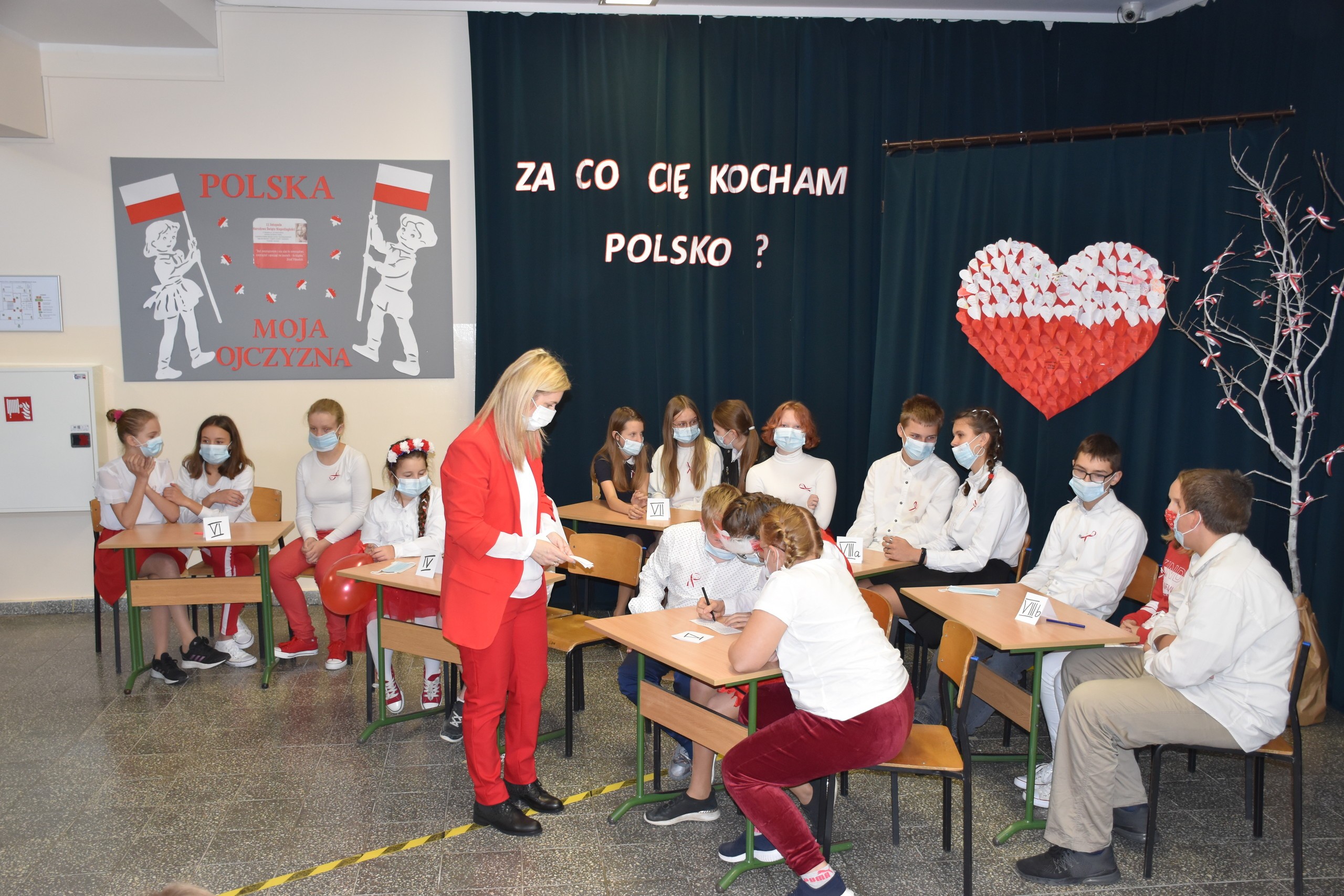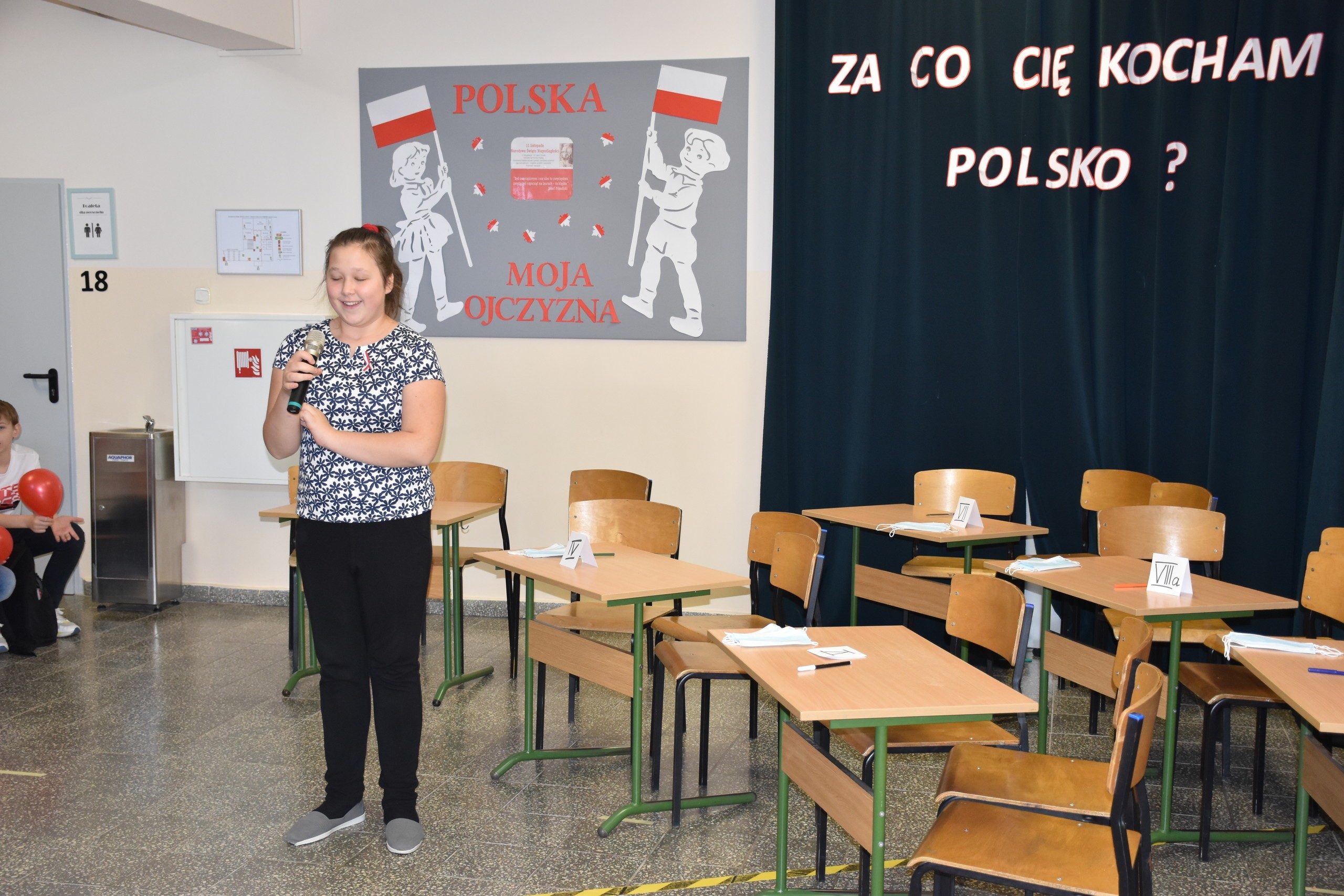 W dniu dzisiejszym społeczność Zespołu Szkół w Łebieniu obchodziła Święto Niepodległości- tym razem- w wesołej formie. Przedszkolaczki, uczniowie i nauczyciele tego dnia czcili święto ubrani w barwy narodowe. Okna naszej szkoły również stały się biało- czerwone. Uroczystość miała formę turnieju- "Za co kocham Cię Polsko?" Już kilka dni wcześniej nasi uczniowie na zajęciach zastanawiali się, za co kochają nasz kraj. Ich odpowiedzi stały się elementem dekoracji. Uroczystość odbyła się w dwóch częściach- oddzielnie dla maluszków i dla starszych uczniów. Zosia i Błażej w roli naszych polskich noblistów- Marii Skłodowskiej- Curie i Henryka Sienkiewicza poprowadzili rozgrywki turniejowe. Każda klasa przygotowała strój patriotyczny, który zaprezentowali wybrani przedstawiciele. Kolejnym zadaniem było udzielenie odpowiedzi na pytania związane z naszym krajem. Zaskoczeniem okazało się zadanie z mapą Polski. Nie zabrakło również pieśni patriotycznych w wykonaniu uczennic klasy VI. Uroku obchodom dodały piosenki i tańce przygotowane przez naszych najmłodszych- przedszkolaczków. Pan dyrektor podzielił się z uczniami wiadomością, którą otrzymał uczeń klasy III- Ksawery Kwidzyński-od uczestniczki Powstania Warszawskiego. Kartka dla Ksawerego jest odpowiedzią na akcję BohaterON, w której nasza szkoła bierze udział od kilku lat.