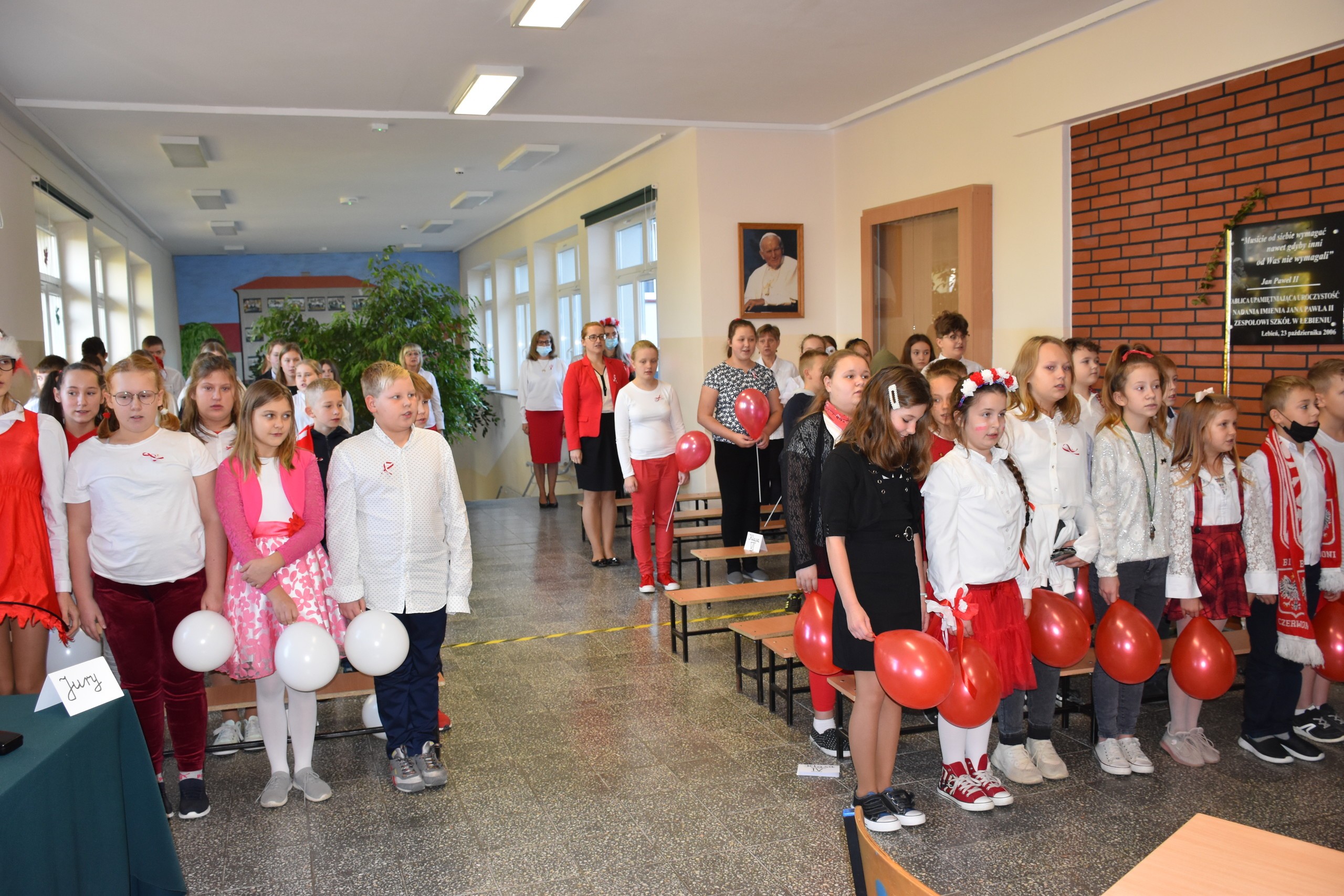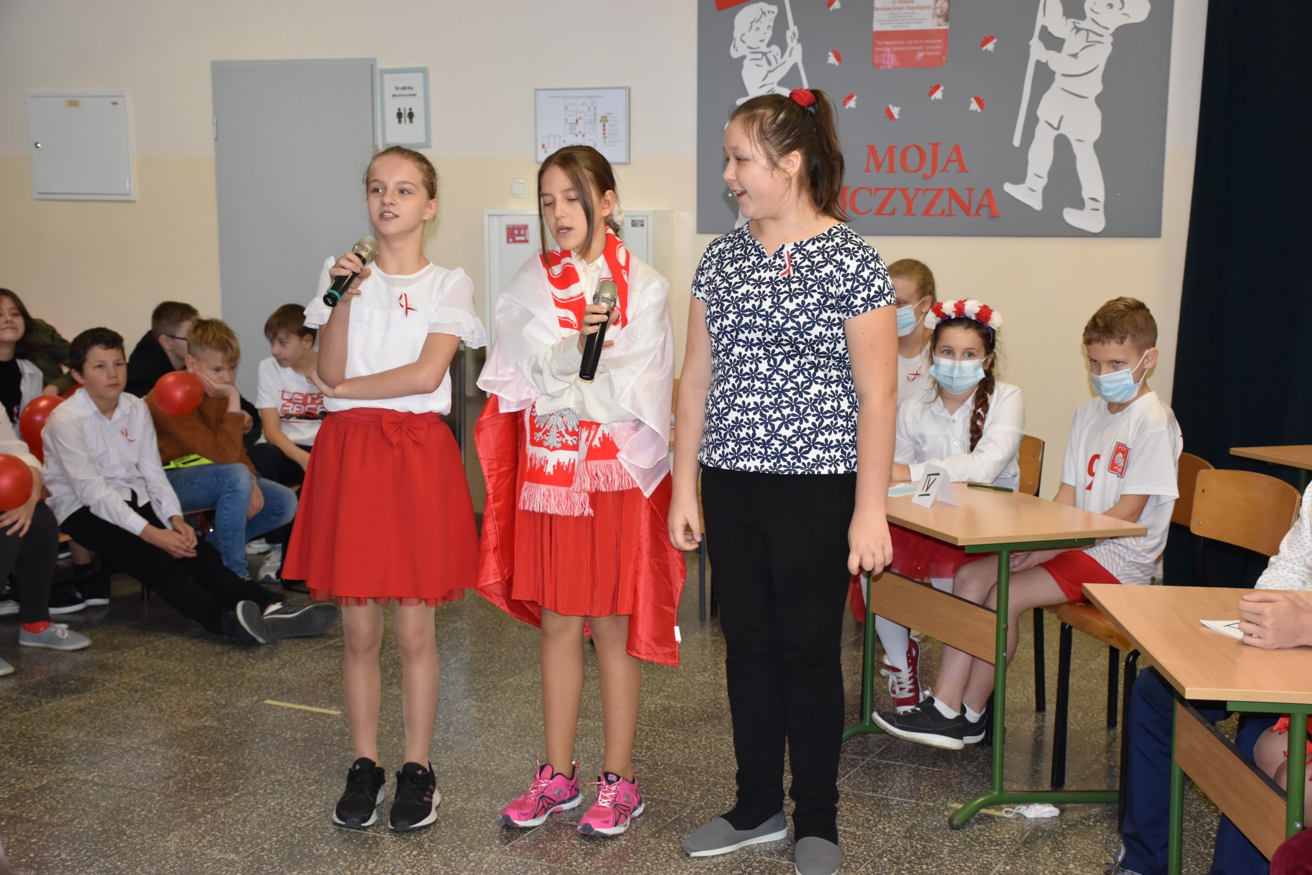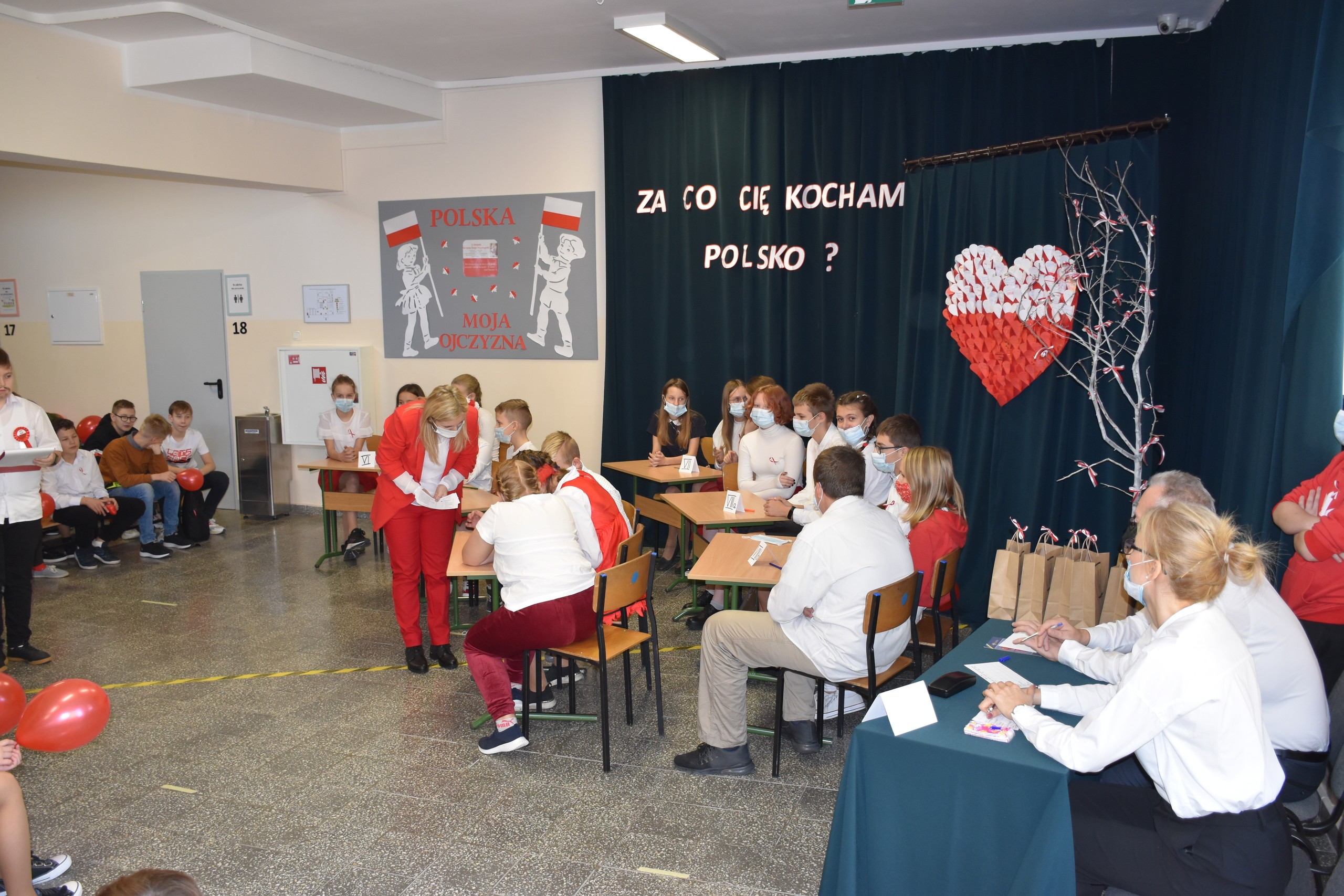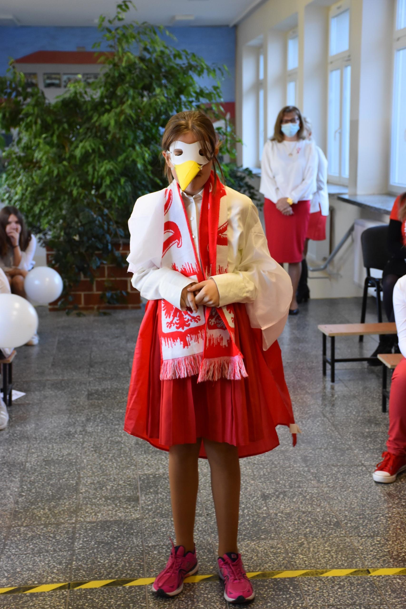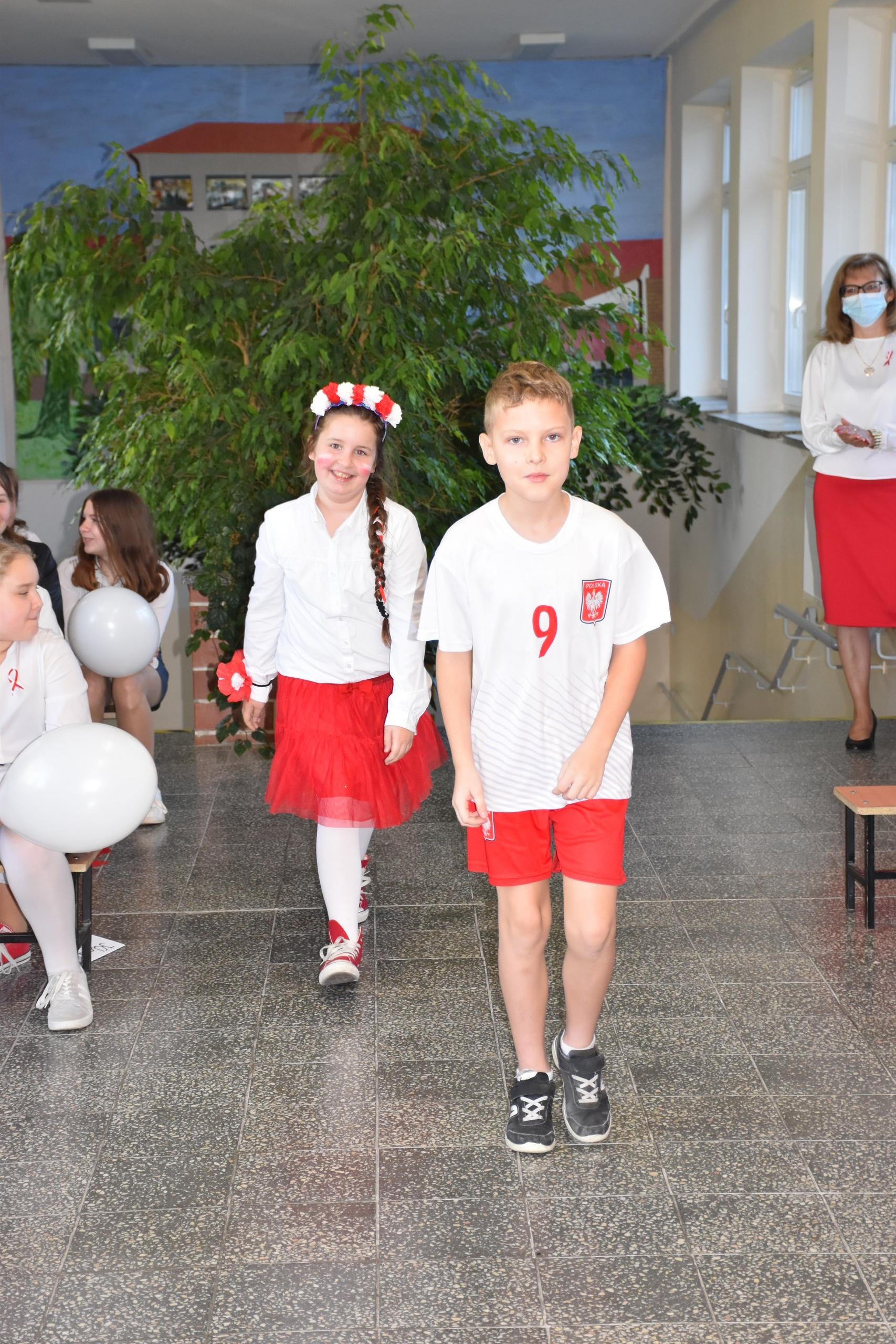 W dniu dzisiejszym społeczność Zespołu Szkół w Łebieniu obchodziła Święto Niepodległości- tym razem- w wesołej formie. Przedszkolaczki, uczniowie i nauczyciele tego dnia czcili święto ubrani w barwy narodowe. Okna naszej szkoły również stały się biało- czerwone. Uroczystość miała formę turnieju- "Za co kocham Cię Polsko?" Już kilka dni wcześniej nasi uczniowie na zajęciach zastanawiali się, za co kochają nasz kraj. Ich odpowiedzi stały się elementem dekoracji. Uroczystość odbyła się w dwóch częściach- oddzielnie dla maluszków i dla starszych uczniów. Zosia i Błażej w roli naszych polskich noblistów- Marii Skłodowskiej- Curie i Henryka Sienkiewicza poprowadzili rozgrywki turniejowe. Każda klasa przygotowała strój patriotyczny, który zaprezentowali wybrani przedstawiciele. Kolejnym zadaniem było udzielenie odpowiedzi na pytania związane z naszym krajem. Zaskoczeniem okazało się zadanie z mapą Polski. Nie zabrakło również pieśni patriotycznych w wykonaniu uczennic klasy VI. Uroku obchodom dodały piosenki i tańce przygotowane przez naszych najmłodszych- przedszkolaczków. Pan dyrektor podzielił się z uczniami wiadomością, którą otrzymał uczeń klasy III- Ksawery Kwidzyński-od uczestniczki Powstania Warszawskiego. Kartka dla Ksawerego jest odpowiedzią na akcję BohaterON, w której nasza szkoła bierze udział od kilku lat.