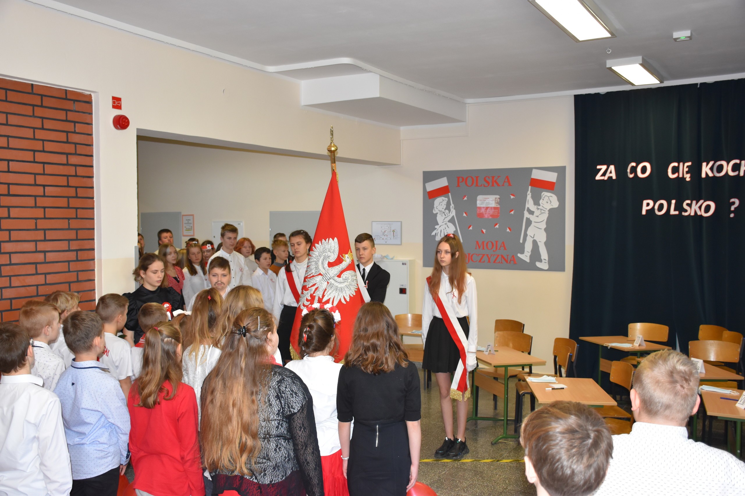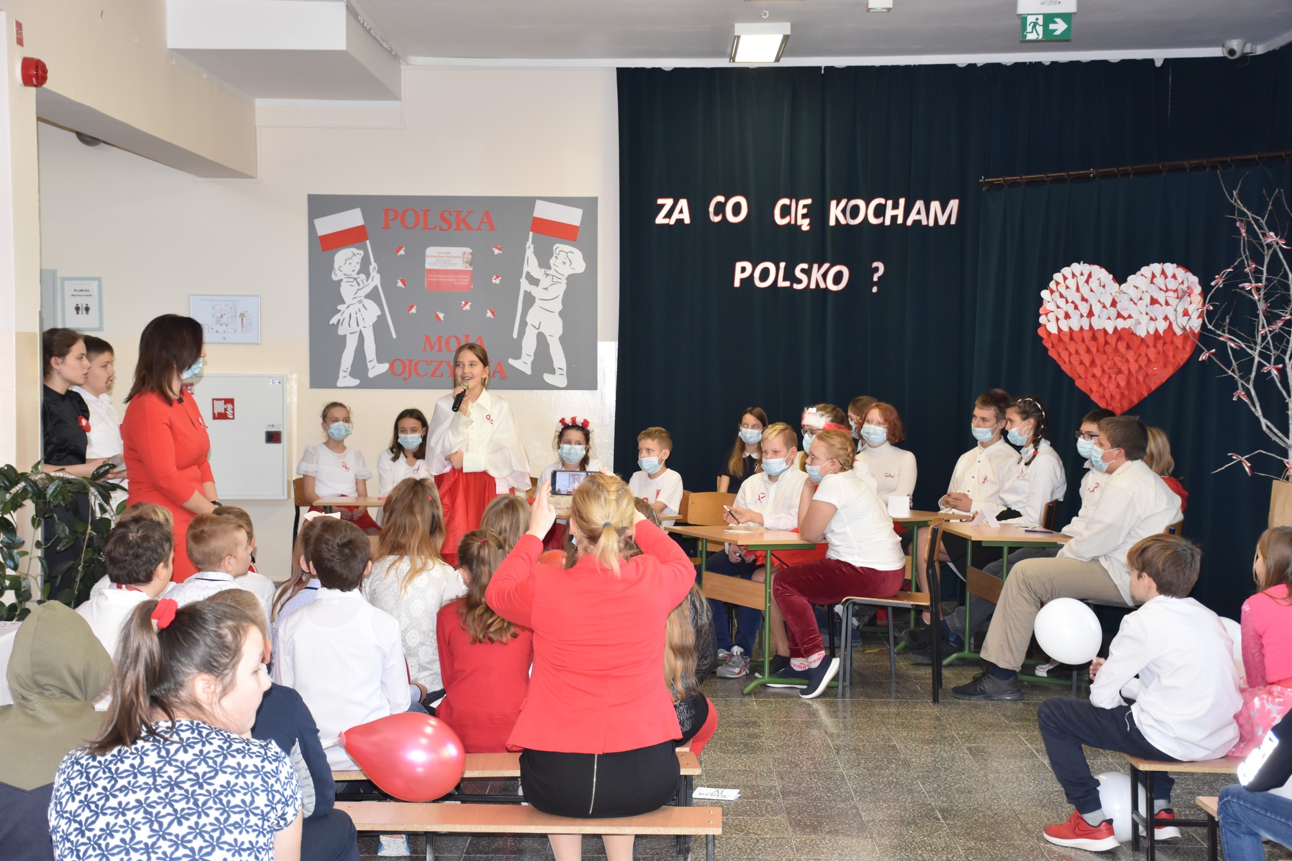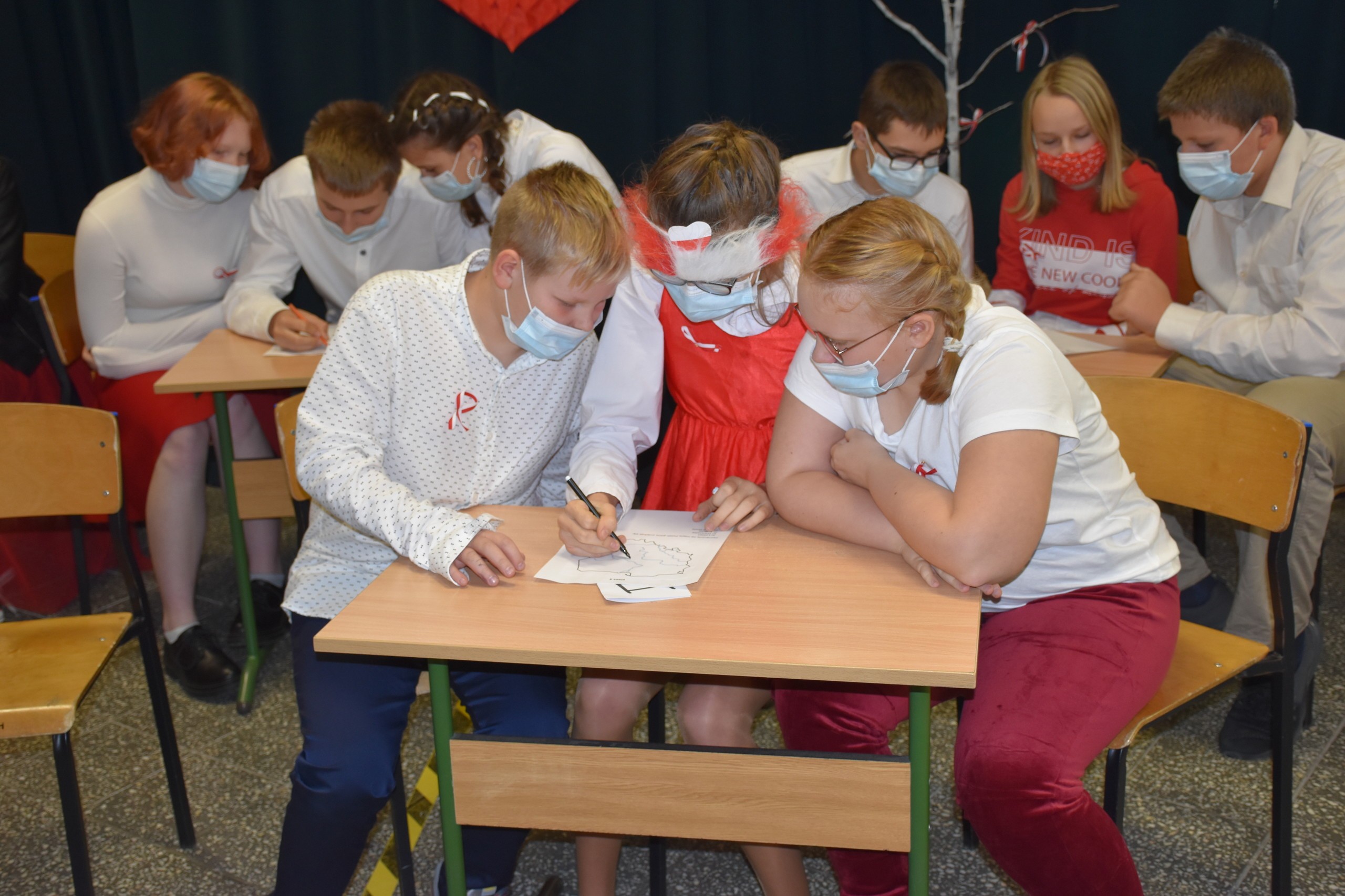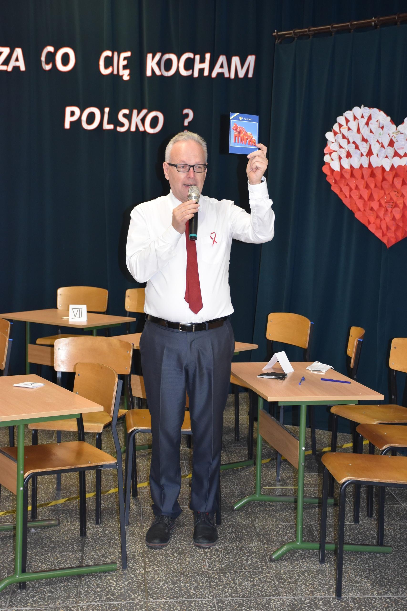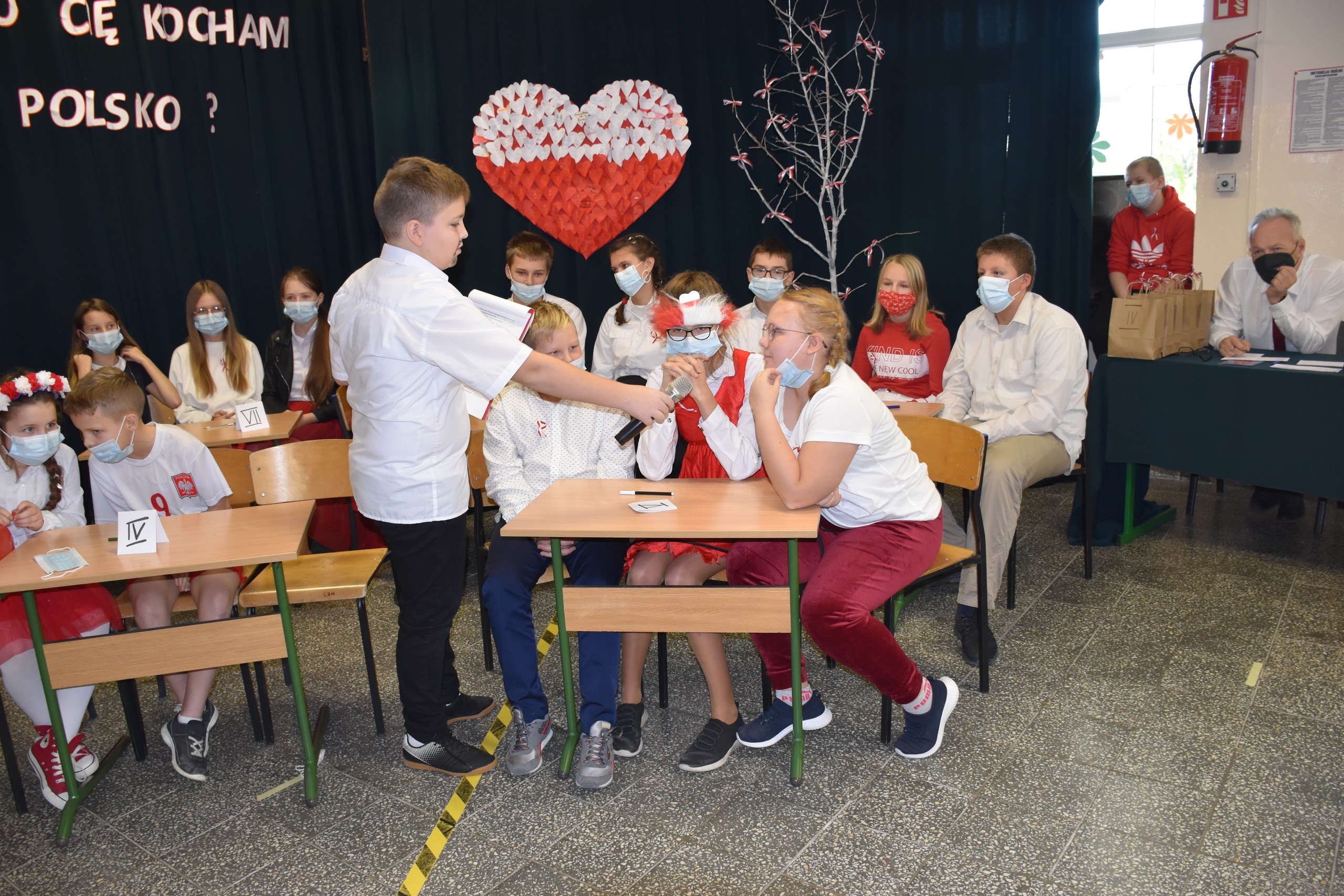 W dniu dzisiejszym społeczność Zespołu Szkół w Łebieniu obchodziła Święto Niepodległości- tym razem- w wesołej formie. Przedszkolaczki, uczniowie i nauczyciele tego dnia czcili święto ubrani w barwy narodowe. Okna naszej szkoły również stały się biało- czerwone. Uroczystość miała formę turnieju- "Za co kocham Cię Polsko?" Już kilka dni wcześniej nasi uczniowie na zajęciach zastanawiali się, za co kochają nasz kraj. Ich odpowiedzi stały się elementem dekoracji. Uroczystość odbyła się w dwóch częściach- oddzielnie dla maluszków i dla starszych uczniów. Zosia i Błażej w roli naszych polskich noblistów- Marii Skłodowskiej- Curie i Henryka Sienkiewicza poprowadzili rozgrywki turniejowe. Każda klasa przygotowała strój patriotyczny, który zaprezentowali wybrani przedstawiciele. Kolejnym zadaniem było udzielenie odpowiedzi na pytania związane z naszym krajem. Zaskoczeniem okazało się zadanie z mapą Polski. Nie zabrakło również pieśni patriotycznych w wykonaniu uczennic klasy VI. Uroku obchodom dodały piosenki i tańce przygotowane przez naszych najmłodszych- przedszkolaczków. Pan dyrektor podzielił się z uczniami wiadomością, którą otrzymał uczeń klasy III- Ksawery Kwidzyński-od uczestniczki Powstania Warszawskiego. Kartka dla Ksawerego jest odpowiedzią na akcję BohaterON, w której nasza szkoła bierze udział od kilku lat.