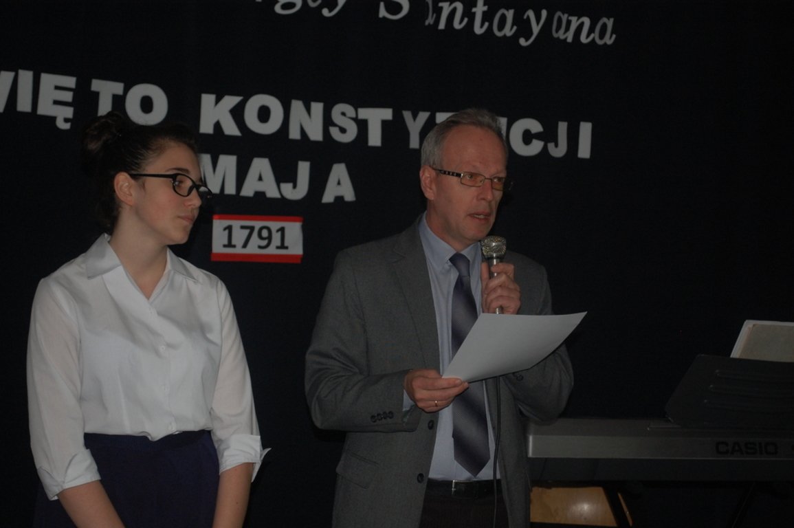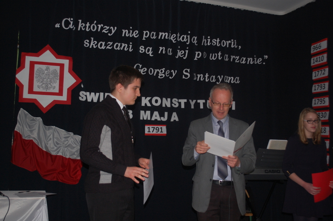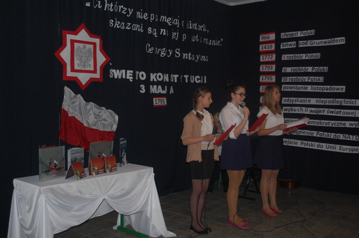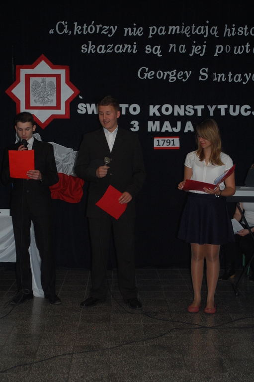 Dziś w naszej szkole odbyła się uroczystość z okazji 224 rocznicy uchwalenia Konstytucji 3 Maja. Był to wyjątkowy apel, ponieważ oprócz przedstawionego przez uczniów Gimnazjum montażu słowno – muzycznego, pozostali uczniowie brali czynny udział w uroczystości. Każda klasa zaprezentowała, w trakcie apelu, przygotowaną wcześniej polską pieśń patriotyczną. Najciekawsze wykonania zostały nagrodzone przez wybrane spośród nauczycieli jury. Panował podniosły nastrój, który dopełniła piękna dekoracja. Apel przygotowały p. Aleksandra Jeziorowska i p. Anna Lica. Uczniowie biorący udział w uroczystości: Patrycja Kowalik, Malwina Makurat, Joanna Labuda, Weronika Grzesik, Nikola Wrąbel, Joanna Gołębiowska, Paulina Górczyńska, Michalina Czajkowska, Zuzanna Bobrucka, Kinga Wyrwał, Julia Prokopowicz, Dominika Małecka, Bartosz Tandek, Tomasz Piątkowski, Olaf Jaskulski, Bartłomiej Hinca.