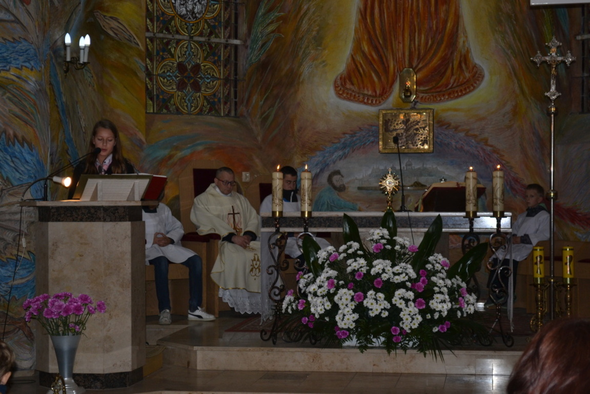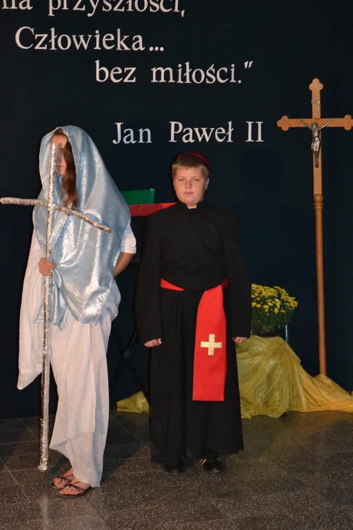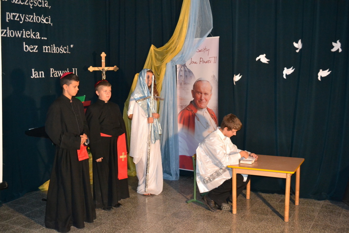 Dnia 23 października 2014 roku obchodziliśmy Dzień Patrona szkoły. Z tej okazji o godzinie 9 w kościele parafialnym odbyła się msza święta, w której uczestniczyli wszyscy uczniowie ze szkoły podstawowej i gimnazjum, wychowankowie przedszkola i nauczyciele. Uroczysty apel o charakterze pantomimy przedstawiał wydarzenia z życia patrona. Najważniejszym przesłaniem dzisiejszej uroczystości były słowa Jana Pawła II „ Nie ma szczęścia, nie ma przyszłości Człowieka… bez miłości”. Była to 8 rocznica nadania imienia Świętego Jana Pawła II Zespołowi Szkół w Łebieniu. Apel przygotowały katechetki Panie: Angelika Wiśniewska, Joanna Rybicka i Maria Cieszkowska