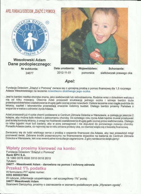 16.10.2014r. w naszej szkole Samorząd Uczniowski przeprowadził akcję sprzedaży ciasta w celu zebrania pieniędzy dla Adasia Wesołowskiego, chorującego na nowotwór siatkówki. Wszystkie zebrane pieniądze przekazano na konto Fundacji Dzieciom "Zdążyć z Pomocą", której podopiecznym jest Adaś. Samorząd Uczniowski serdecznie dziękuje rodzicom uczniów za pomoc w przeprowadzeniu akcji.