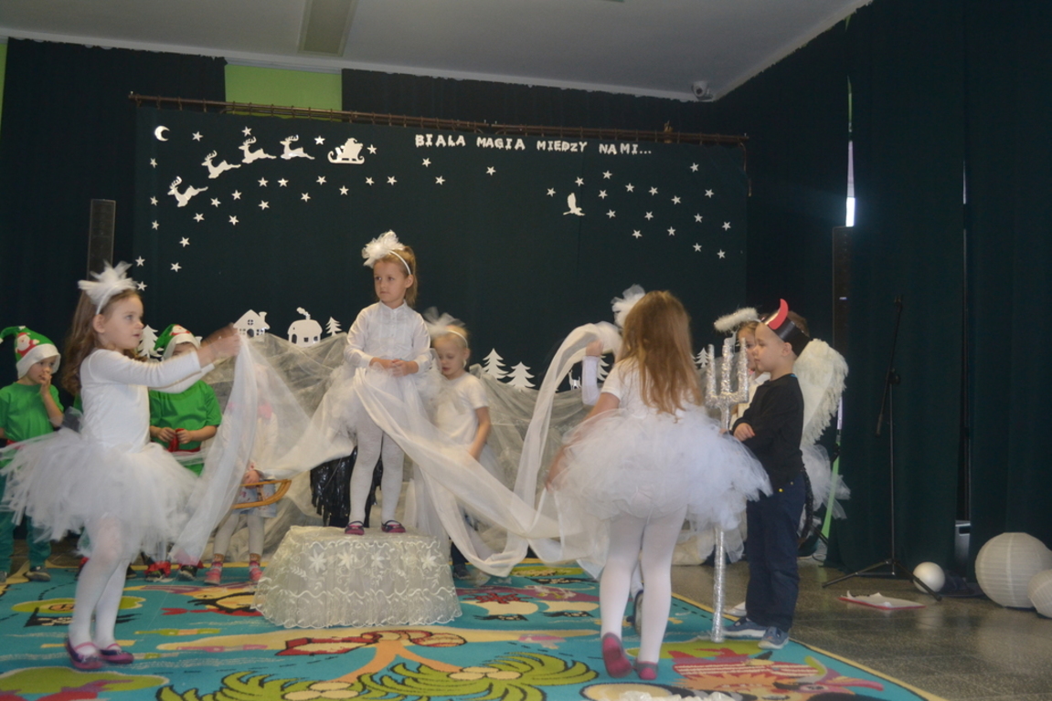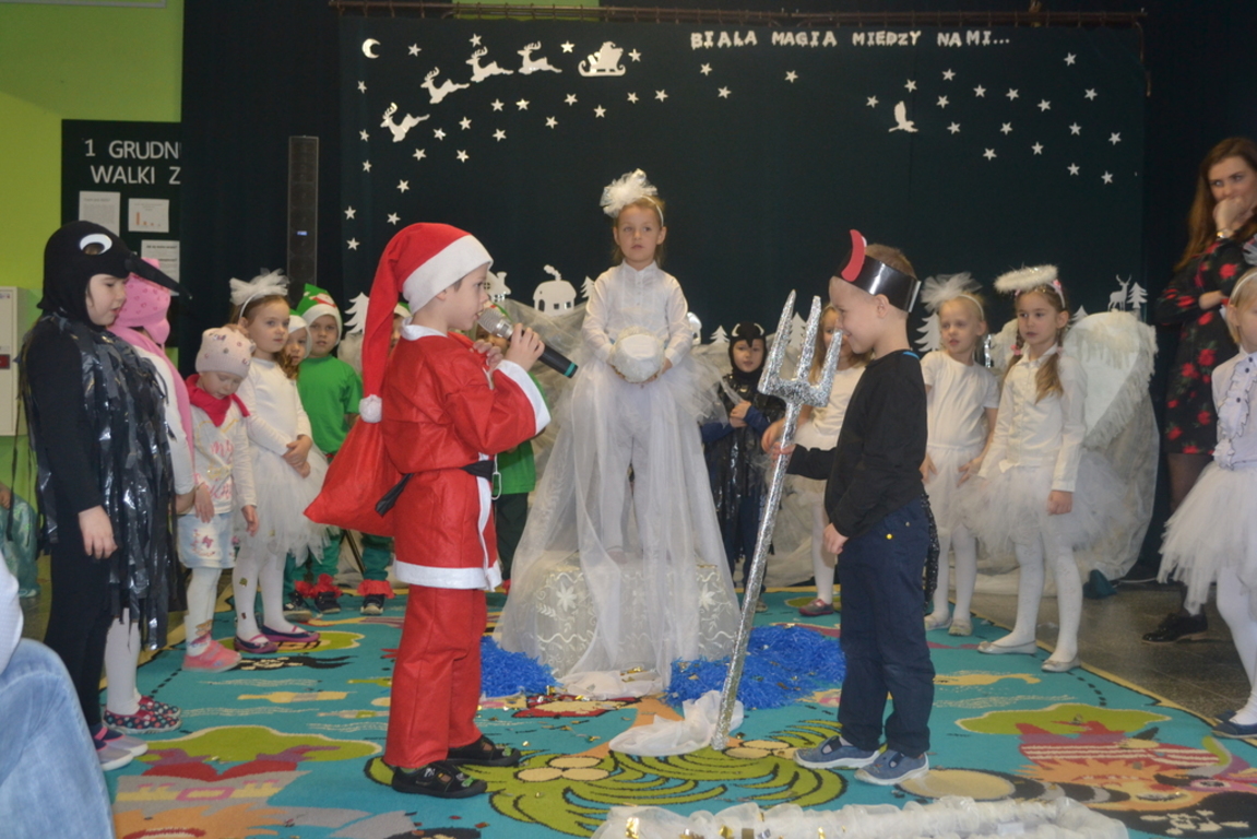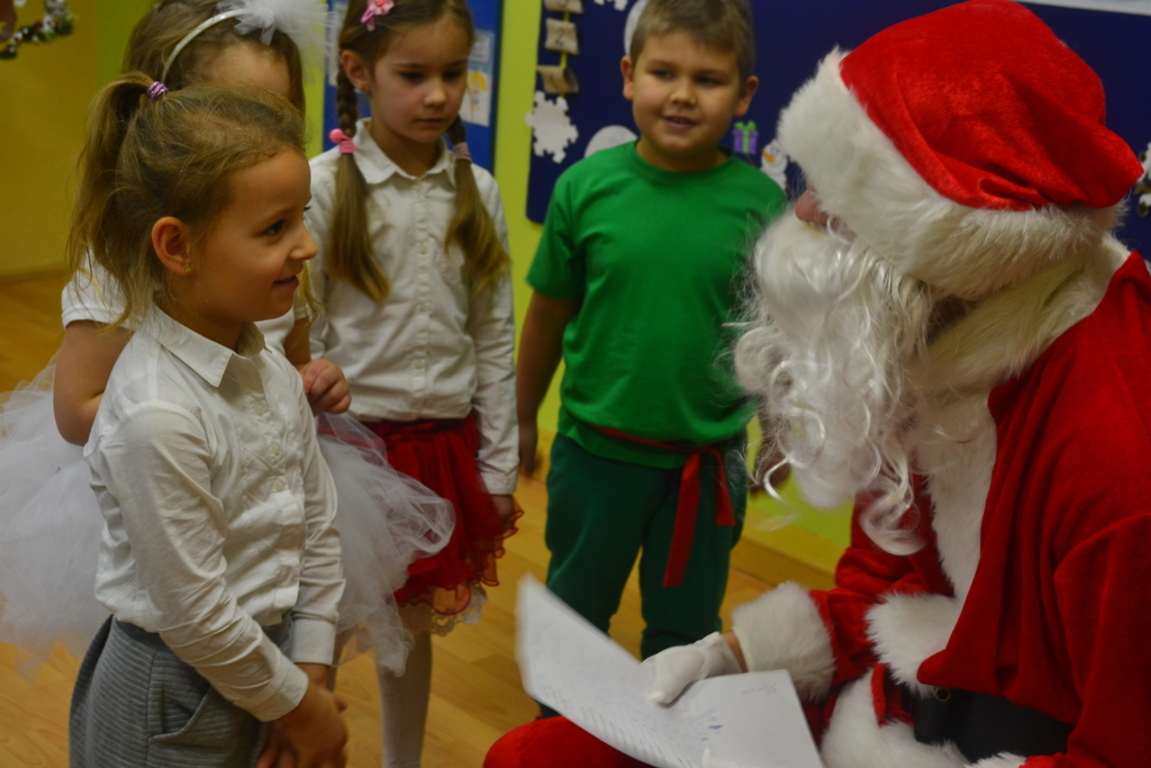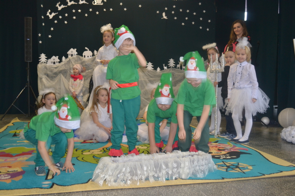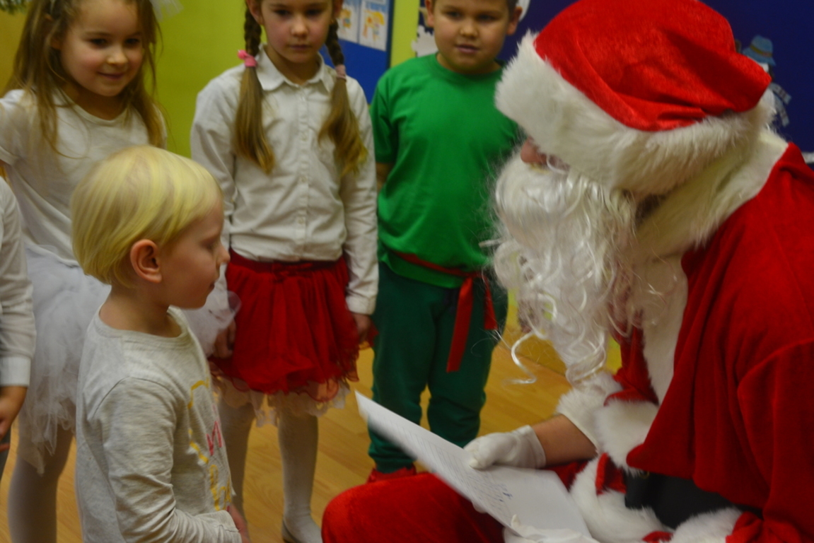 Dnia 20.12.2017 r. w naszym przedszkolu zapanował radosny i świąteczny nastrój. Na tą uroczystość przybyli zaproszeni Rodzice. Na początku swój program zaprezentowali najmłodsi czyli grupa dzieci 3-4 letnich następnie dzieci 5 -letnie. Świąteczna atmosfera udzieliła się wszystkim. Na koniec dyrektor p. Krzysztof Wojtysiak złożył wszystkim życzenia świąteczne oraz na zbliżający się Nowy Rok. Na dzieci czekała w przedszkolu czerwona postać z bajki, która miała dla każdego malucha prezenty. Dla rodzic ów był przygotowany słodki poczęstunek.