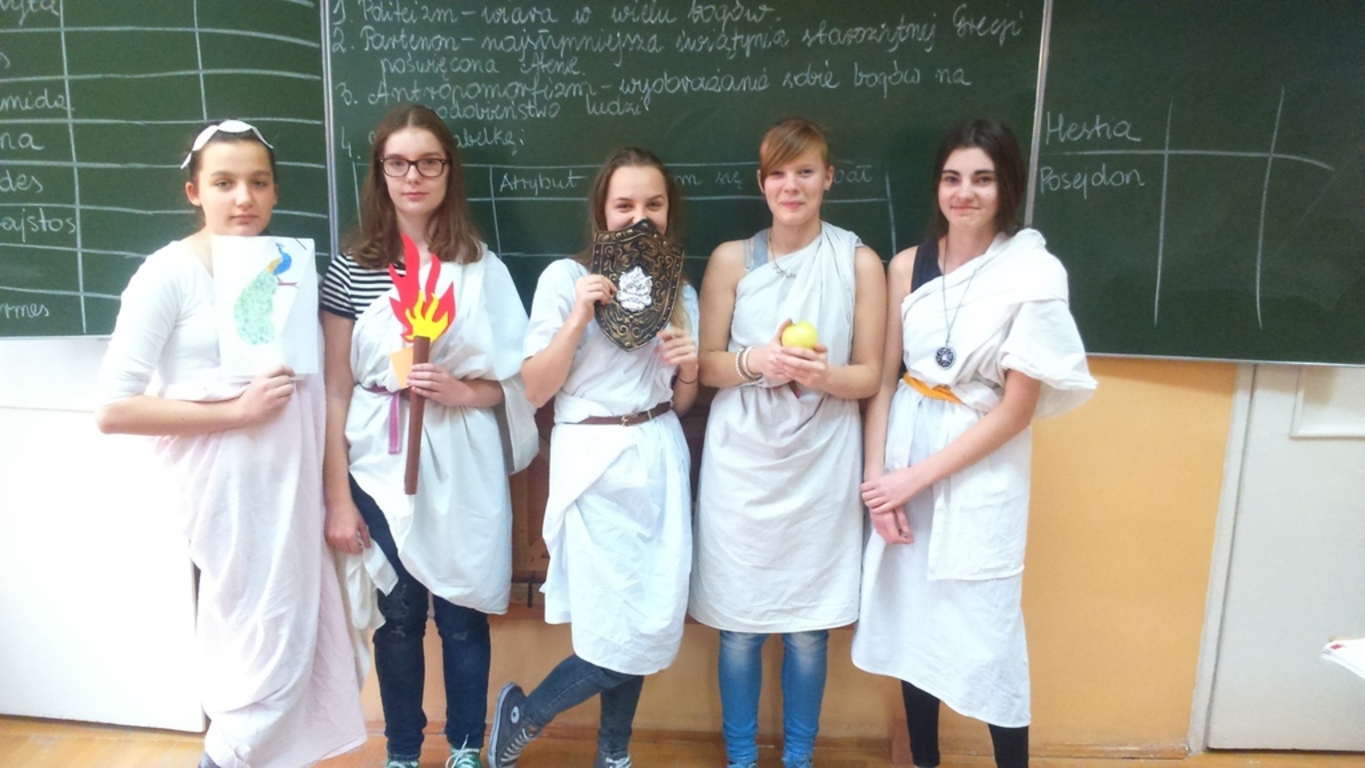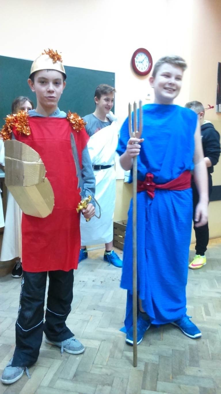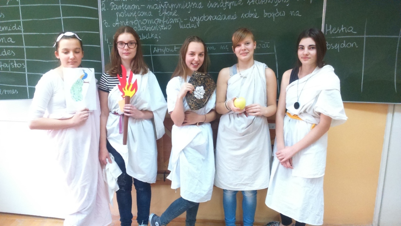 Uczniowie klas pierwszych gimnazjum na ostatnich lekcjach historii wcielili się w role bogów greckich. Z wielkim zaangażowaniem przedstawili postaci Zeusa, Hery, Ateny, Afrodyty, Posejdona, Hermesa i nie tylko... Okazało się,że taka forma przyswajania wiedzy bardzo uczniom się spodobała. Gratulujemy inicjatywy i zapraszamy do obejrzenia galerii zdjęć.