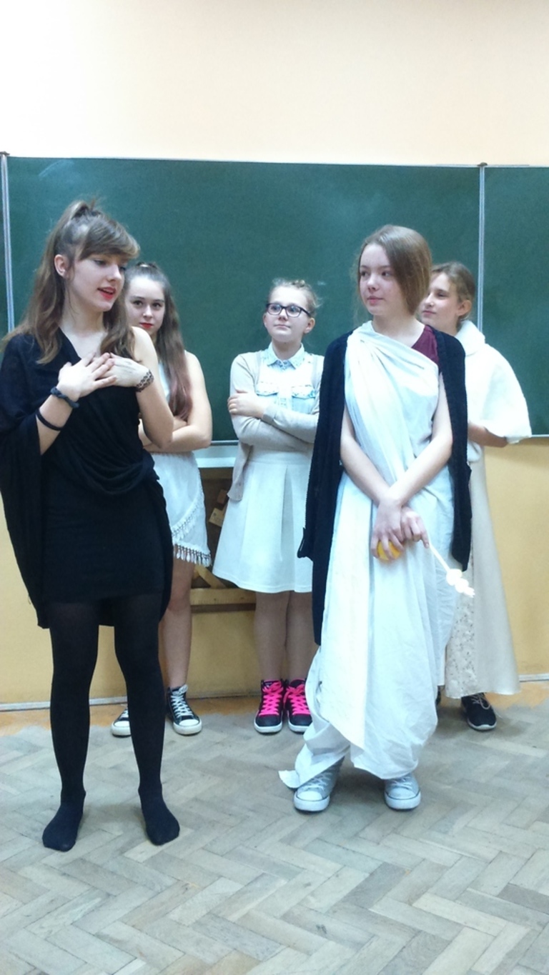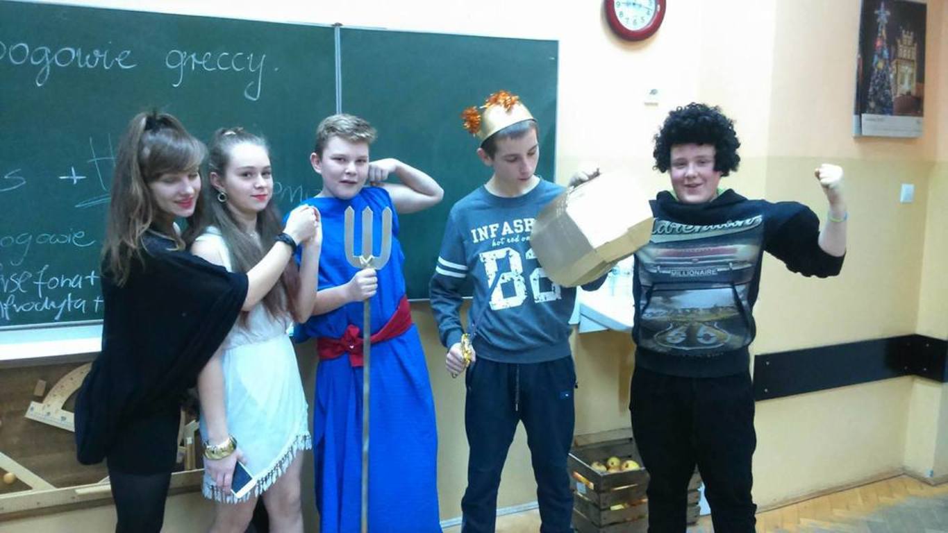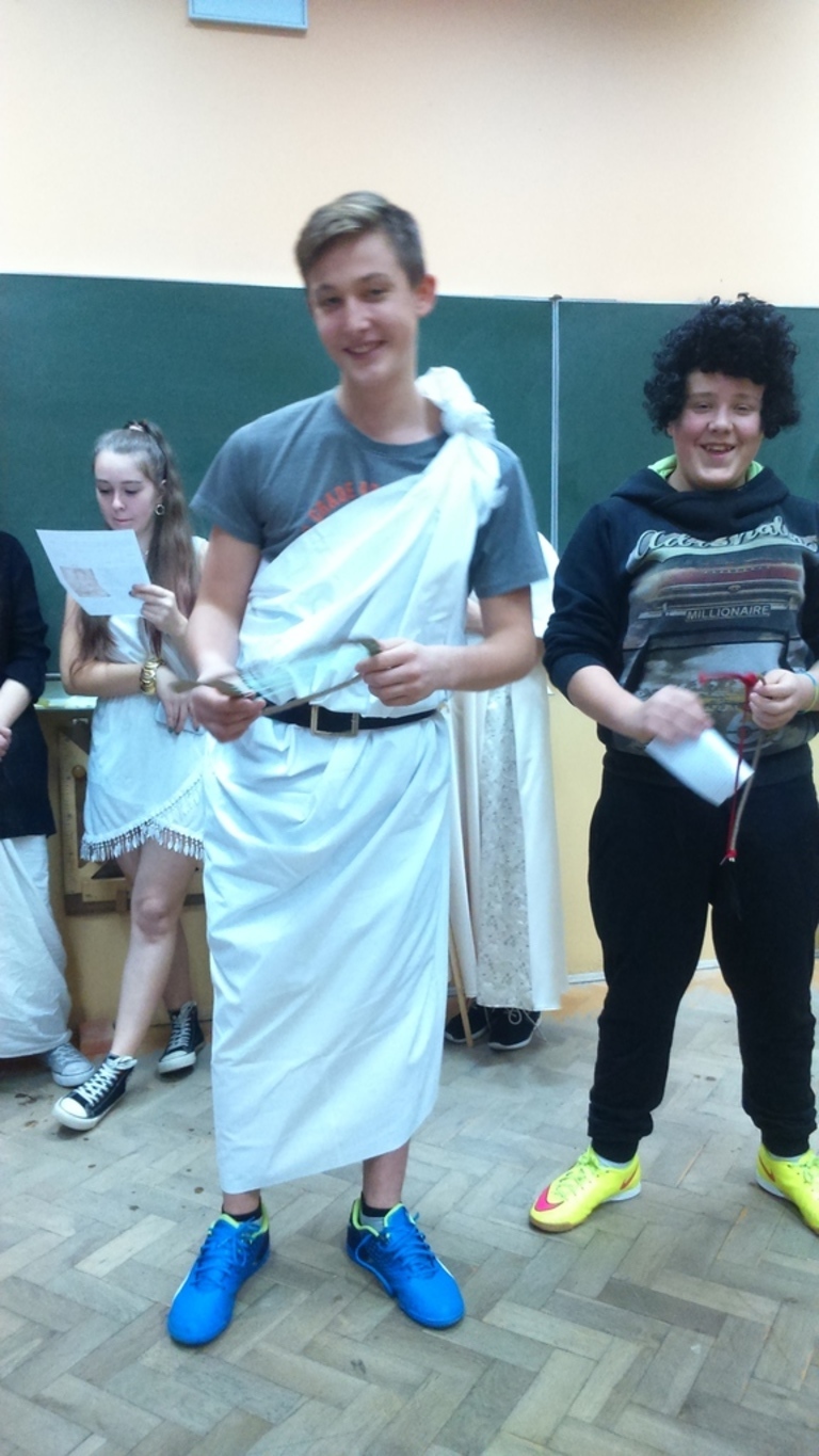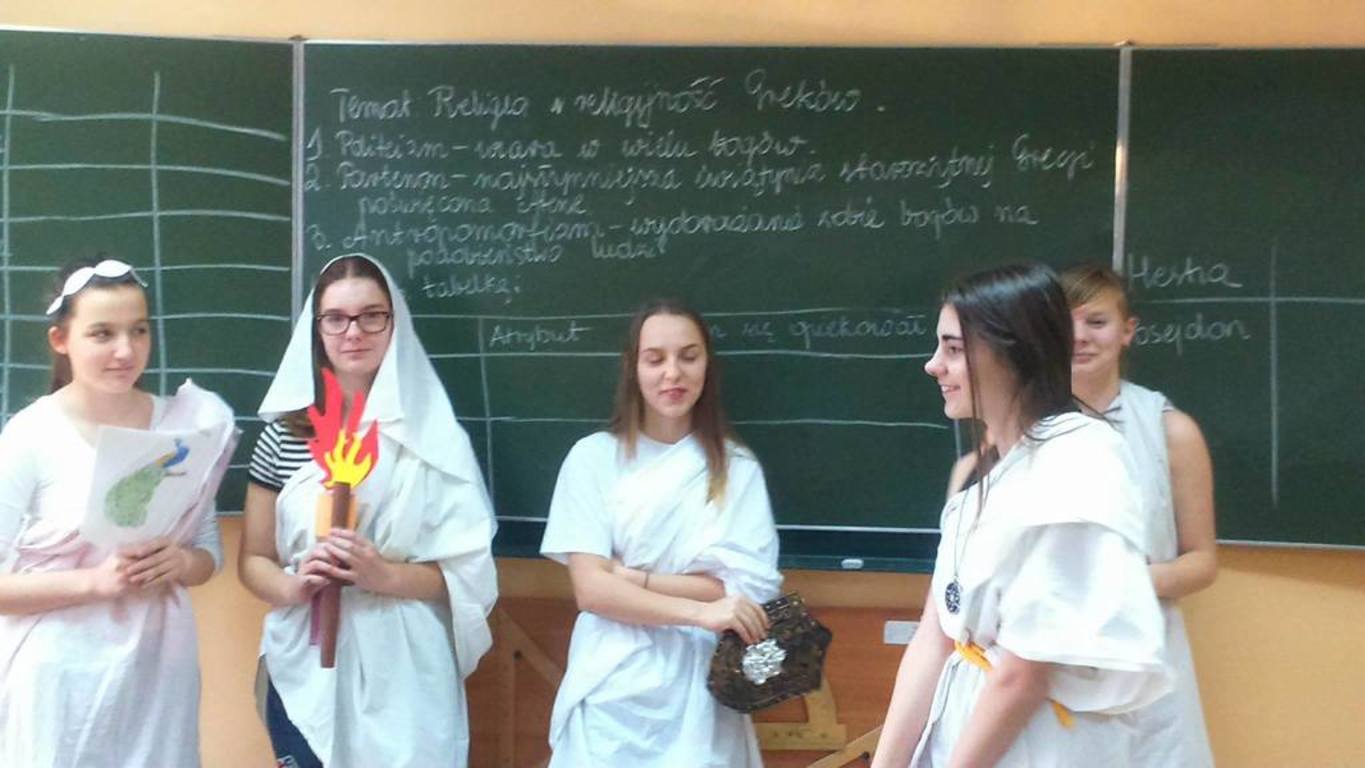 Uczniowie klas pierwszych gimnazjum na ostatnich lekcjach historii wcielili się w role bogów greckich. Z wielkim zaangażowaniem przedstawili postaci Zeusa, Hery, Ateny, Afrodyty, Posejdona, Hermesa i nie tylko... Okazało się,że taka forma przyswajania wiedzy bardzo uczniom się spodobała. Gratulujemy inicjatywy i zapraszamy do obejrzenia galerii zdjęć.
