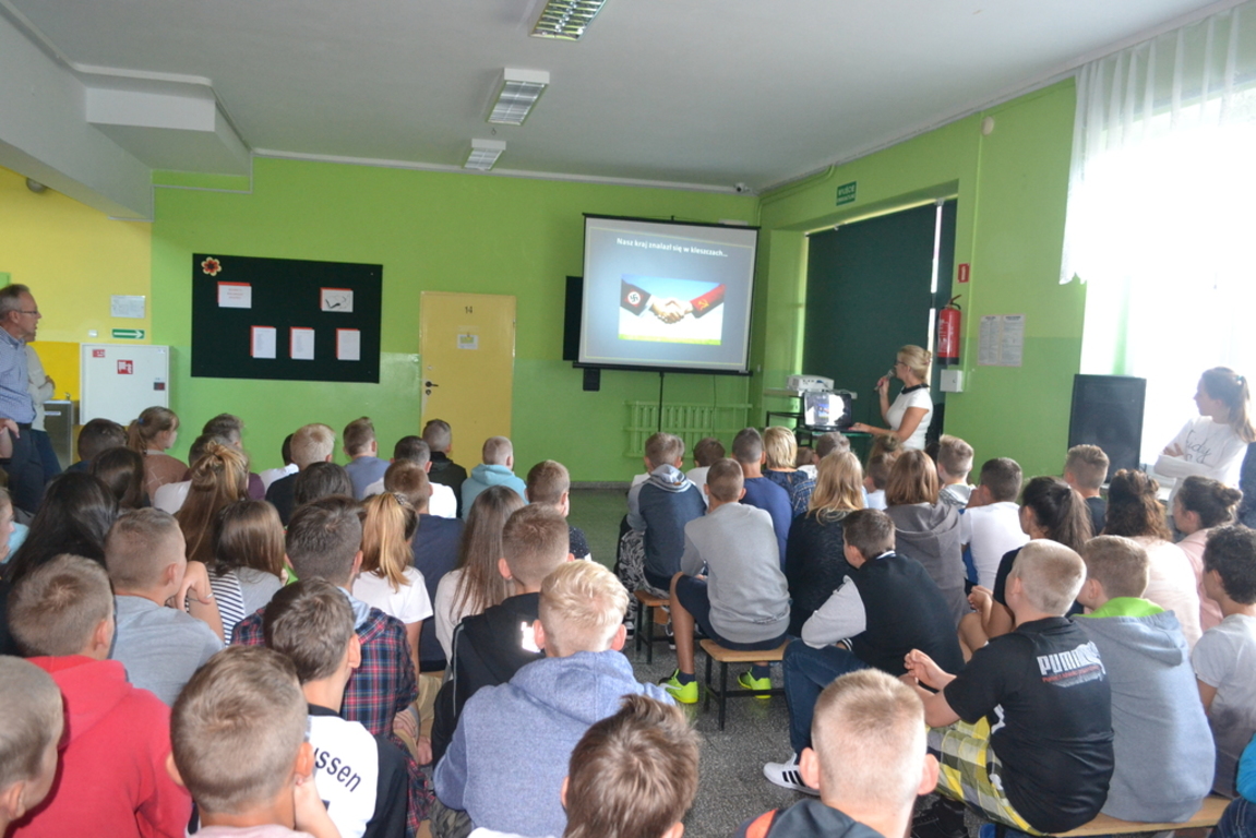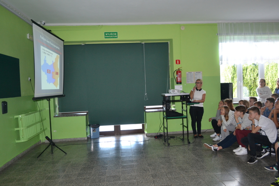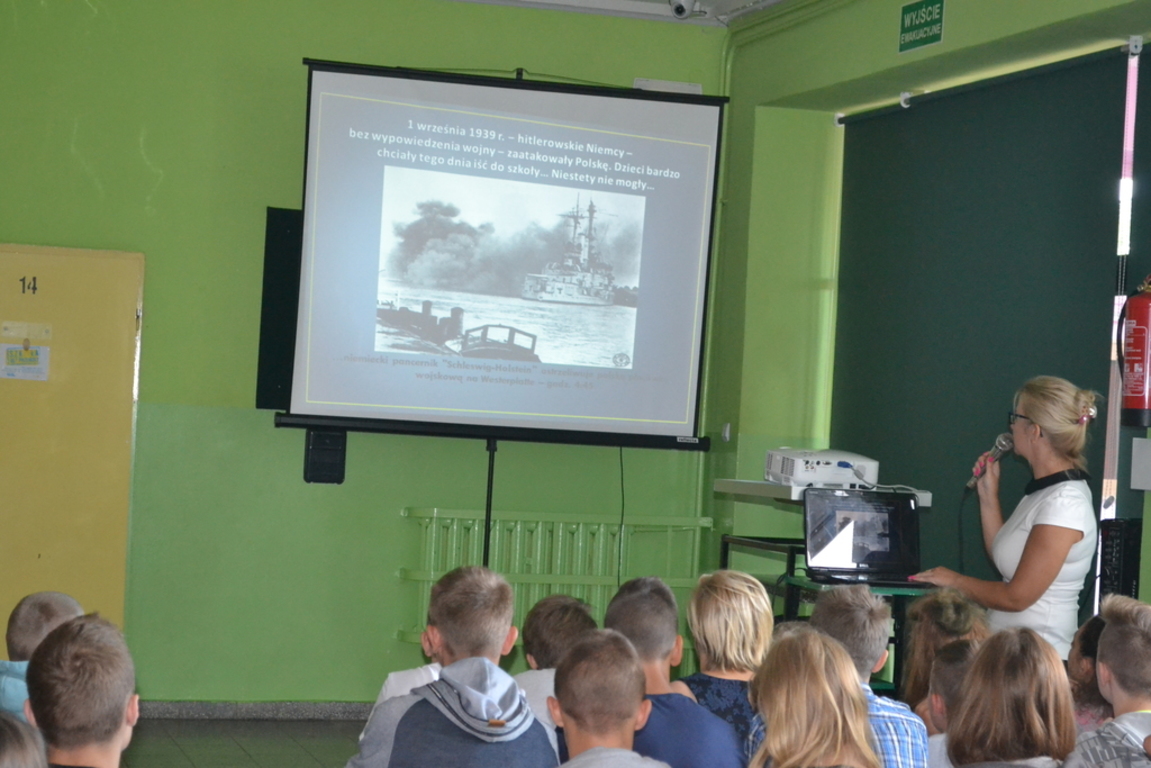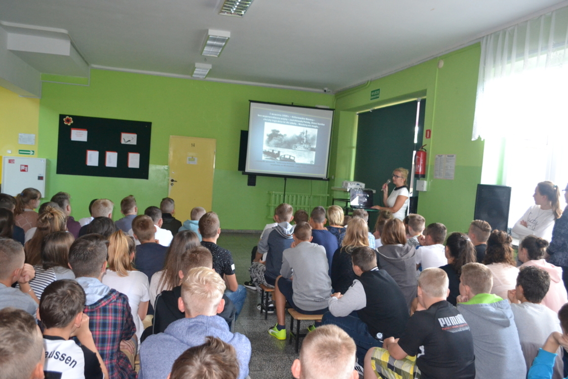 Dnia 2 września uczniowie naszej szkoły uczestniczyli w nietypowej lekcji historii. Odbył się bowiem apel, podczas którego dyrektor szkoły, Pan Krzysztof Wojtysiak oraz nauczyciel historii, Pani Elżbieta Laskiewicz przypomnieli uczniom, co wydarzyło sie 1 września 77 lat temu. Uczniowie obejrzeli prezentację na temat września 1939 roku, wysłuchali komentarza do niej. Tematyka ta bardzo zainteresowała naszych uczniów i nawet najmłodsi słuchacze zadawali pytania oraz dzielili sie swoimi refleksjami na temat bardzo trudnej polskiej przeszłości.