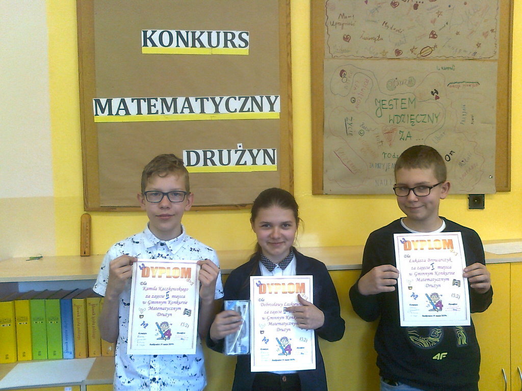 Dzisiaj w Redkowicach, w Drużynowym Konkursie Matematycznym, rywalizowali najlepsi uczniowie klas 5-6. Naszą szkołę reprezentowali: Łukasz Browarczyk (I miejsce), Kamil Kaczkowski (II miejsce), Dobrosława Laskiewicz (IV miejsce). Poziom konkursu był bardzo wysoki, a różnice punktowe między drużynami niewielkie. Gratulujemy uczestnikom i życzymy dalszych sukcesów.