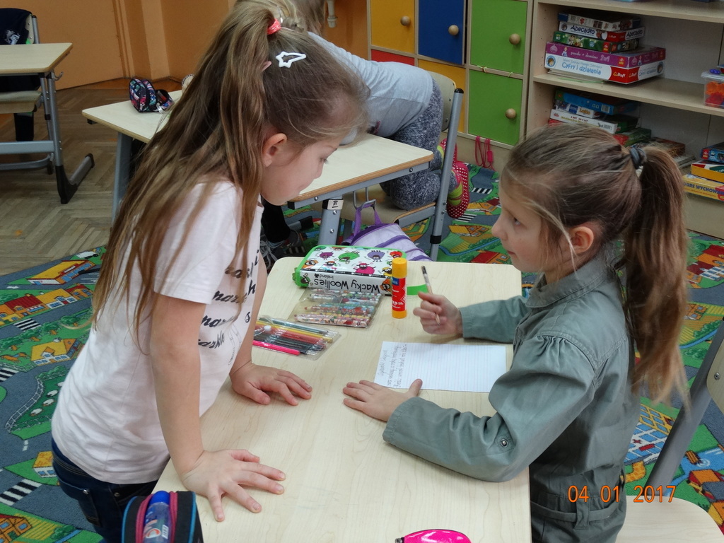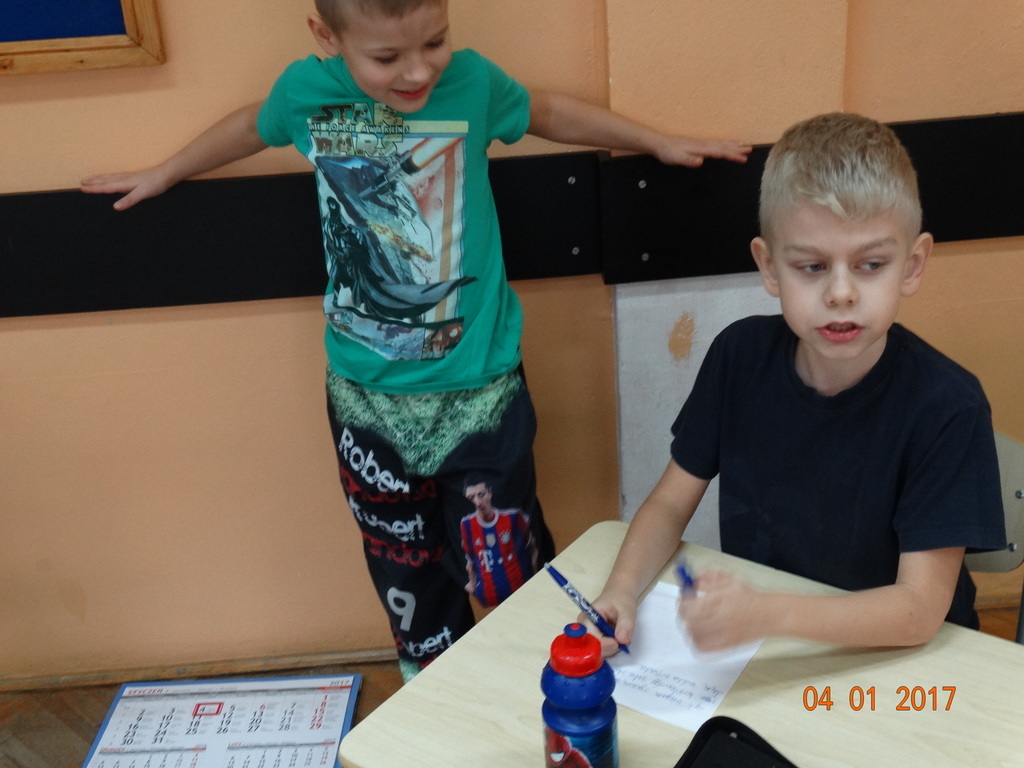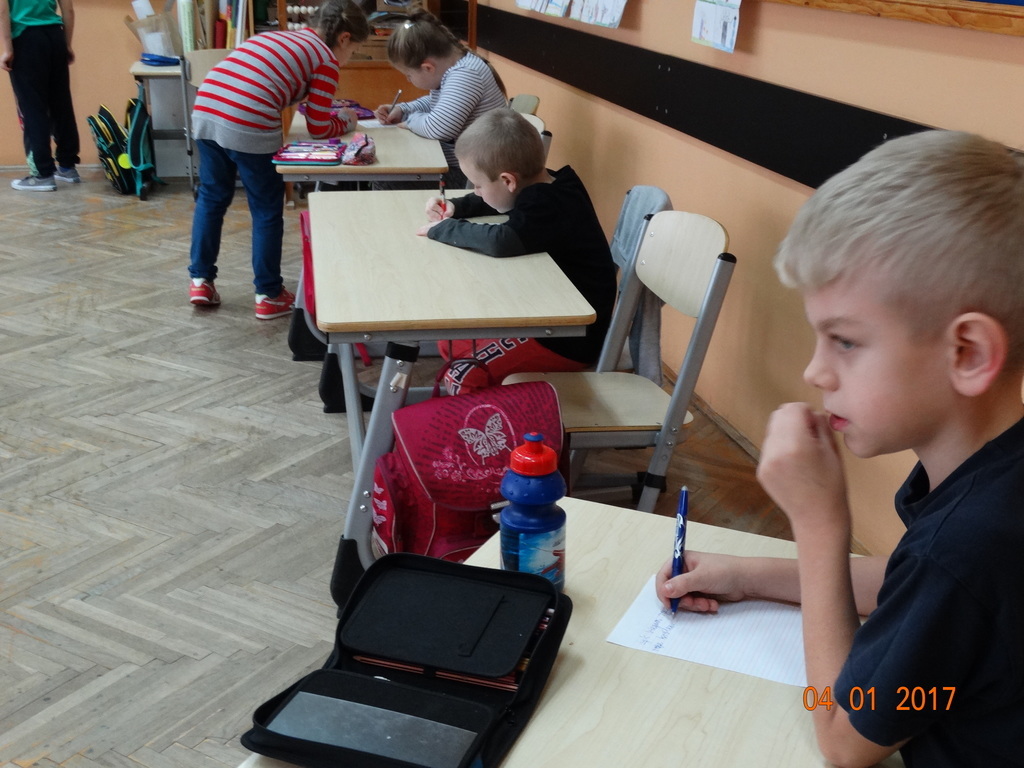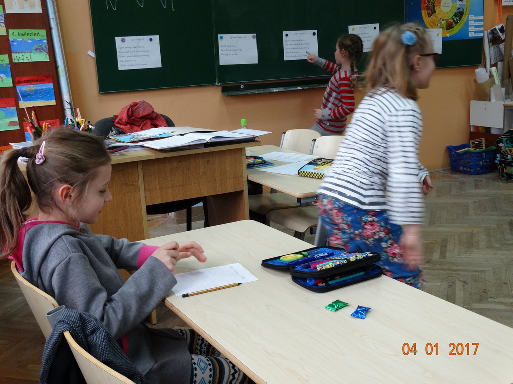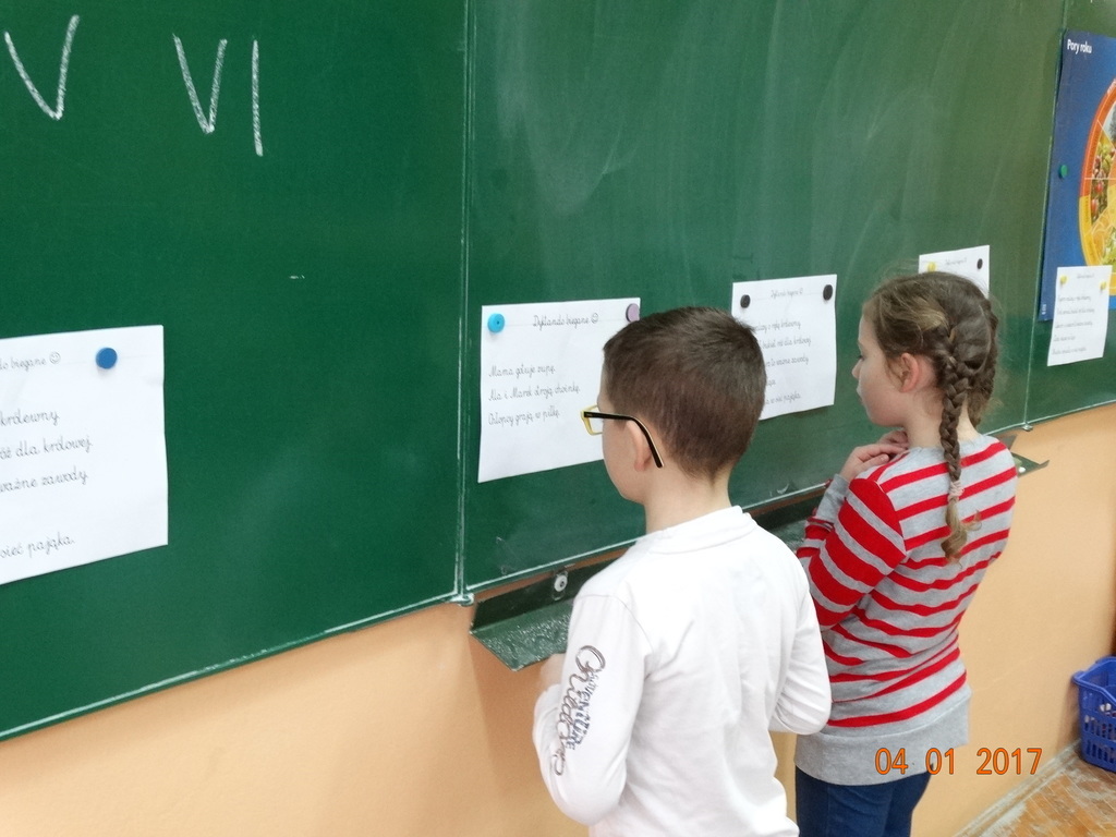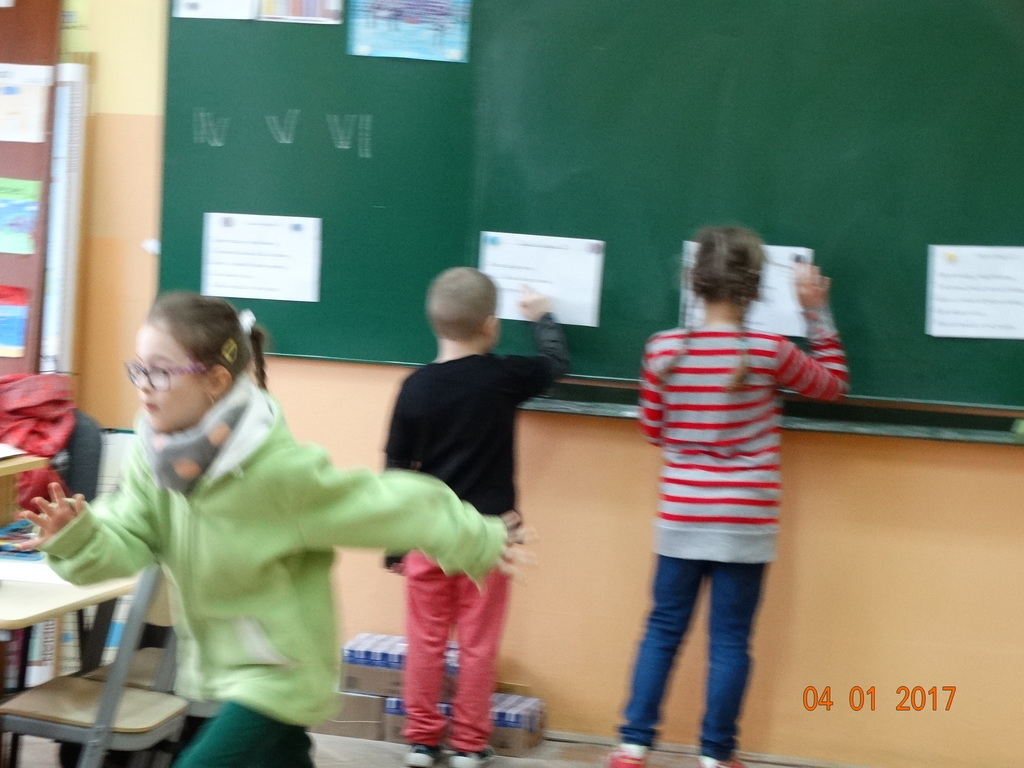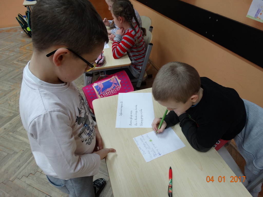 Czy dyktando może być w formie zabawy? Oczywiście! Przekonali się o tym uczniowie IIa. Dyktando biegane - to zadanie, które może urozmaicić ćwiczenia z pisania ze słuchu na zajęciach z edukacji polonistycznej. Dzieci są dobrane parami, jedna osoba z pary czyta tekst umieszczony na tablicy, biegnie do swojego partnera i mu dyktuje. Razem pilnują poprawności ortograficznej. Po skończonej pracy sprawdzają swoje dyktando z tekstem i razem poprawiają błędy na zielono. Dyktando bez stresu -