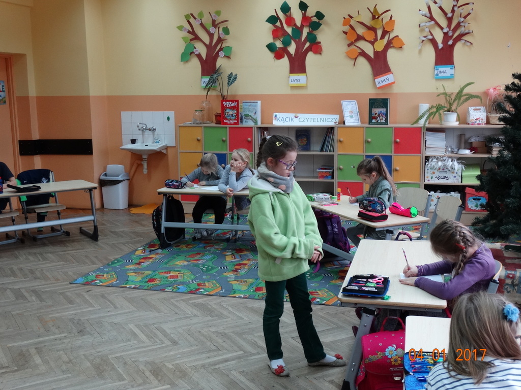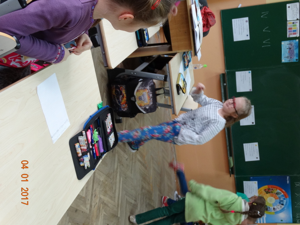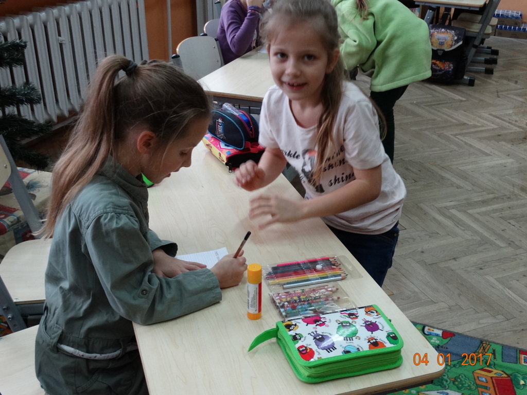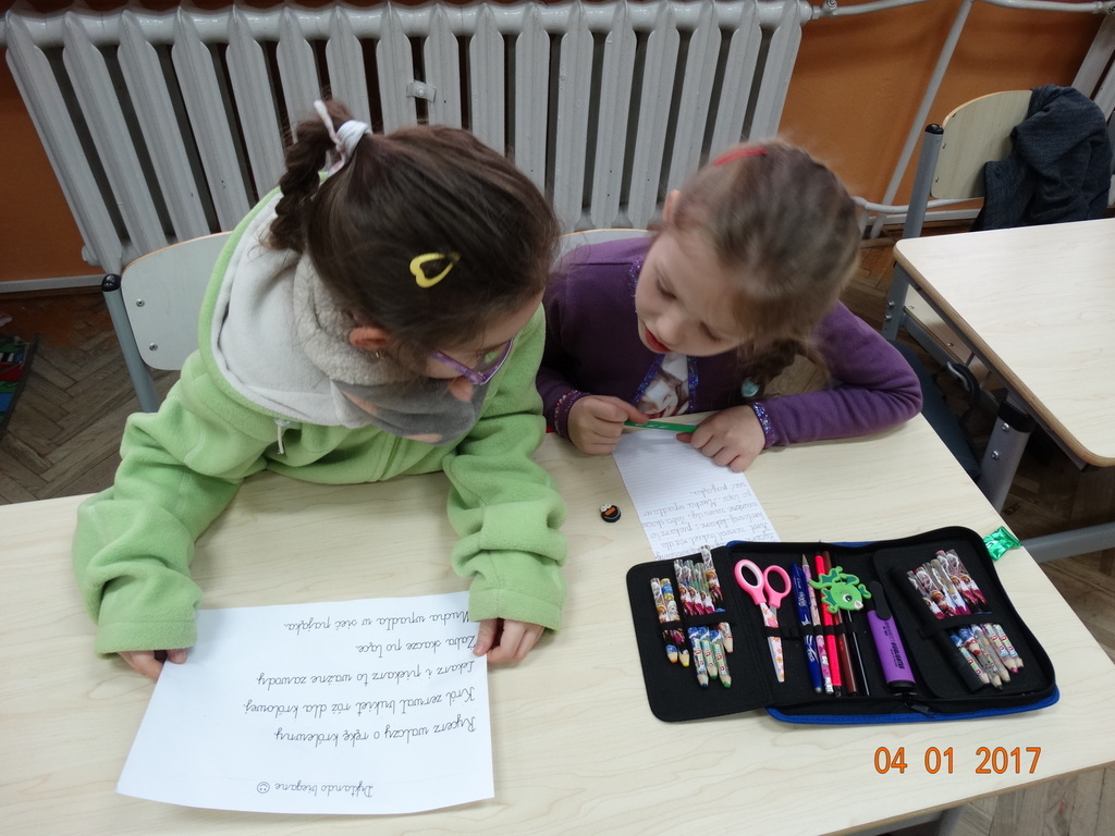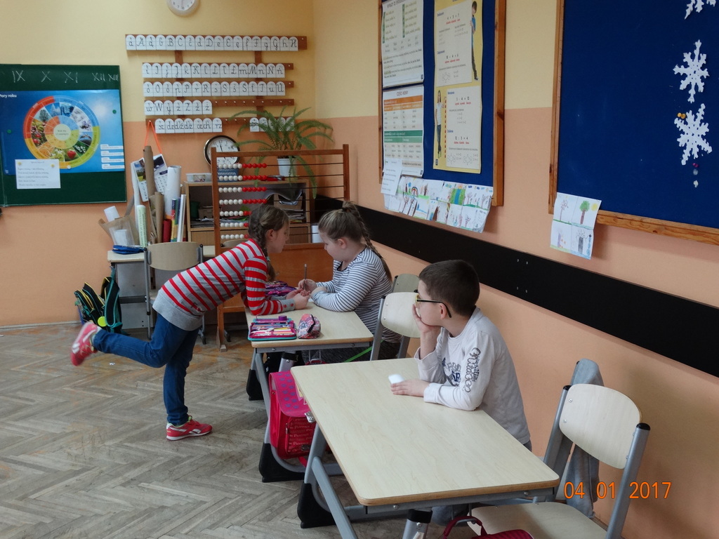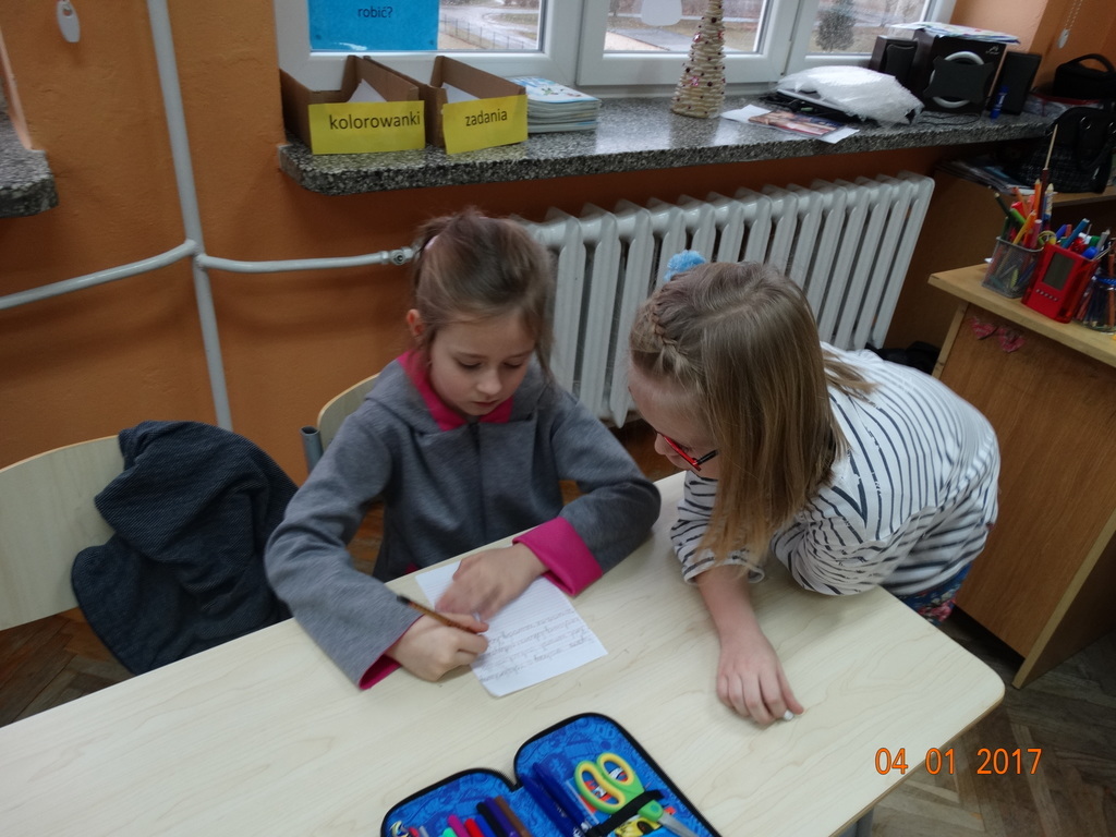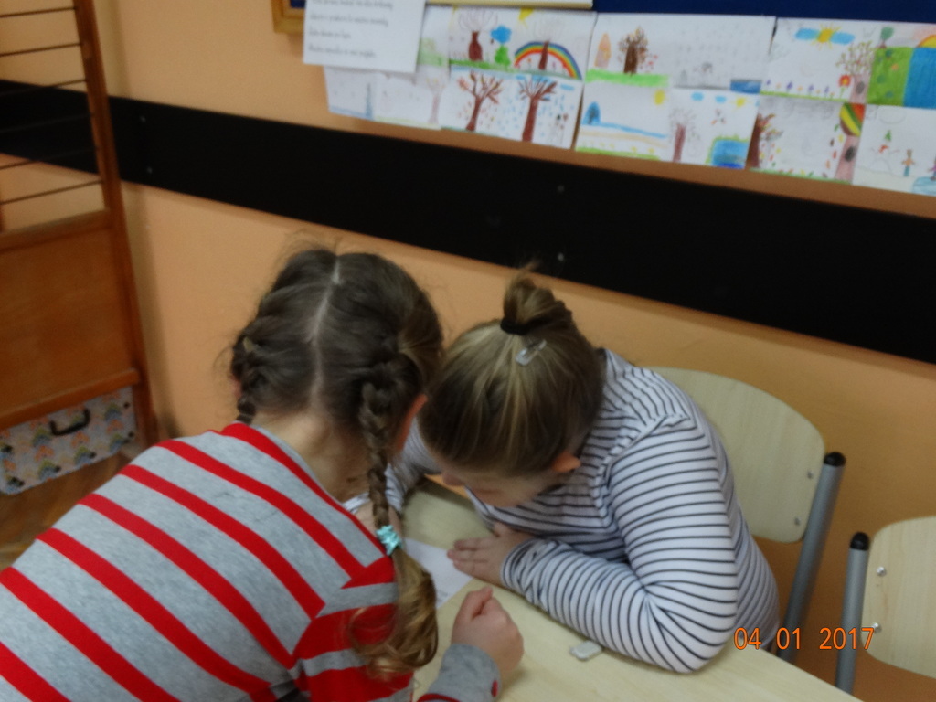 Czy dyktando może być w formie zabawy? Oczywiście! Przekonali się o tym uczniowie IIa. Dyktando biegane - to zadanie, które może urozmaicić ćwiczenia z pisania ze słuchu na zajęciach z edukacji polonistycznej. Dzieci są dobrane parami, jedna osoba z pary czyta tekst umieszczony na tablicy, biegnie do swojego partnera i mu dyktuje. Razem pilnują poprawności ortograficznej. Po skończonej pracy sprawdzają swoje dyktando z tekstem i razem poprawiają błędy na zielono. Dyktando bez stresu -