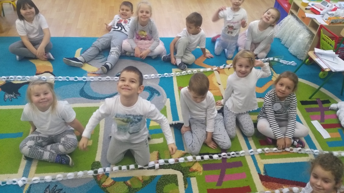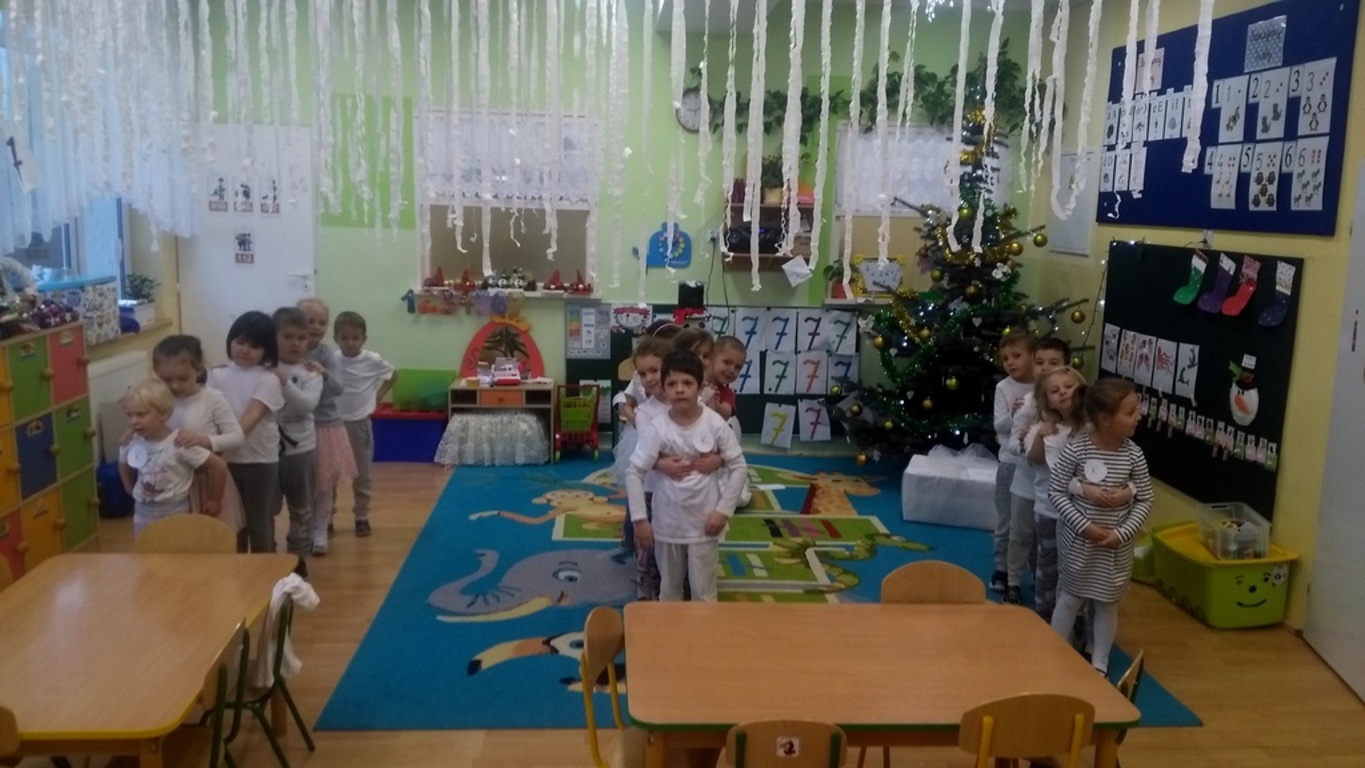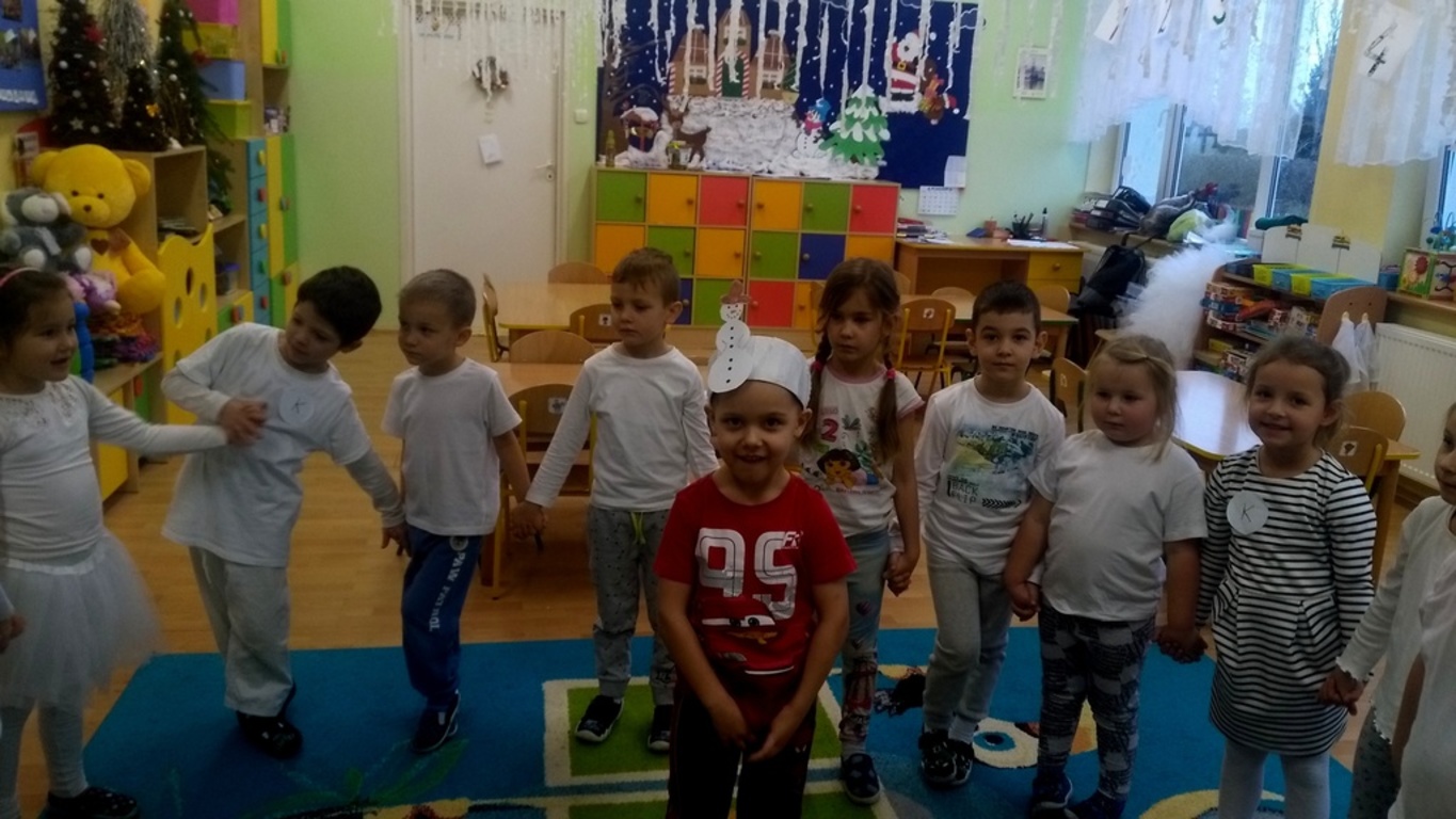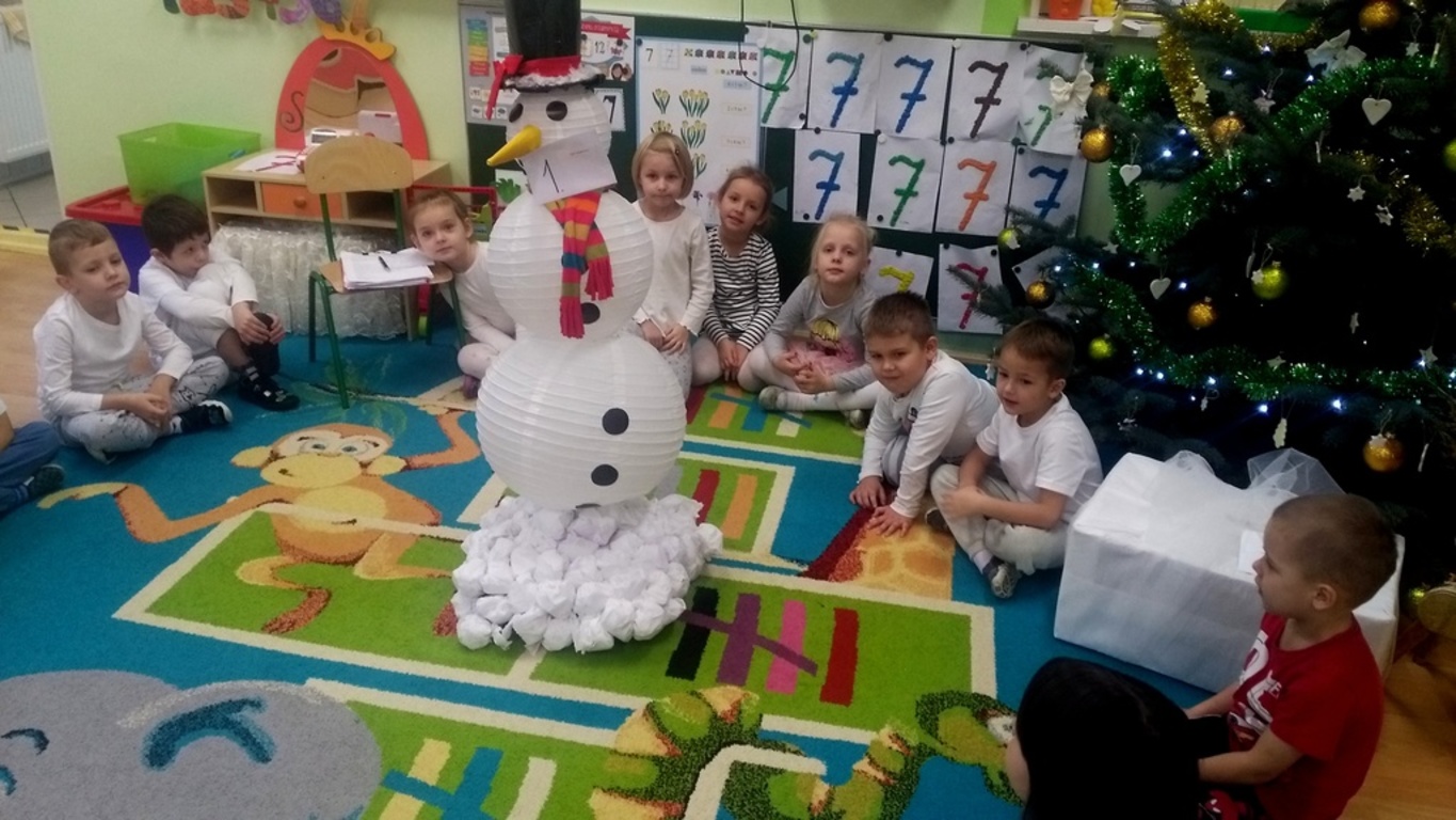07.12.2017 dzieci zastały białą dekorację sali, same też miały na sobie ubranka w tym kolorze. Na środku sali stał bałwanek, który zostawił dla przedszkolaków listy w ponumerowanych kopertach, zadania do wykonania i wielki prezent- niespodziankę, na którą dzieci dzielnie pracowały. Wszyscy czekamy na kolejny kolorowy dzień.