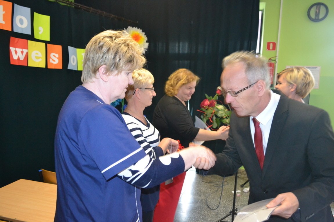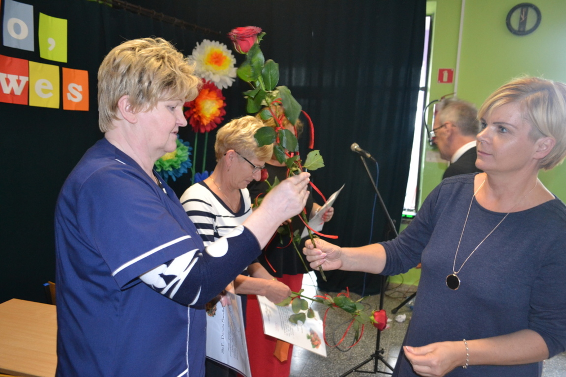 W tym dniu popłynęły także piękne słowa, podziękowania skierowane do każdego pracownika naszej szkoły, bowiem w drugiej części uroczystości dyrektor szkoły słowa podziękowania za zaangażowanie w wypełnianie swoich obowiązków skierował do wszystkich pracowników szkoły: administracji i obsługi, nauczycieli. Jak co roku Dyrektor wręczył nagrody wyróżniającym się w pracy nauczycielom.