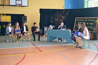 W piątek 11 października świętowaliśmy w naszej szkole Dzień Edukacji Narodowej. Nasi uczniowie pod kierunkiem Pani Aleksandry Jeziorowskiej i Anny Licy przygotowali wspaniały montaż słowno – muzyczny prezentując w nim wszystkie swoje talenty. Były piękne piosenki, scenka, w której młodzież wcieliła się w role nauczycieli i pana dyrektora debatujących nad losem pewnego ucznia oraz największy HIT jakim by popularny taniec „Belgijka”. Okazało się w nim, że nie tylko uczniowie wspaniale tańczą w naszej szkole, ale również nauczyciele zaproszeni przez uczniów do tańca, świetnie sobie poradzili. Wszystkim udzieliła się wspaniała atmosfera tak bardzo, że gdy zabrzmiał znany przebój „Jedzie pociąg z daleka…” większość nauczycieli dołączyła do pociągu jaki utworzyli nasi uczniowie. Po występie przemówił Pan Dyrektor Krzysztof Wojtysiak, który oprócz życzeń, wręczył coroczne nagrody nauczycielom, którzy swoją pracą wyróżnili się w poprzednim roku szkolnym. Całości dopełniła przepiękna dekoracja wykonana przez Panie: Dorotę Studzińską, Ewę Chaciej i Ewelinę Gaffkę.
