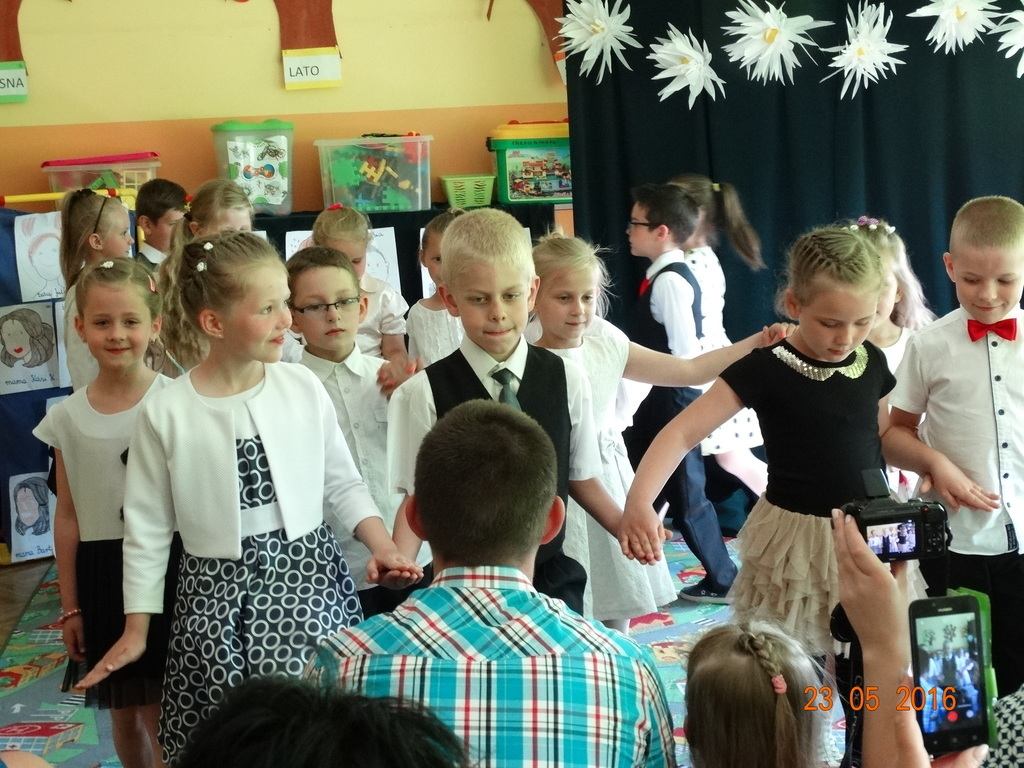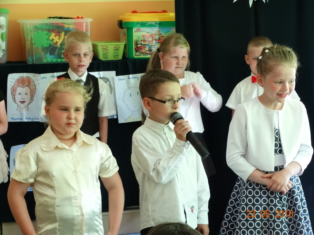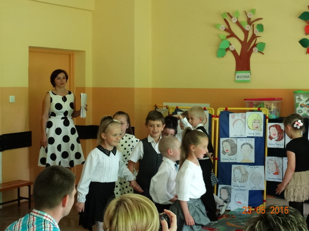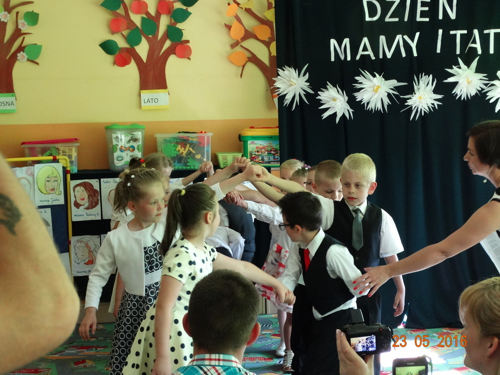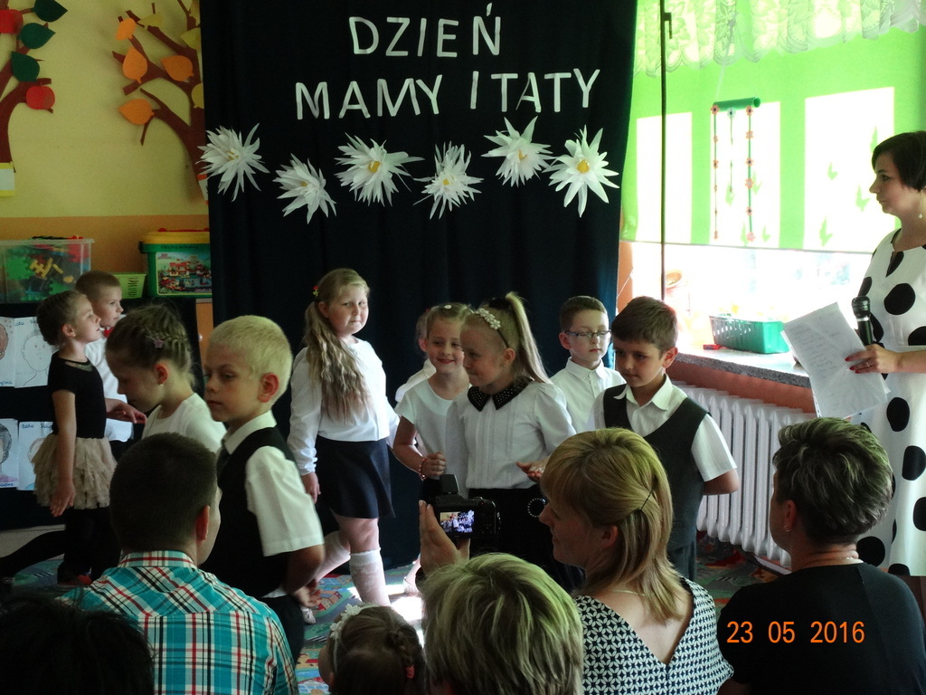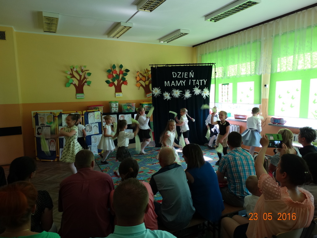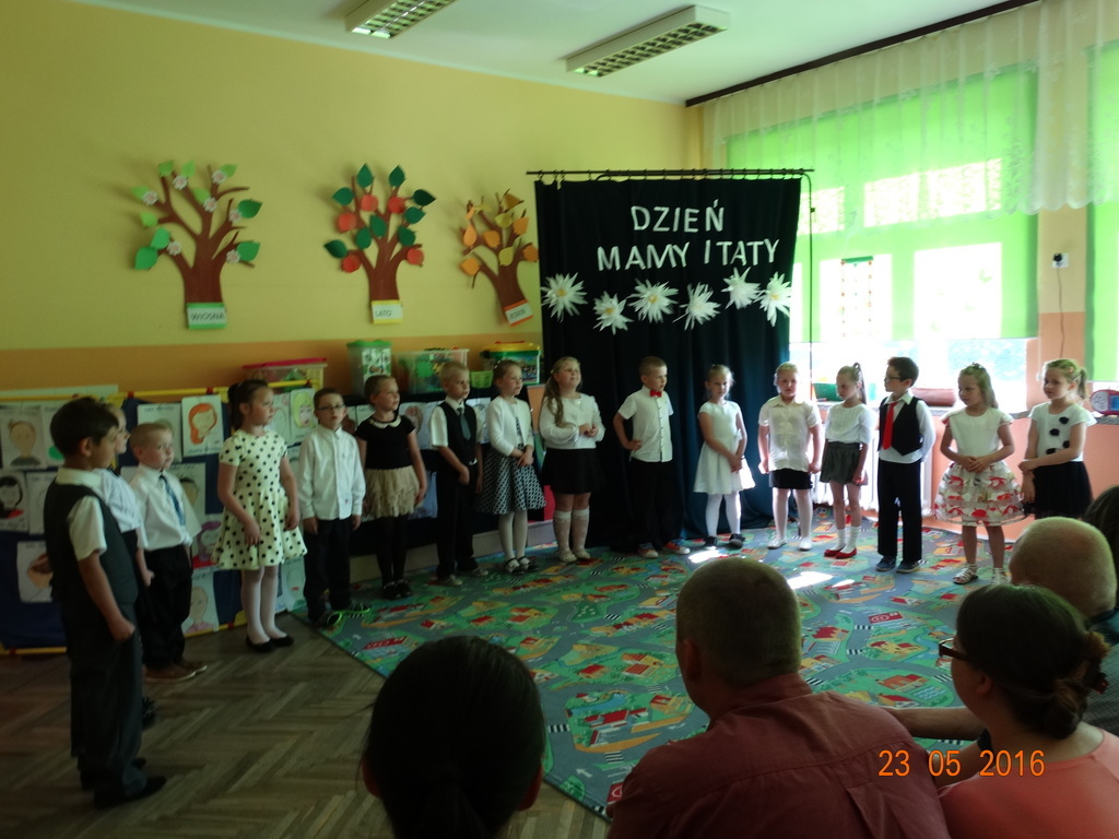 Dzieci z klasy 1a przygotowały uroczystość z okazji nadchodzących rodzinnych świąt: Dnia Mamy i Dnia Taty. Na dzień 23 maja 2016r. zaprosiły rodziców do szkoły, aby zaprezentować im pięknie wyuczone tańce, wierszyki i piosenki. Pierwszaki sprawiły się rewelacyjnie, a rodzicom zakręciła się łezka w oku ze wzruszenia. Po przedstawieniu, dzieci wręczyły rodzicom samodzielnie wykonane prezenty: dla mam - śliczne stroiki w szkle, a dla tatusiów - breloczek do kluczy z filcu. Zakończyliśmy