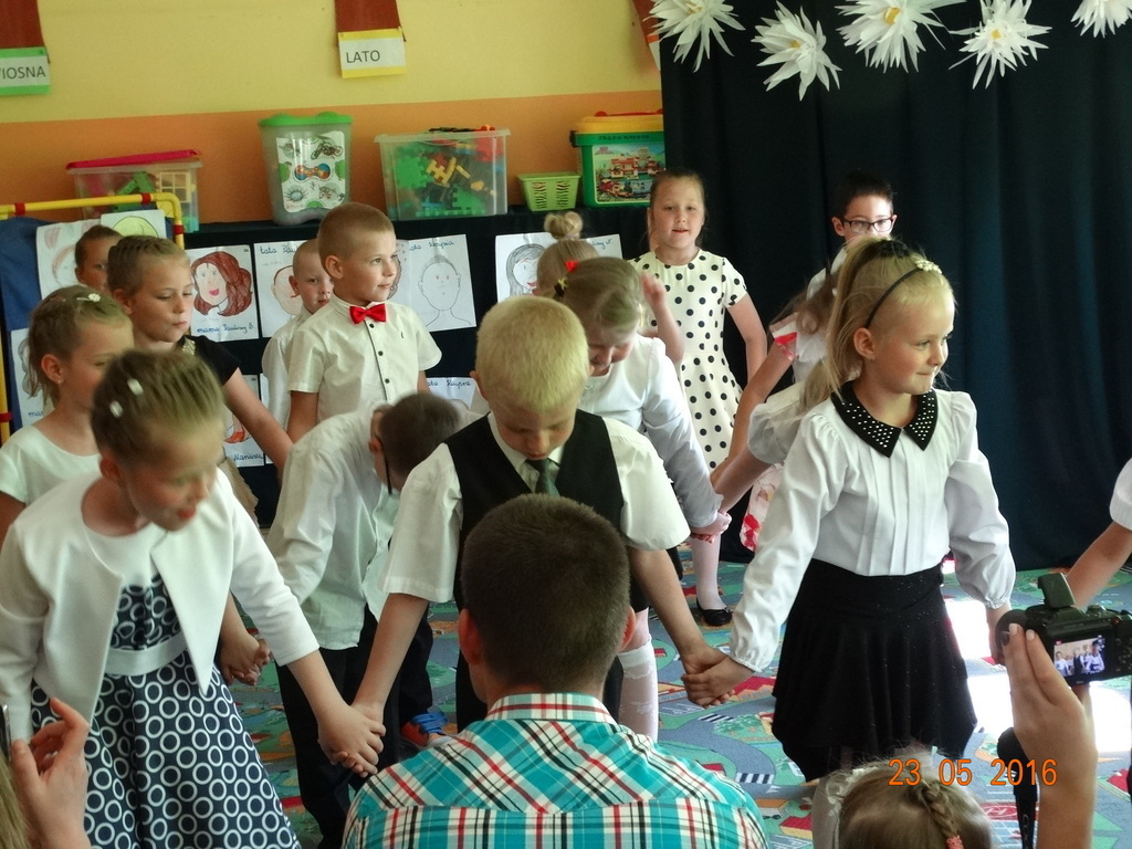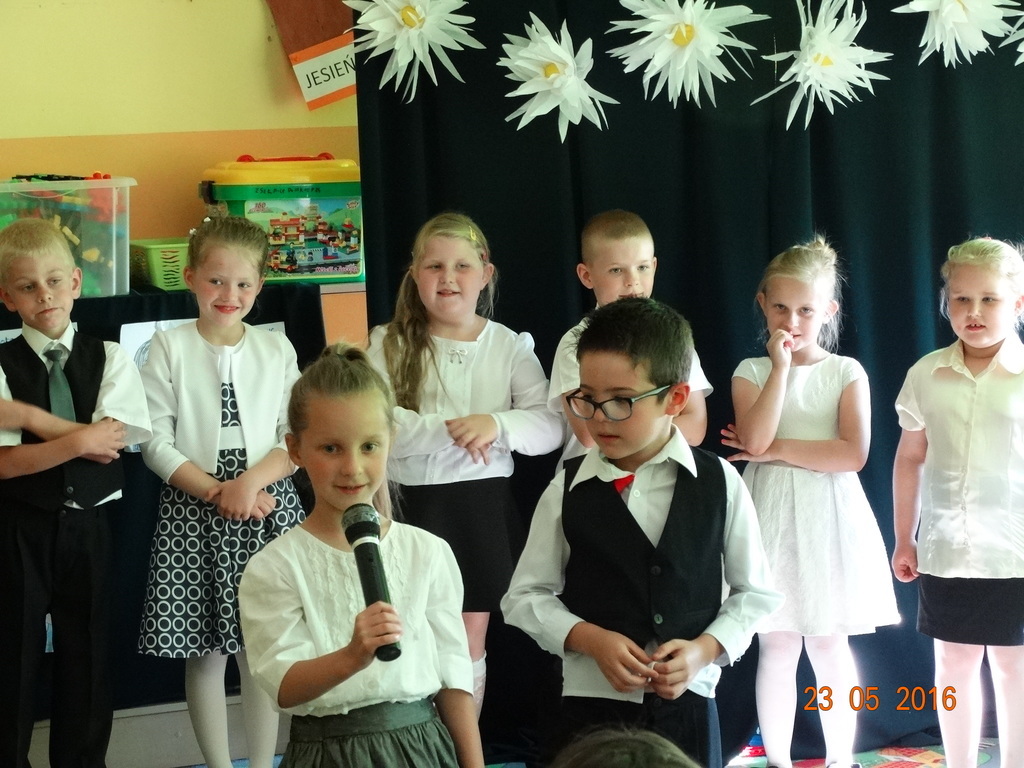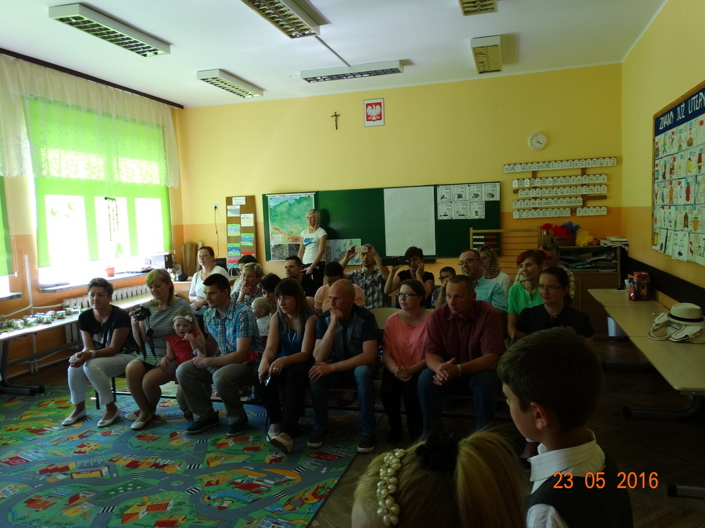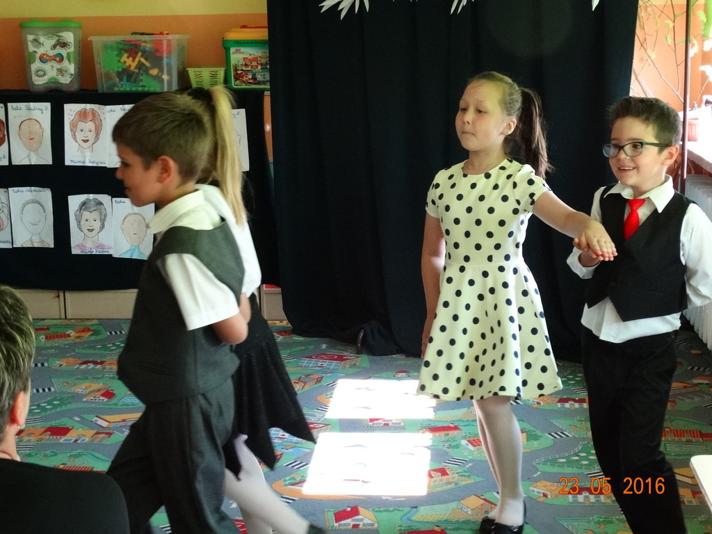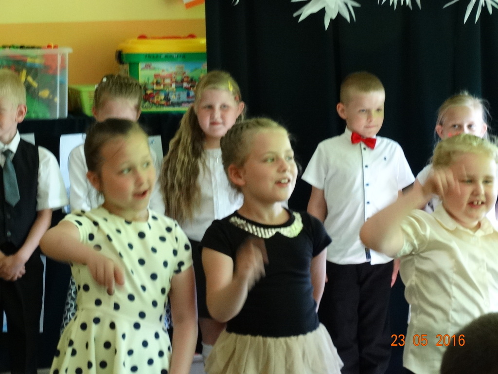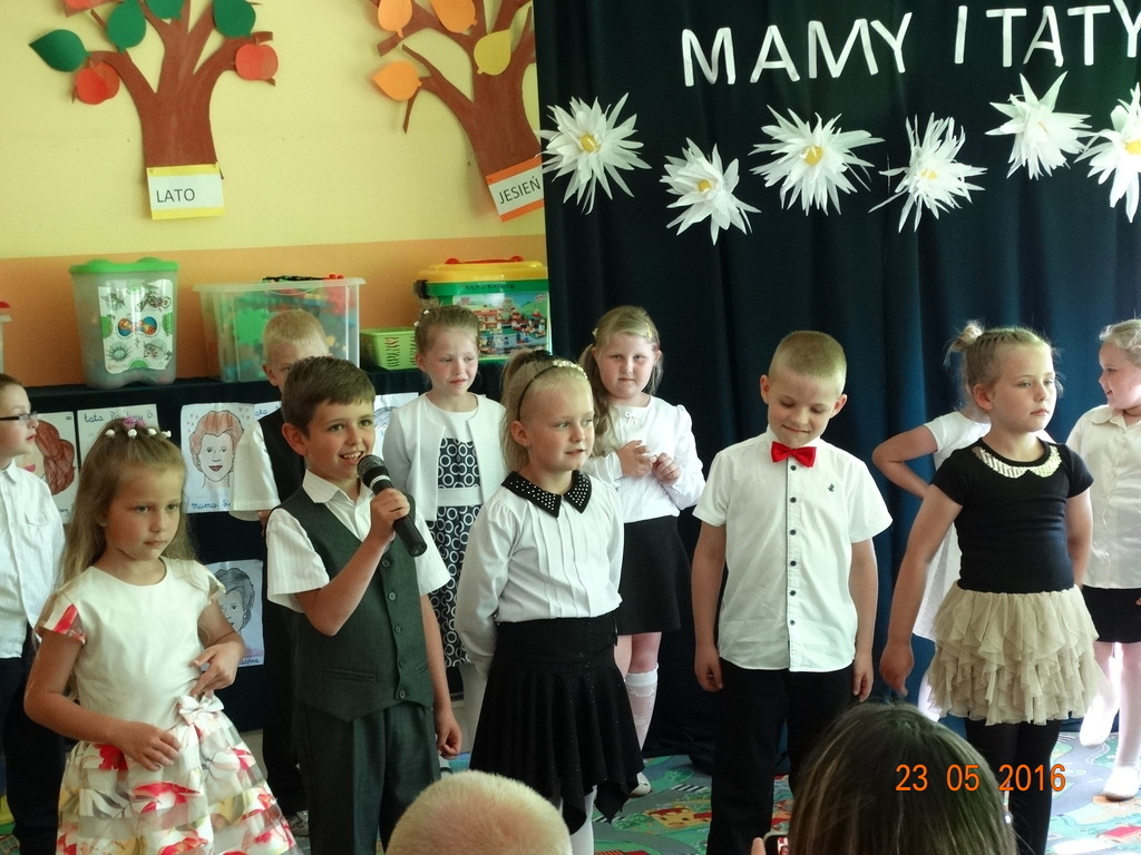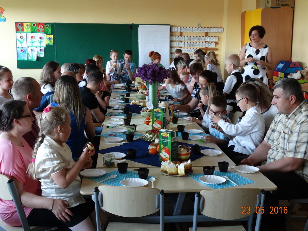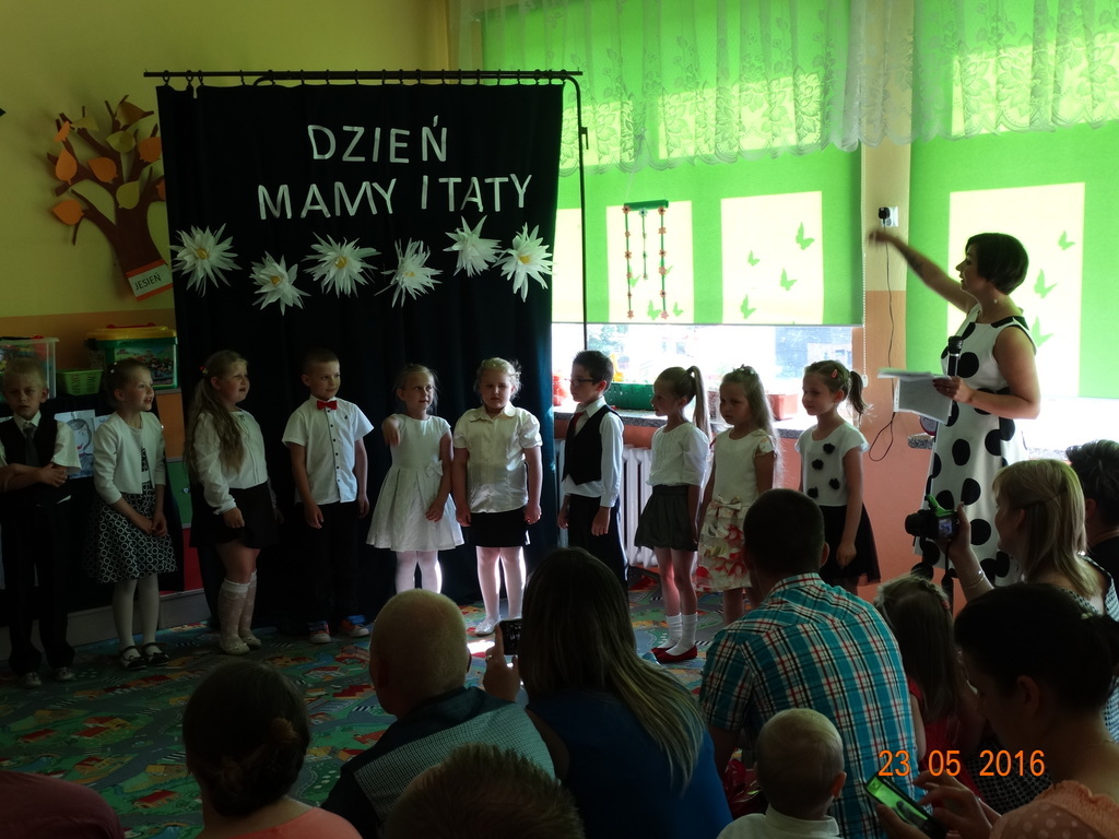 Dzieci z klasy 1a przygotowały uroczystość z okazji nadchodzących rodzinnych świąt: Dnia Mamy i Dnia Taty. Na dzień 23 maja 2016r. zaprosiły rodziców do szkoły, aby zaprezentować im pięknie wyuczone tańce, wierszyki i piosenki. Pierwszaki sprawiły się rewelacyjnie, a rodzicom zakręciła się łezka w oku ze wzruszenia. Po przedstawieniu, dzieci wręczyły rodzicom samodzielnie wykonane prezenty: dla mam - śliczne stroiki w szkle, a dla tatusiów - breloczek do kluczy z filcu. Zakończyliśmy