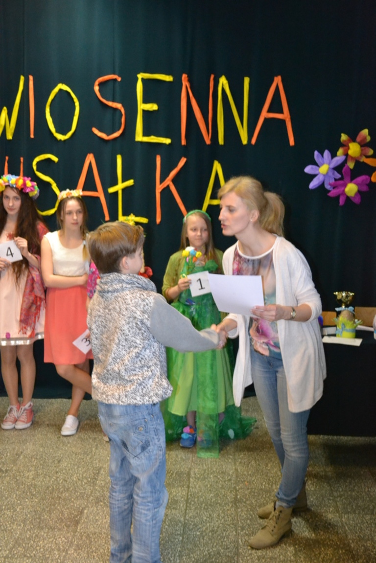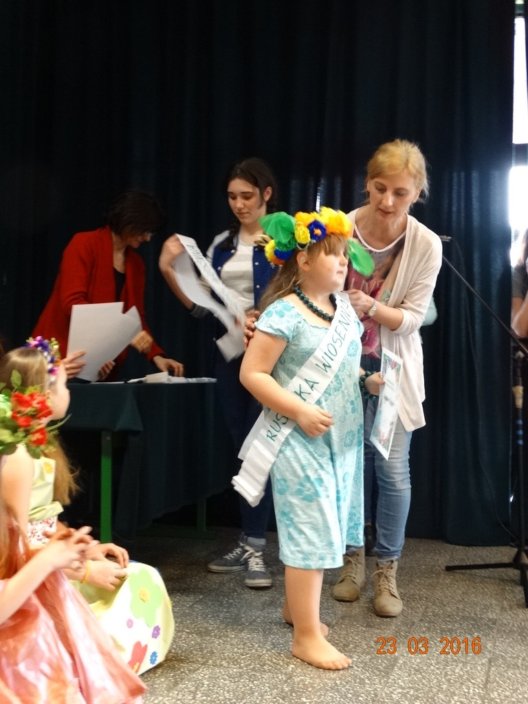 Kolejnym punktem dnia przygotowanego przez Samorząd Uczniowski były wybory najpiękniejszej Rusałki Wiosennej. Kandydatki z wszystkich klas wyglądały niezwykle barwnie, z ogromnym wdziękiem prezentując zainspirowane wiosną stroje. Po burzliwych naradach, jury wyłoniło 5 najpiękniejszych Rusałek Wiosennych w kategorii klas I-III SP. W kategorii klas IV-VI SP zaszczytny tytuł zdobyła Ewelina Wyrwał z klasy IV, natomiast w grupie gimnazjalistek zwyciężyła Zuzanna Bobrucka z klasy IIA.