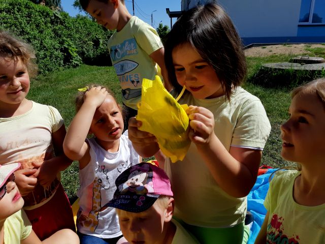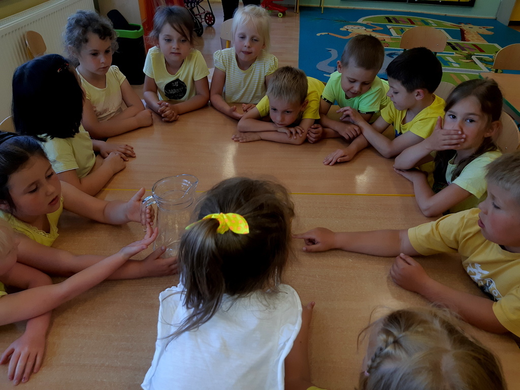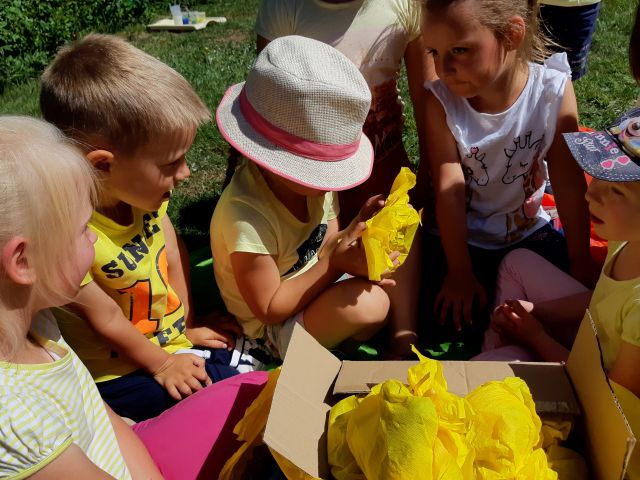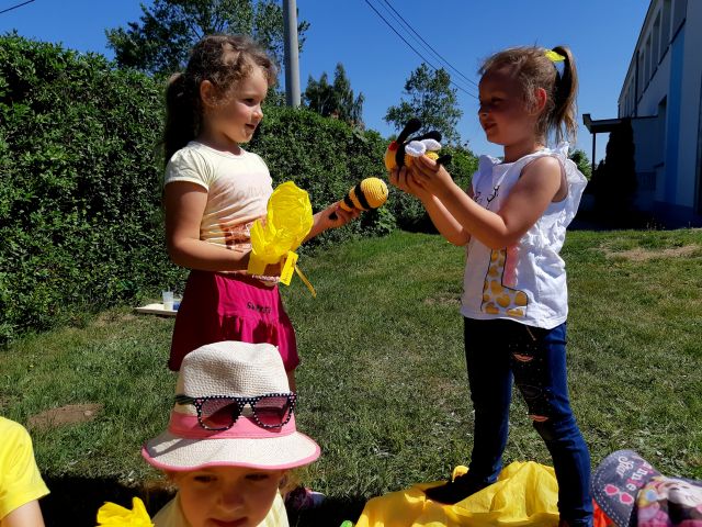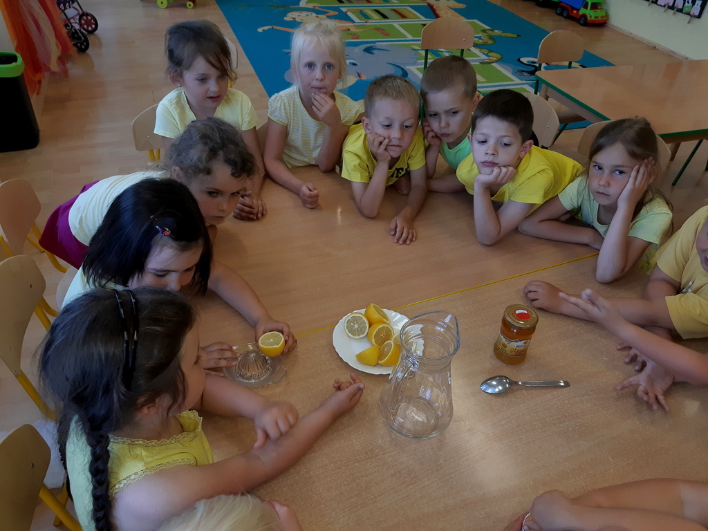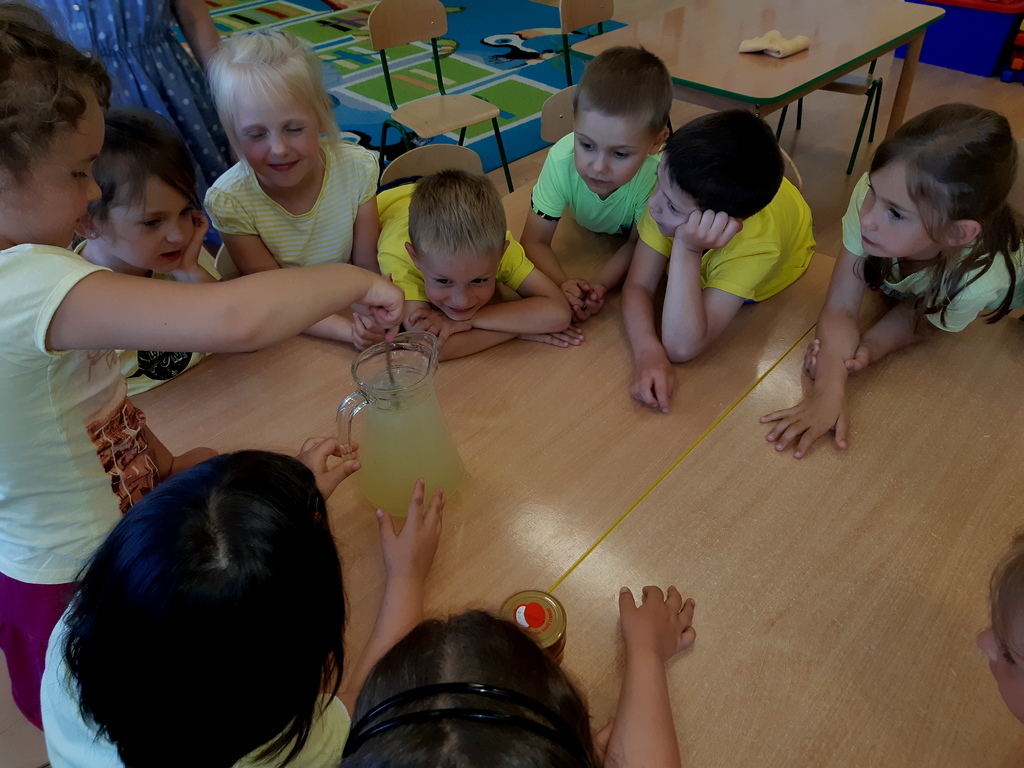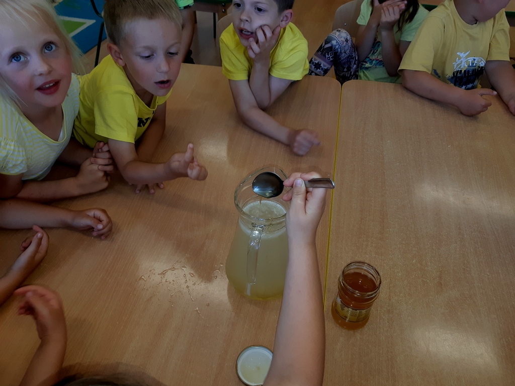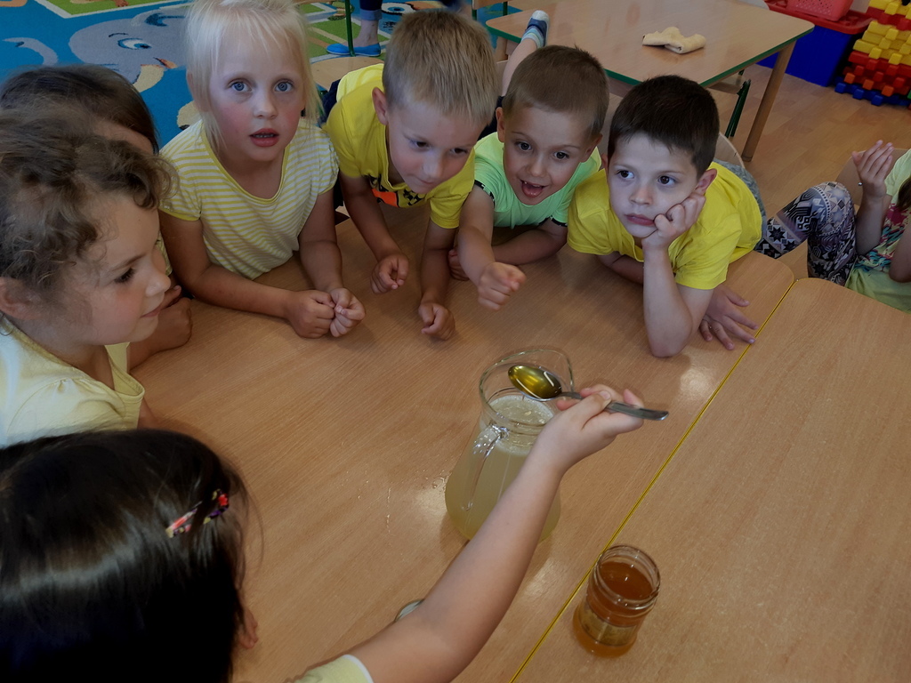 Tego dnia u "Pszczółek" królowały wszystkie odcienie koloru żółtego - od kanarkowego, cytrynowego po musztardowy. Aby to jeszcze bardziej podkreślić, każdy z nas miał na sobie, już tradycyjnie, coś w tym kolorze. A ponieważ żółty dzisiaj był naszym królem kolorów, to też sprawdzaliśmy jaki powstanie w połączeniu z innymi kolorami. Rozmawialiśmy o żółtych owocach, rozwiązywaliśmy zagadki i zadania ukryte w kopertach, sprawdzaliśmy jak szybko żółte słoneczko roztopi czekoladę oraz robiliśmy pyszną lemoniadę z cytrynek i miodu. Na pamiątkę dostaliśmy piękne pszczółki wykonane przez Panią Katarzynę Światła - babcię Ksawerego, za które bardzo dziękujemy!