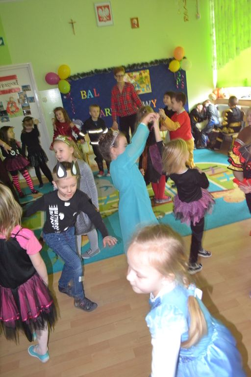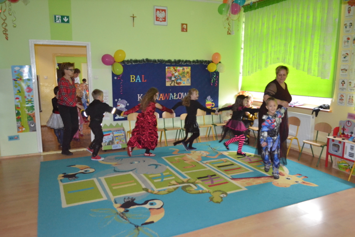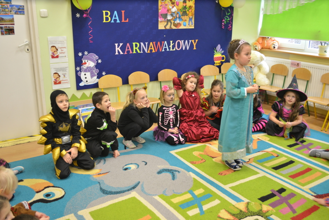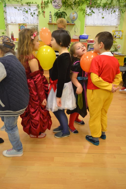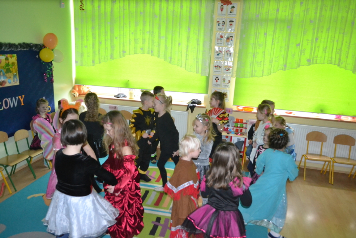 Na początku zabawy każde dziecko zaprezentowało swój strój i opowiedziało o nim. Tego dnia czekało na nas wiele zabaw i konkursów. Dzieci chętnie uczestniczyły w tańcach i z wielką ochotą brały udział w rywalizacjach, które były nagradzane . W przerwach pomiędzy zabawami dzieci odpoczywały przy stole, gdzie czekał na nich słodki poczęstunek przygotowany przez rodziców.