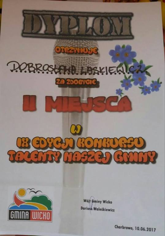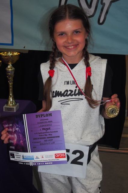 Dobrusia Laskiewicz z klasy IV w ostatnim tygodniu aż dwa razy zdobyła złoty medal na ogólnopolskich turniejach tanecznych. Brała również udział w finale konkursu "Talenty gminy Wicko", podczas którego swoje pasje zaprezentowały dzieci z gminy Wicko w wieku 8-13 lat. Był śpiew, fotografia, taniec... Po przejściu wcześniejszych etapów, w finale wystąpiło dziewięcioro dzieci. Zwyciężczynią konkursu została Natalia Waleśkiewicz (śpiew). Nasza Dobrusia zajęła drugie miejsce i wygrała piękny rower oraz wiele innych bardzo ciekawych nagród. Gratulujemy!
