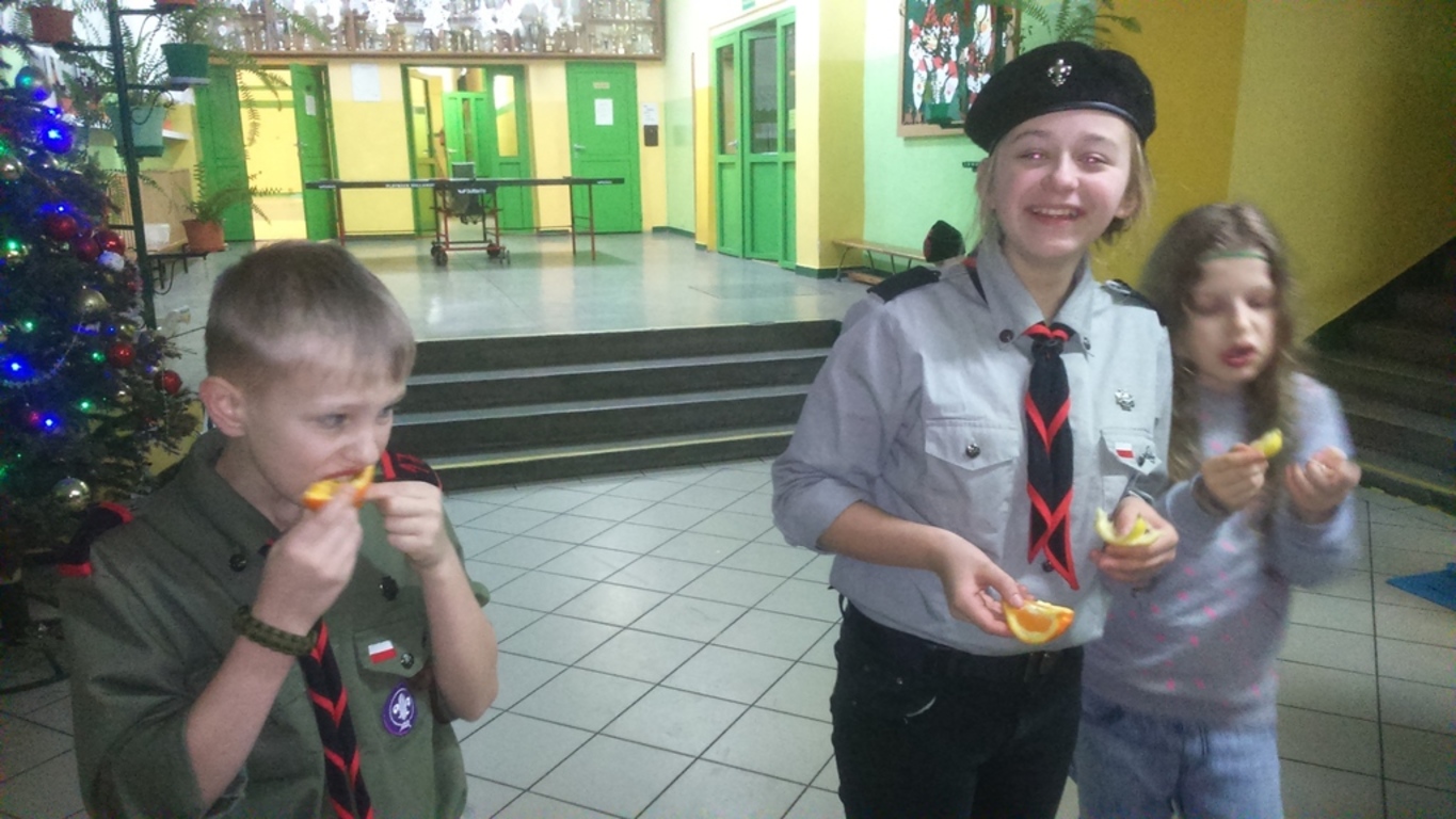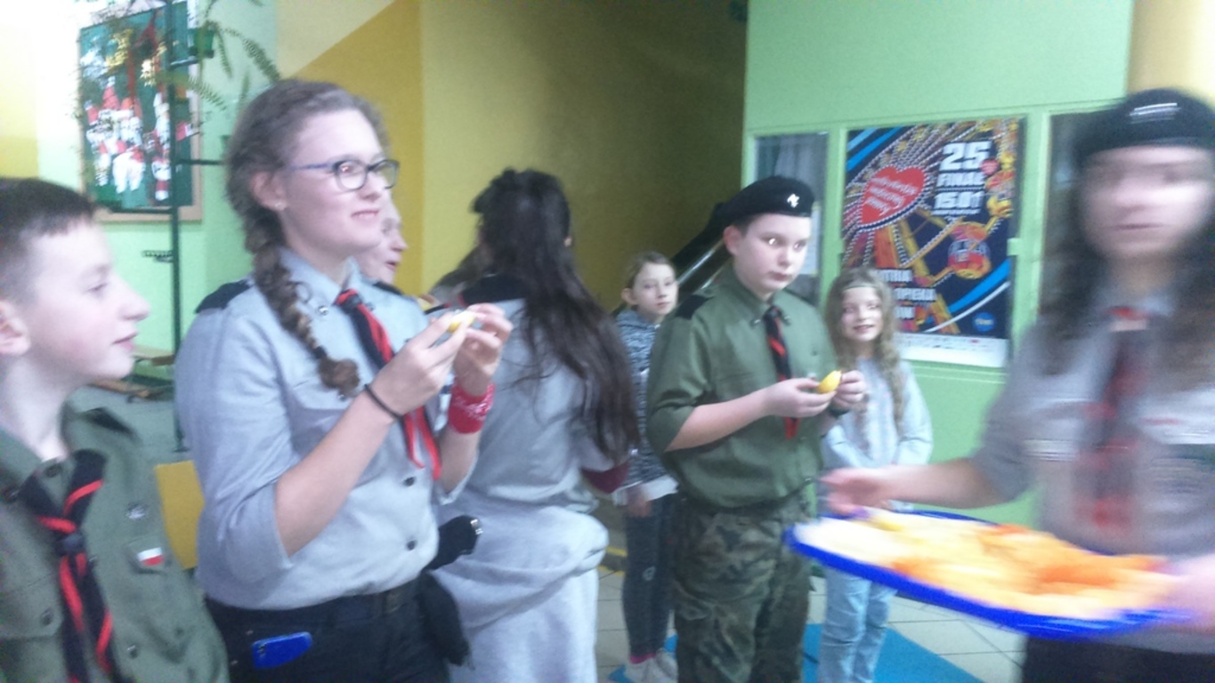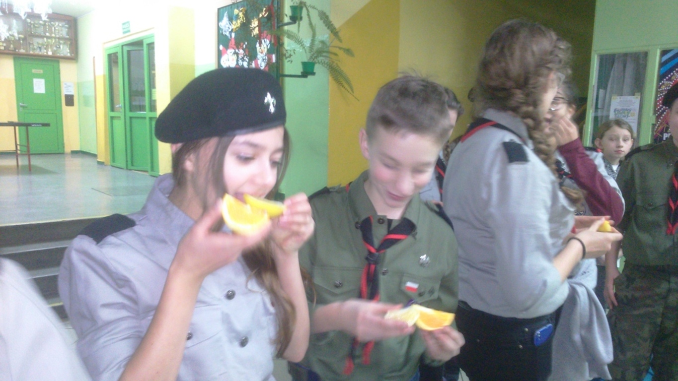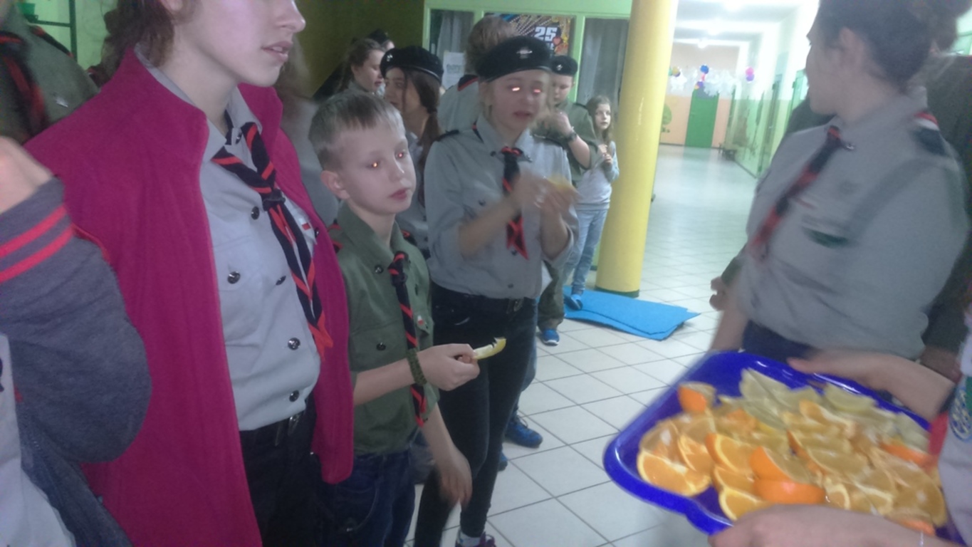 Po trzecie, wziąć udział w quizie z wiedzy o harcerstwie. Przegrani otrzymali do zjedzenia cukierki i cytrynkę na pocieszenie, a wygrani zajadali pomarańcze;-).