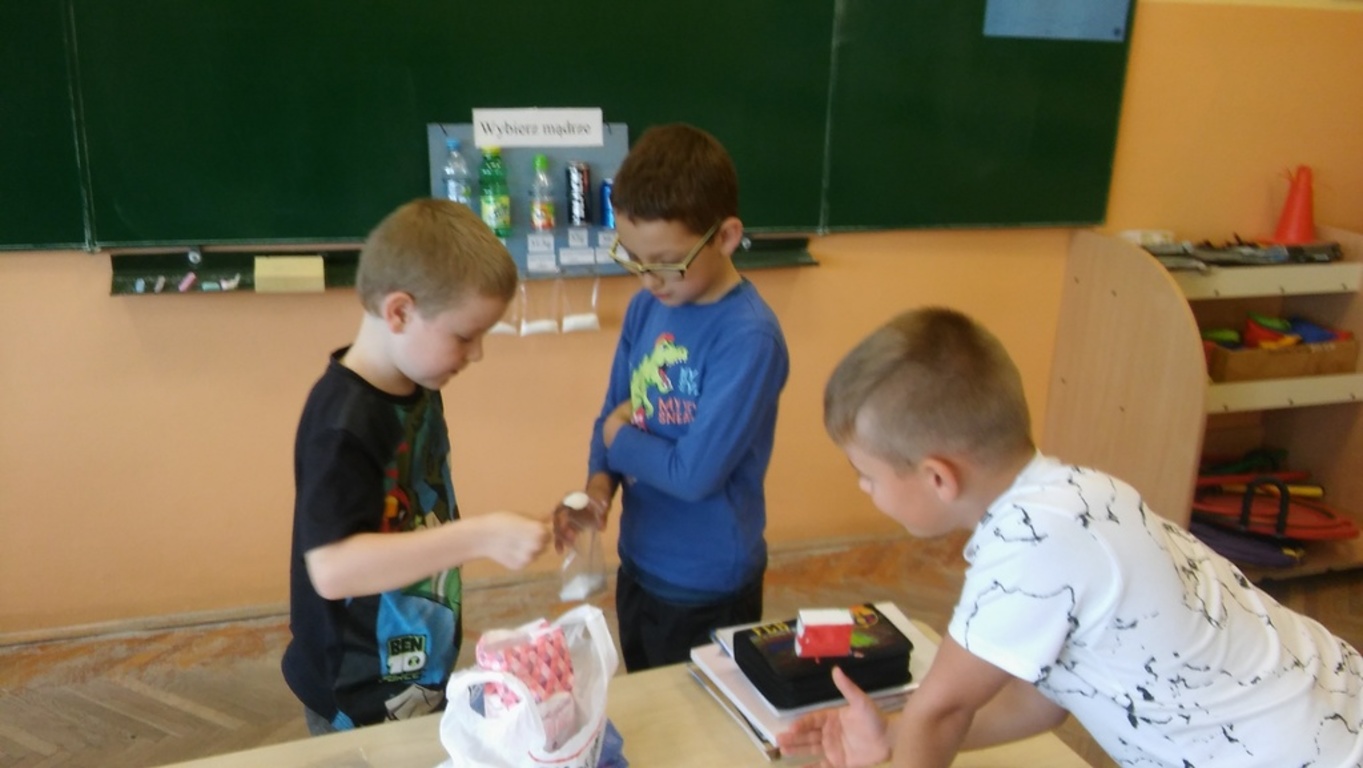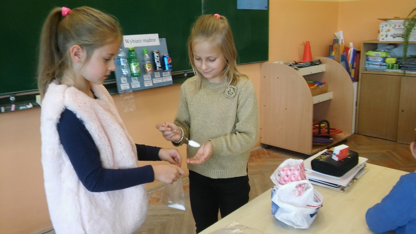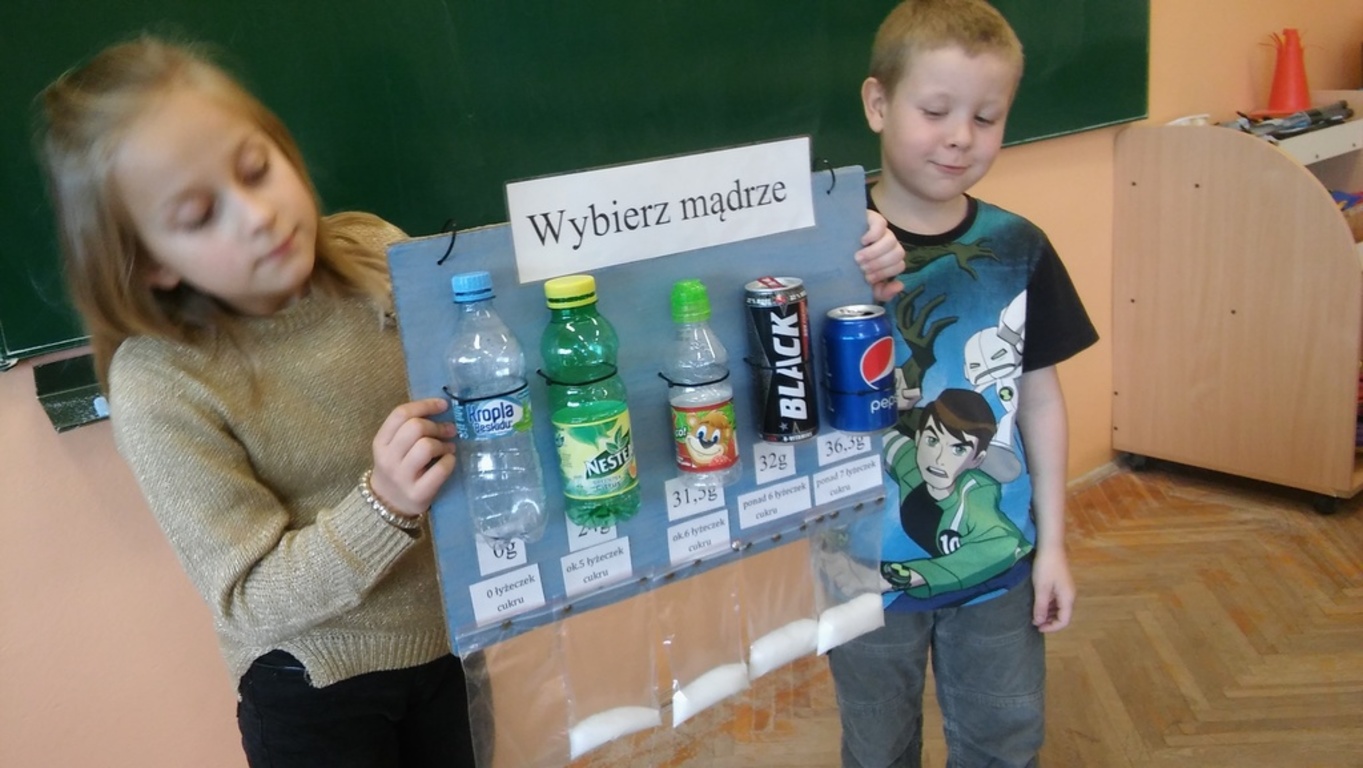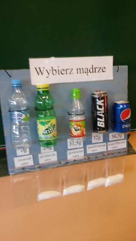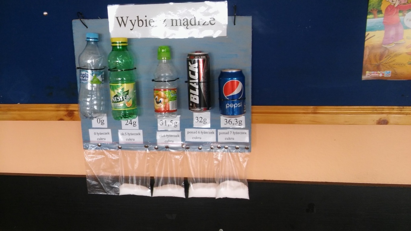 Wszyscy wiemy, że nadmiar cukru szkodzi. Klasa IIIa, na lekcji przyrody, przygotowała tablicę informacyjną, obrazującą ile cukru "ukrywa" się w popularnych napojach spożywanych przez dzieci. Oczywiście wyszło, że woda jest najzdrowsza!