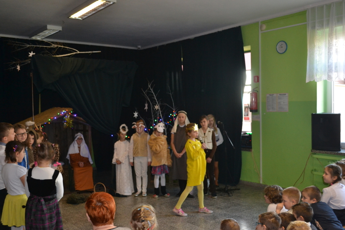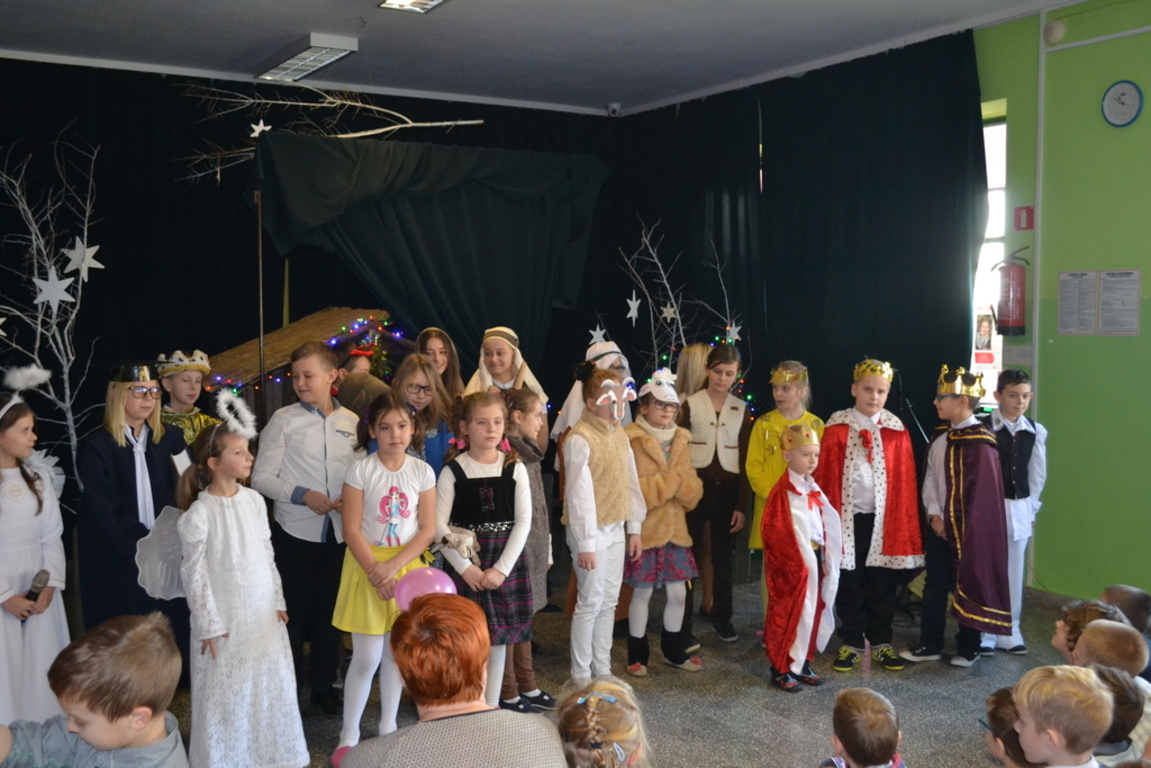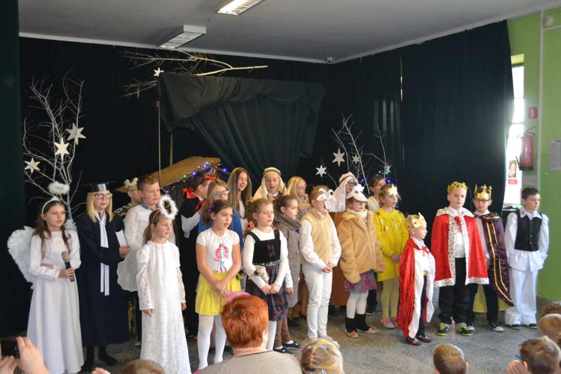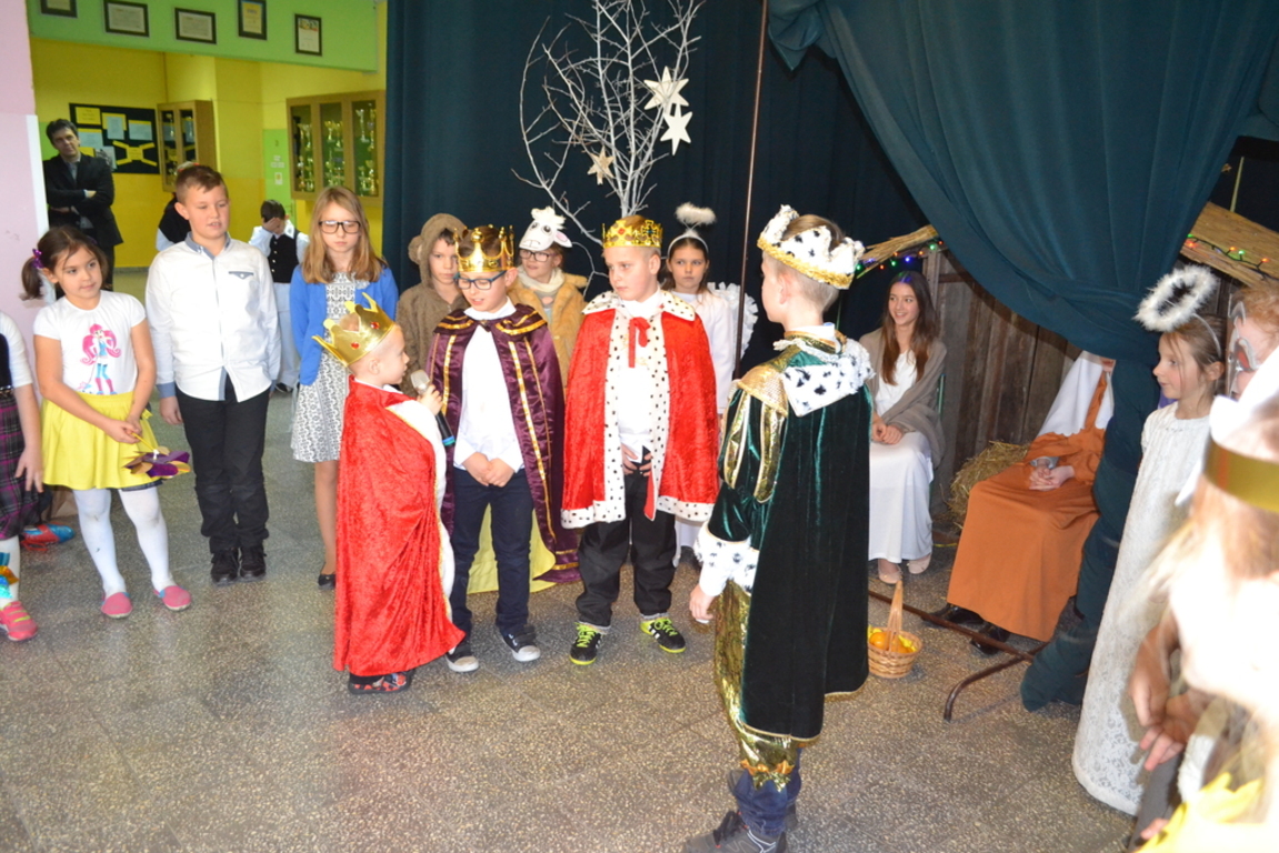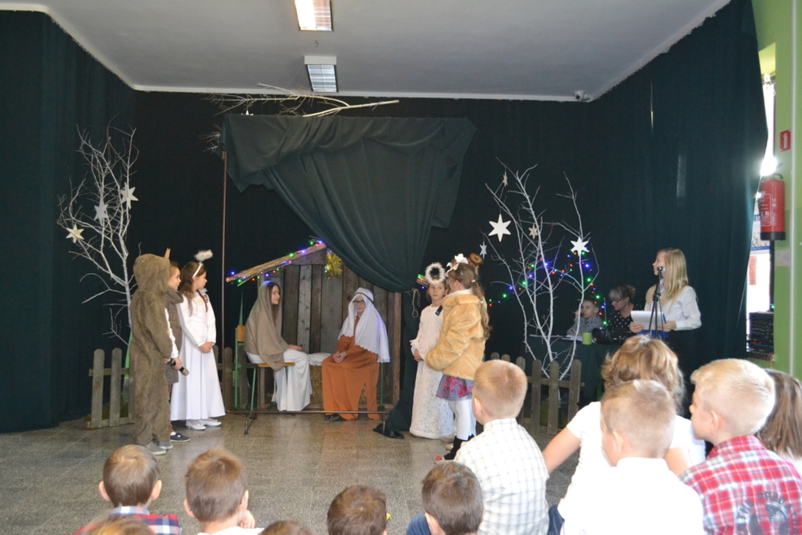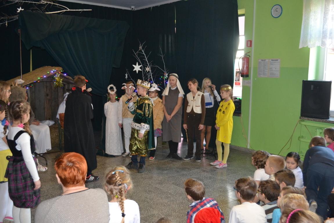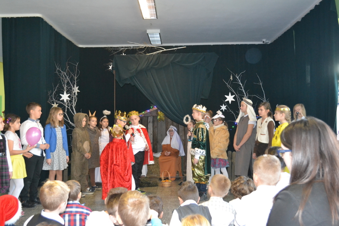 Boże Narodzenie to czas, kiedy wszyscy stają się dla siebie bardziej życzliwi, milsi i zapominają o wszelkich sporach oraz waśniach. Aby podkreślić wyjątkowy charakter tych świąt, już tradycyjnie jak co roku uczniowie klas I-VI pod opieka nauczycielek: M.Łapa i M.Wojtysiak przygotowali jasełka, które przybliżyły wszystkim atmosferę tego szczególnego okresu. Oglądając przedstawienie, czuło się nastrój świąt Bożego Narodzenia. Publiczność po raz kolejny mogła przeżyć historię Marii i Józefa szukających miejsca do schronienia na noc, którzy po bezowocnych poszukiwaniach zdecydowali się przenocować w stajni. Jednak to do nich i małego Jezuska przybyli tak honorowi goście jak trzej mędrcy i złożyli dzieciątku pokłon. Całość przedstawienia pokazująca scenki z życia nowonarodzonego dzieciątka, pasterzy, mędrców, rodzin oraz aniołów przeplatana była pastorałkami, które tematycznie były powiązane z treścią przedstawienia. Ogromne zaangażowanie młodych aktorów i nauczycielek opłaciło się, gdyż przedstawienie wywarło duże wrażenie i poruszenie. Natomiast dzieci miały możliwość uczestniczenia w tradycji, a także możliwość zaprezentowania swoich umiejętności artystycznych. Puentą biblijnej historii stały się słowa pastorałki „On jest królem”.